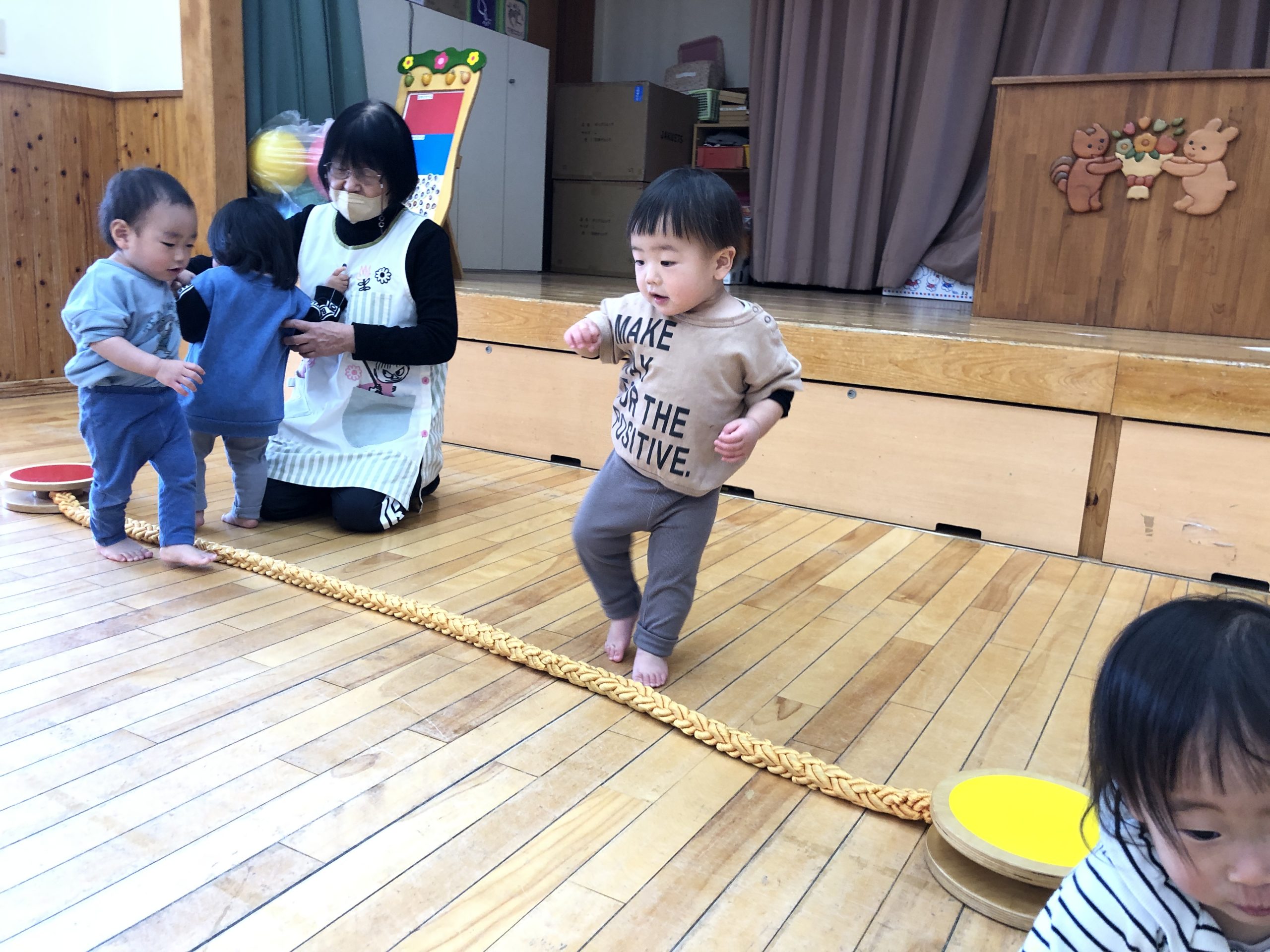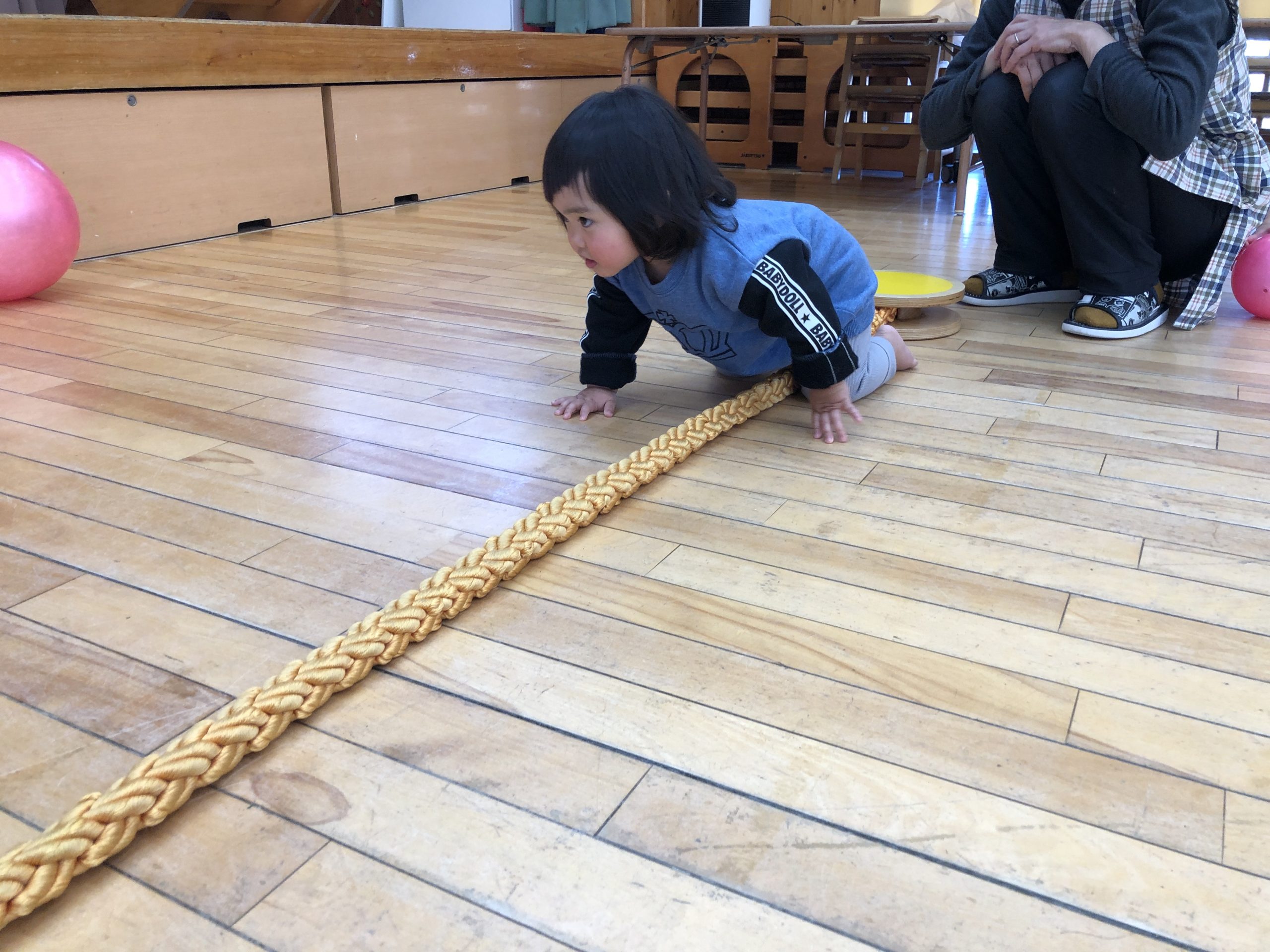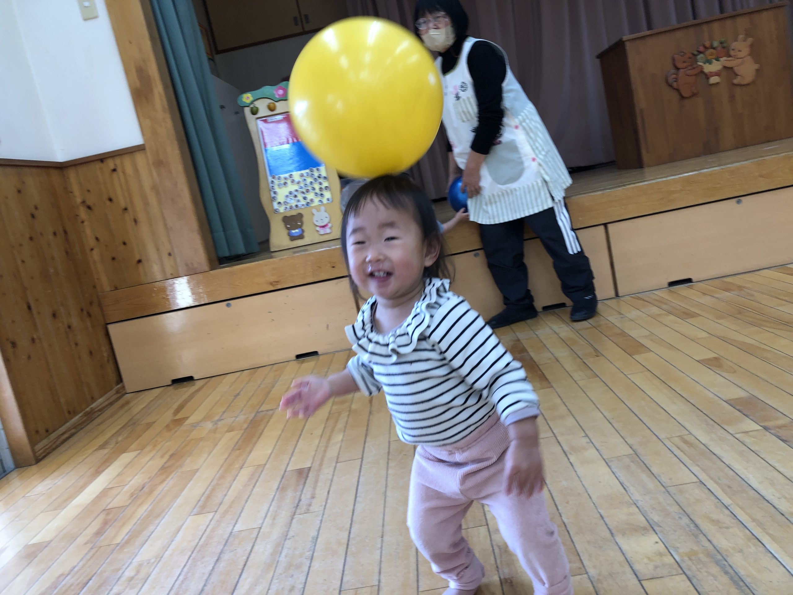 今日は、ホールでボールやロープを使ってやリズムあそびで、体を動かしてあそびました。