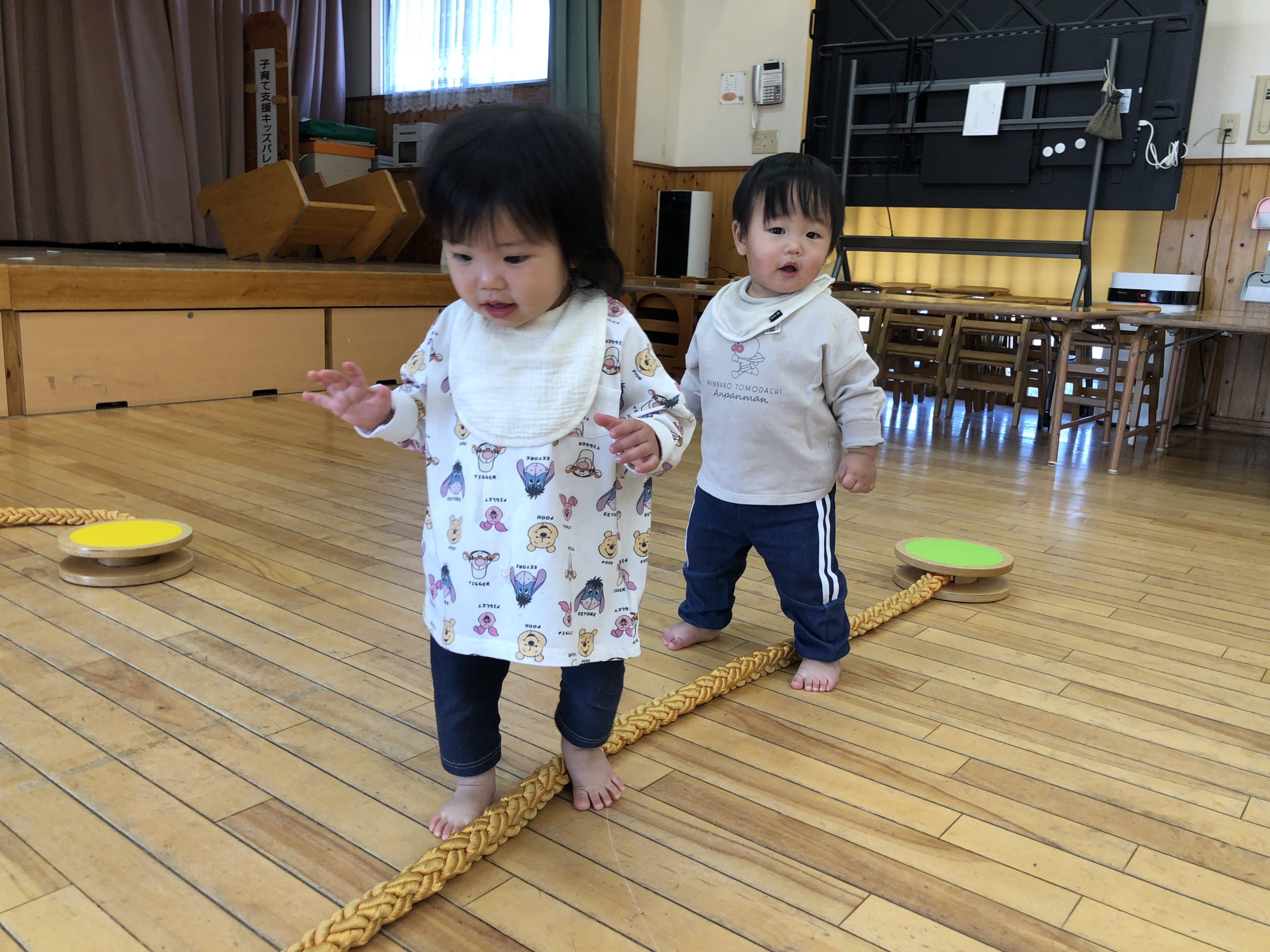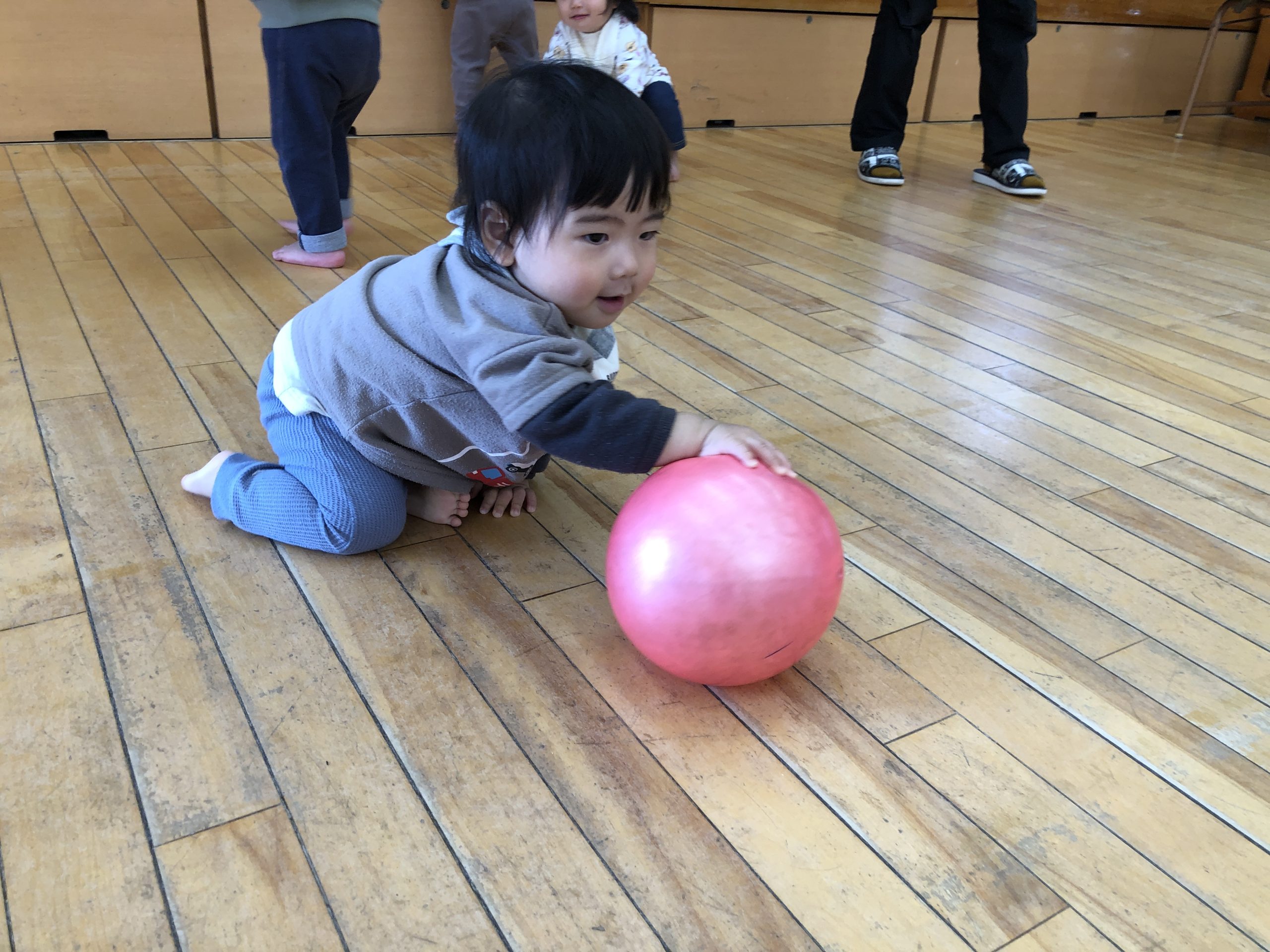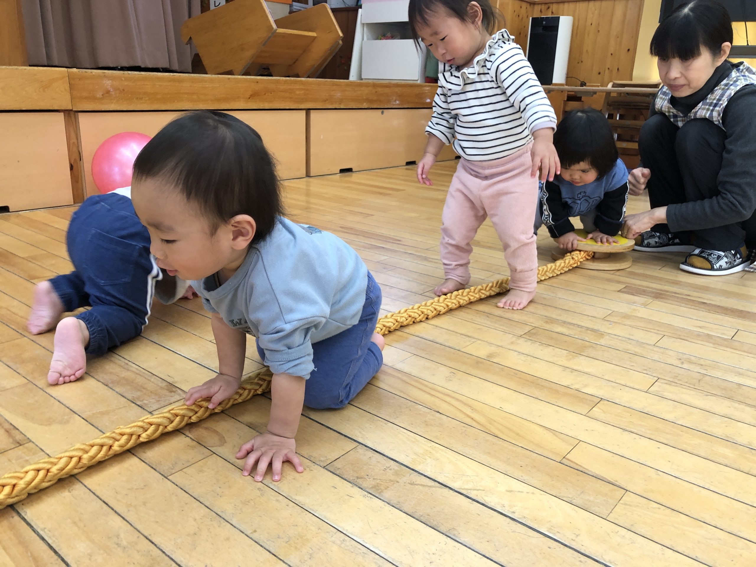 今日は、ホールでボールやロープを使ってやリズムあそびで、体を動かしてあそびました。