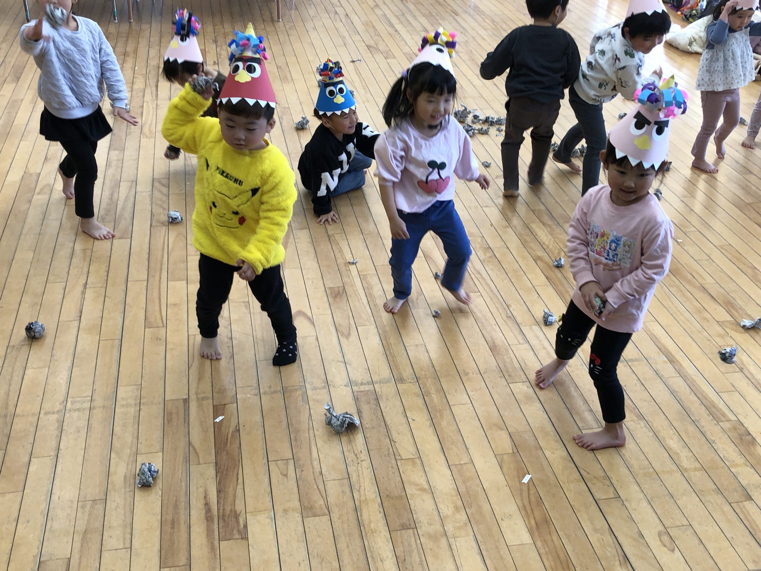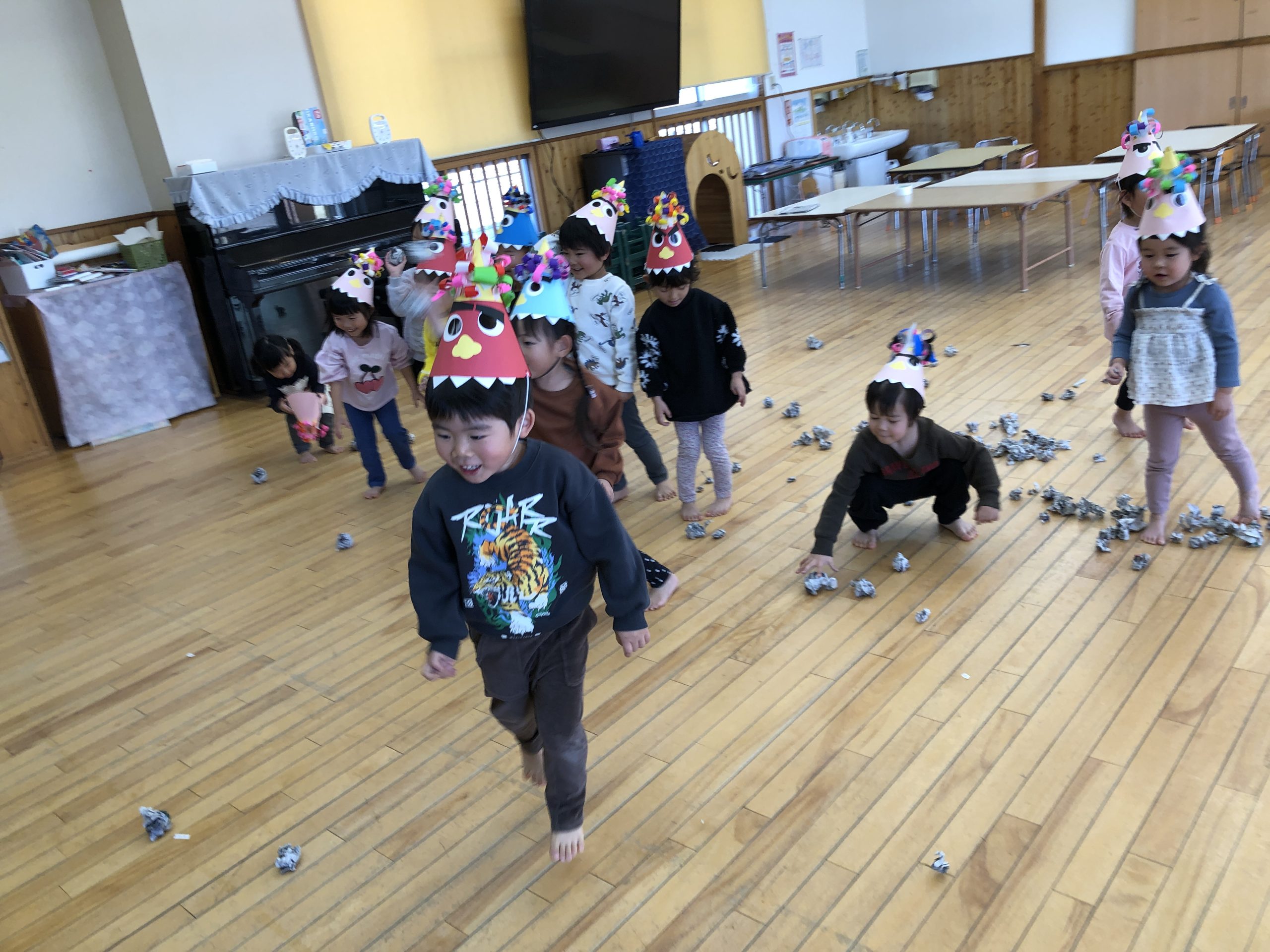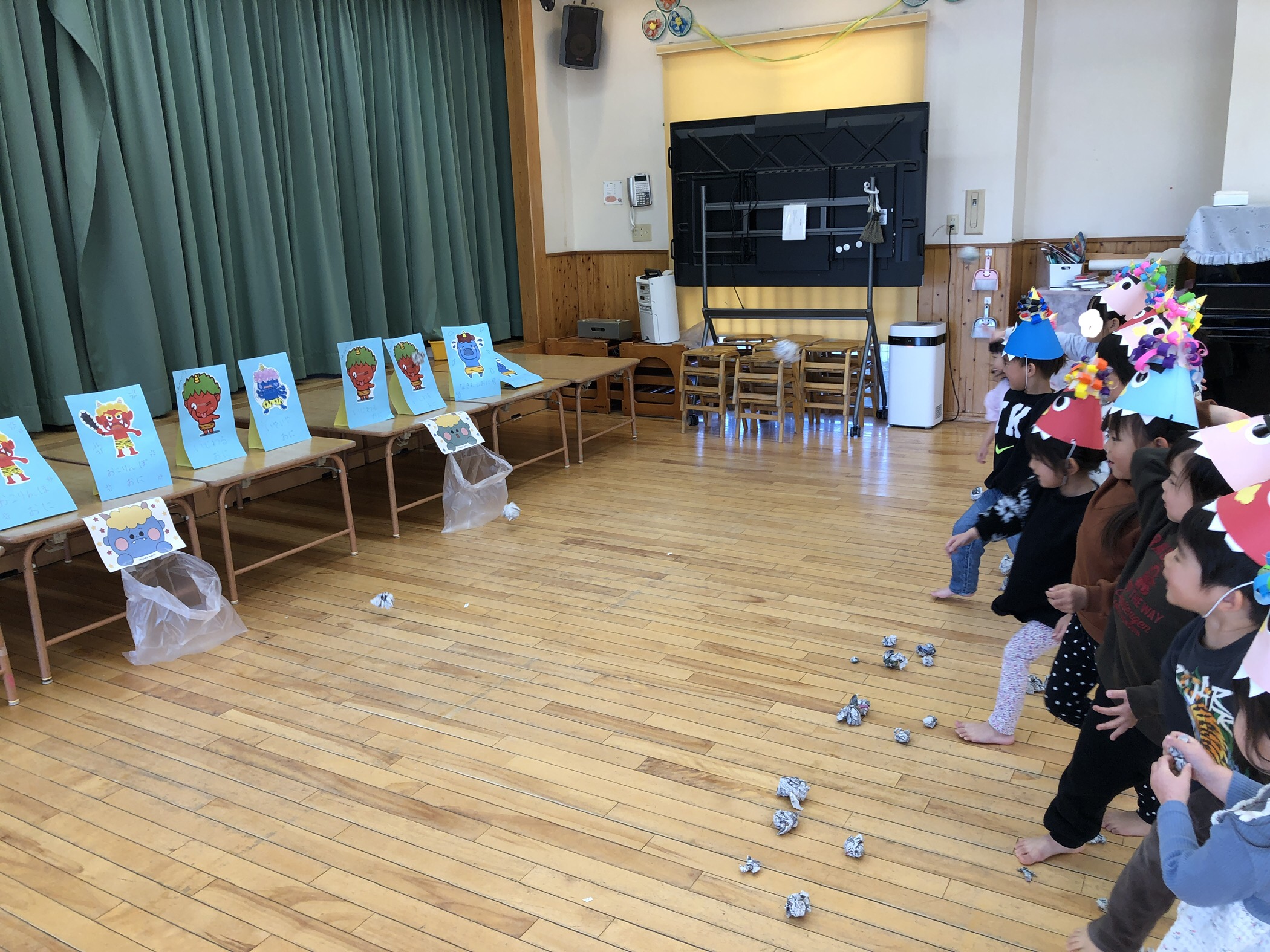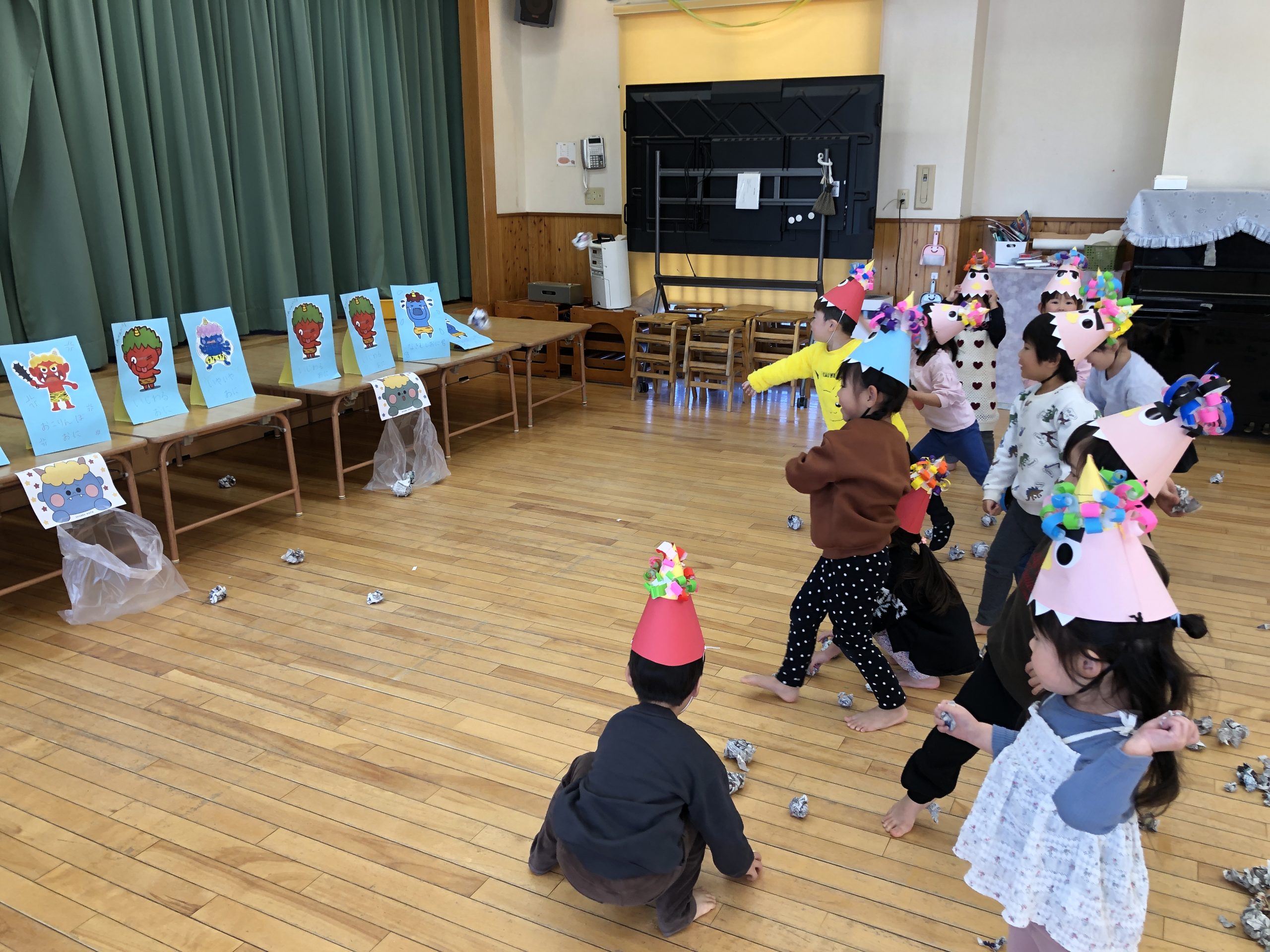 今日は節分!!つきぐみさんも豆まきをしました!“泣き虫鬼”、“怒りんぼ鬼”といろいろな鬼さんを準備して、新聞紙を丸めて退治しました!子どもたちも「当たった!!」と嬉しそうな表情をしたり、必死に投げてる姿がとてもかわいいかったです★