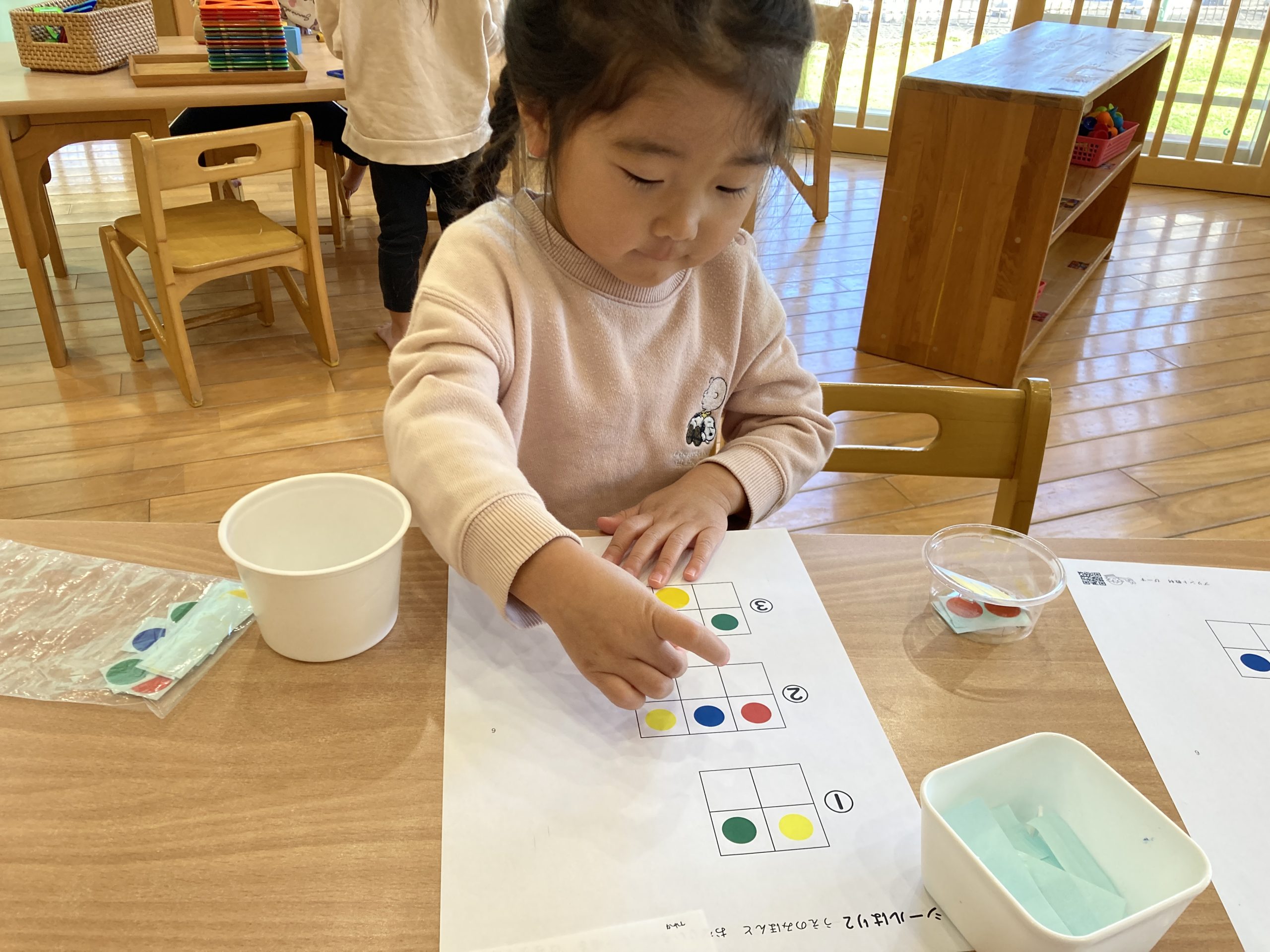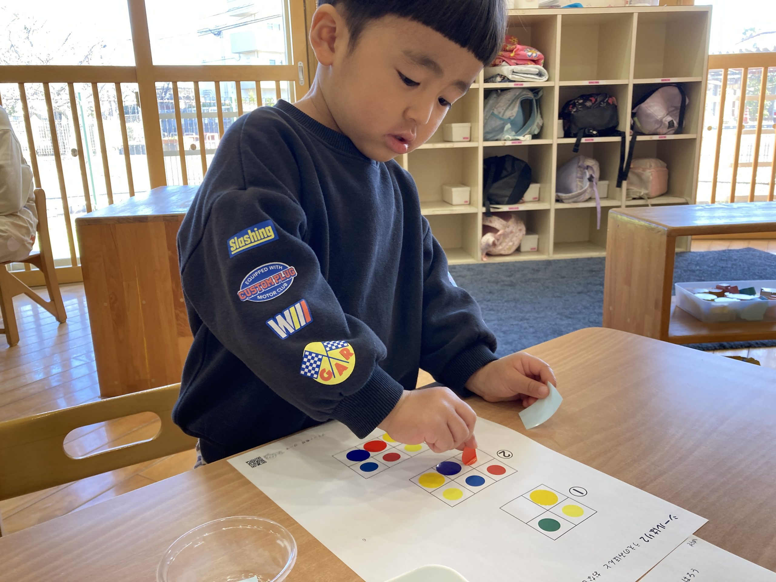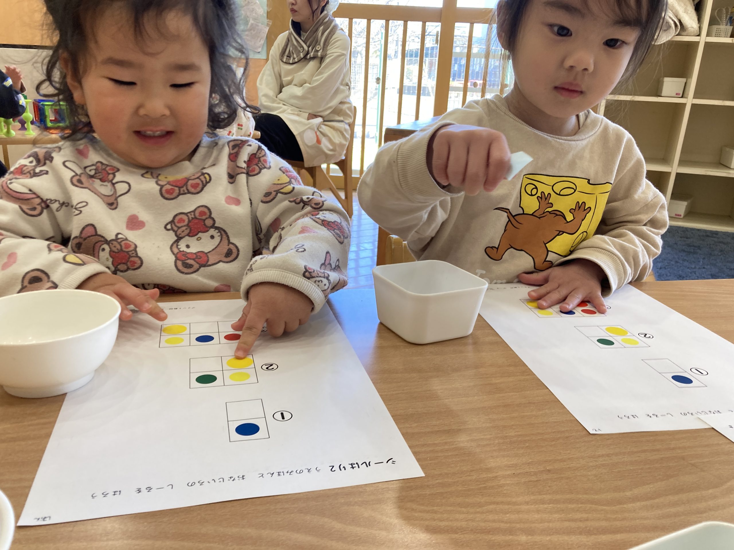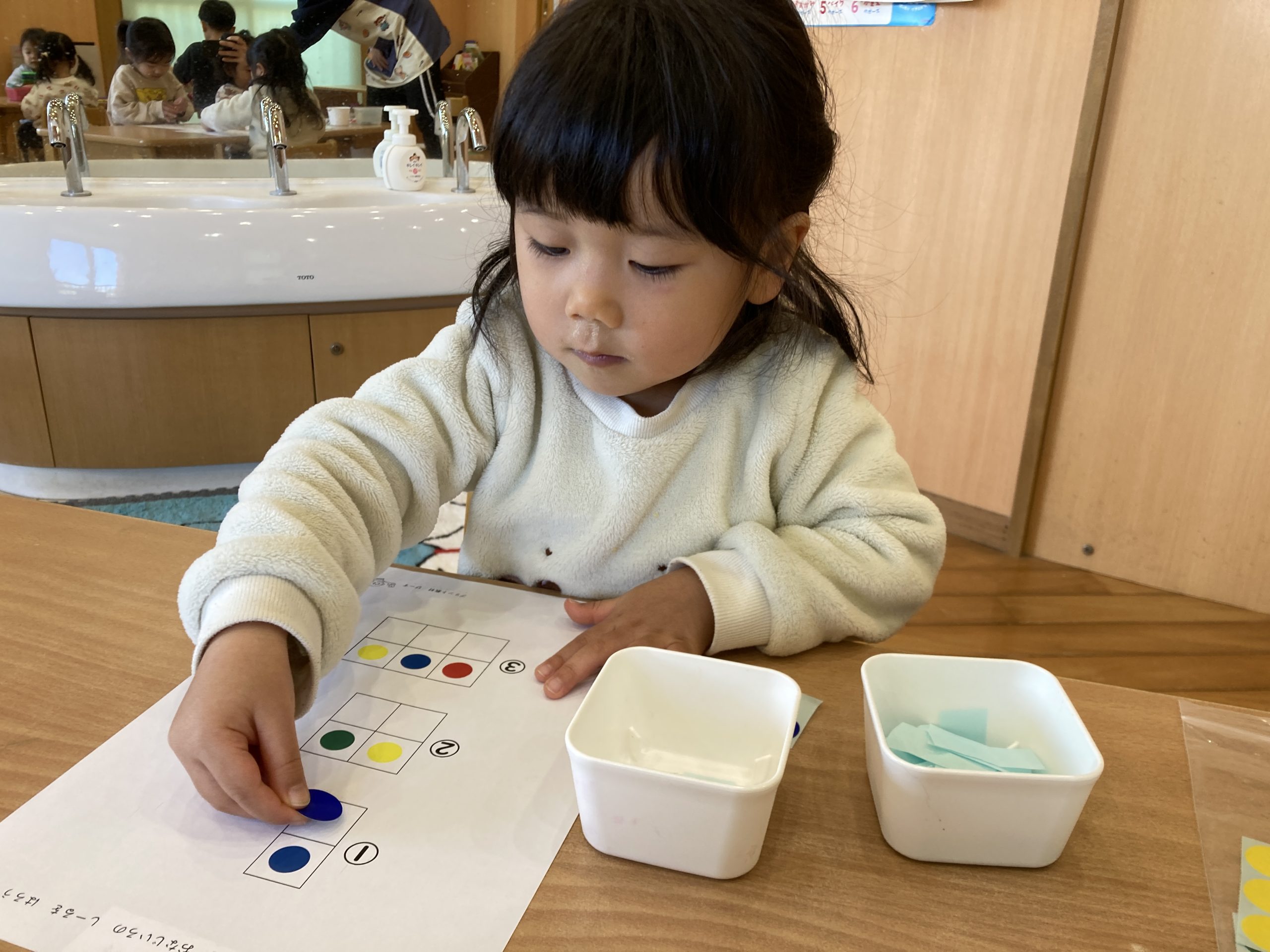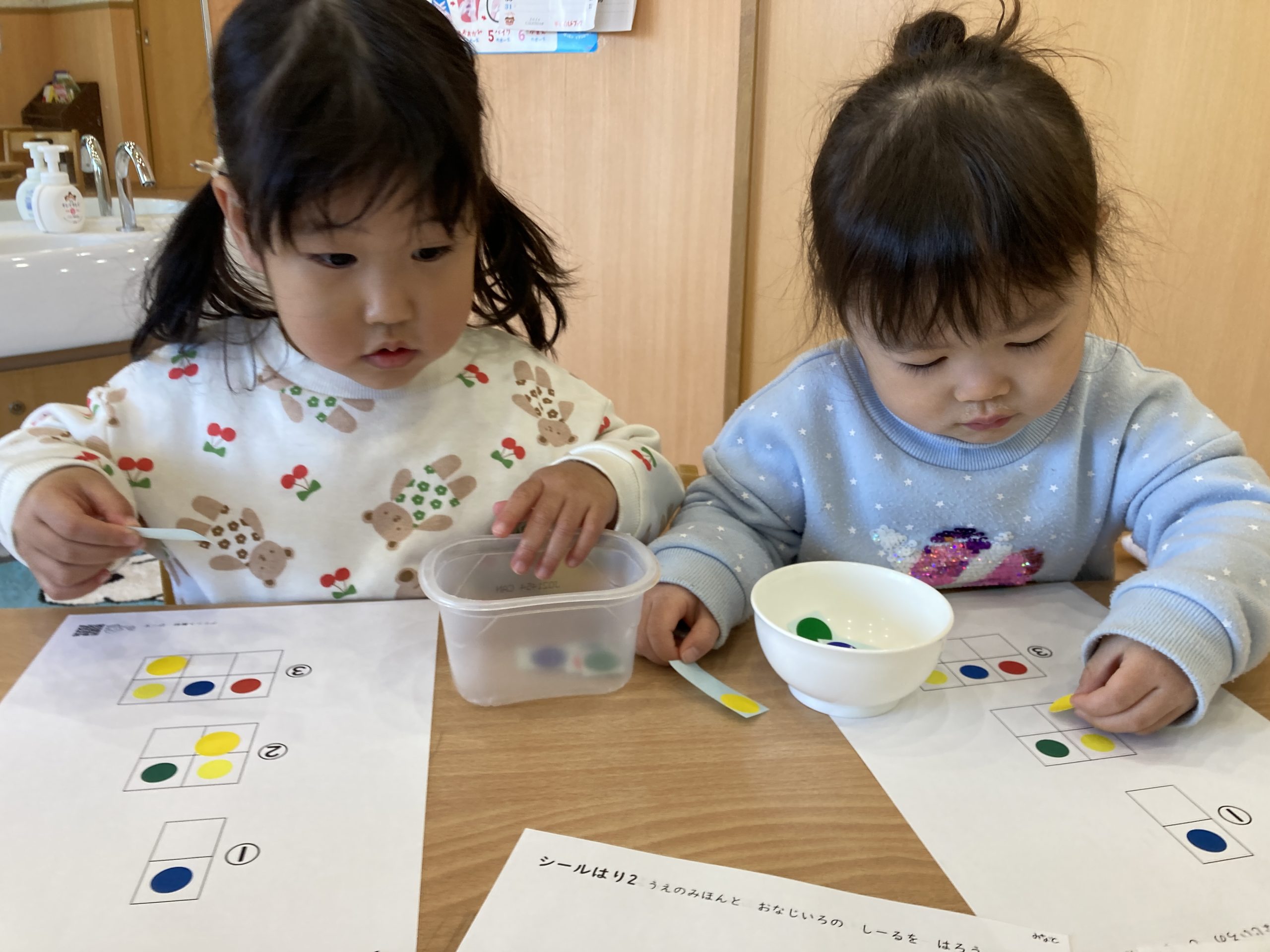 今日は、シール遊びをしました♪上の見本と同じ色のシールを選びながら、上手にペタペタと貼り付けることが出来ていましたよ🍎