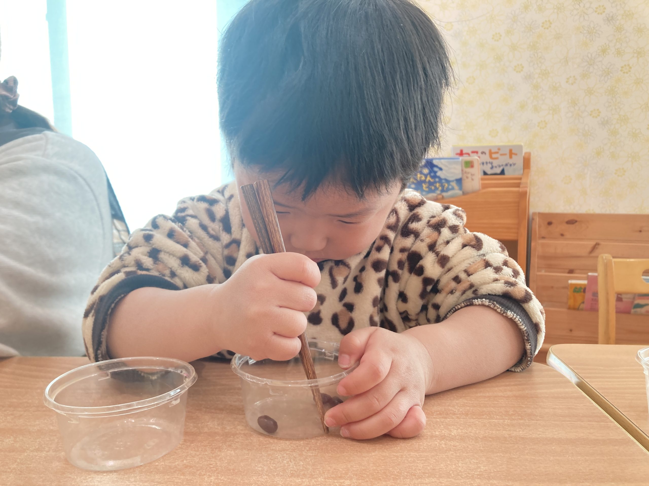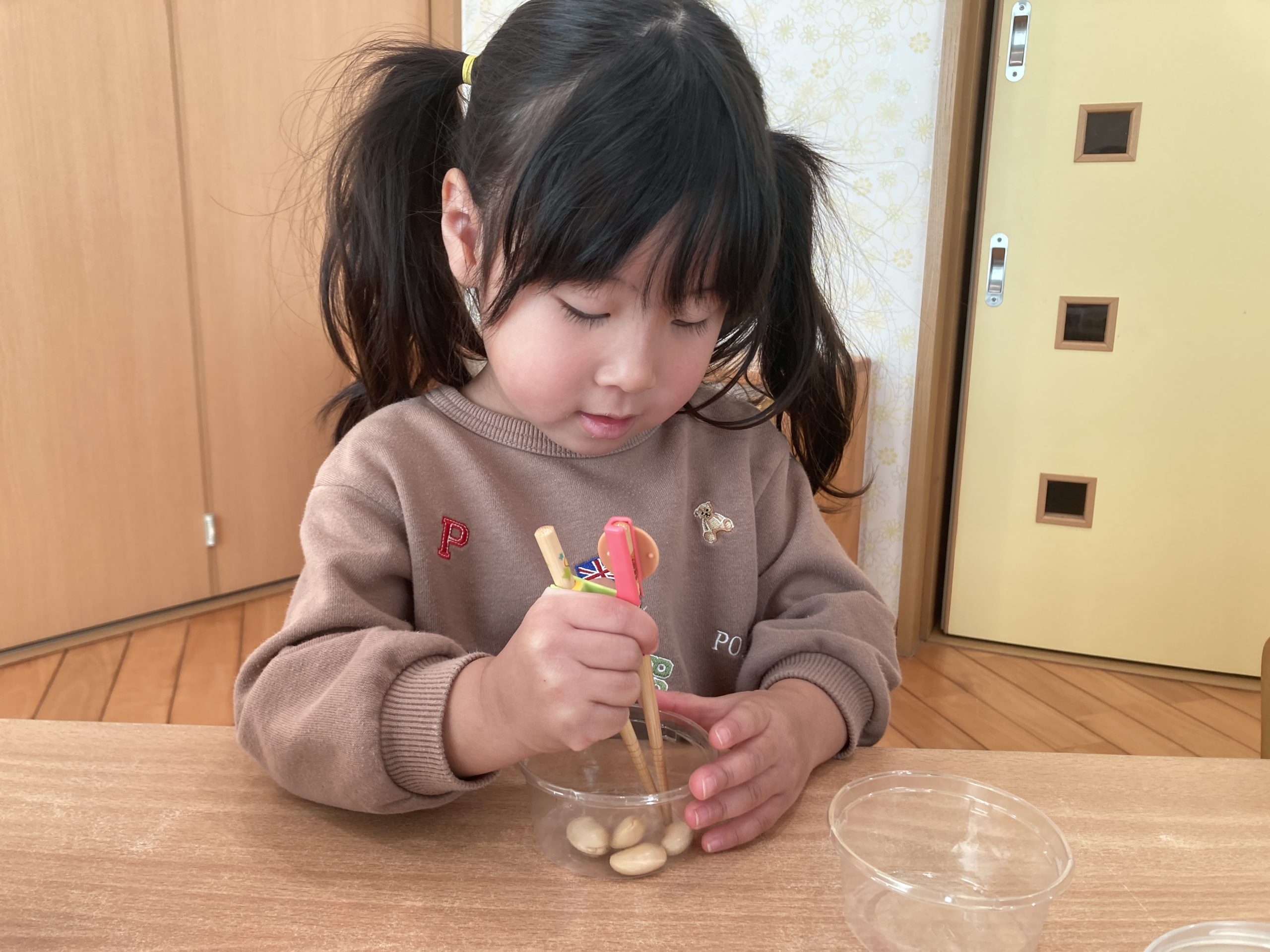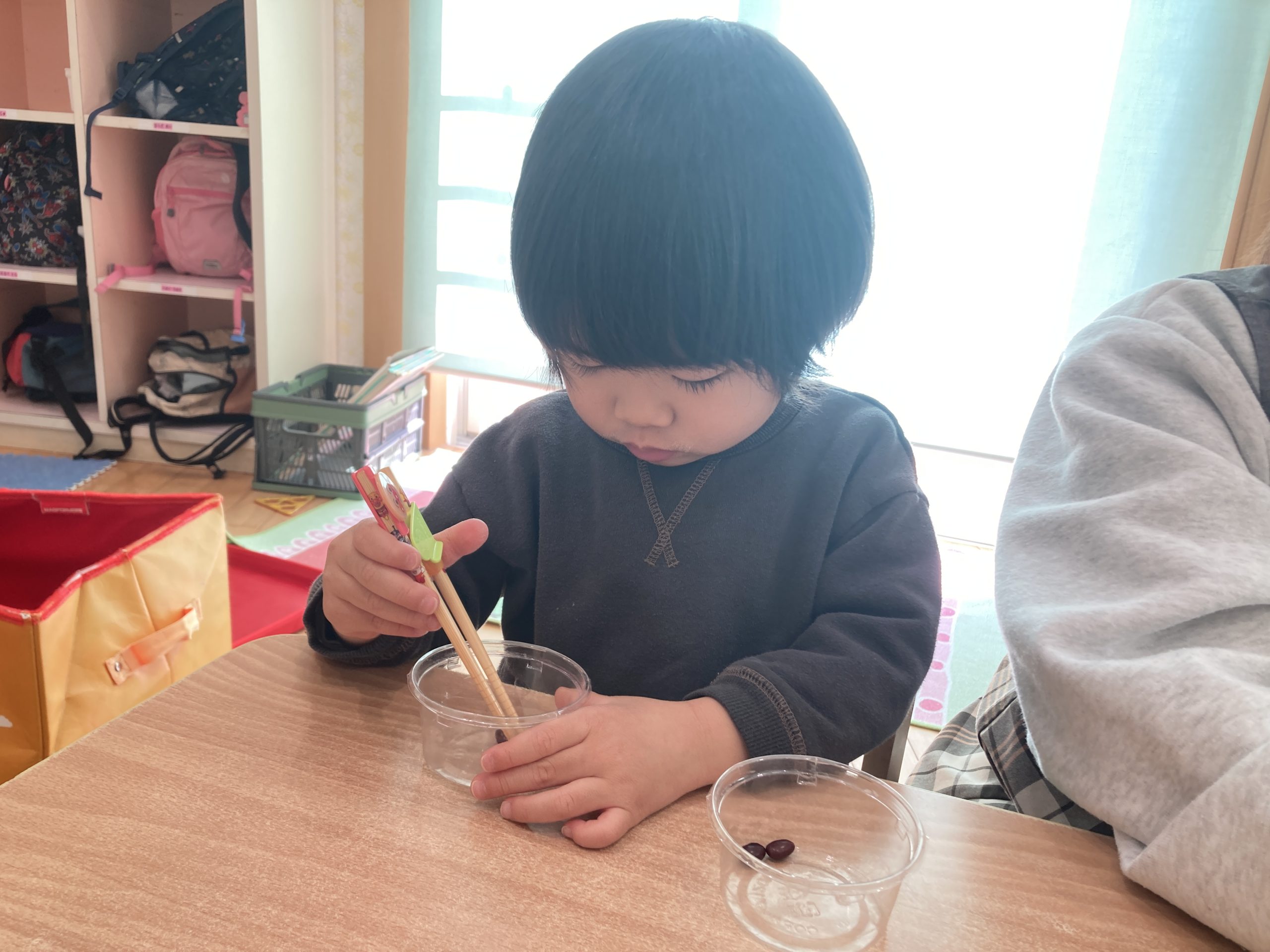 今日は、豆うつしをしました🥢箸を使って大きい豆や小さい豆を一生懸命に掴んでいましたよ✨