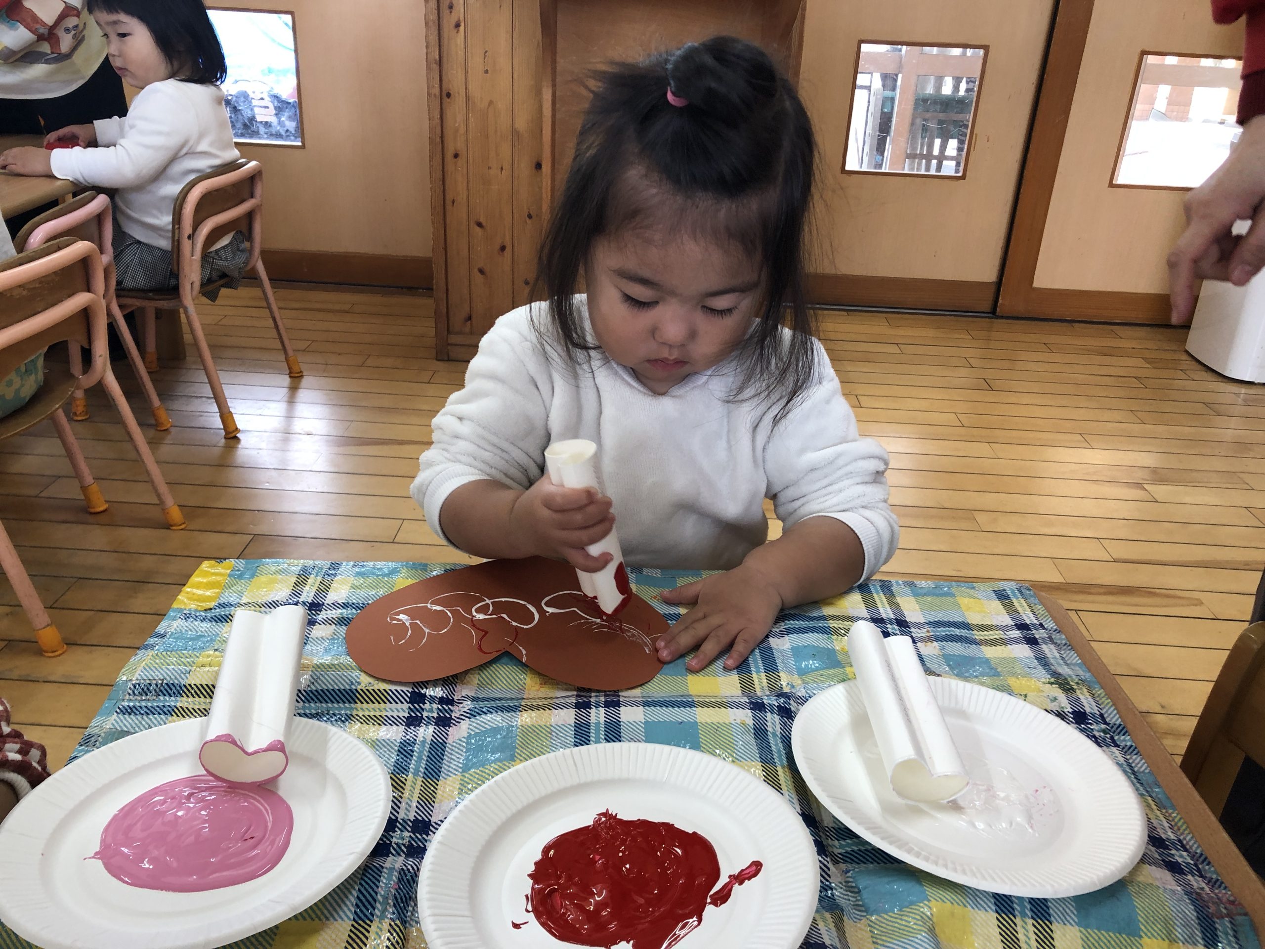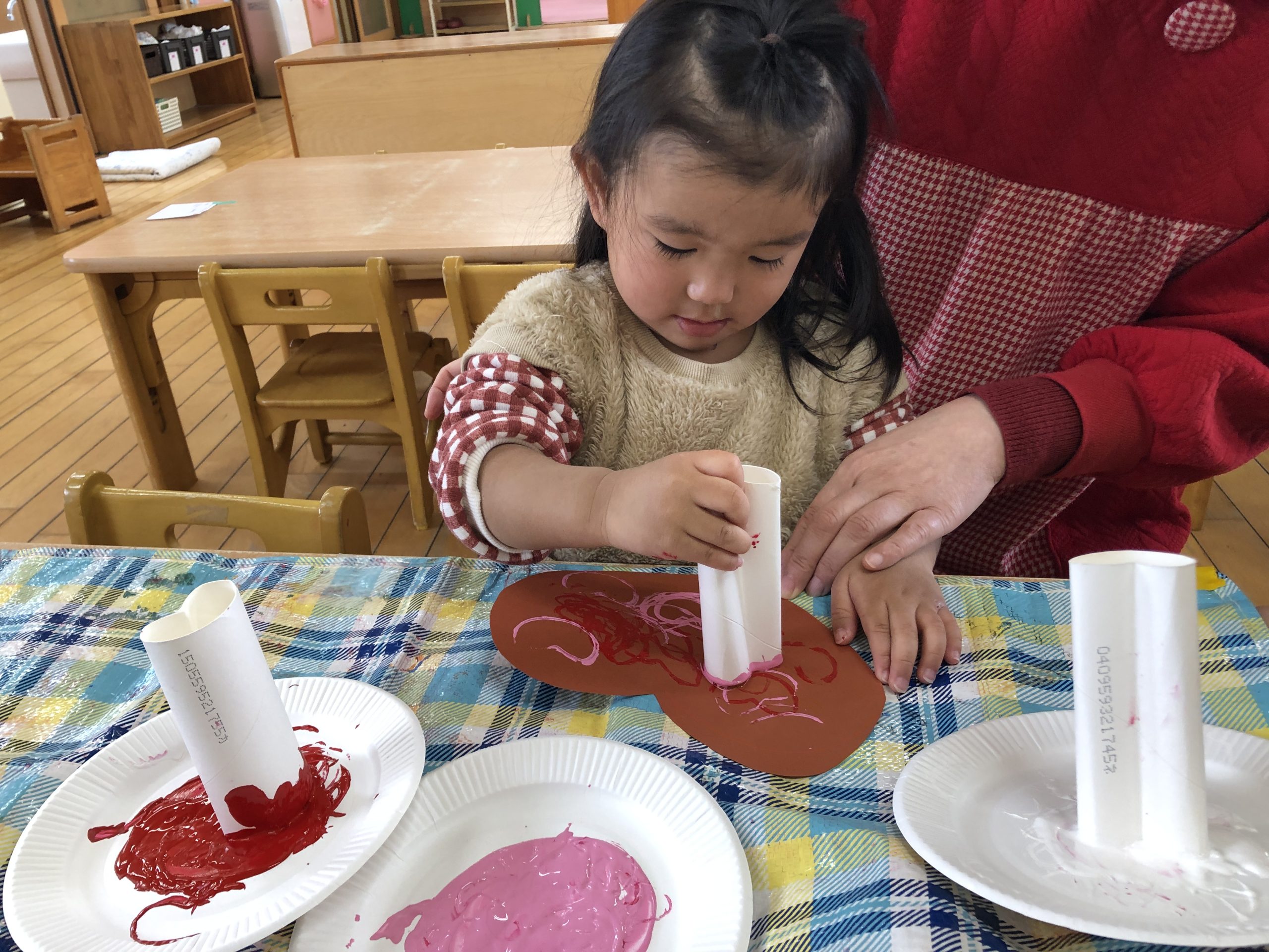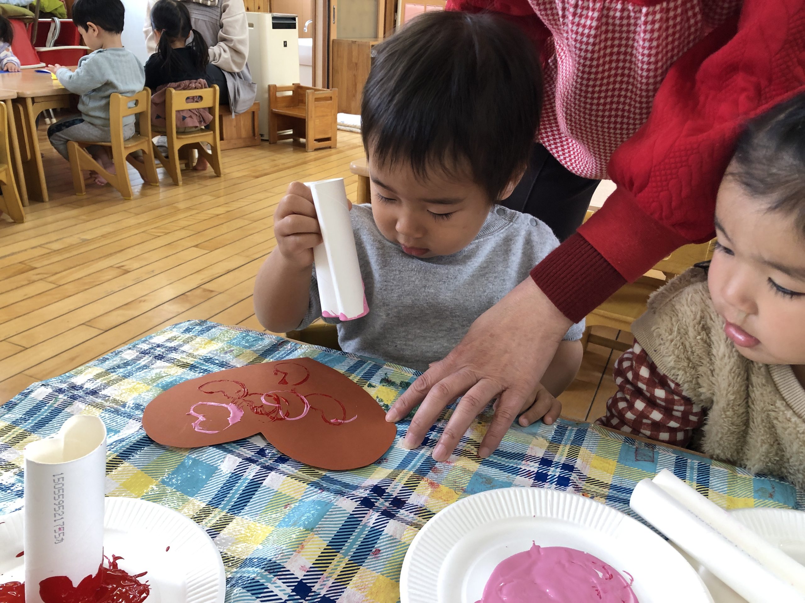 今日は2月の製作でハートのチョコレートを作りました🍫トイレットペーパーの芯でたくさんスタンプして楽しみましたよ♥️