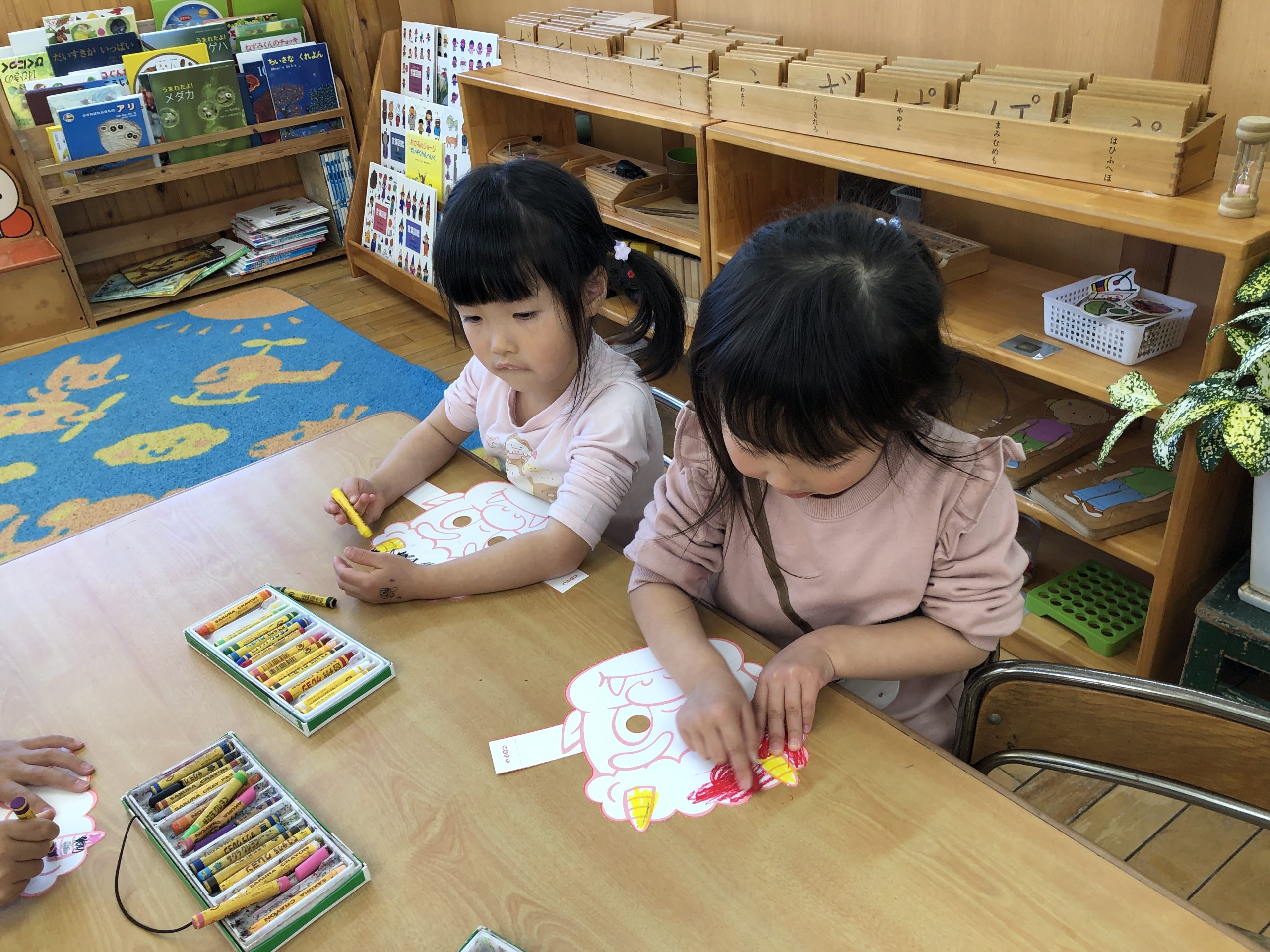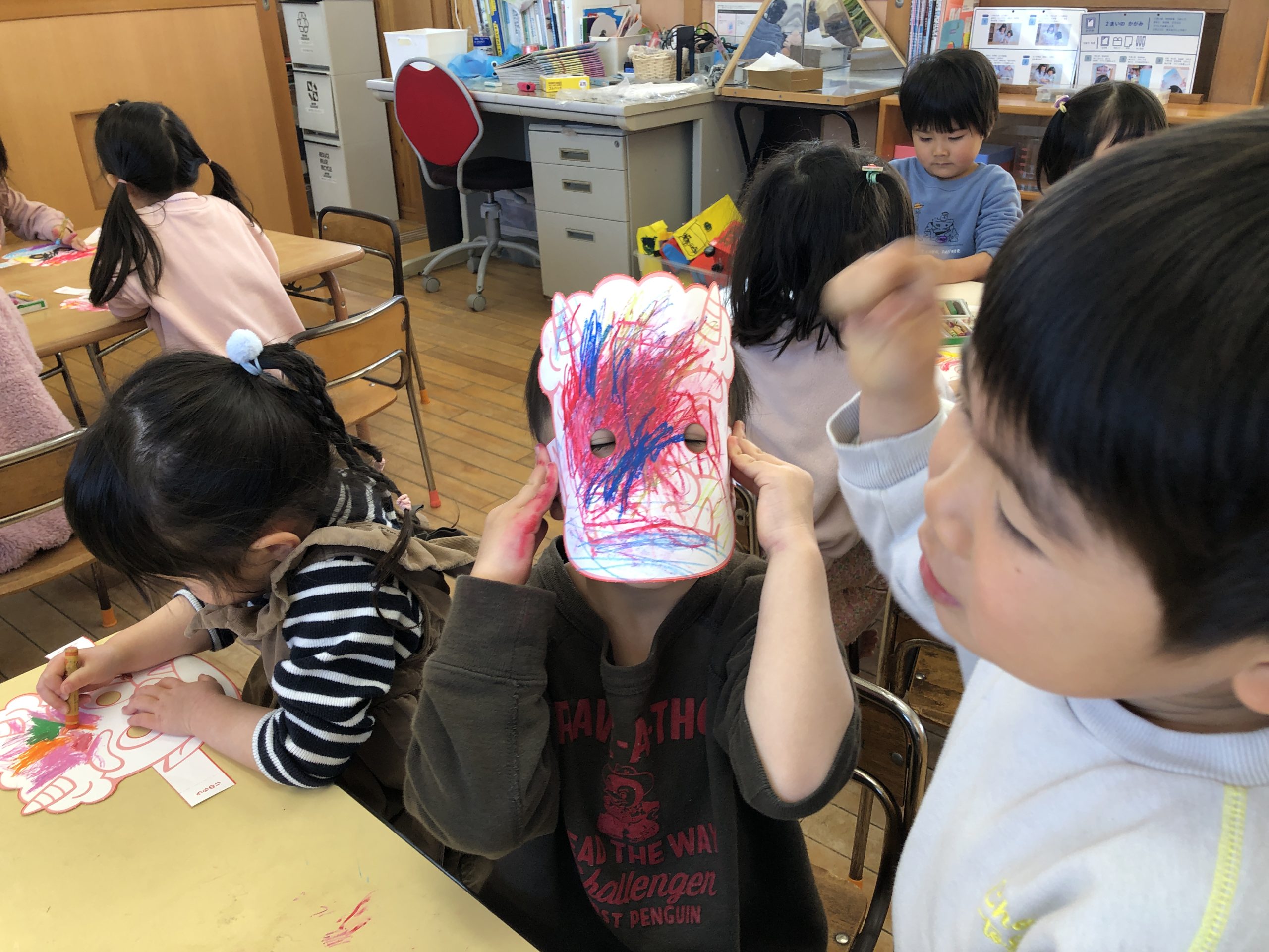 今日は、2月の月刊絵本を見ました。豆まきの話や困っているお友達を助ける話など読み聞かせを聞いた後、それぞれ絵本を見ました。付録で作った鬼のお面も作りました。