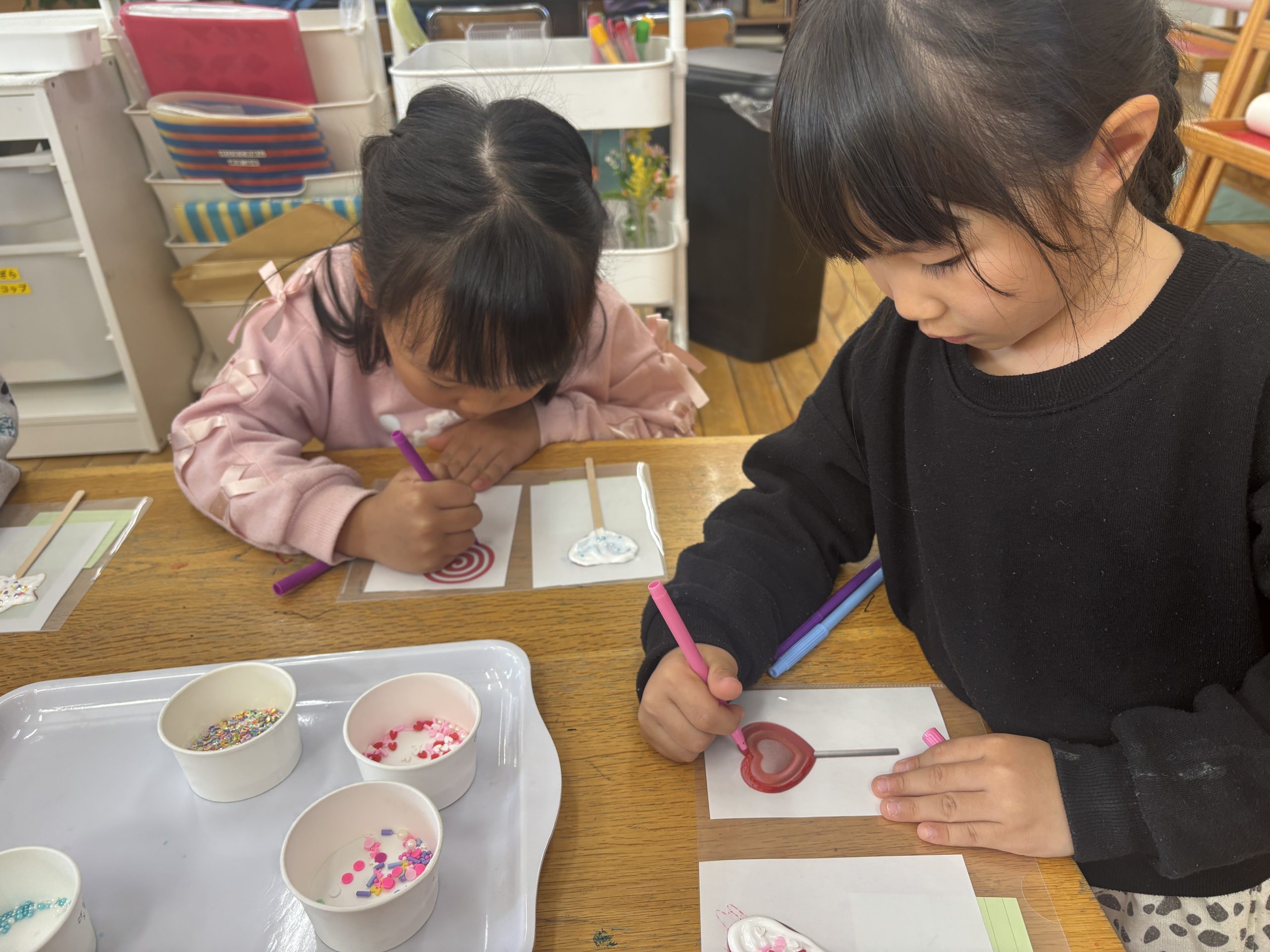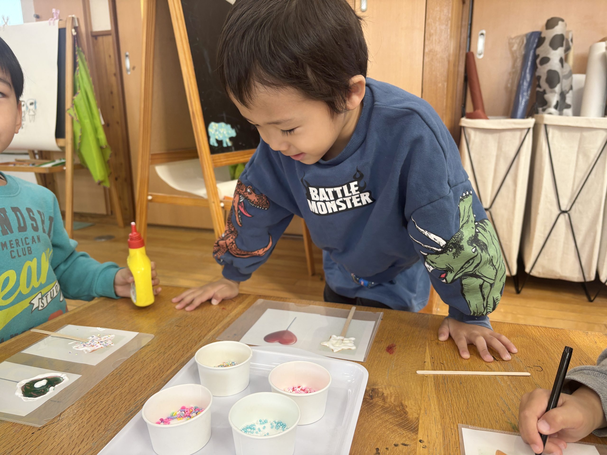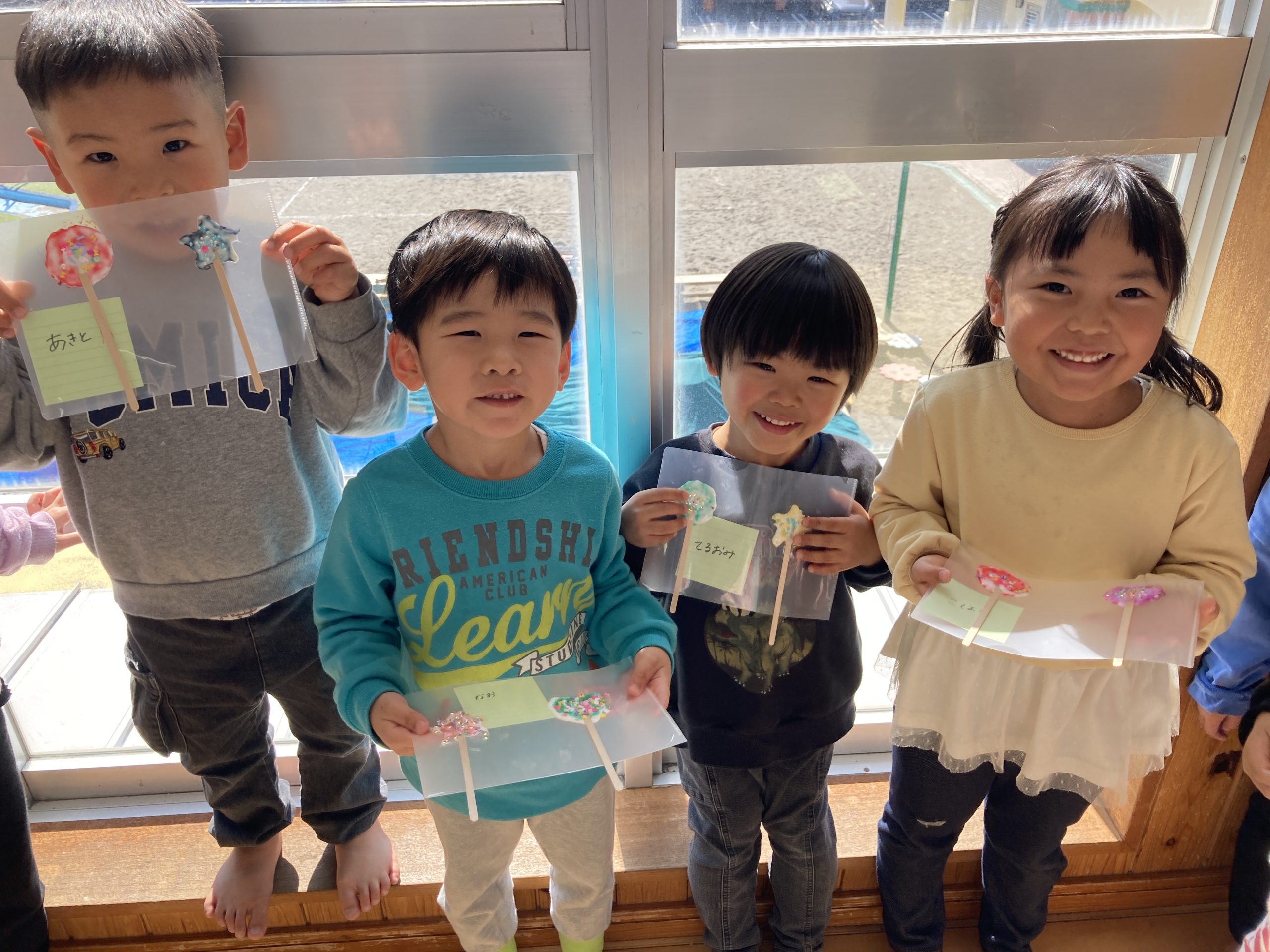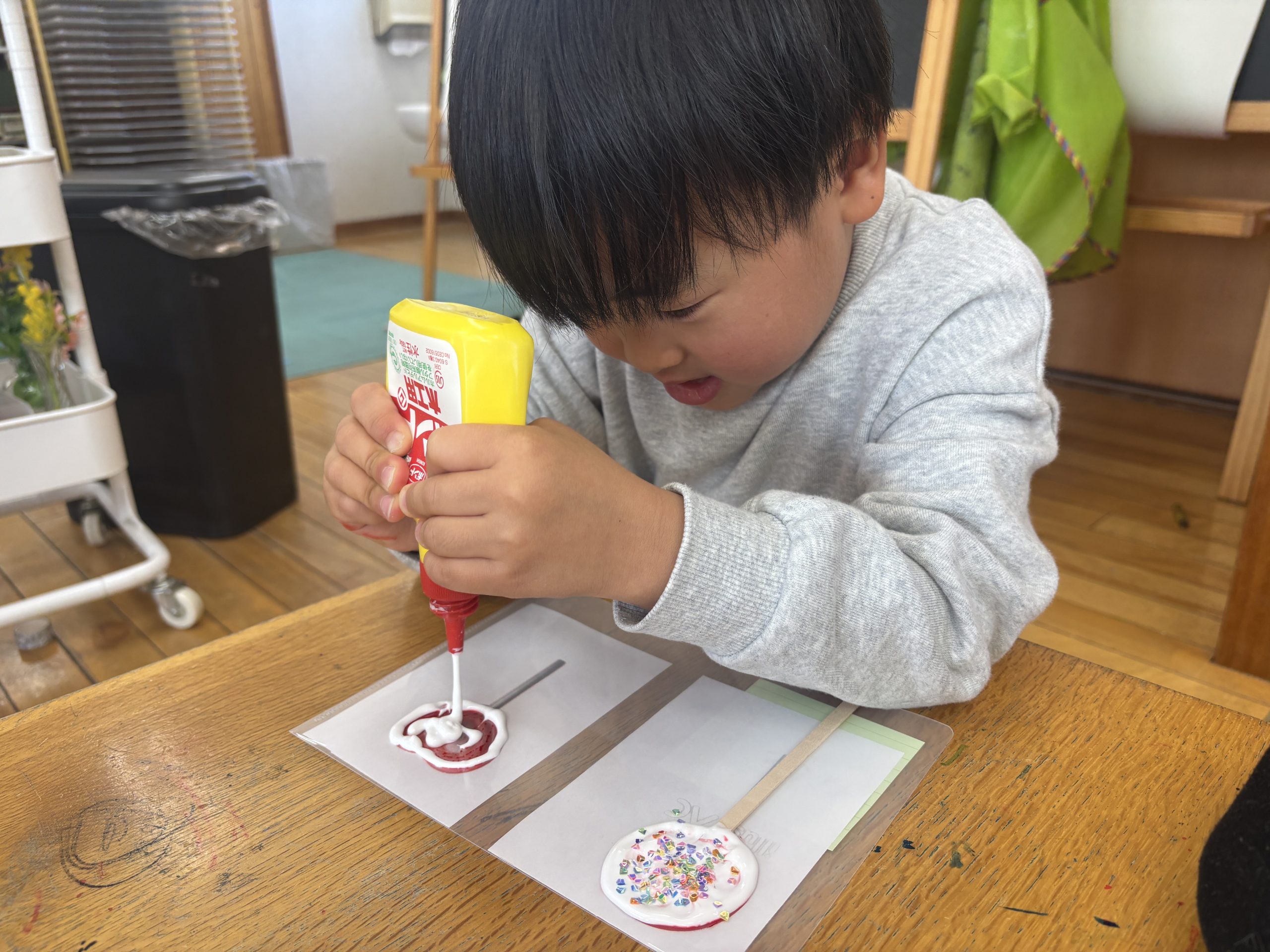 今日はお買い物ごっこの商品製作でペロペロキャンディーをつくりました🍭水性ペンやボンド、ビーズ、マドラーを使って作りました!!まだ完成していませんが、少し乾いたところを触ってみると「ぷにぷに!気持ちいい!」と感触を楽しんでいました💖