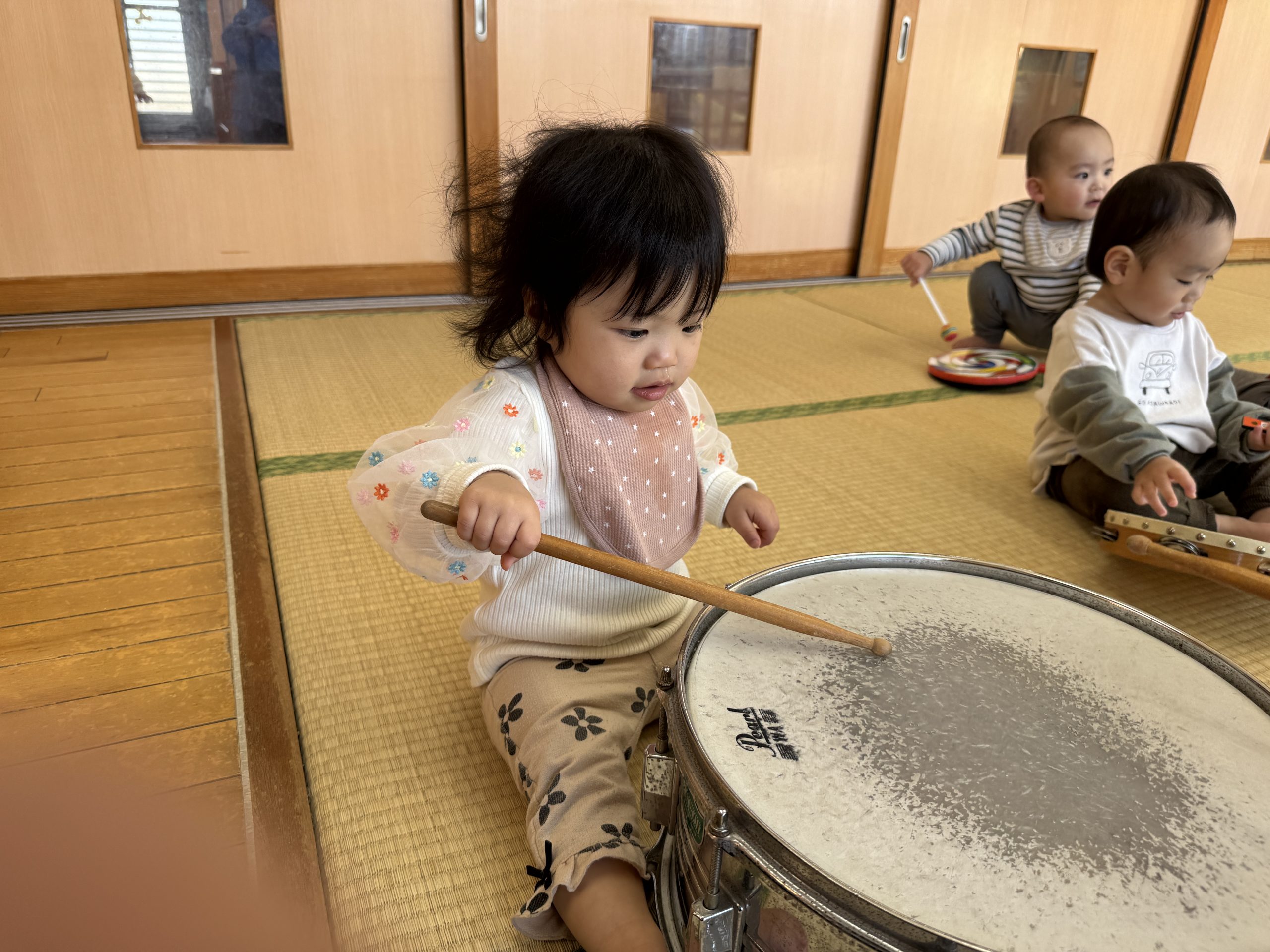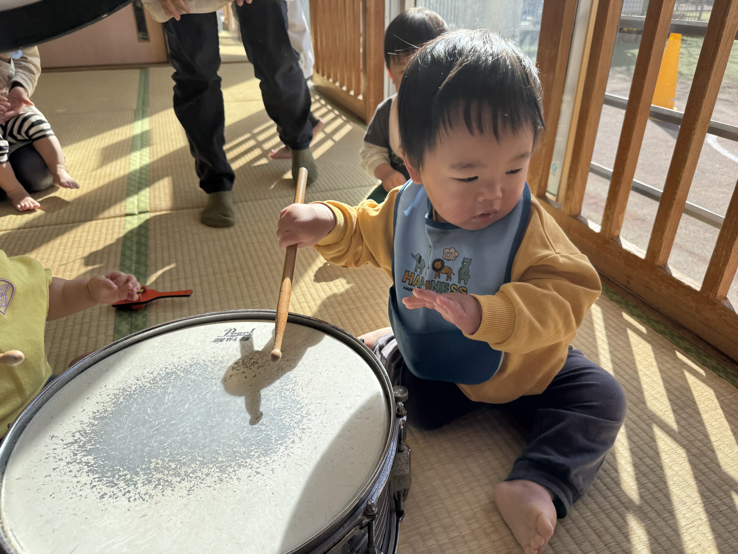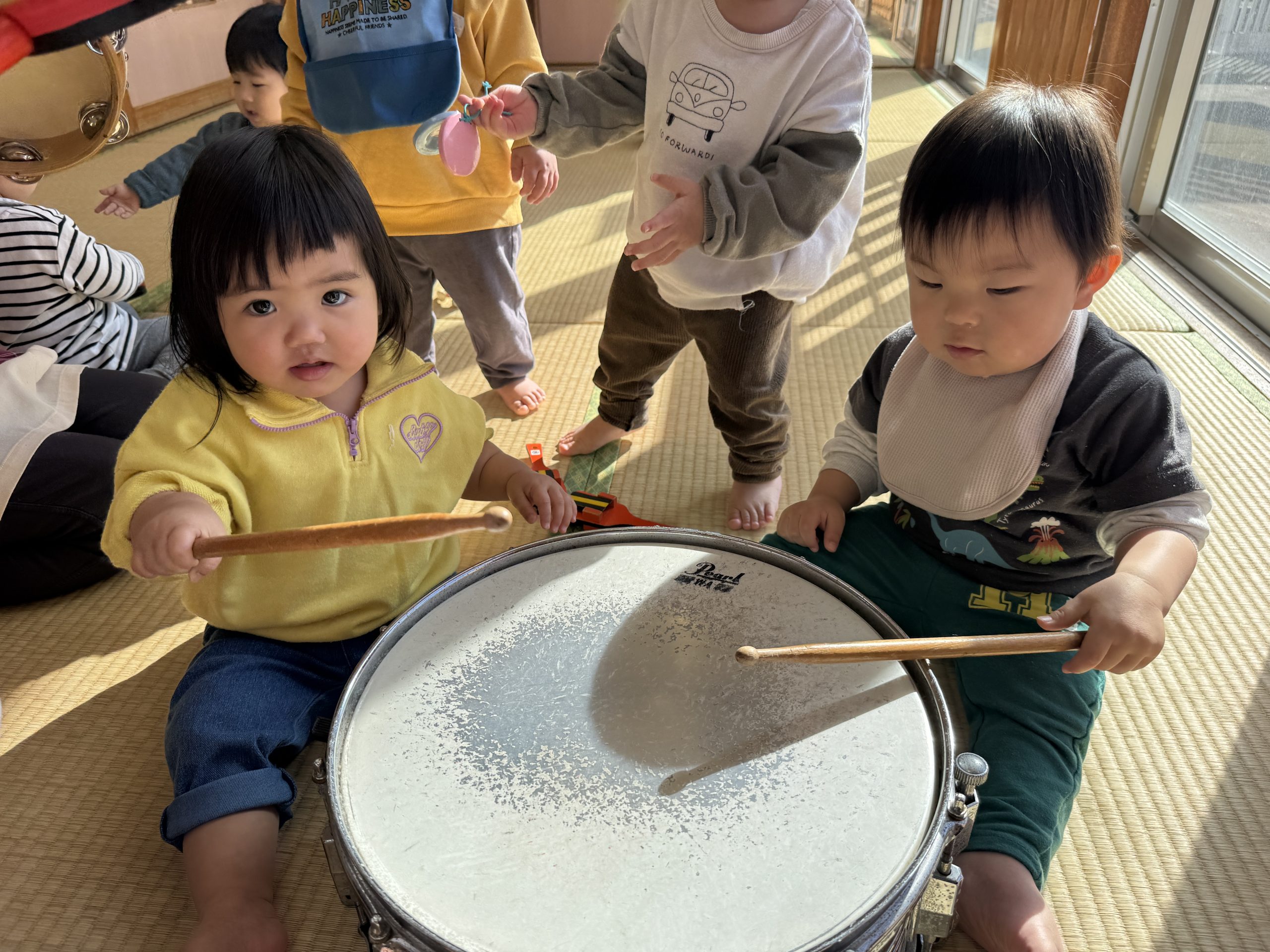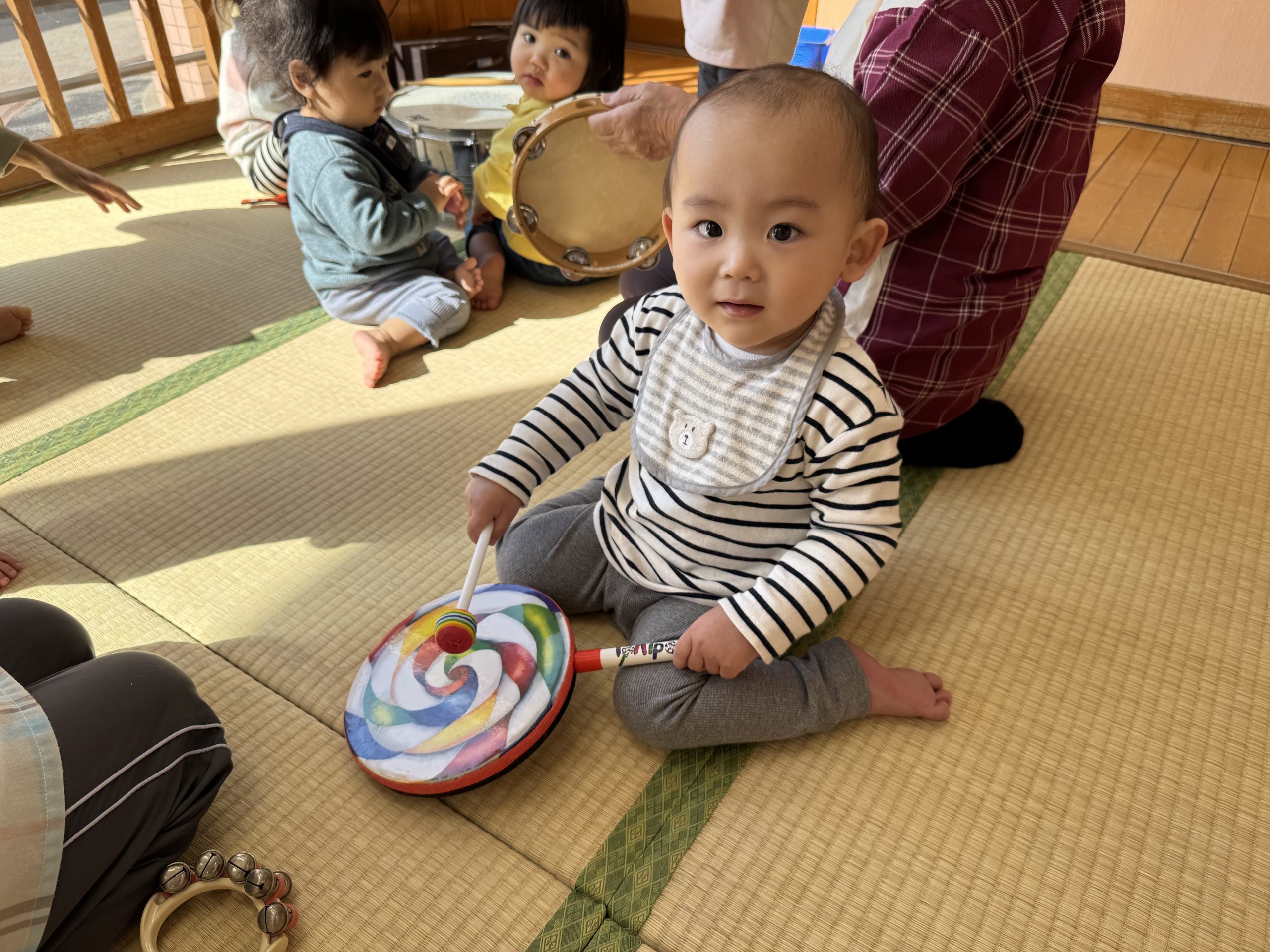 今日は楽器あそびをしました!小太鼓やタンバリン、鈴、鳴子をだし音楽に合わせてノリノリで鳴らしたひよこぐみさんでした☺️