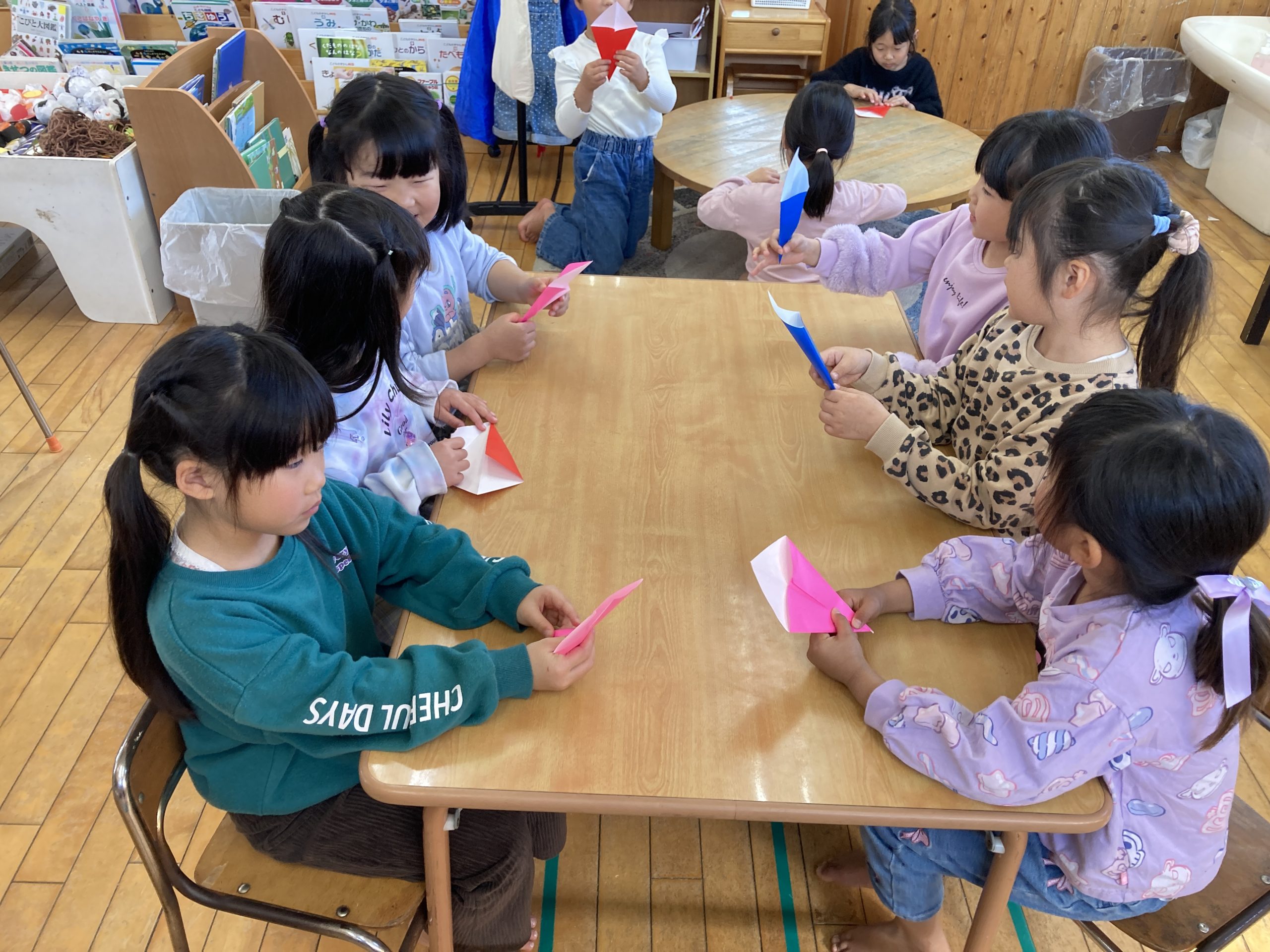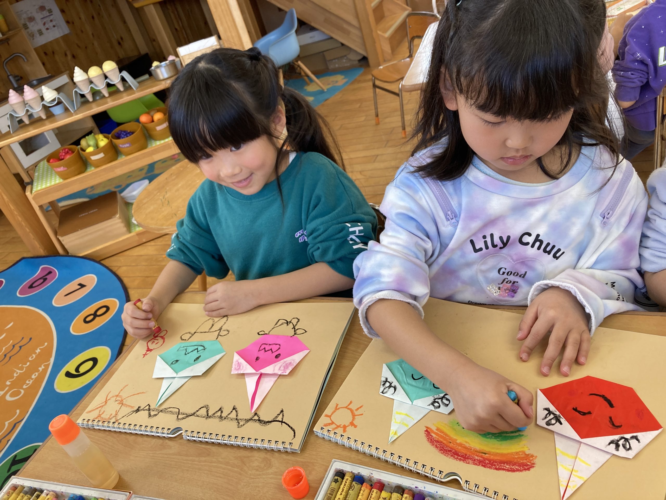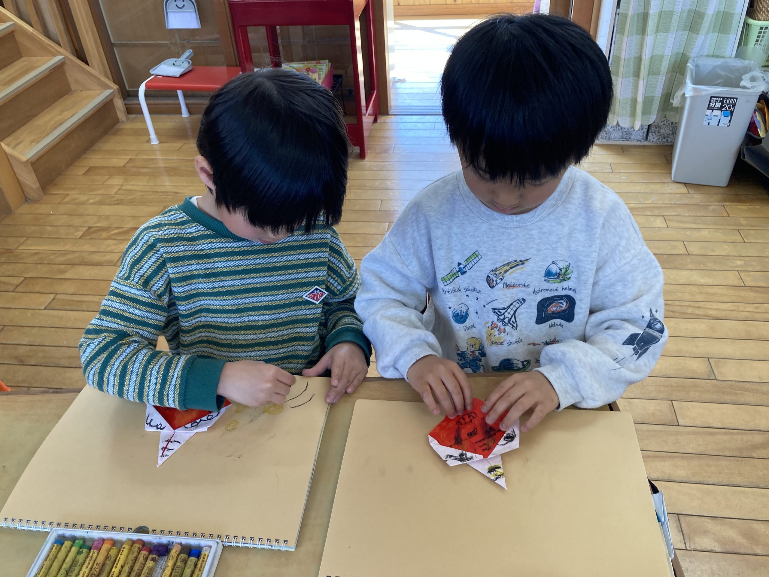 今日は、折り紙で「おに」を作りました。好きな色の折り紙で好きな数の鬼を折りました。出来上がった後は、製作帳に貼って金棒や豆などイメージするものを描いていました👹