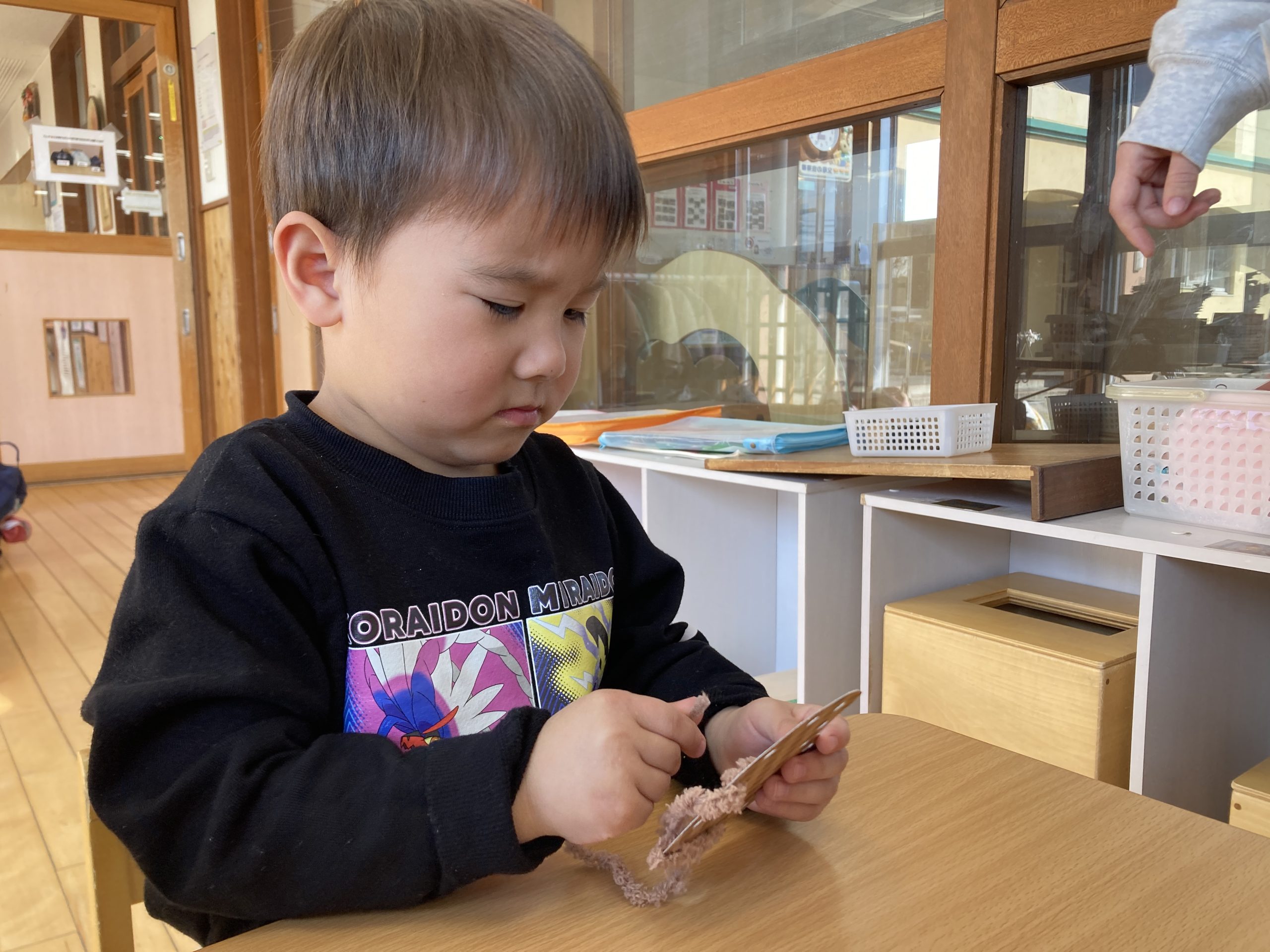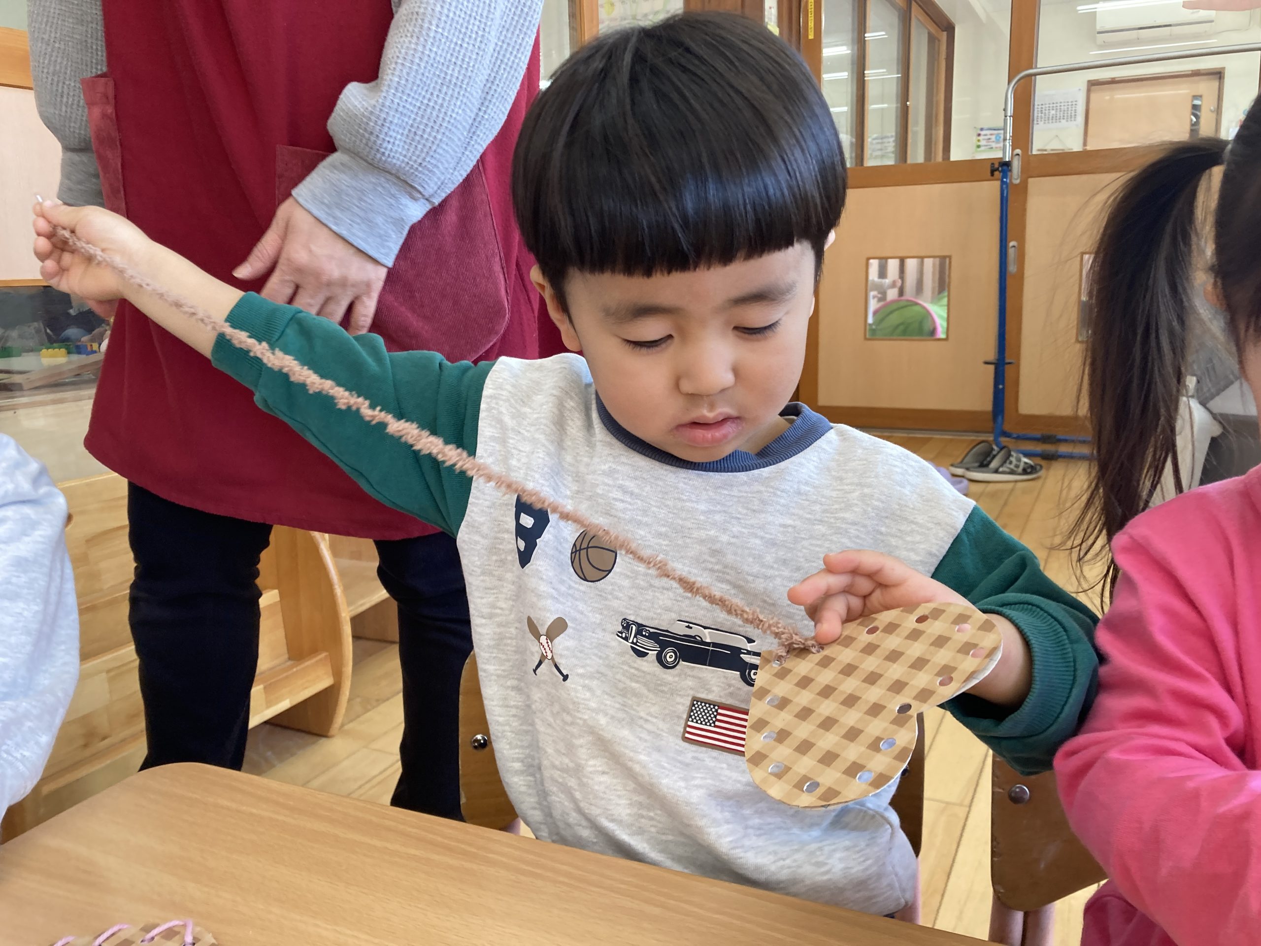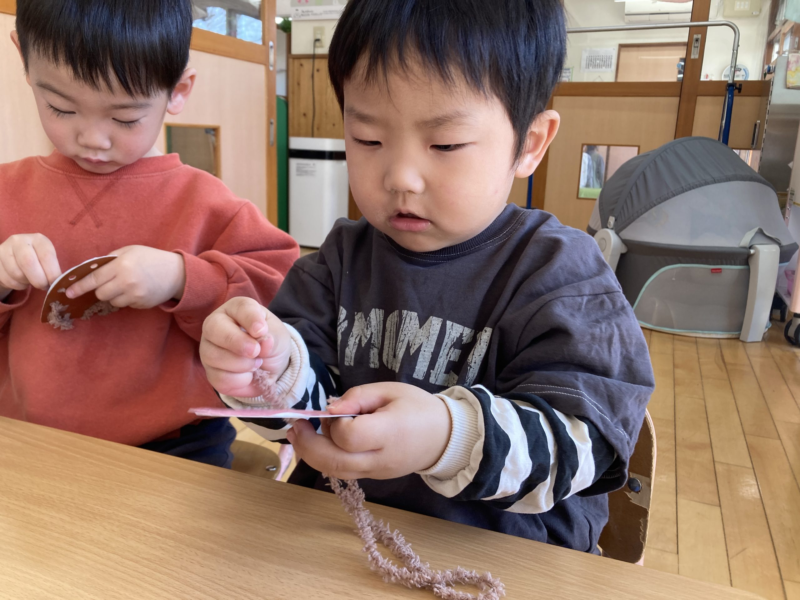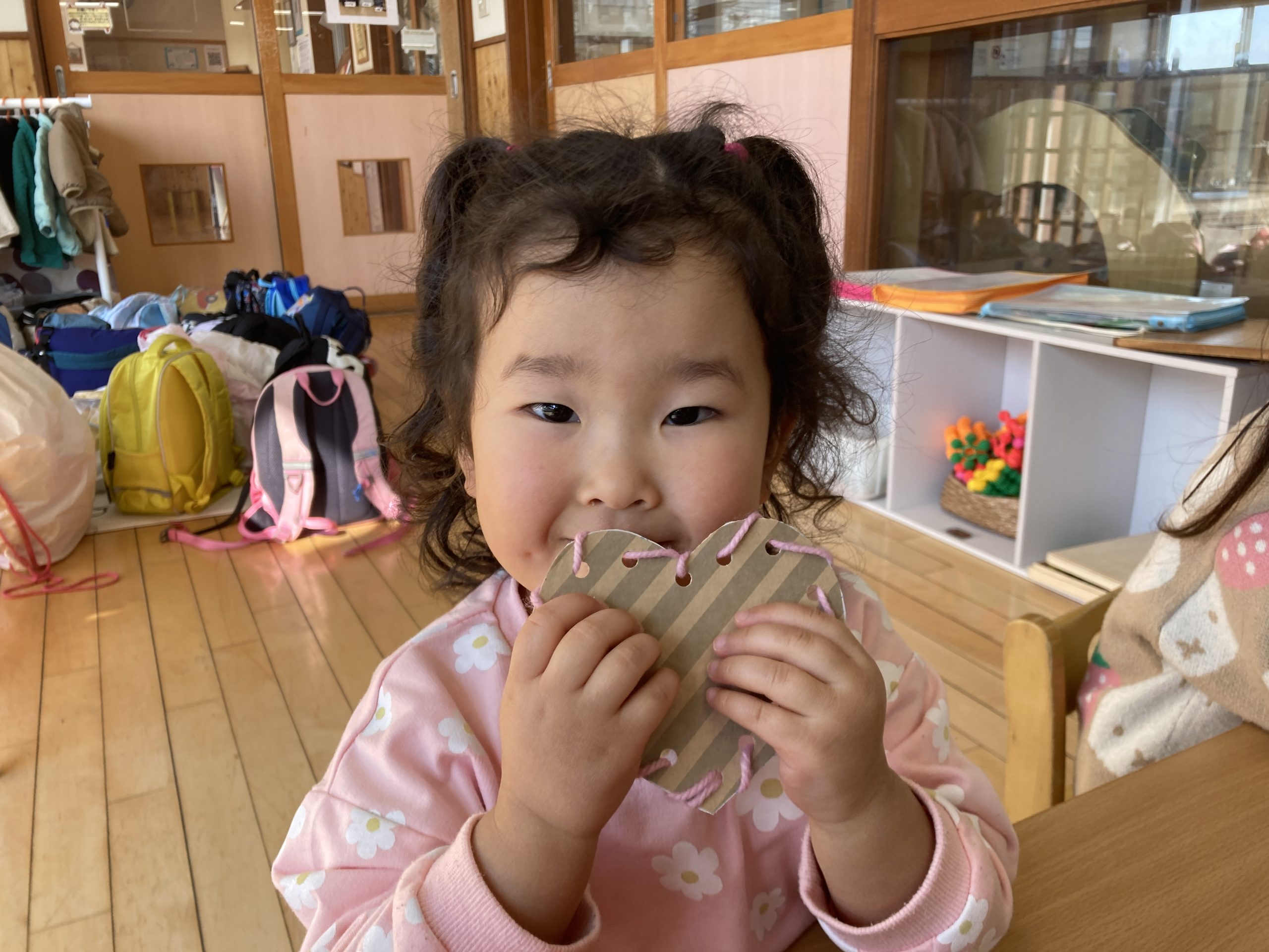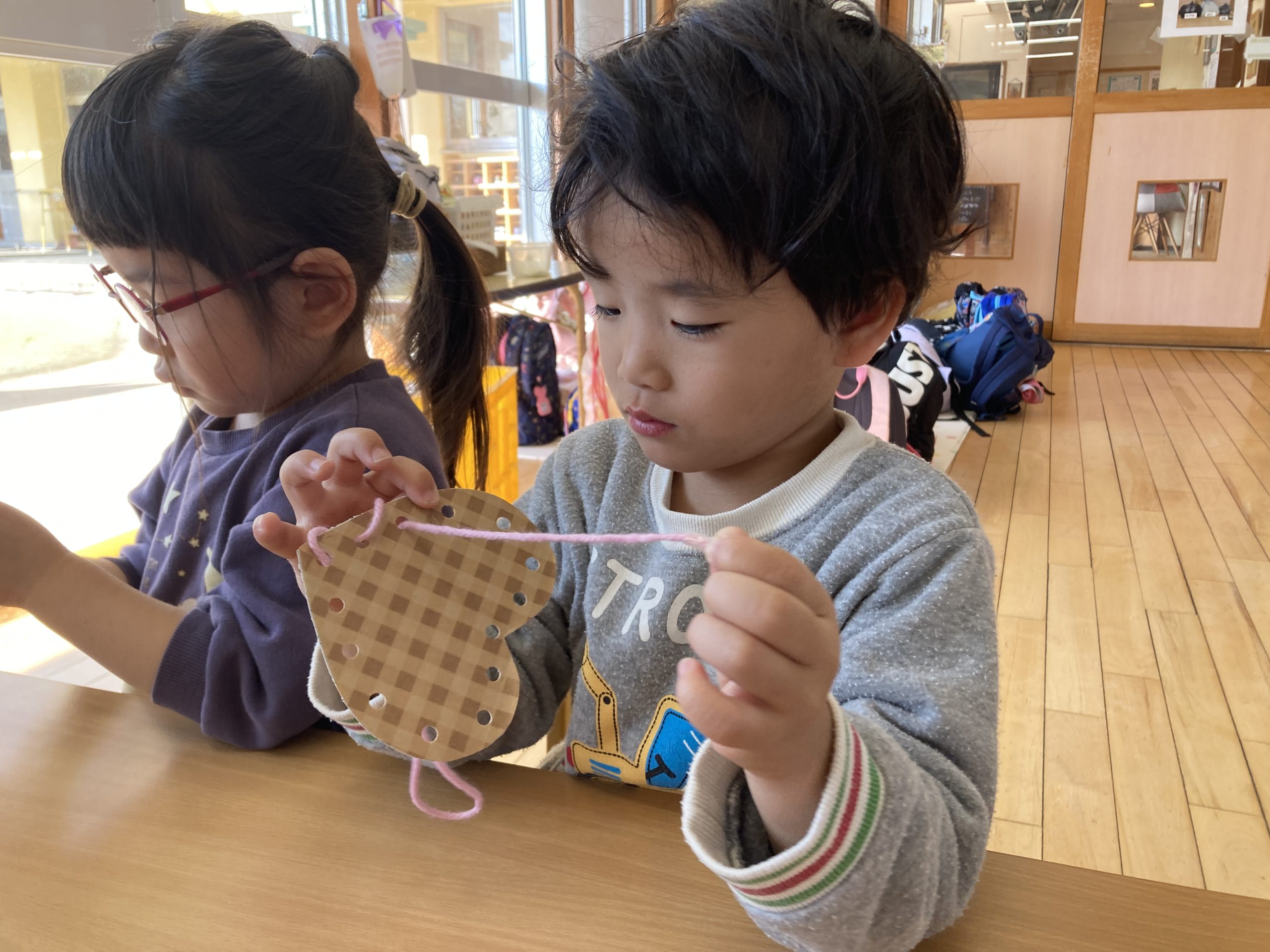 今日は、お買い物ごっこの製作をしました🛍️ハートの形の厚紙に、毛糸を通しました。みんな上手に通すことができてきて、かわいい作品が出来上がっていましたよ🤎