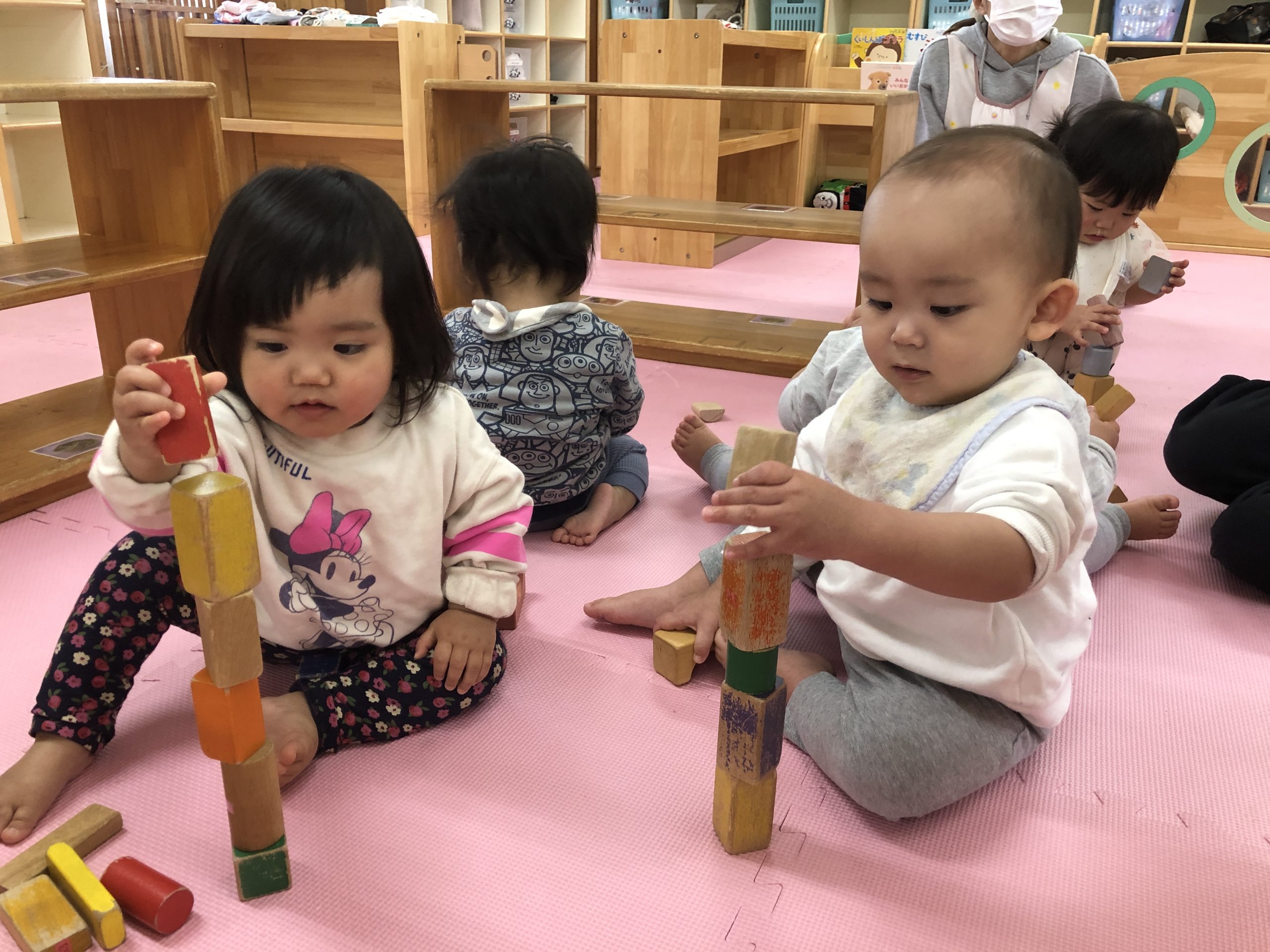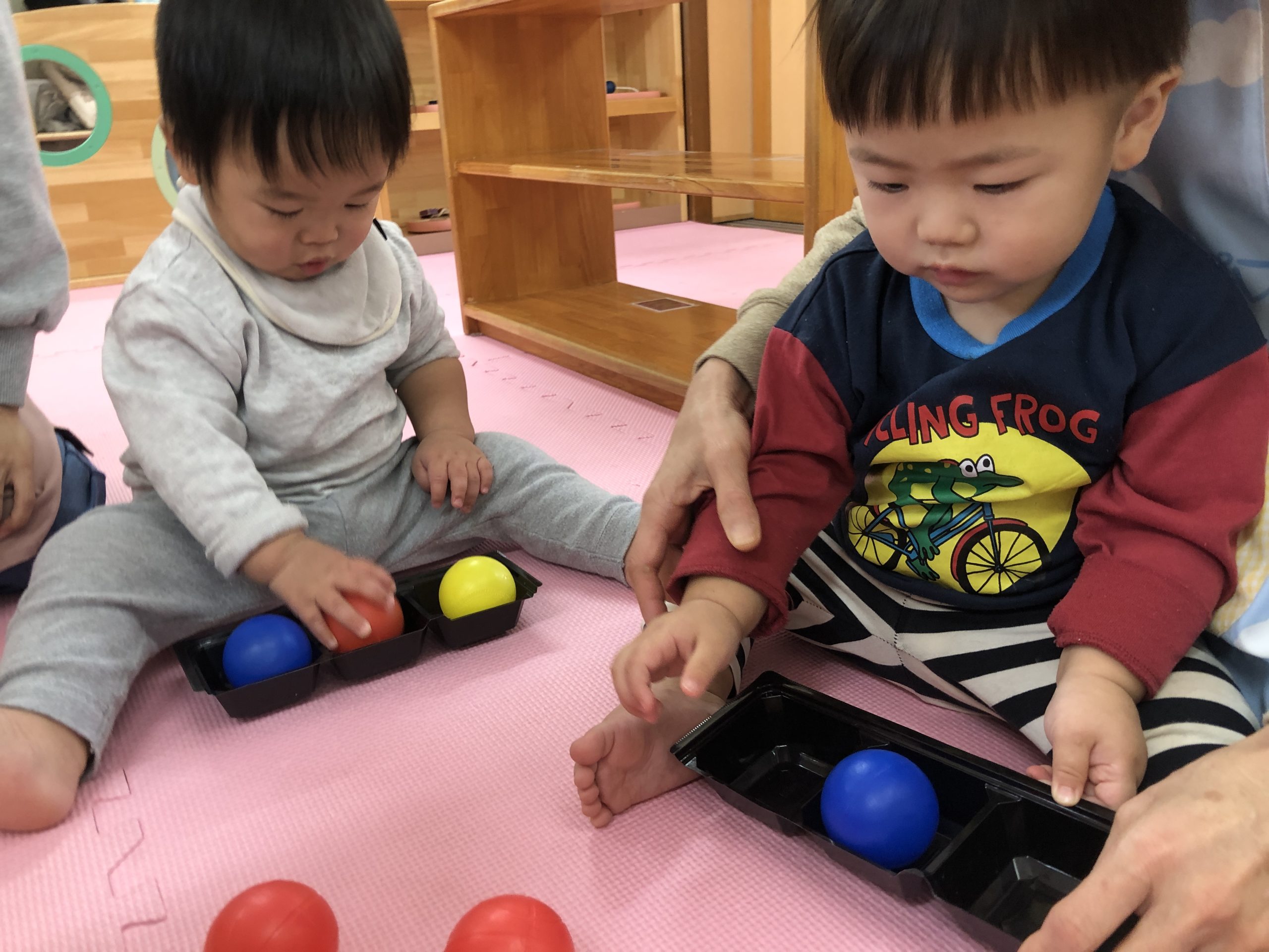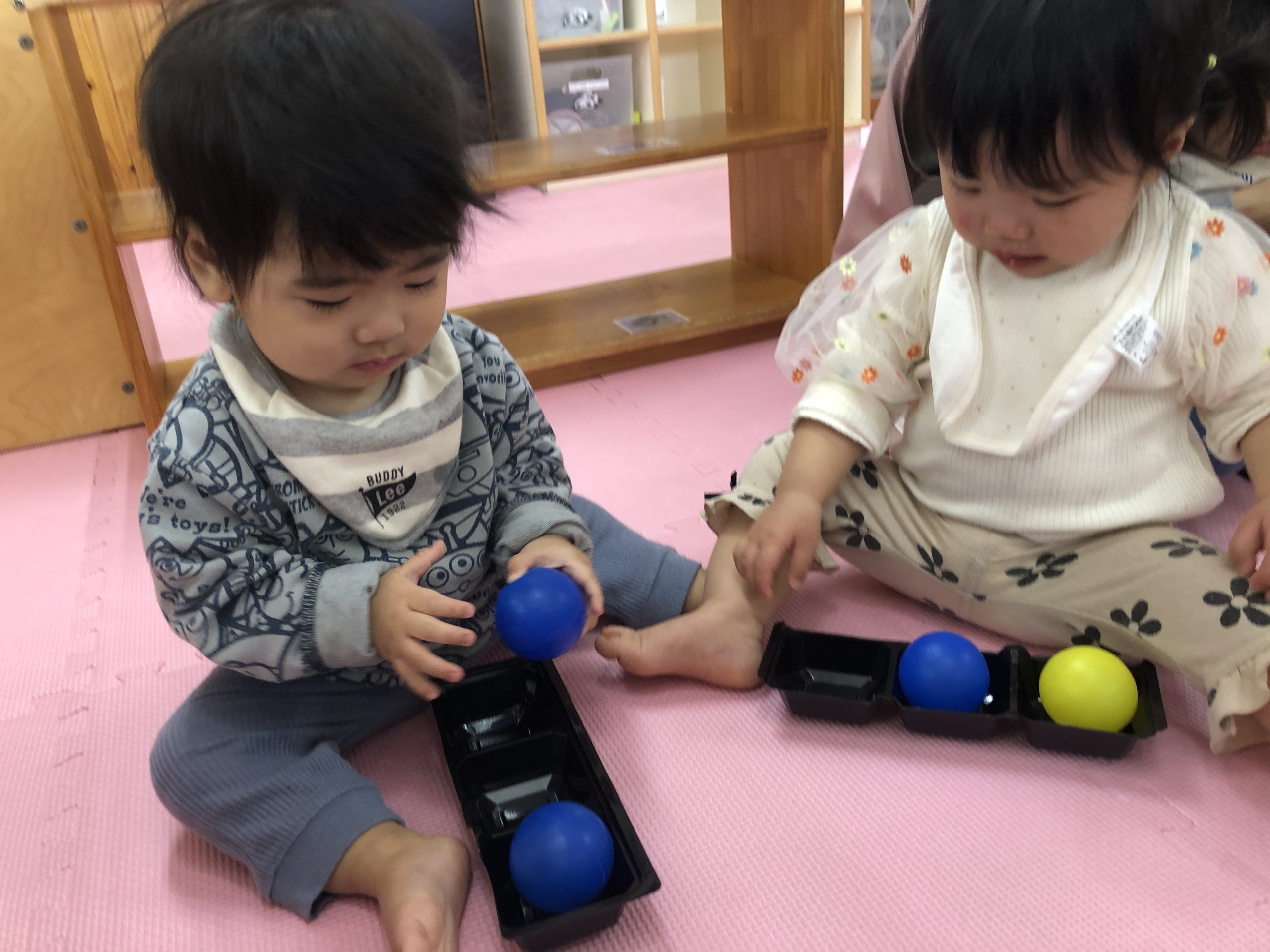 今日は、ボールや積み木を使い数の認知あそびをしました。「1〜、2〜、3…」と数えると枠に入れたり、積み木を積み重ねていましたよ✨