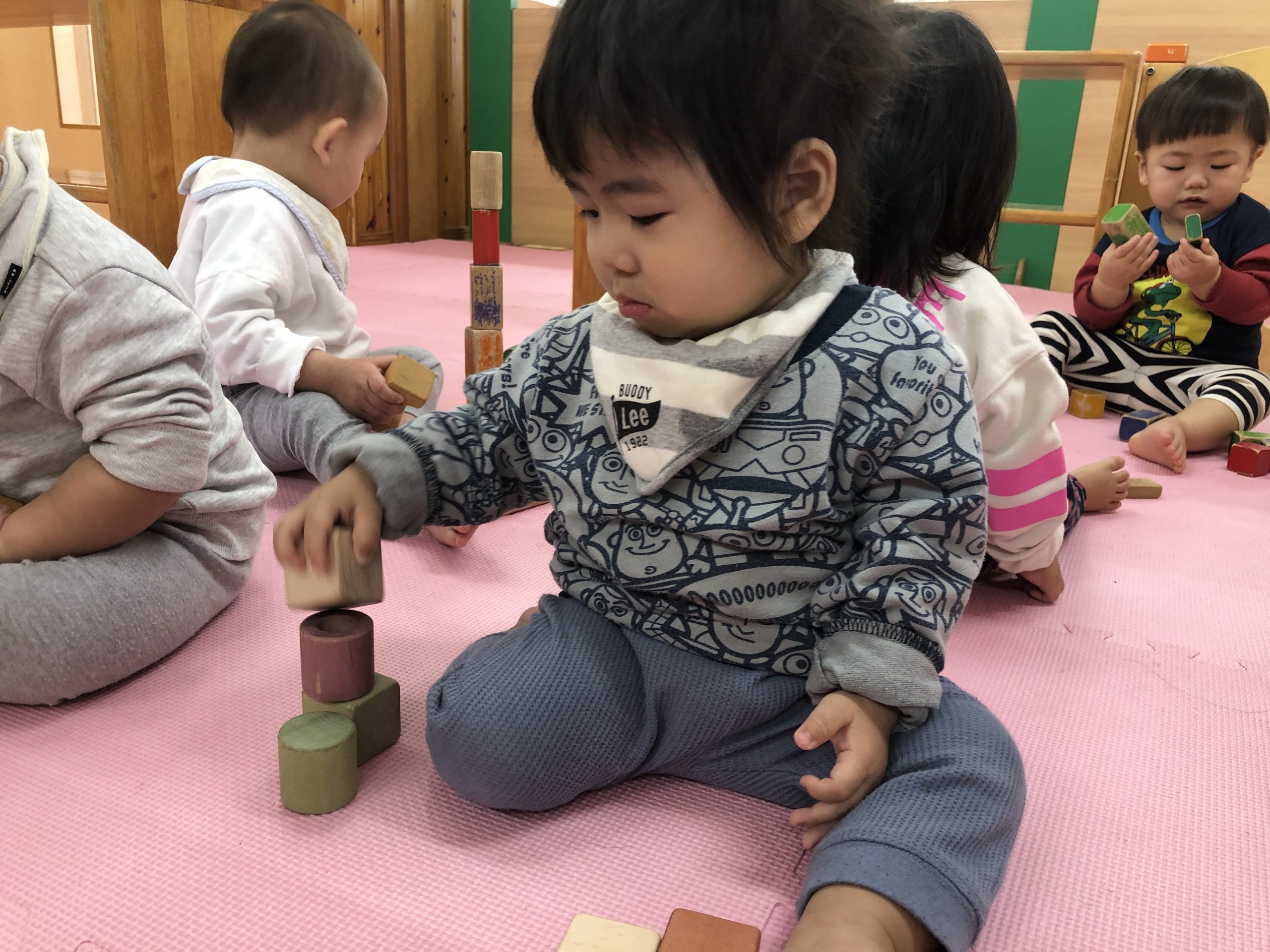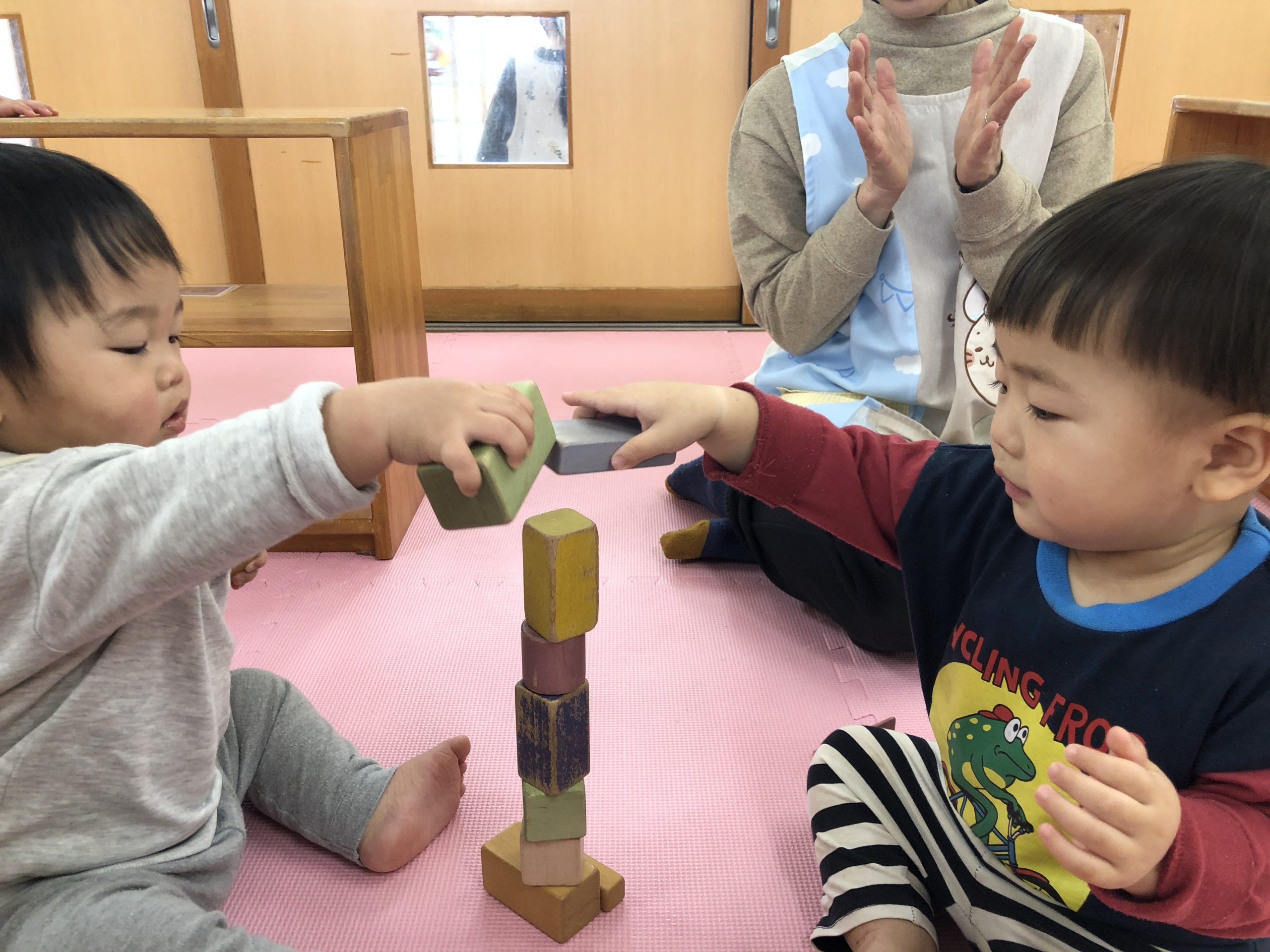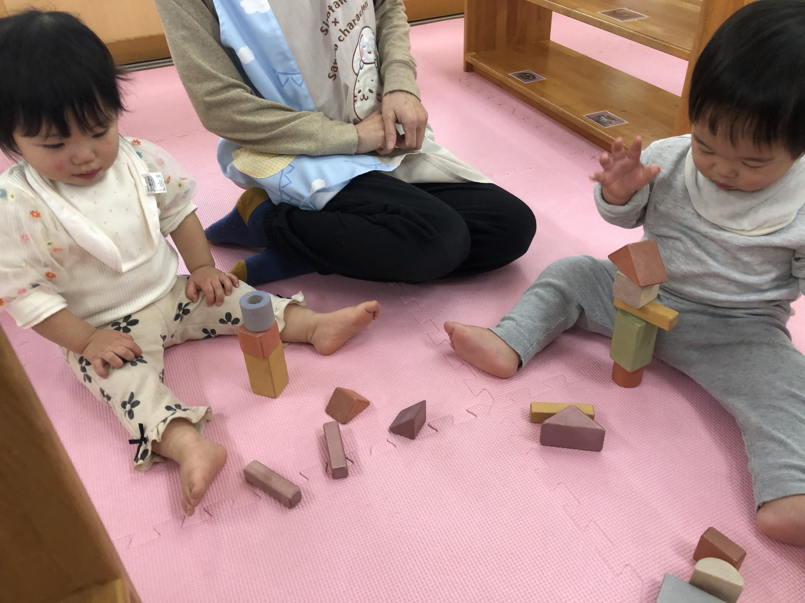 今日は、ボールや積み木を使い数の認知あそびをしました。「1〜、2〜、3…」と数えると枠に入れたり、積み木を積み重ねていましたよ✨