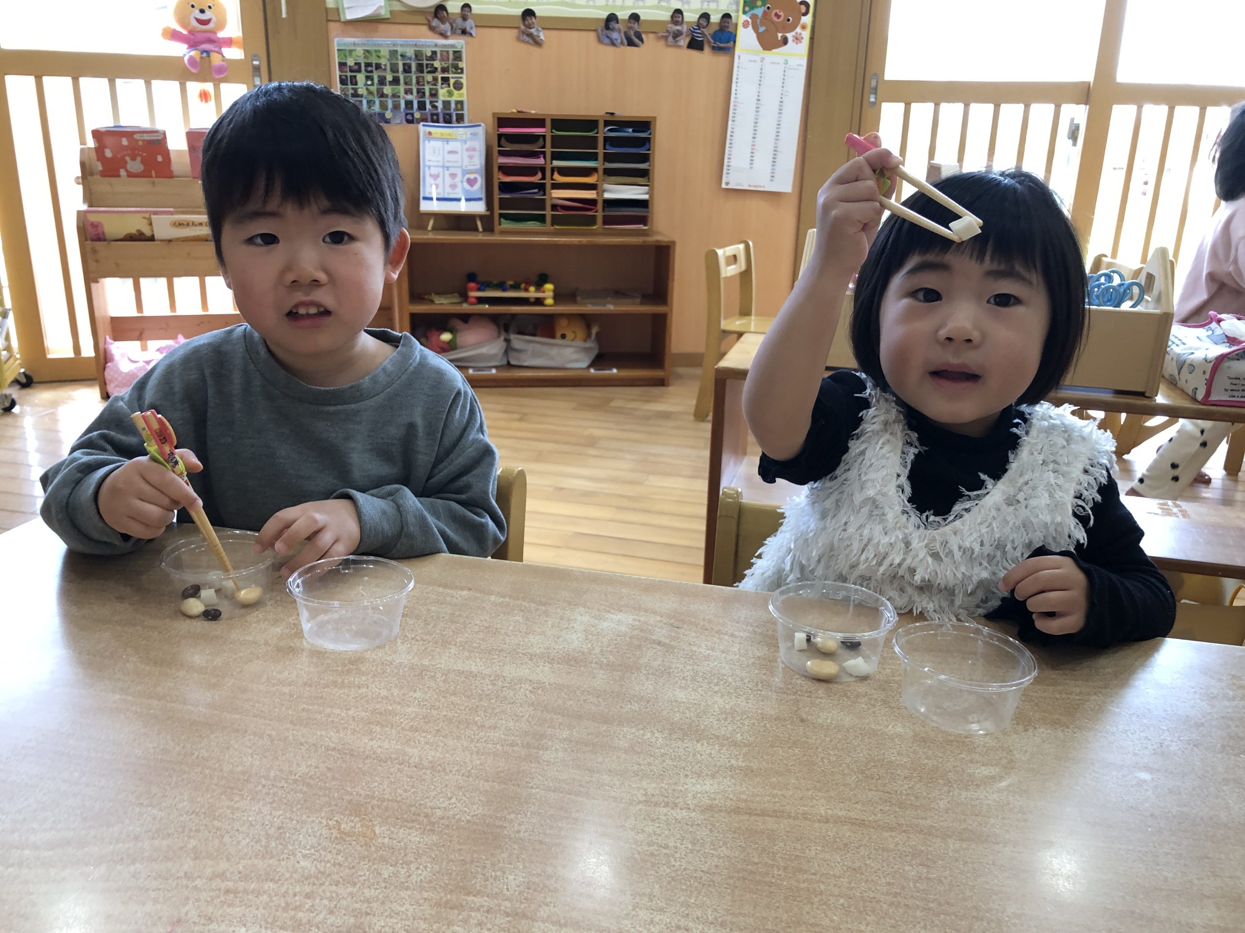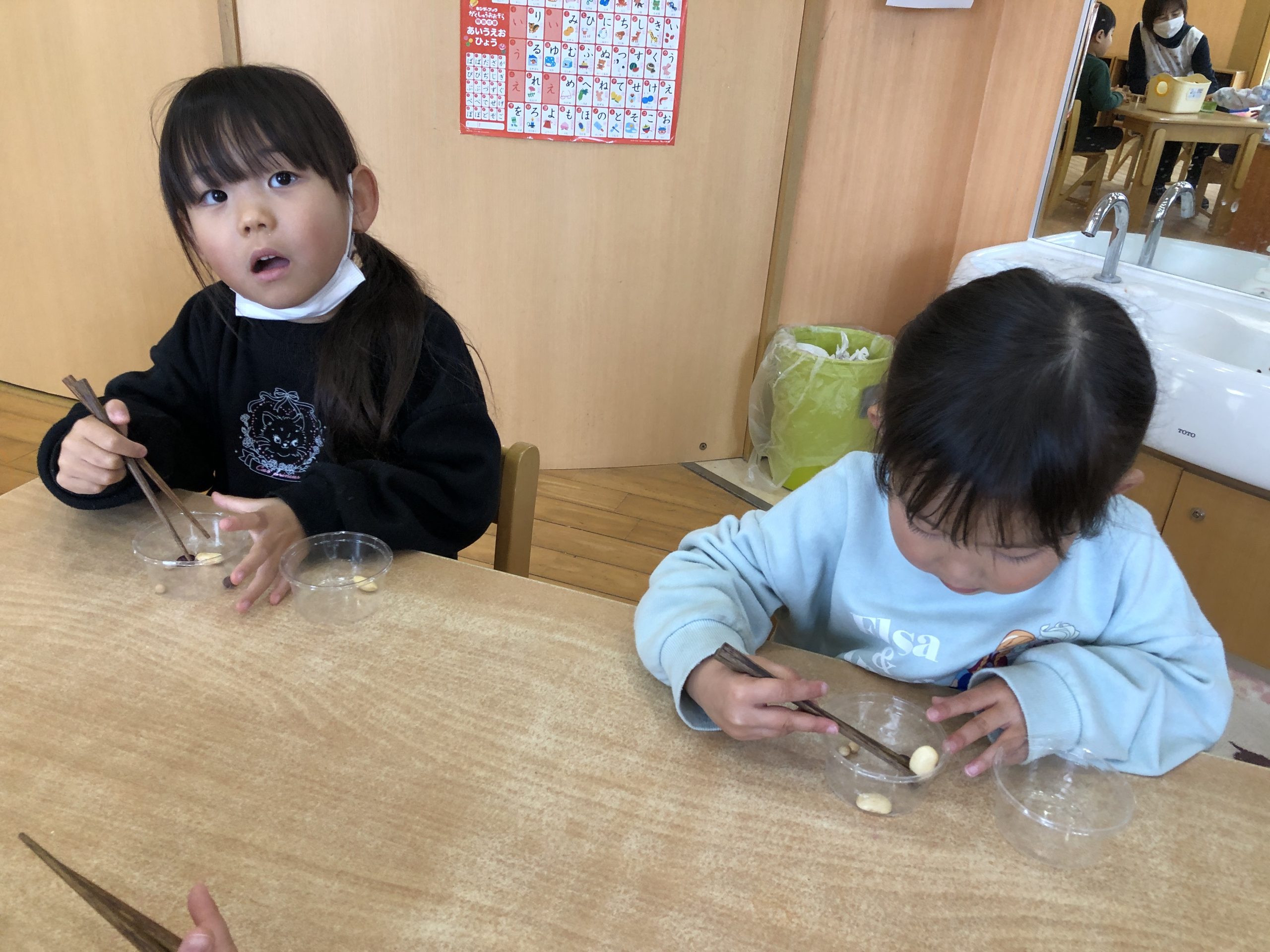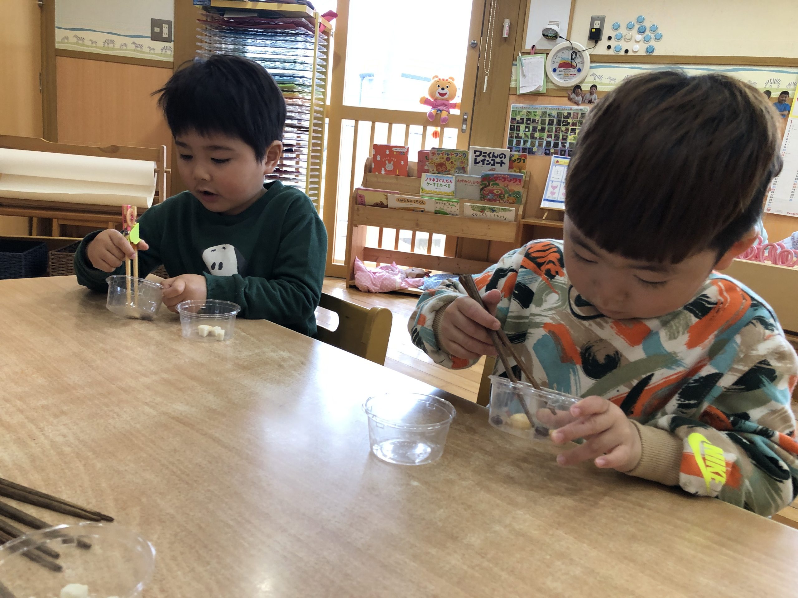 今日は、豆移しをしました🥄橋の持ち方を確認して、箸で豆を掴む事を頑張っていましたよ✨後半は、戸外に出て遊びました☀️砂場で遊んだり、だるまさんが転んだをしたりとみんなで遊ぶ事を楽しんでいましたよ🎶