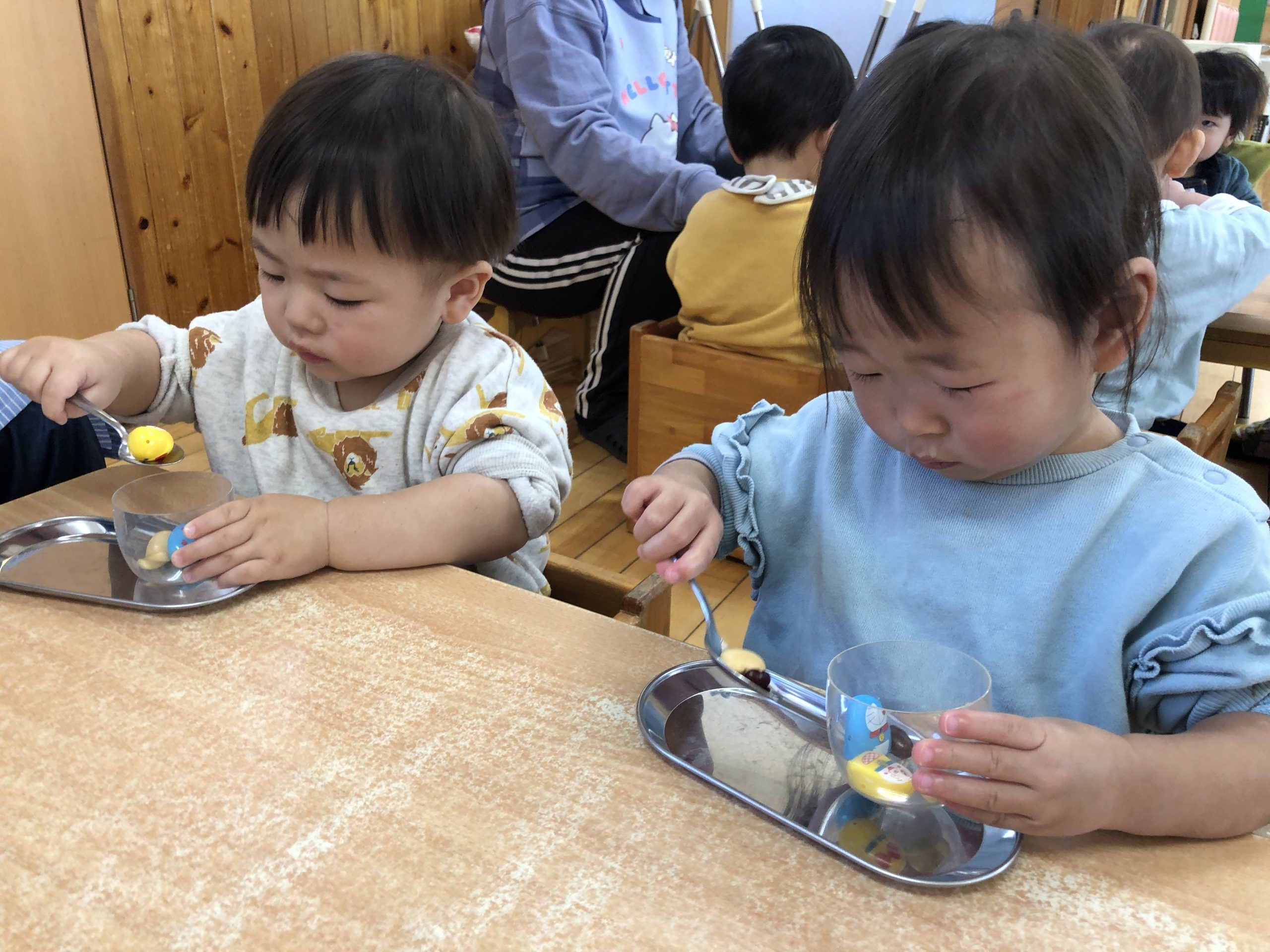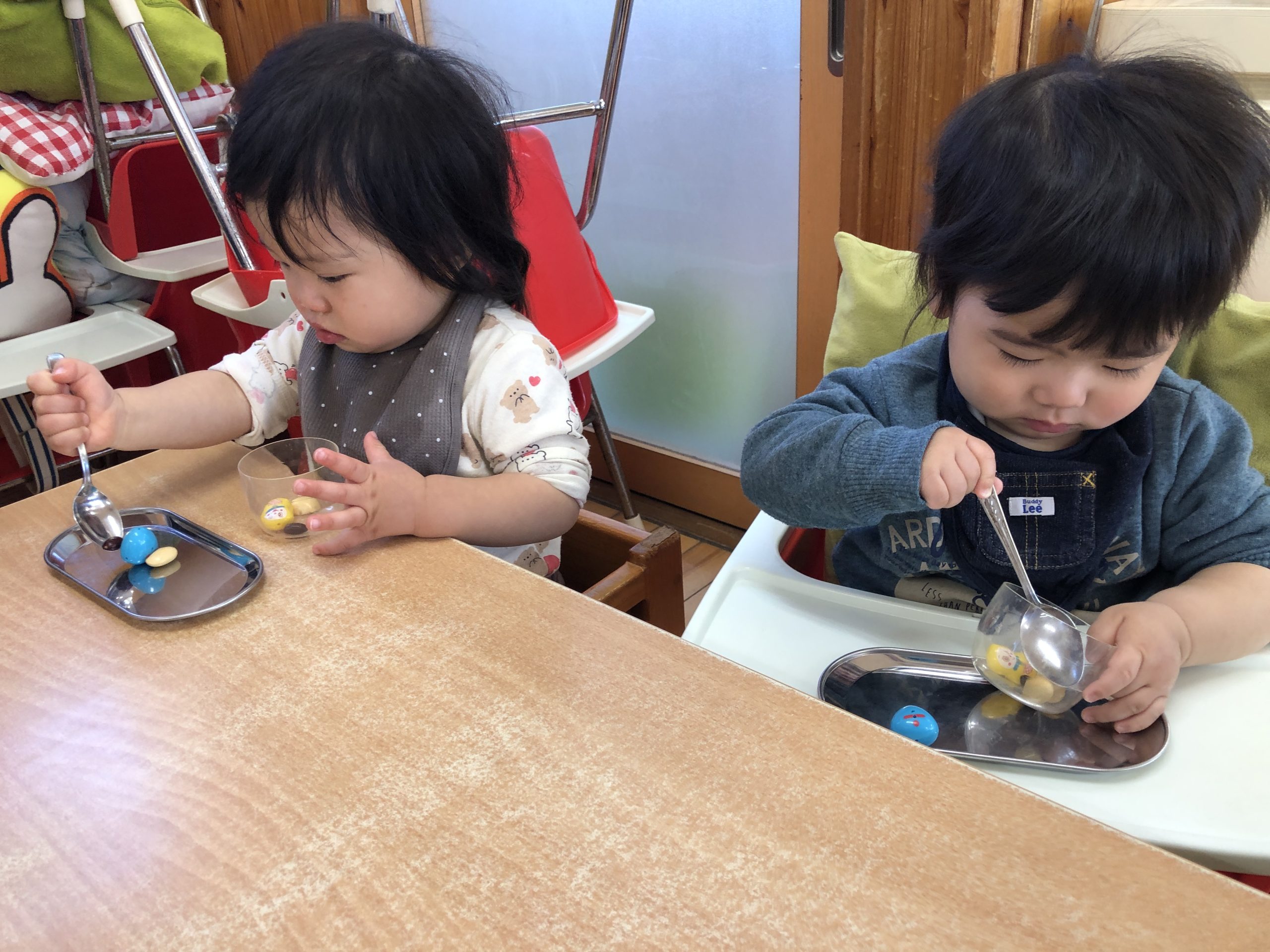 今日は、豆移しあそびをしました。ドラえもん豆・白花豆・黒豆をスプーンを上手く使ってすくい移動させて何度も楽しんでいました♫