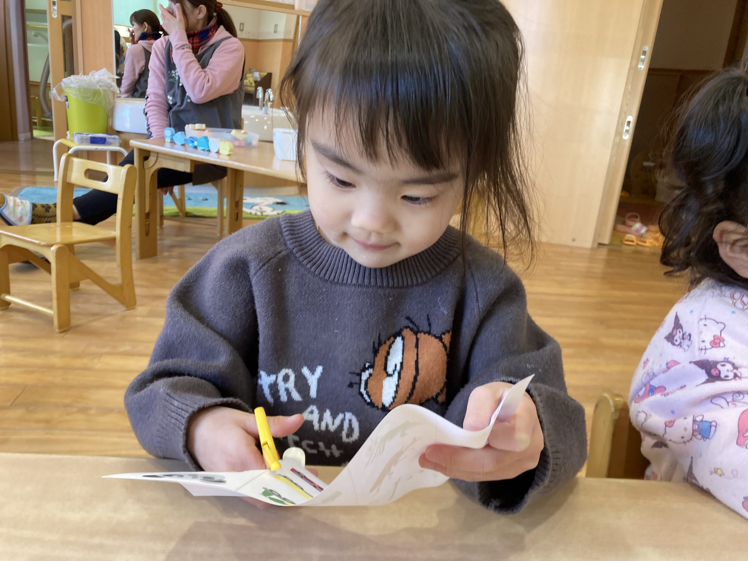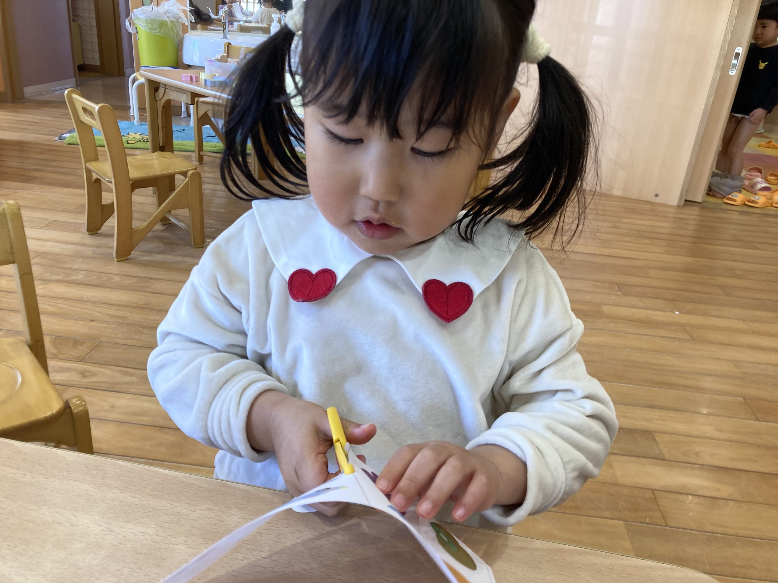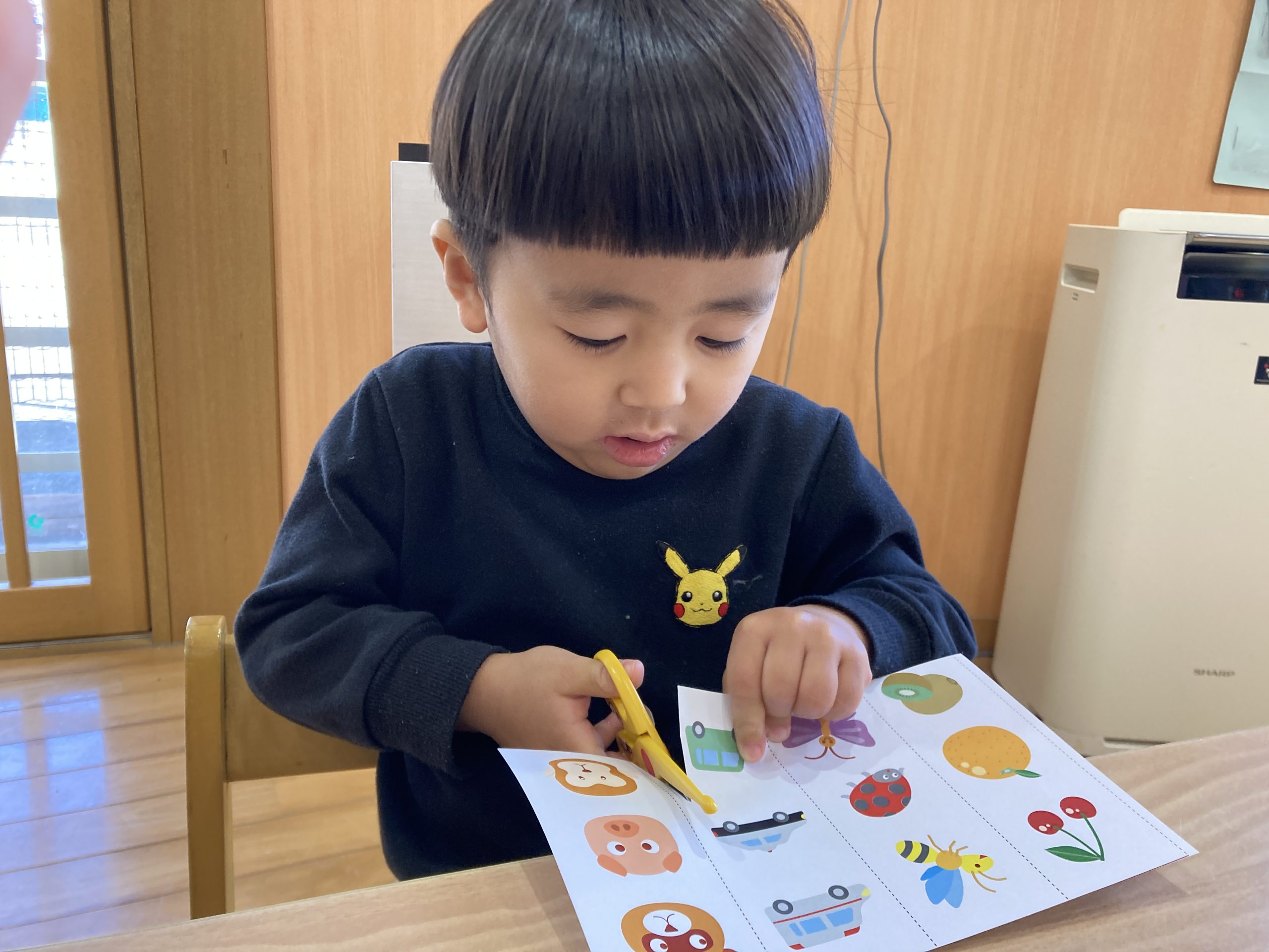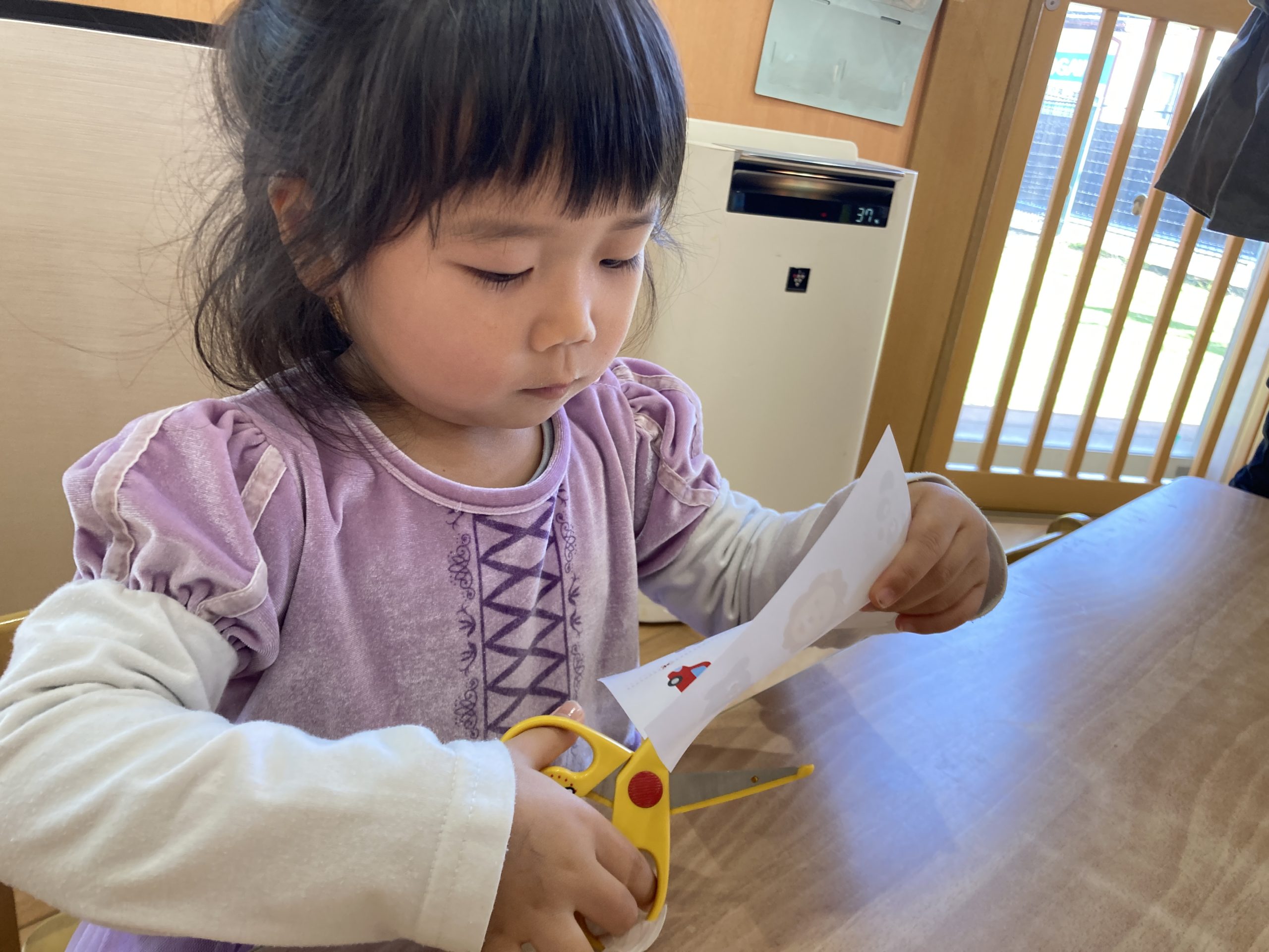 今日は、はさみの練習をしました✂はじめて連続切りに挑戦しましたが、線の上を上手に切ることが出来ていましたよ😊✨