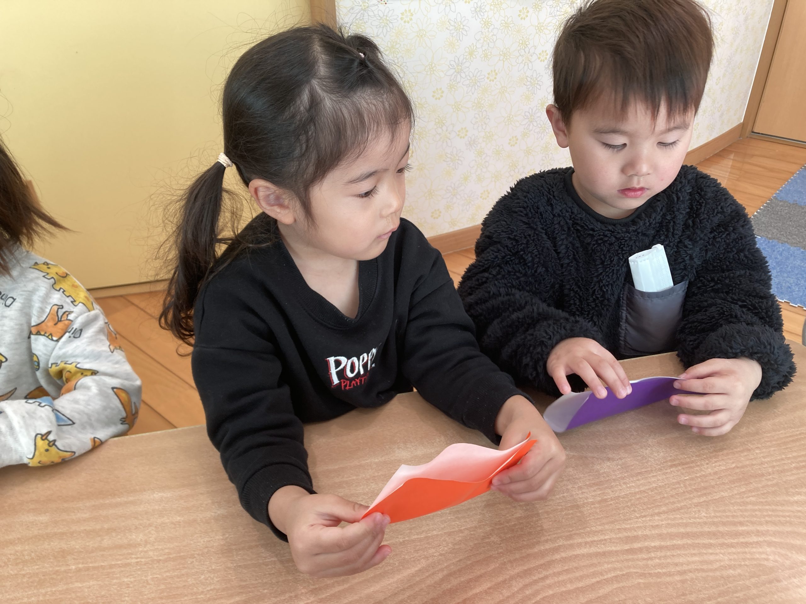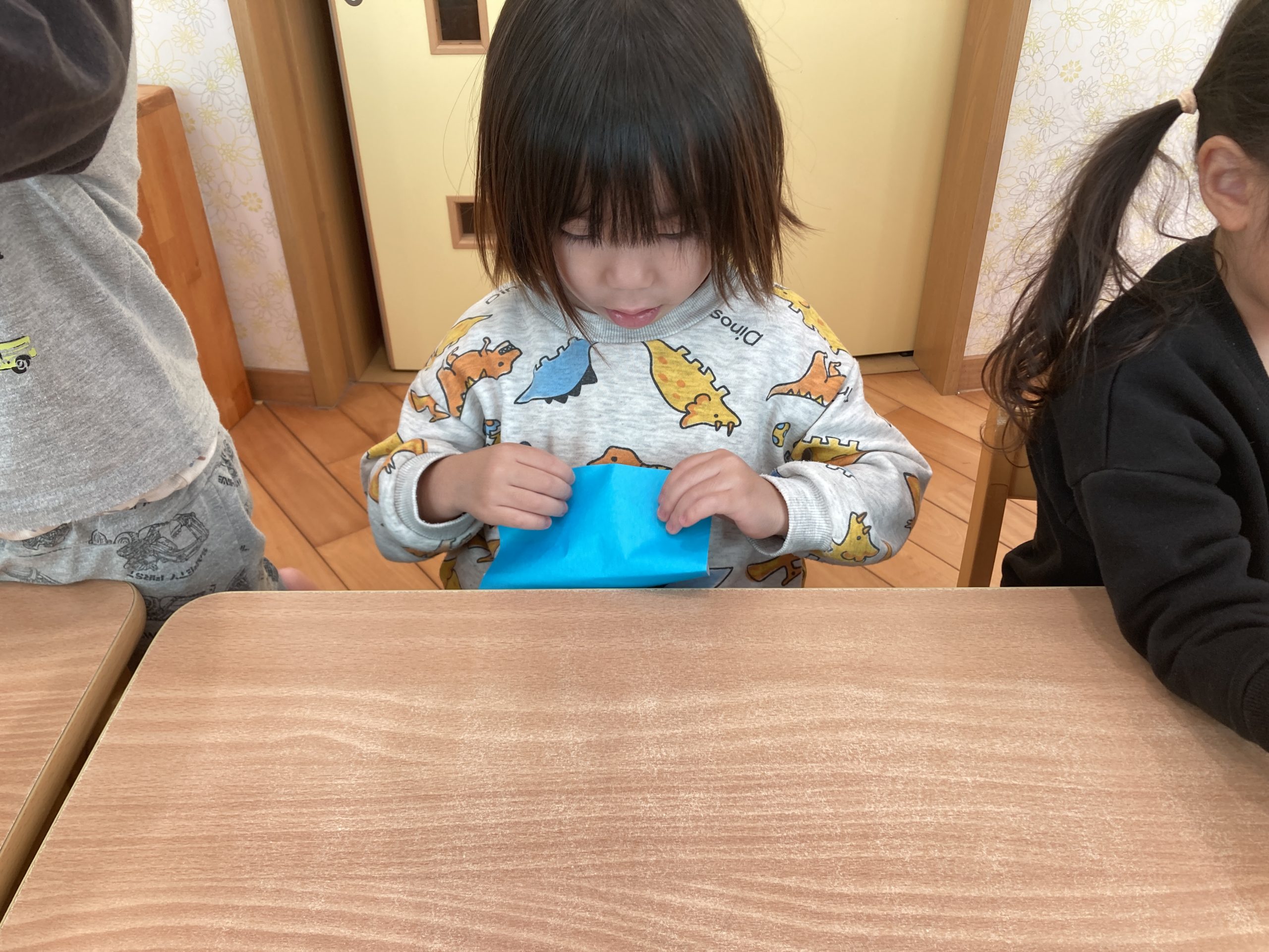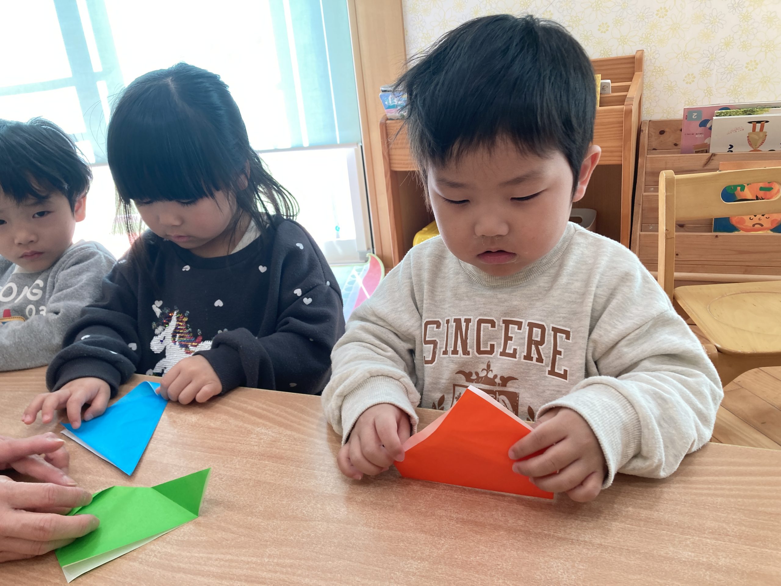 今日は、折り紙遊びました😊保育者の真似をしながら、集中して取り組んでいましたよ(*^^*)