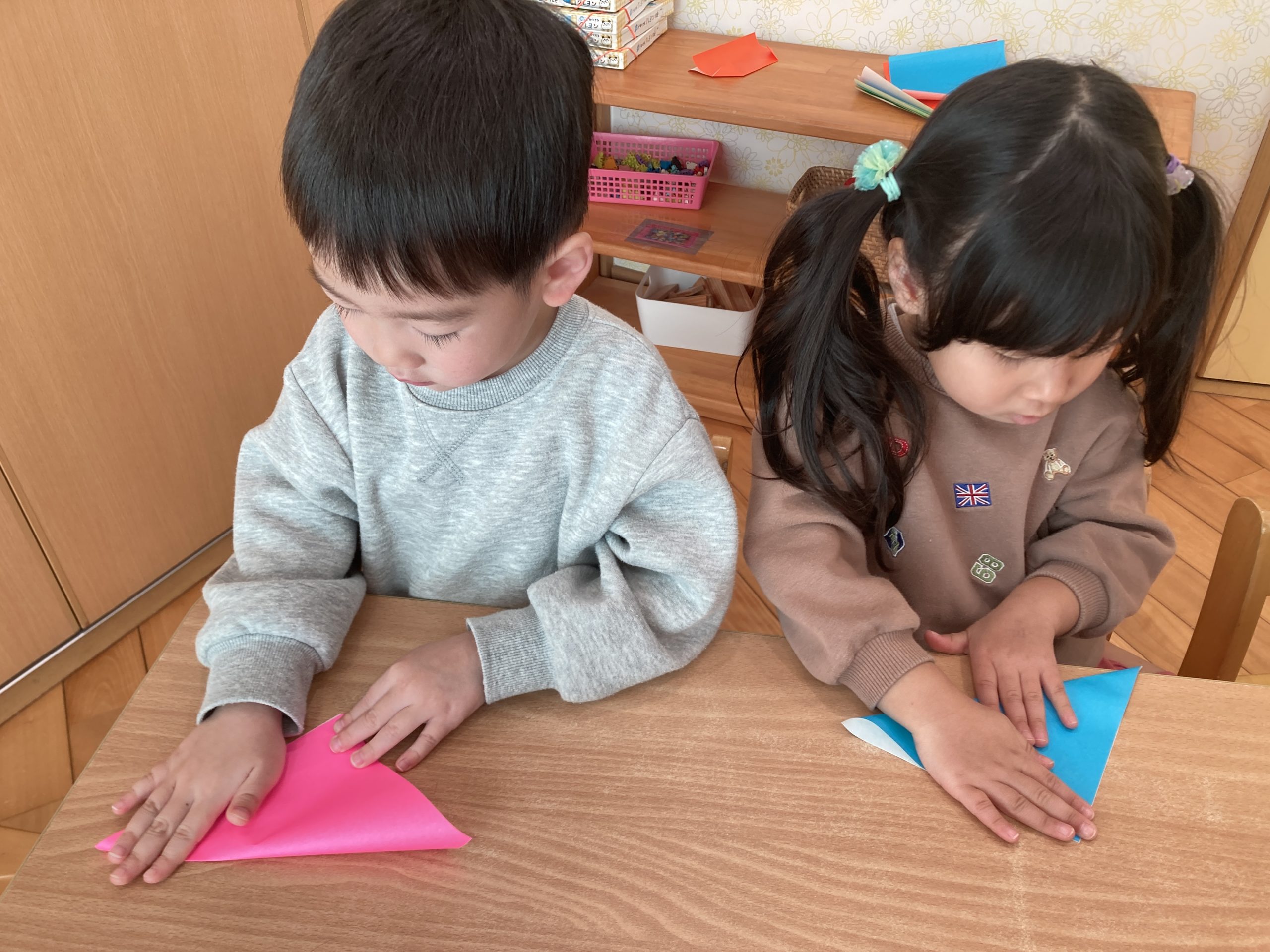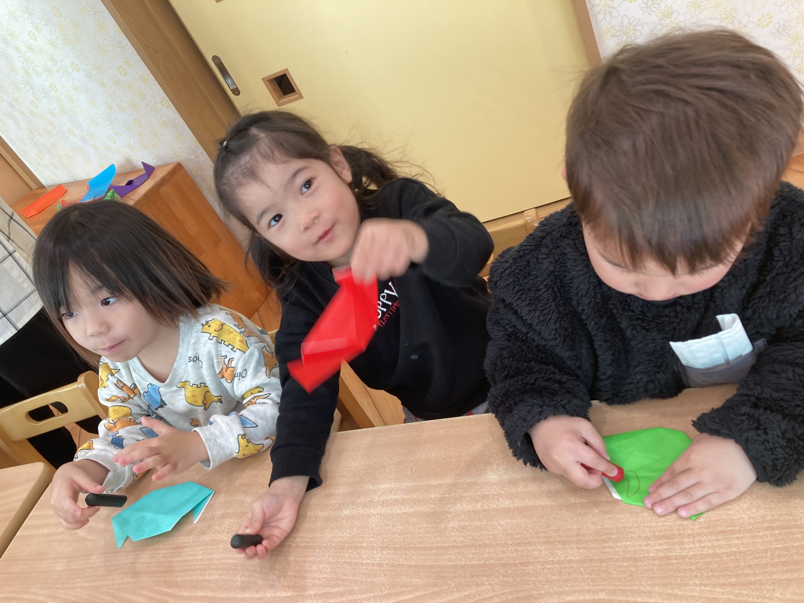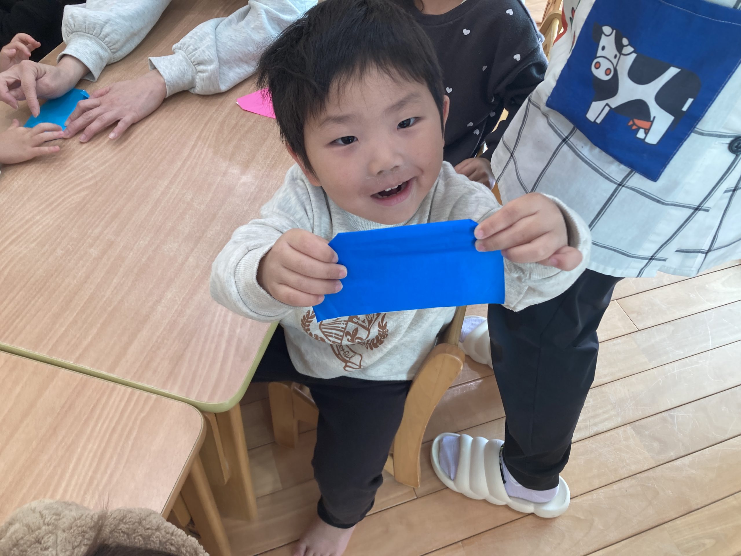 今日は、折り紙遊びました😊保育者の真似をしながら、集中して取り組んでいましたよ(*^^*)