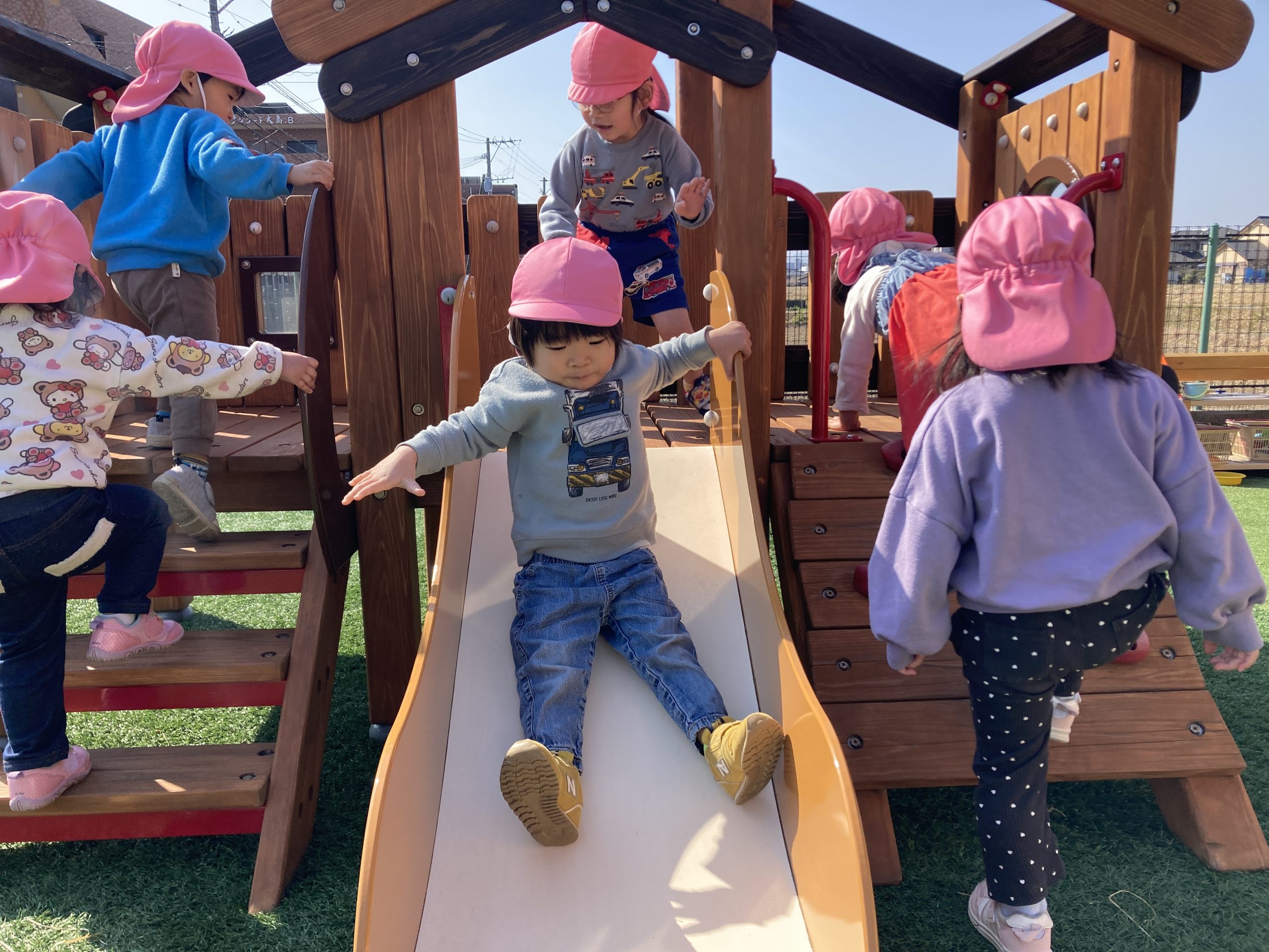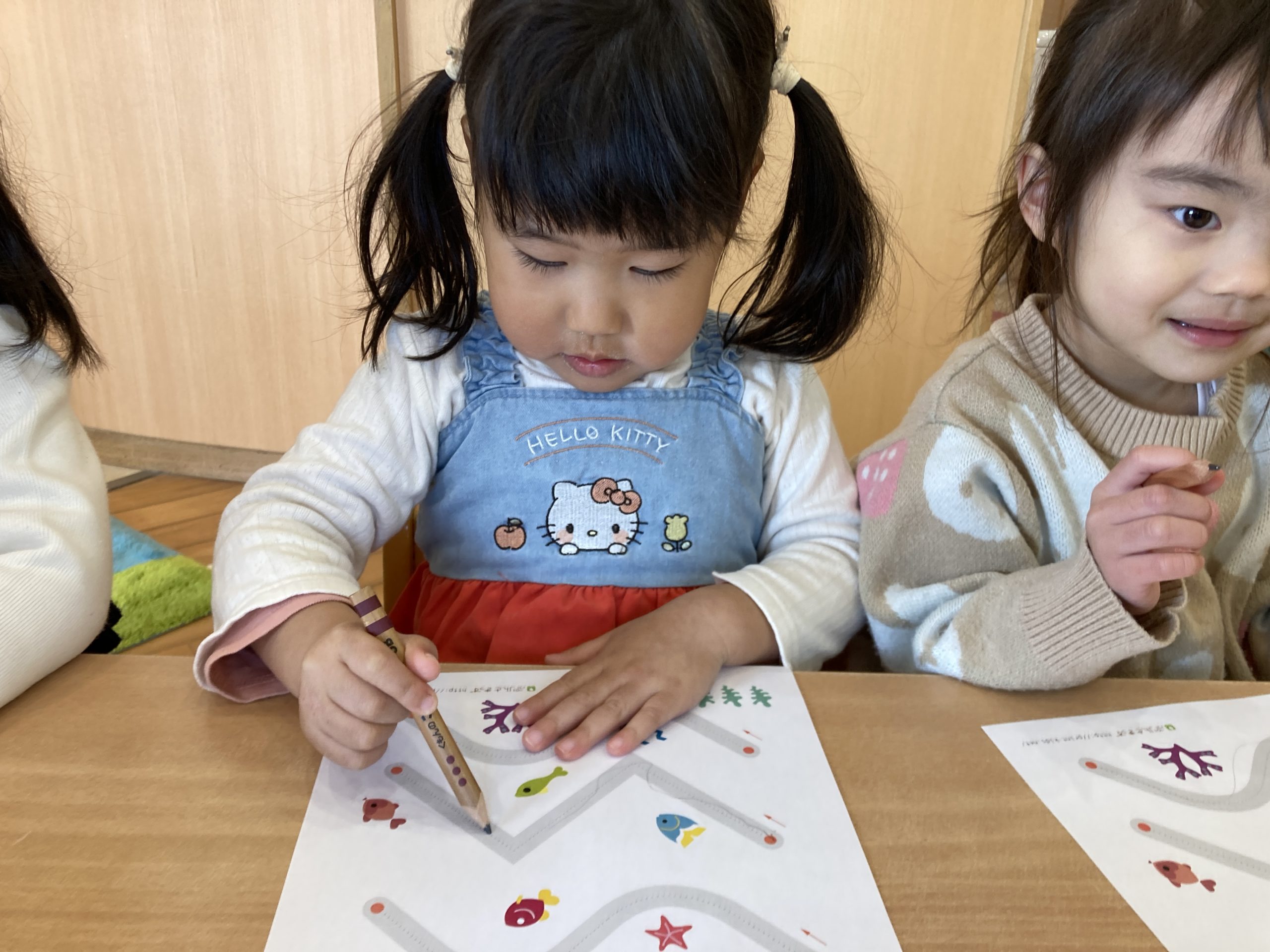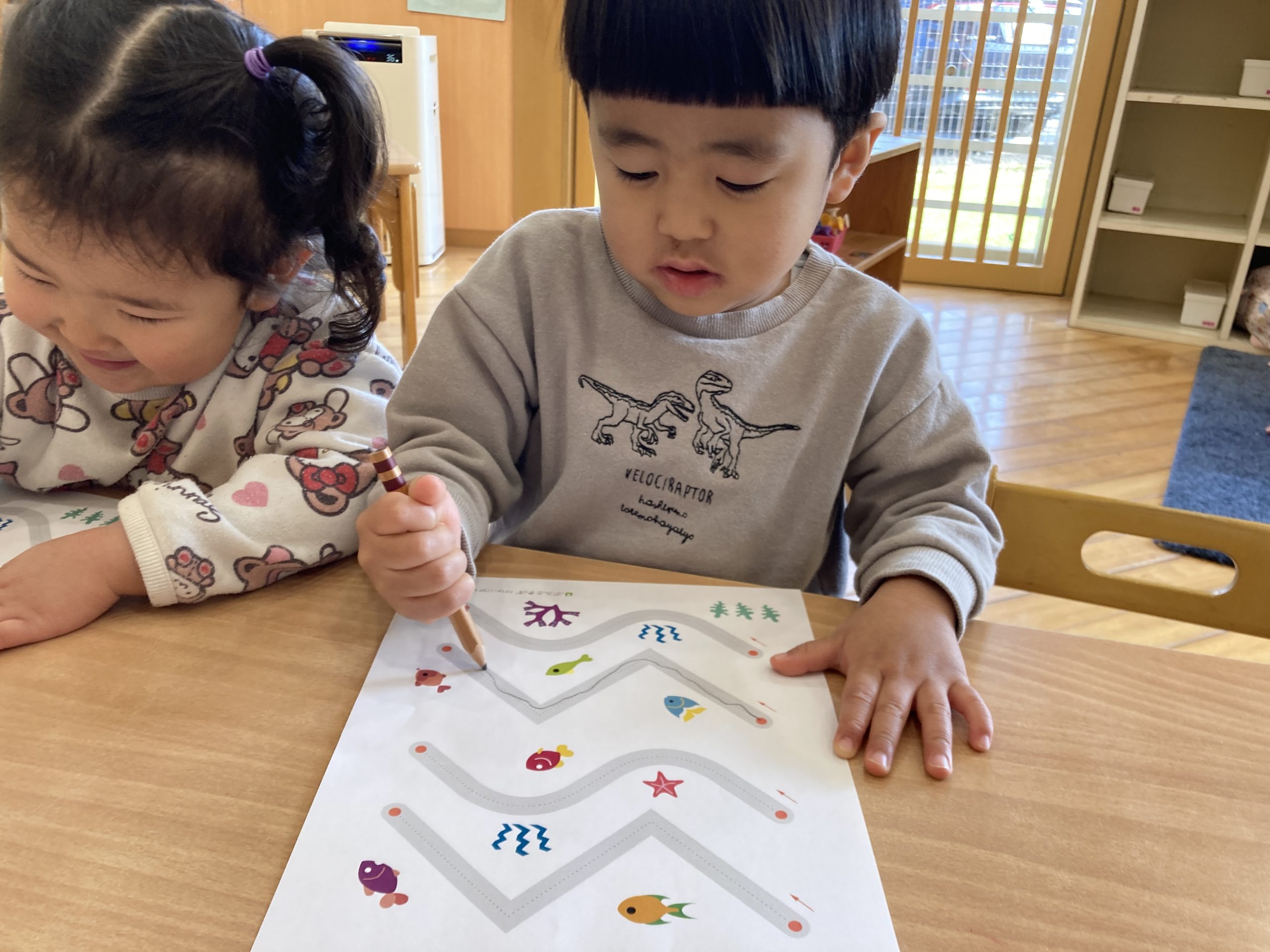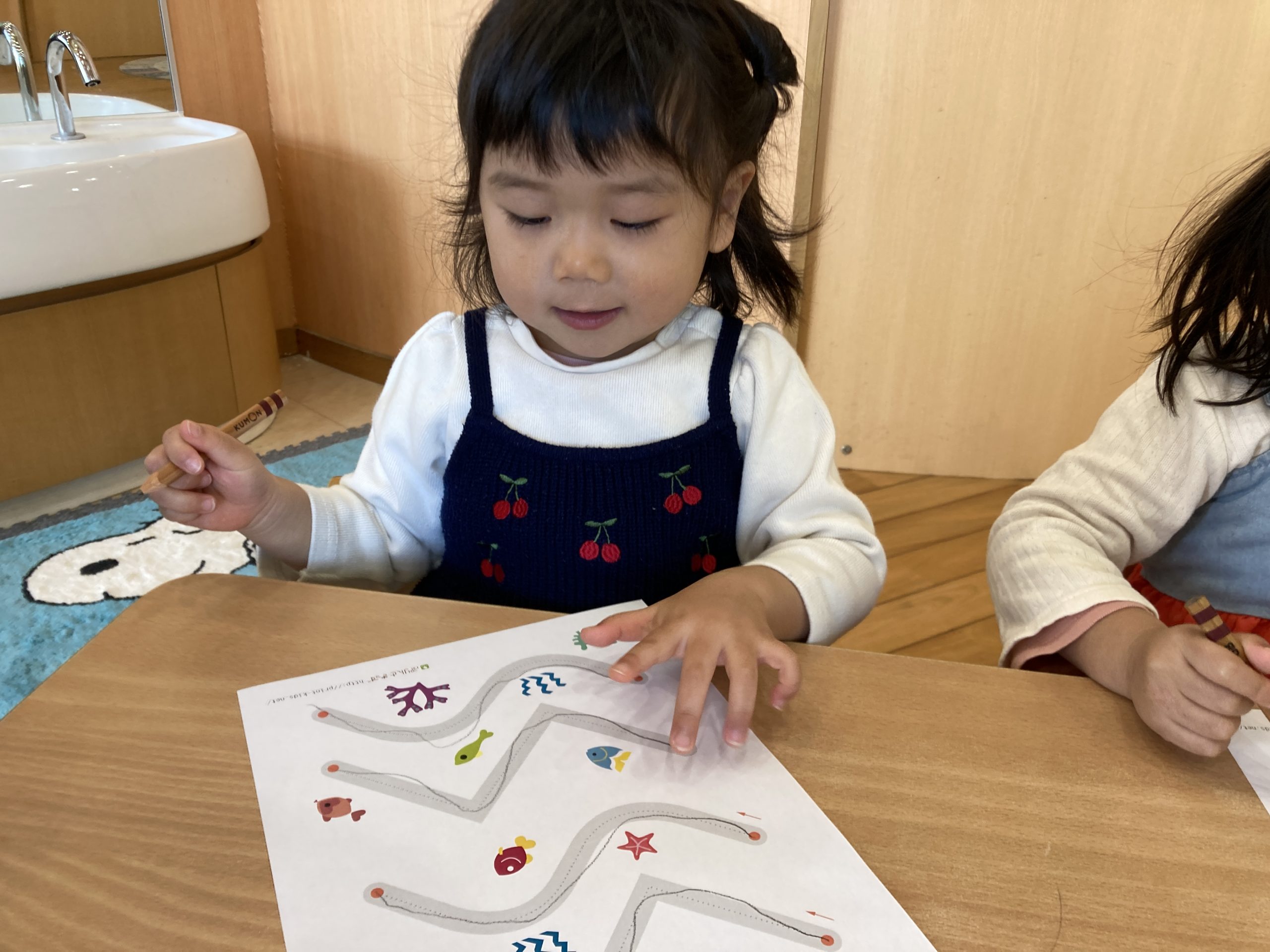 今日は、線なぞりをしました!✍赤い〇の印から赤〇の印まで上手に線をなぞることが出来ていましたよ😊✨その後は、戸外遊びをしました!遊具や砂場で沢山身体を動かして遊びました🌤