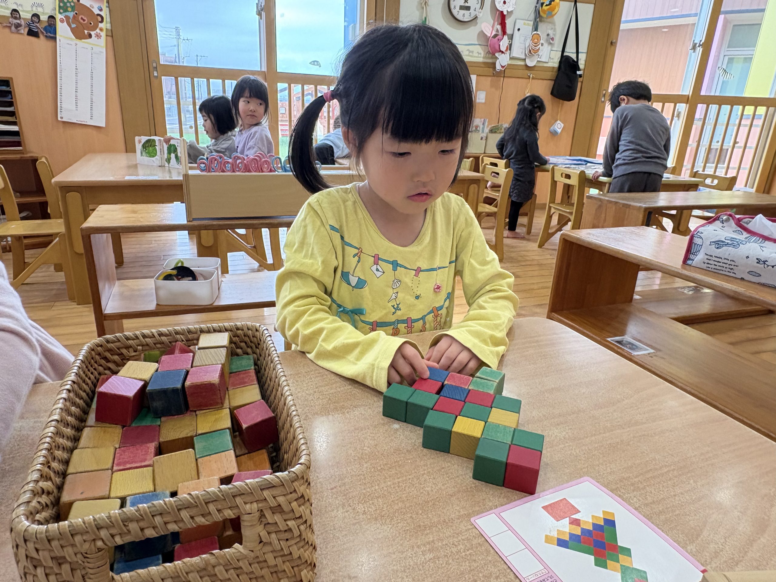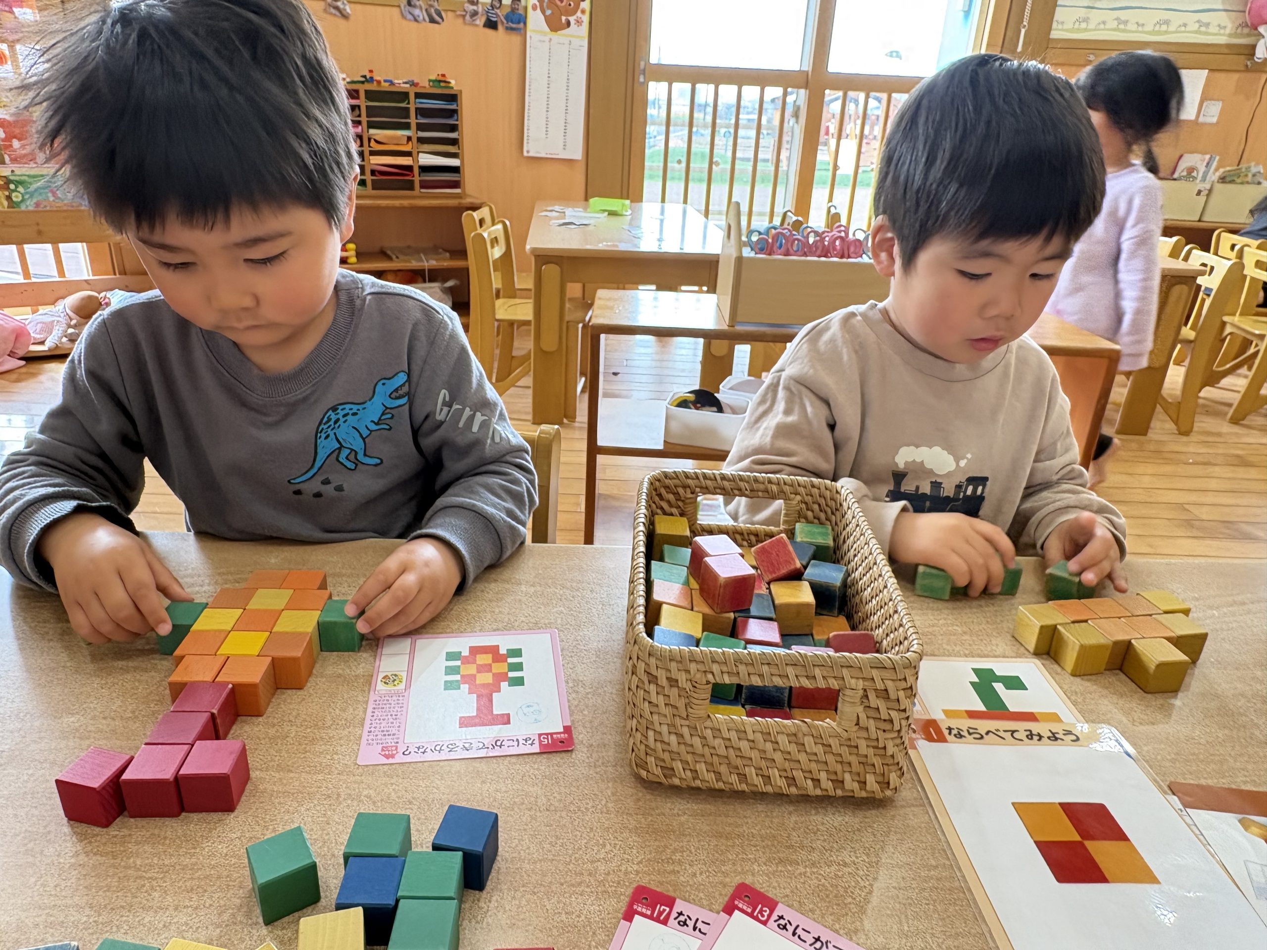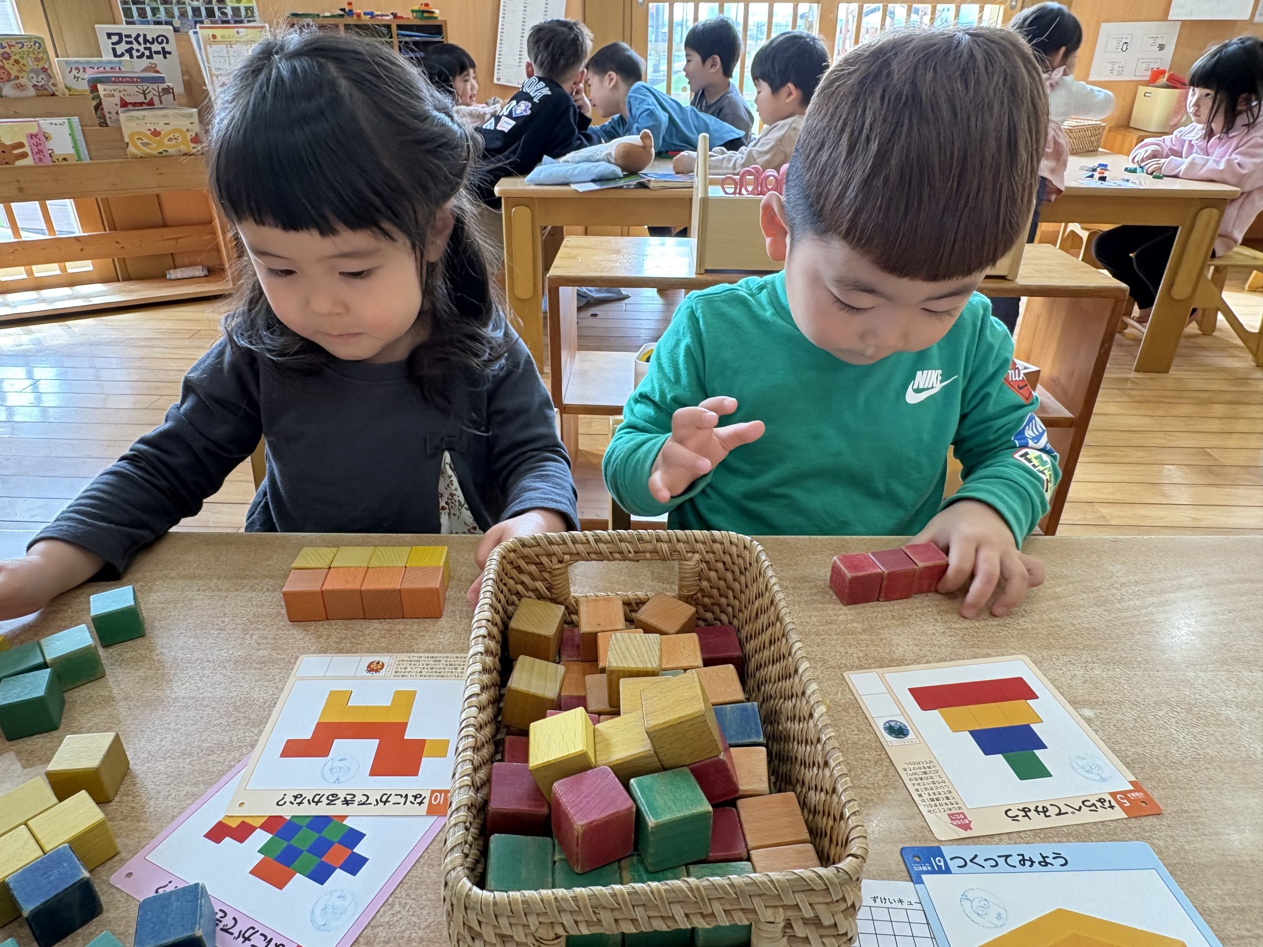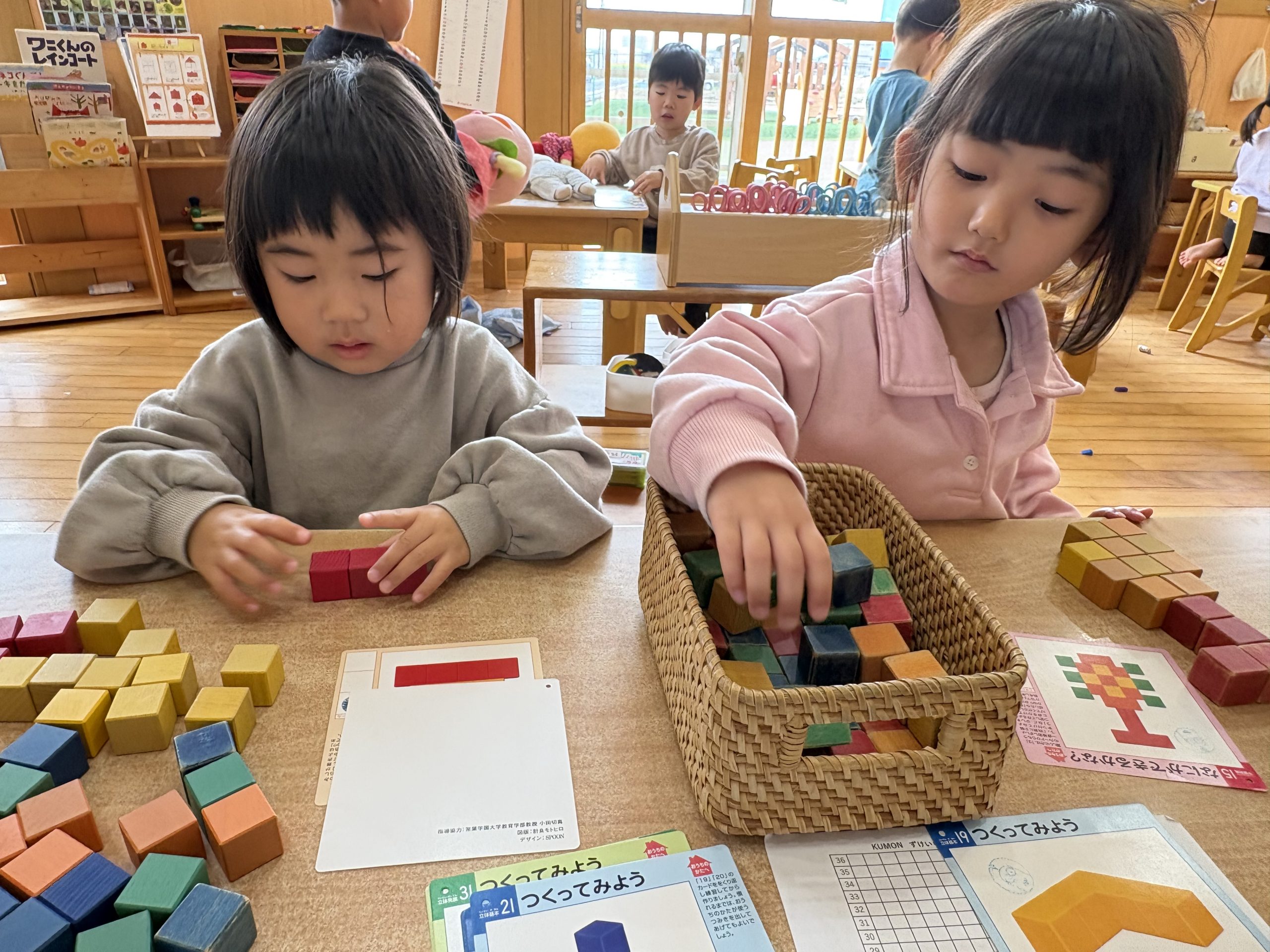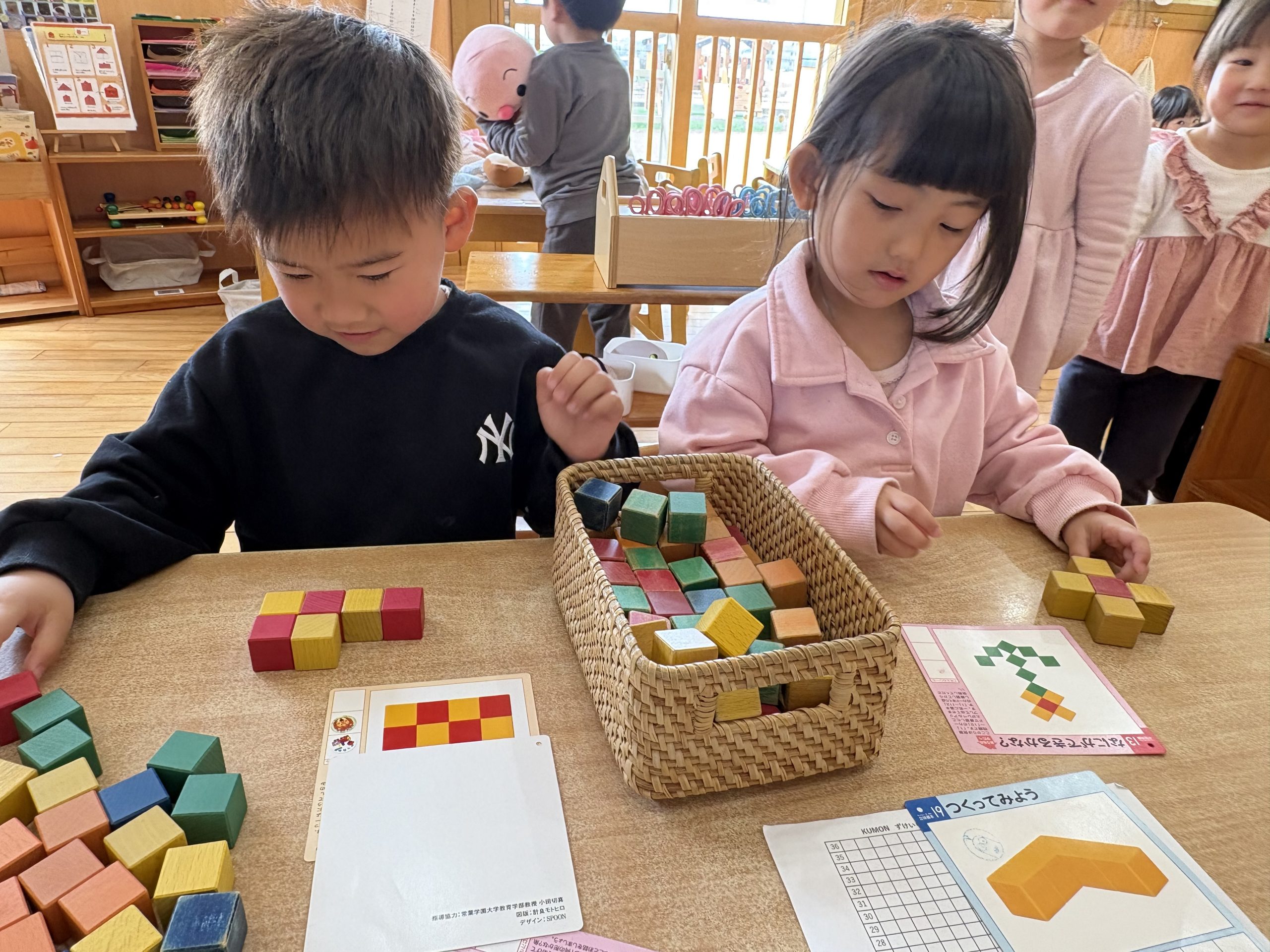 今日は公文キューブをしました!!見本を見ながらキューブを並べることができると「できたー!」と喜び嬉しそうなこども達でした🤩みんな最後まで集中して取り組んでいましたよ〜⭐️