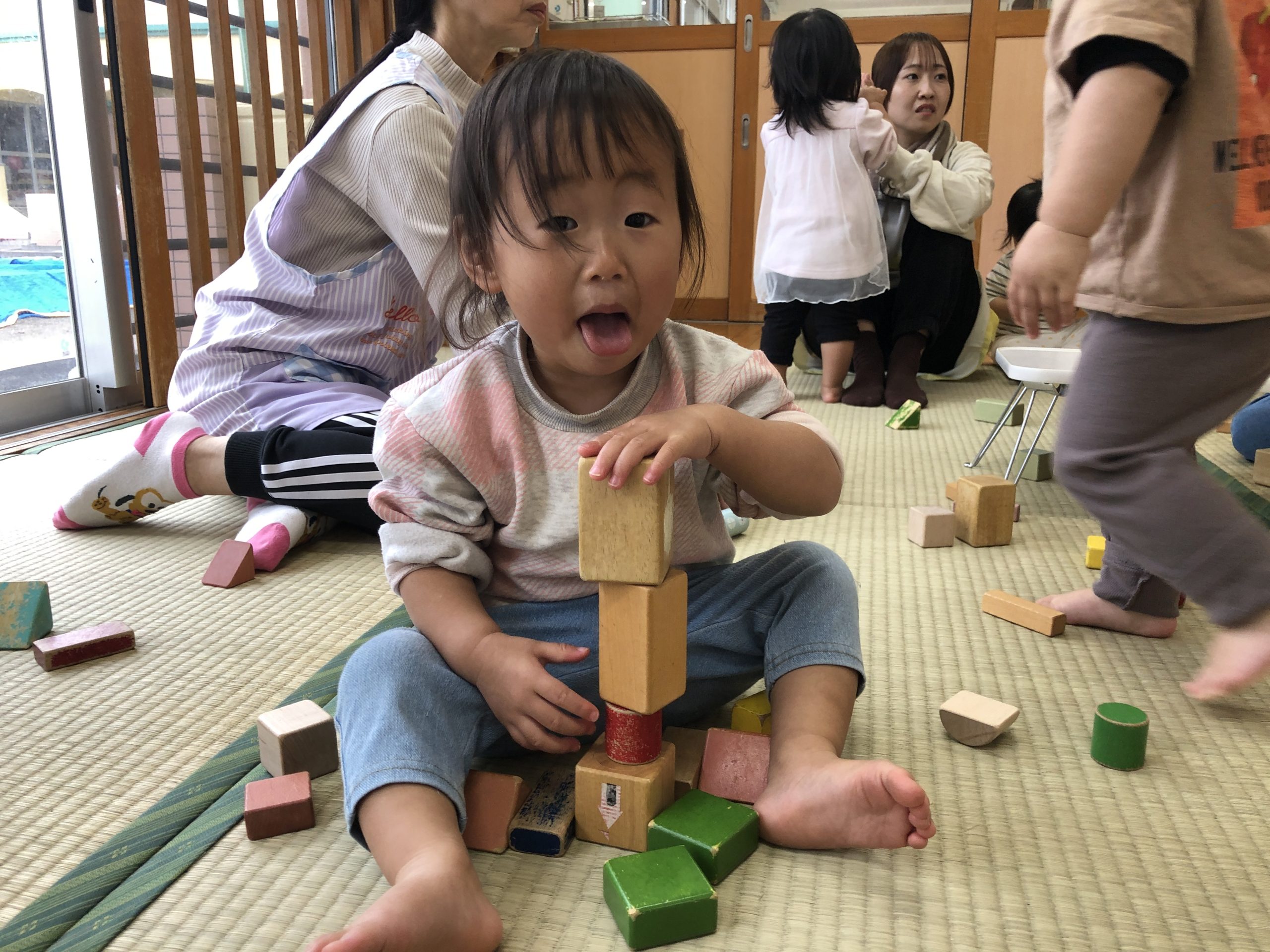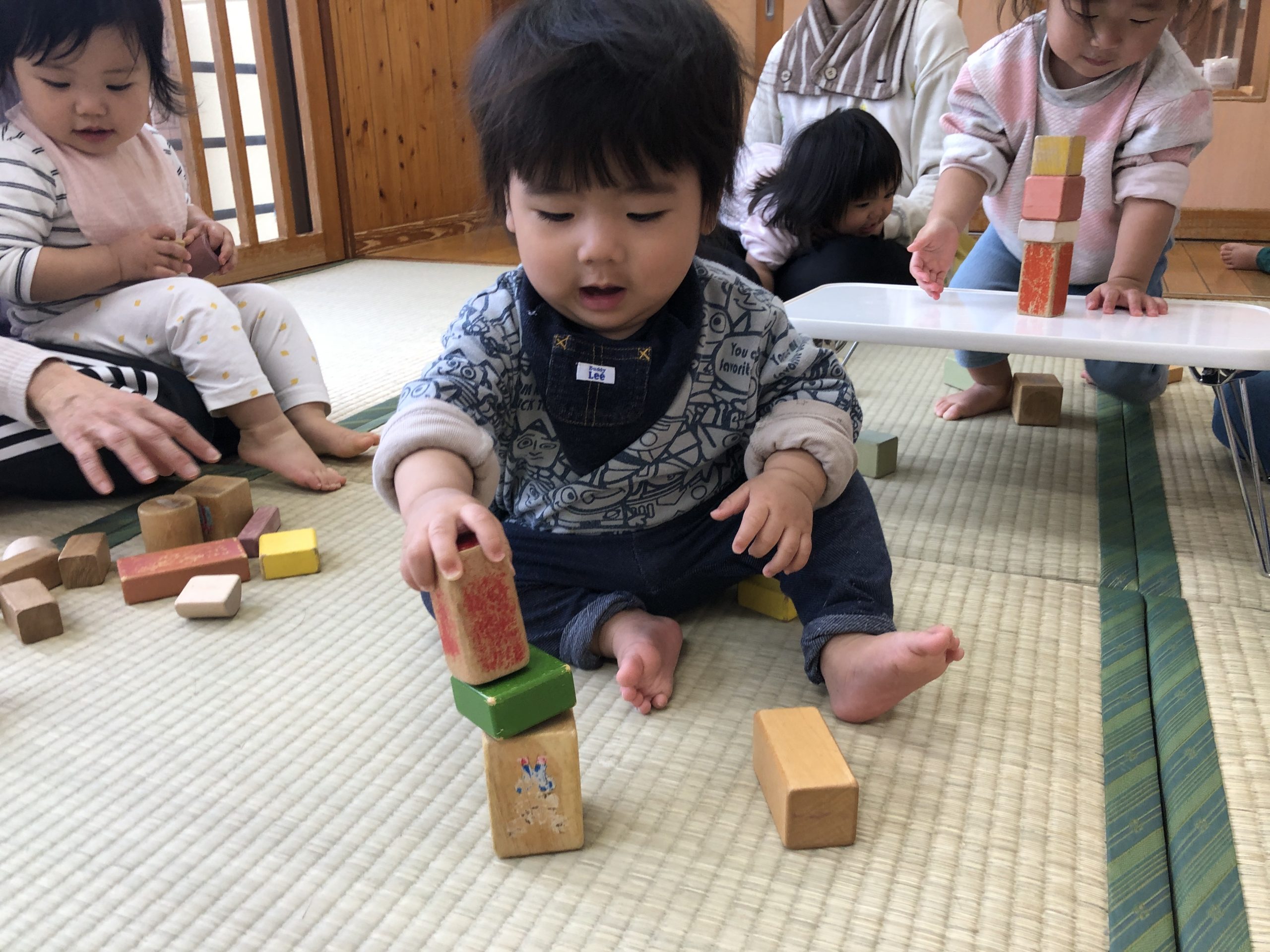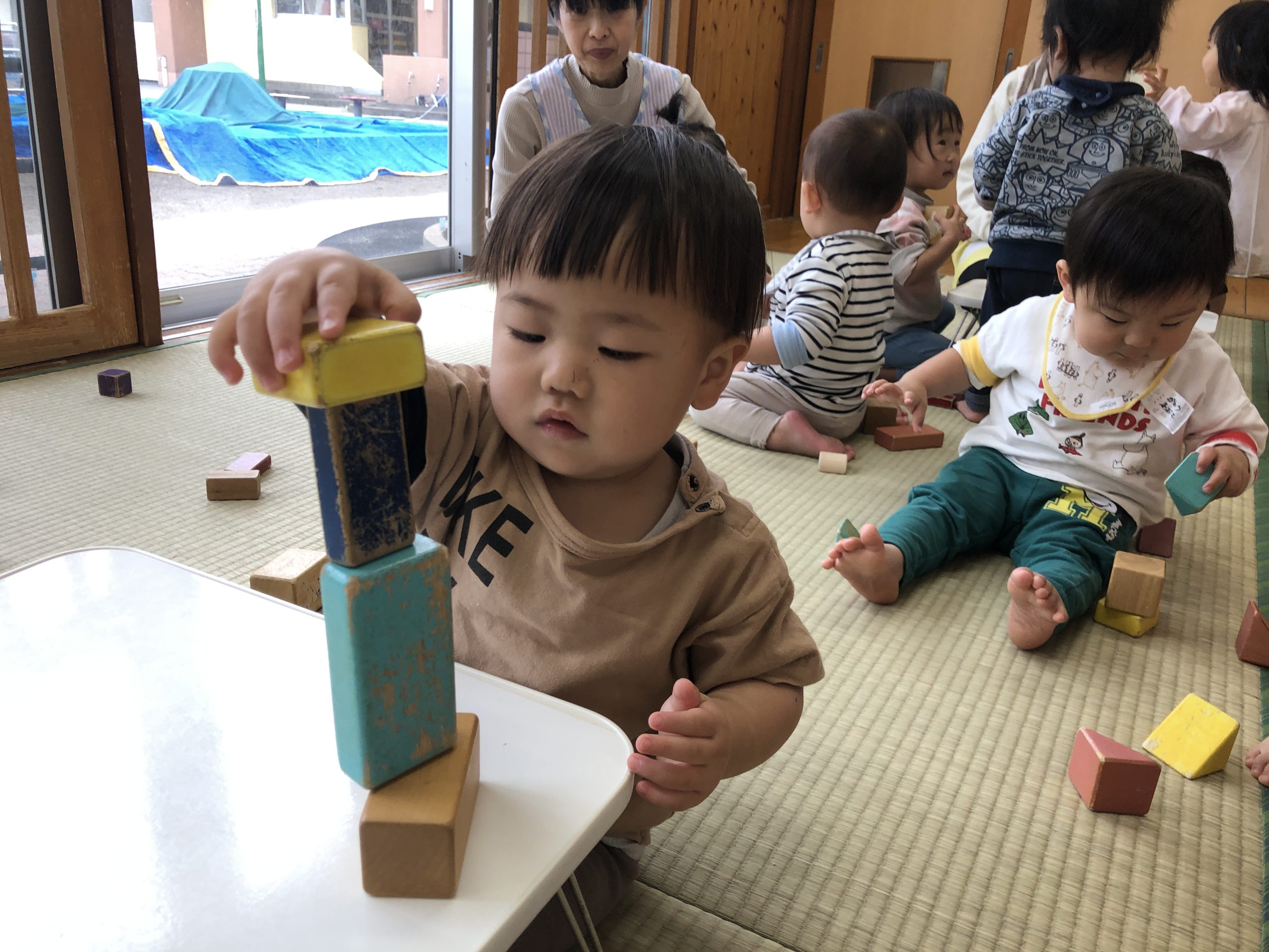 今日は、積み木あそびをしました。畳の上やテーブルの上で積み木を何個も積み重ねたり、倒して崩れていくのを楽しんでいました😄