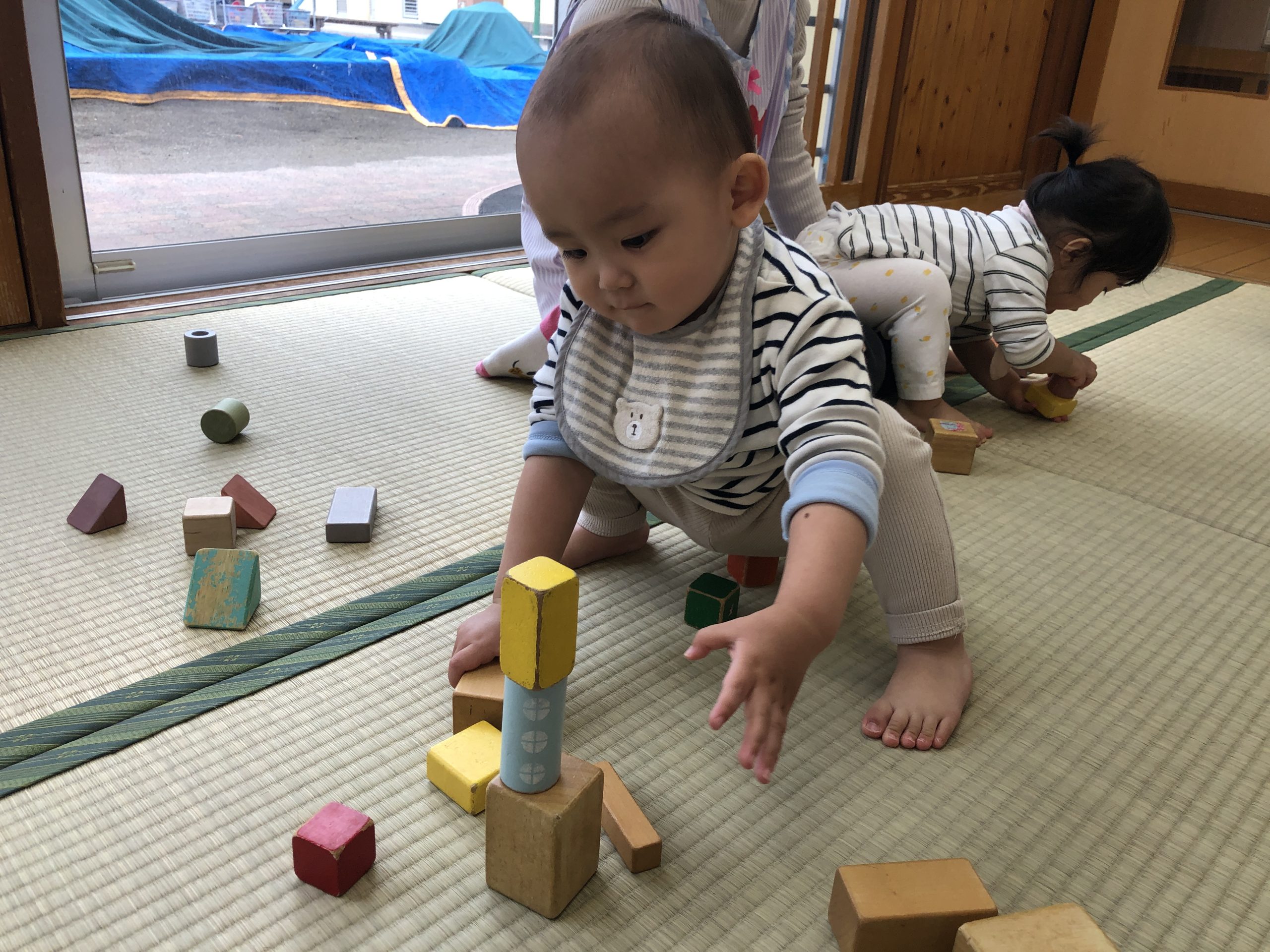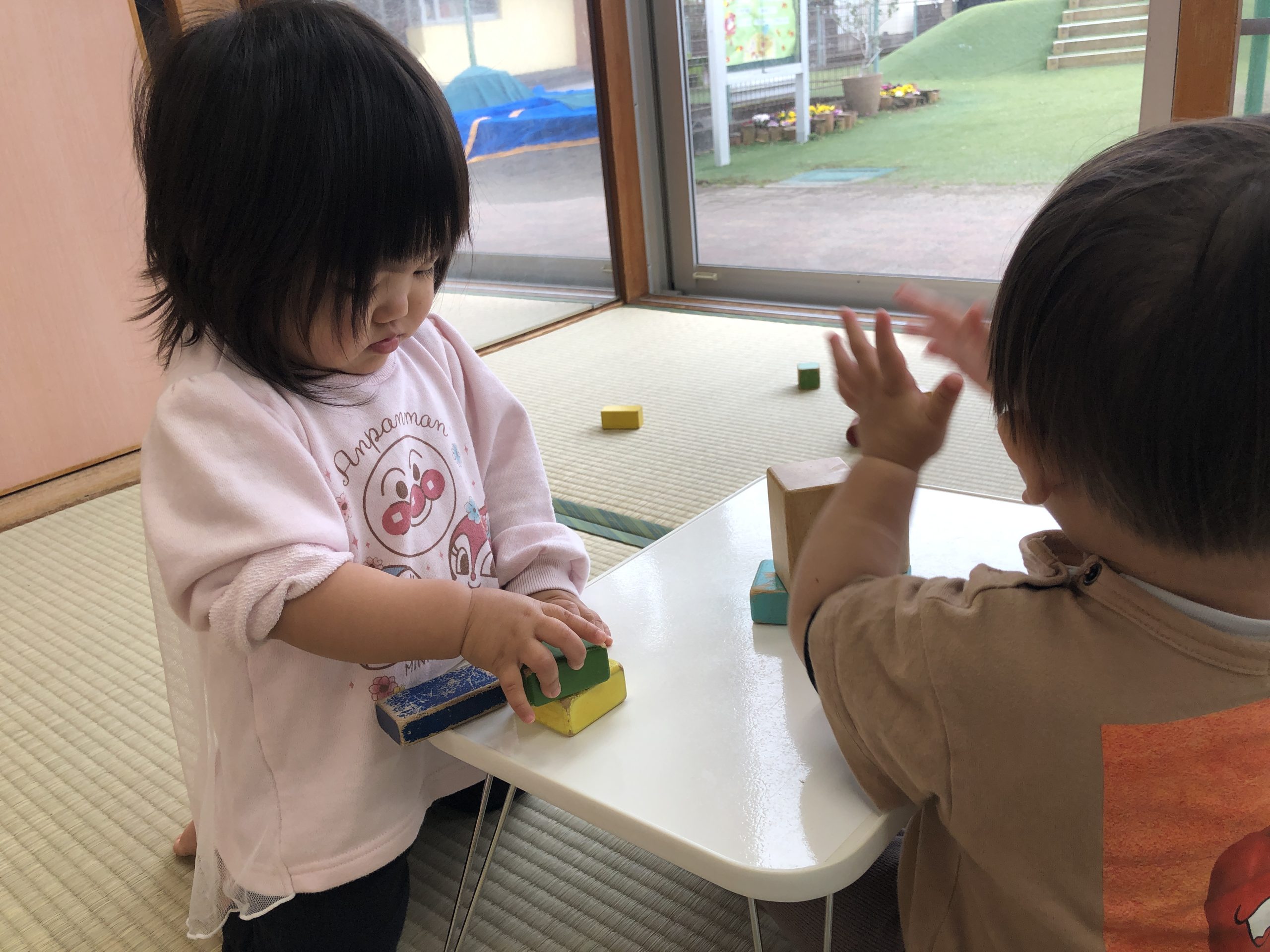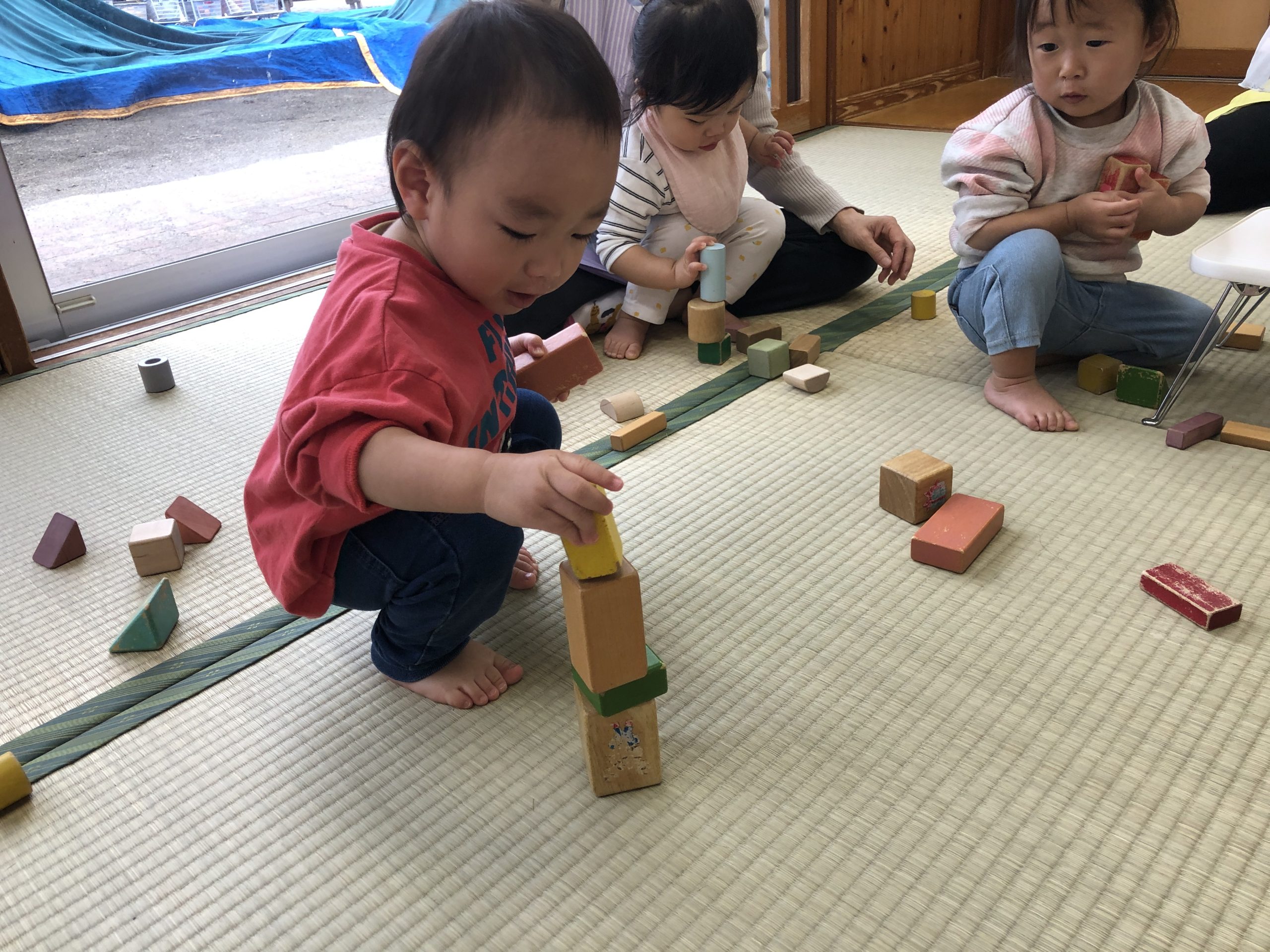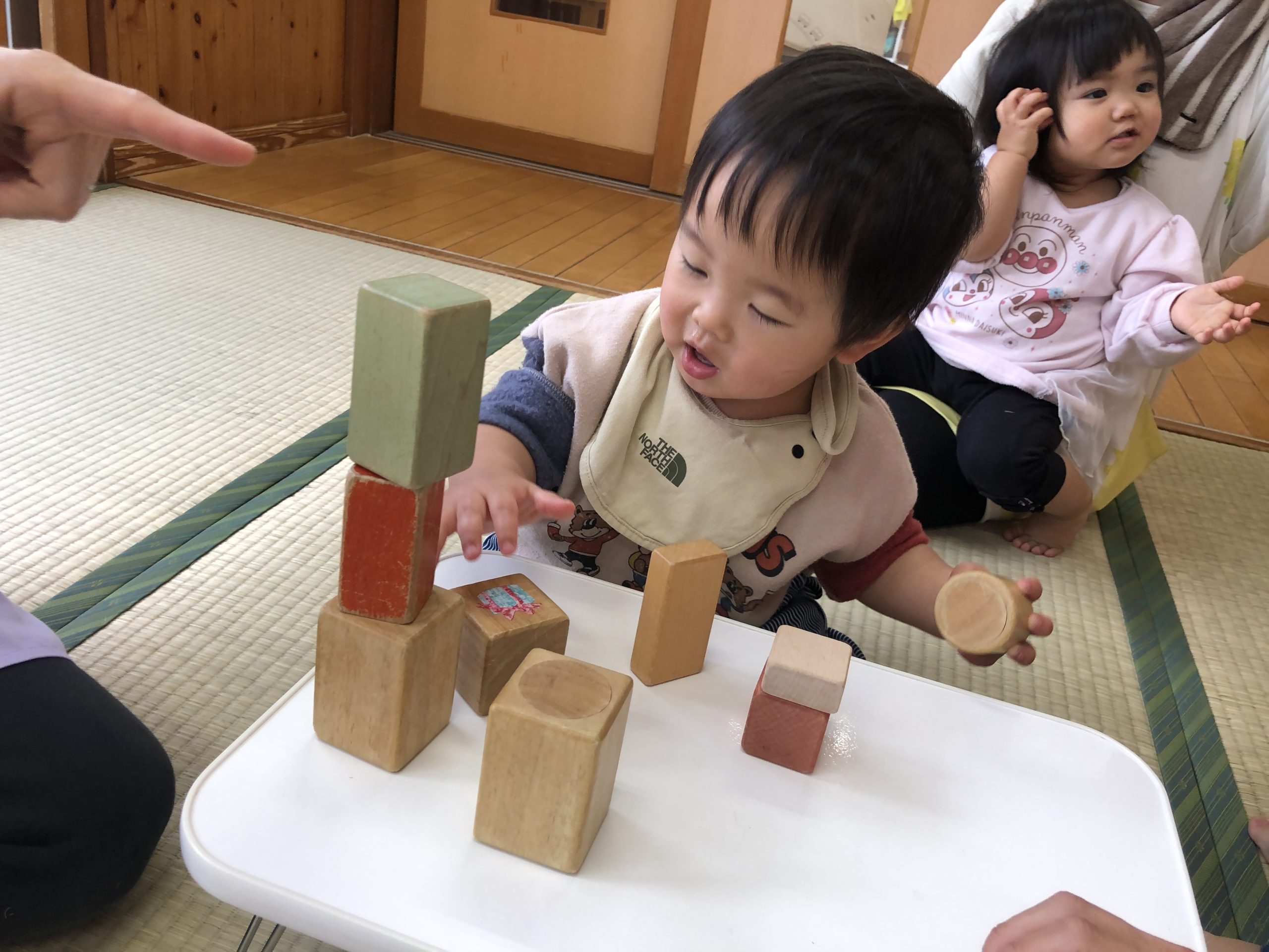今日は、積み木あそびをしました。畳の上やテーブルの上で積み木を何個も積み重ねたり、倒して崩れていくのを楽しんでいました😄