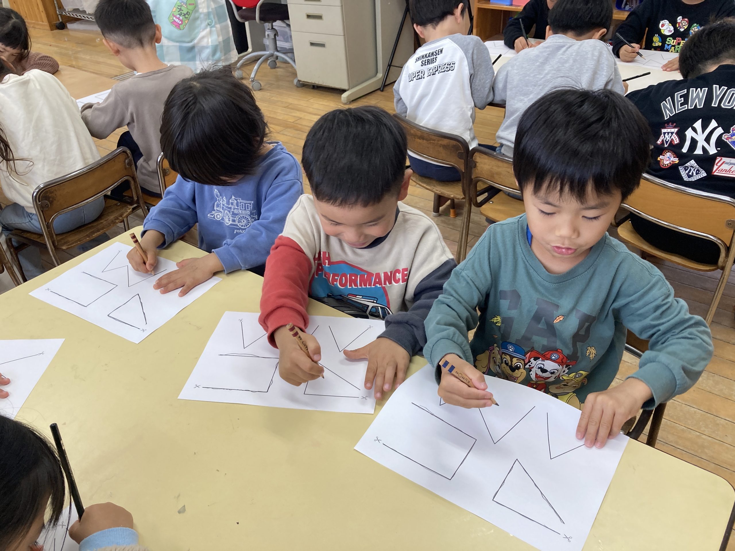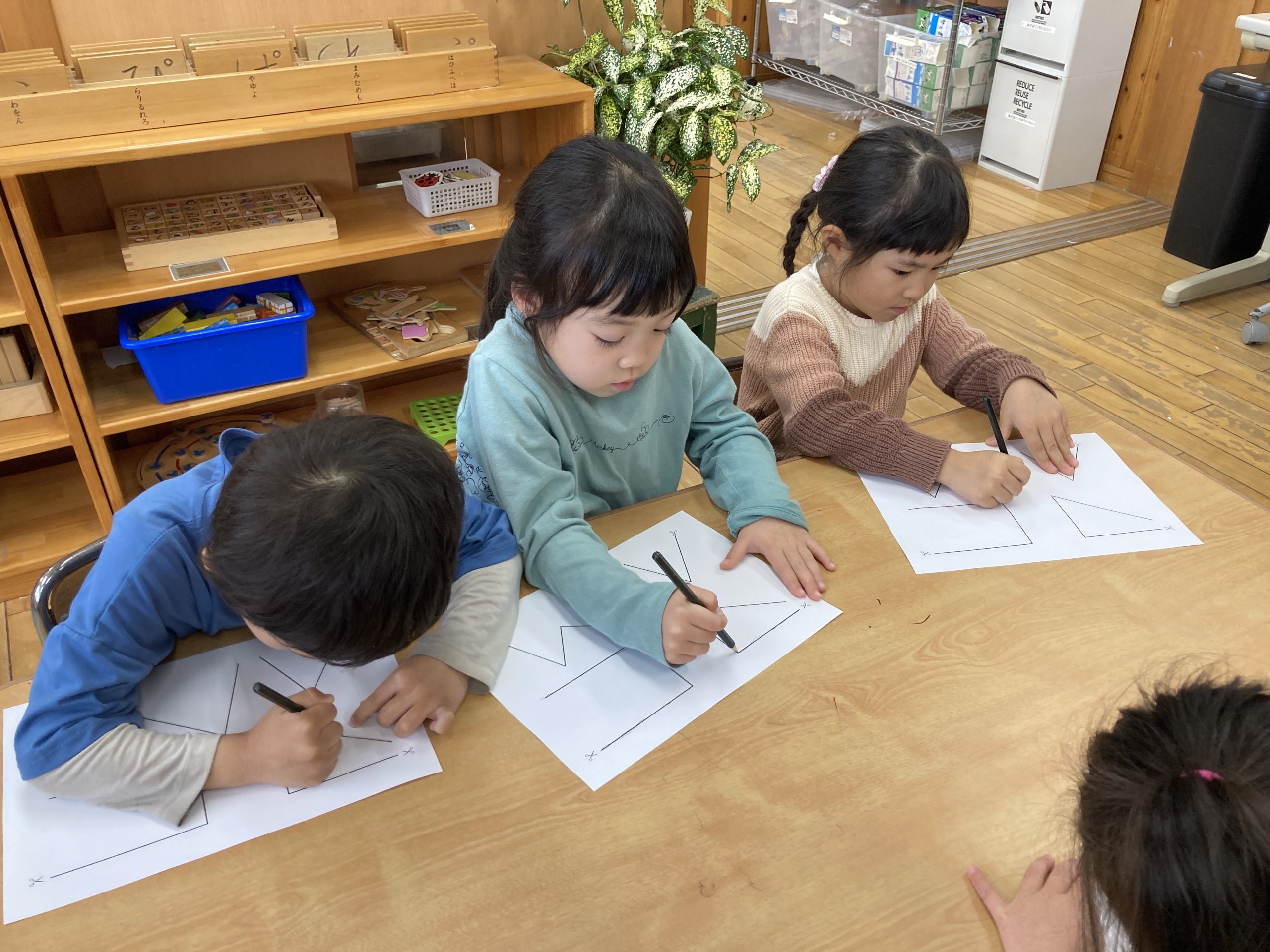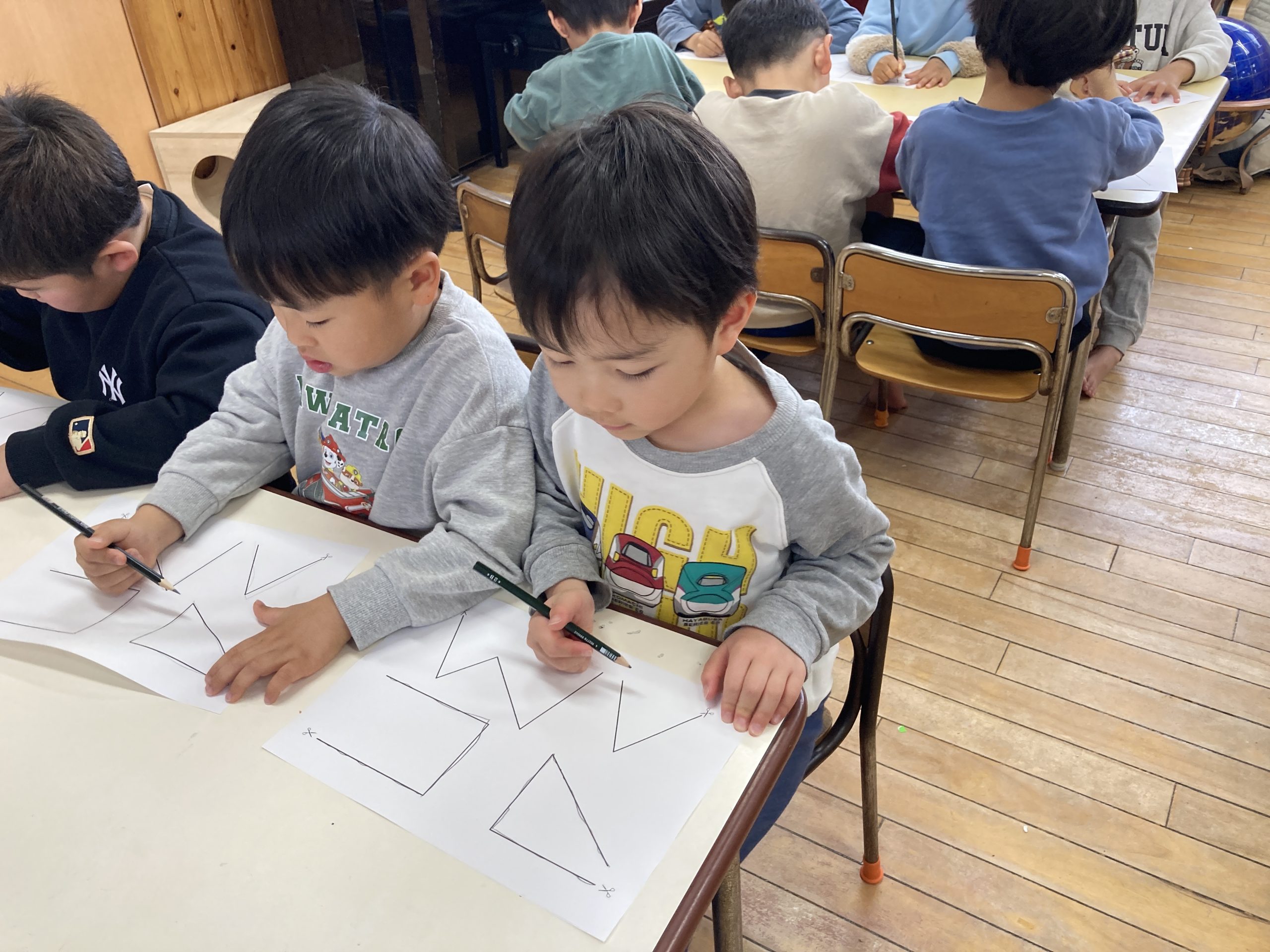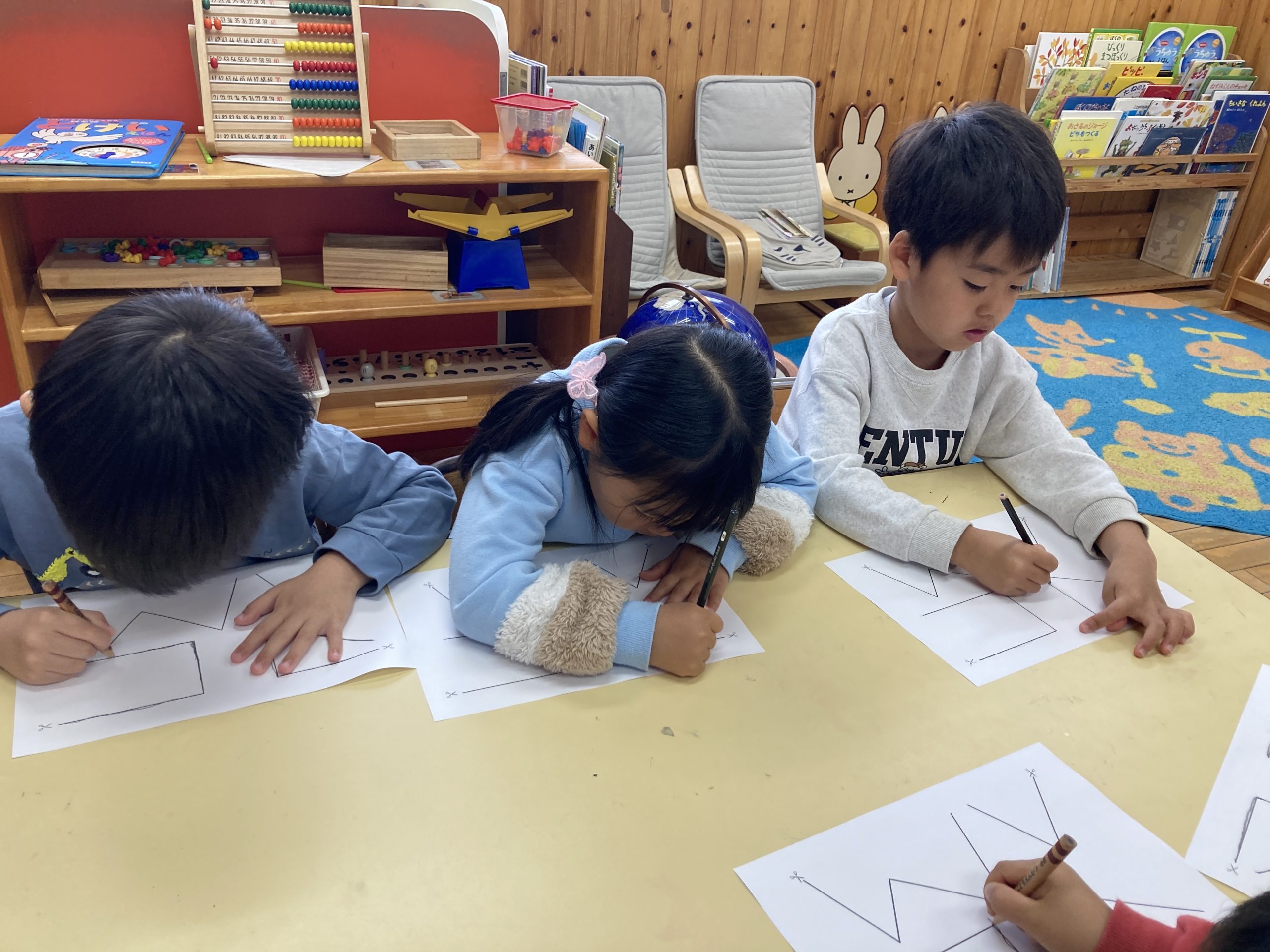 今日は文字数遊びをしました。なぞなぞ遊びの後に、文字をみてその文字が入っている言葉探しをしました。他にも運筆の練習や数字や時計の読み方も一緒に学びました。