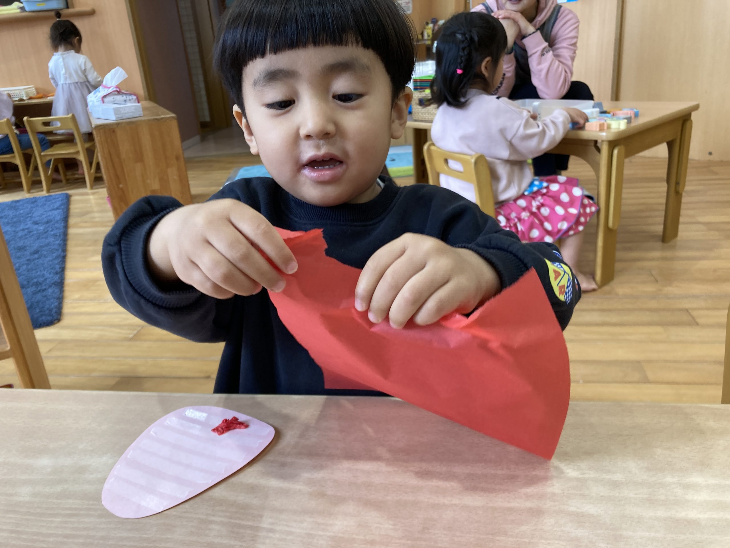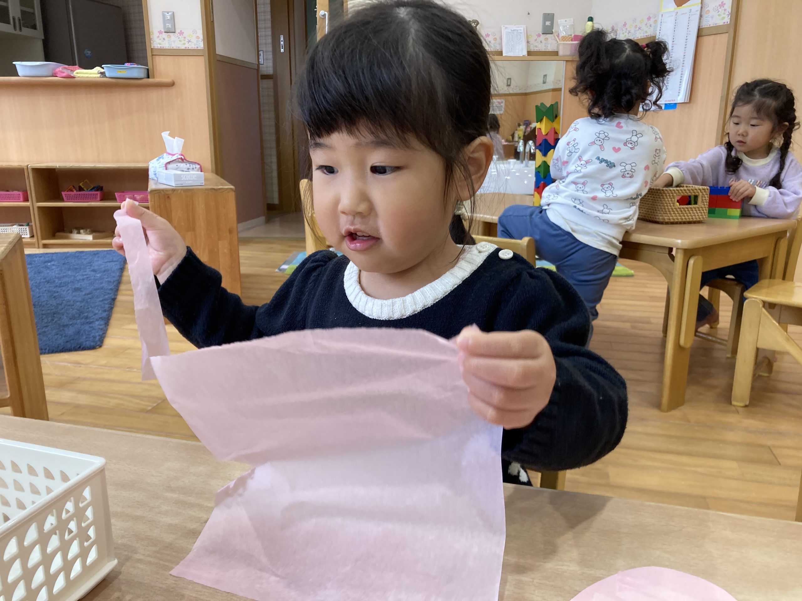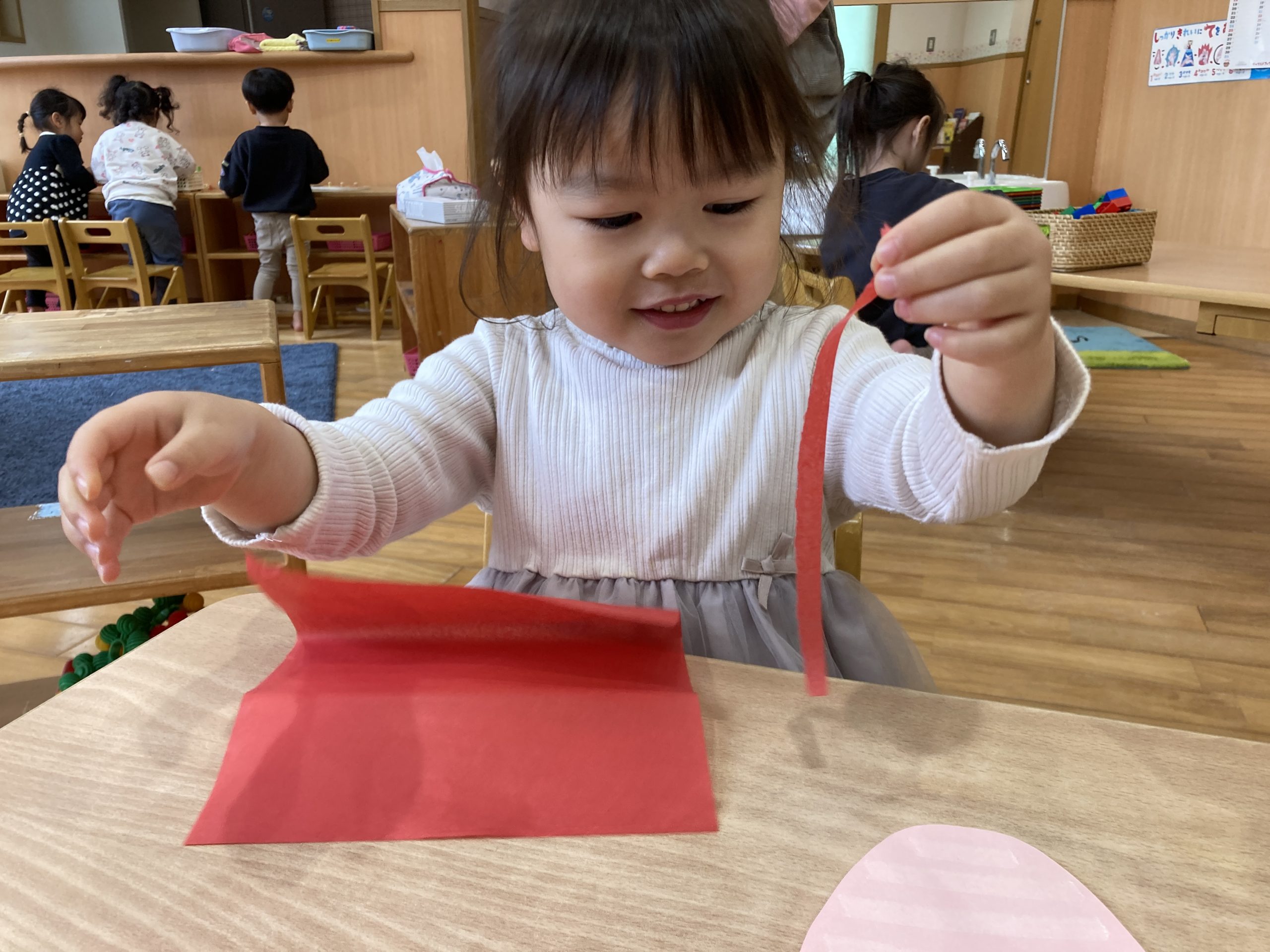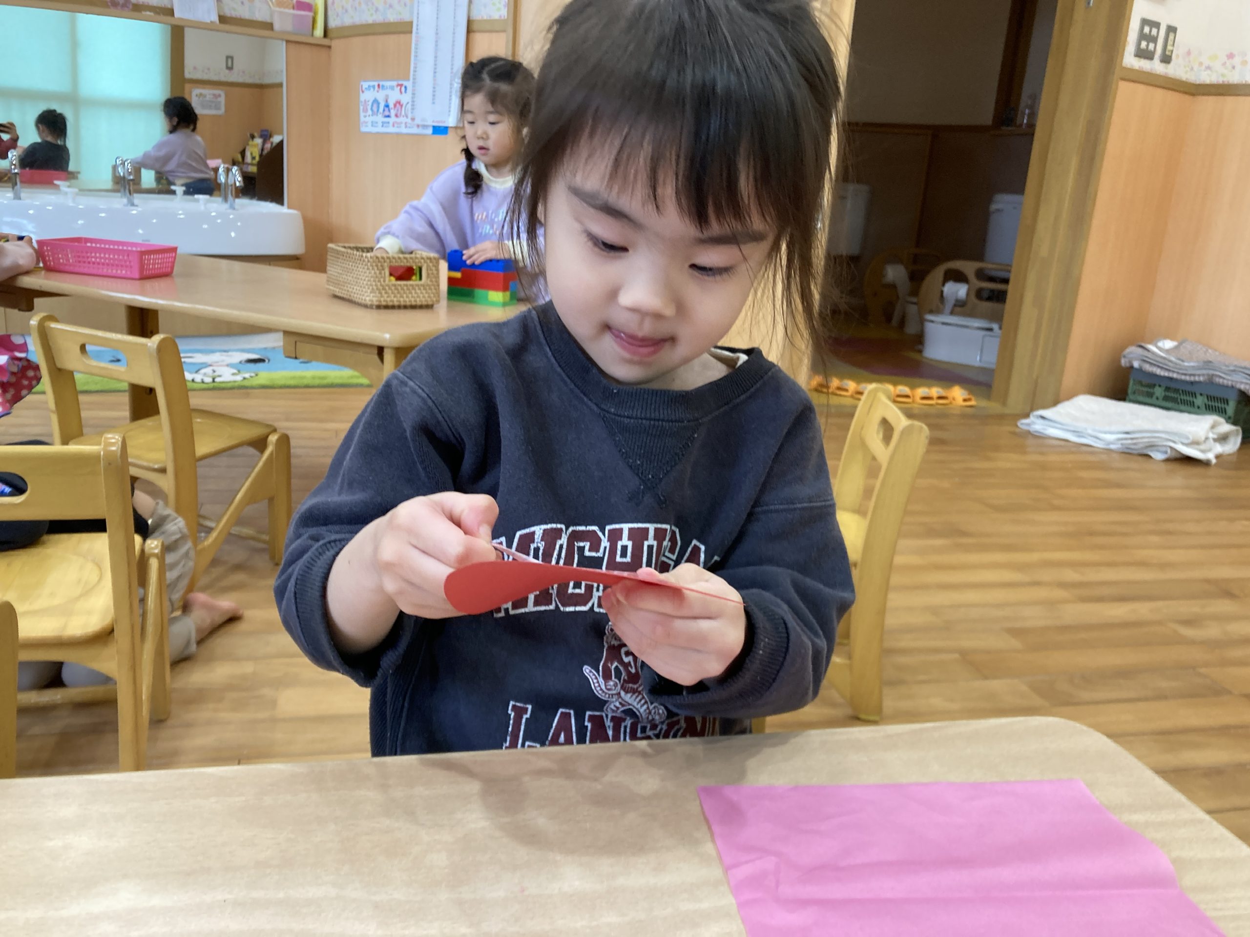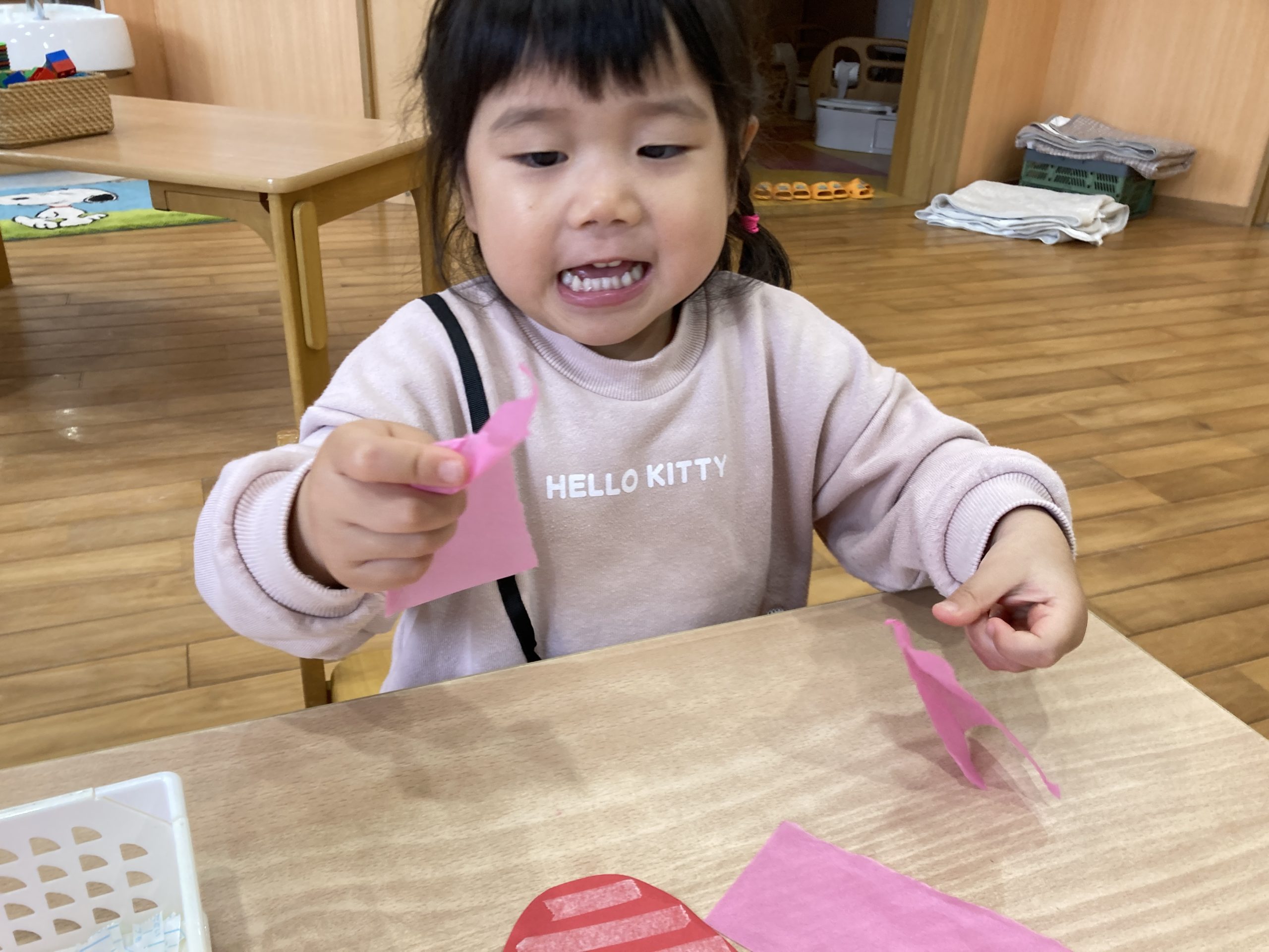 今日は、2月の製作をしました🍓好きな色の花紙を選んで、丸めながら美味しそうなイチゴが出来上がっていましたよ😊