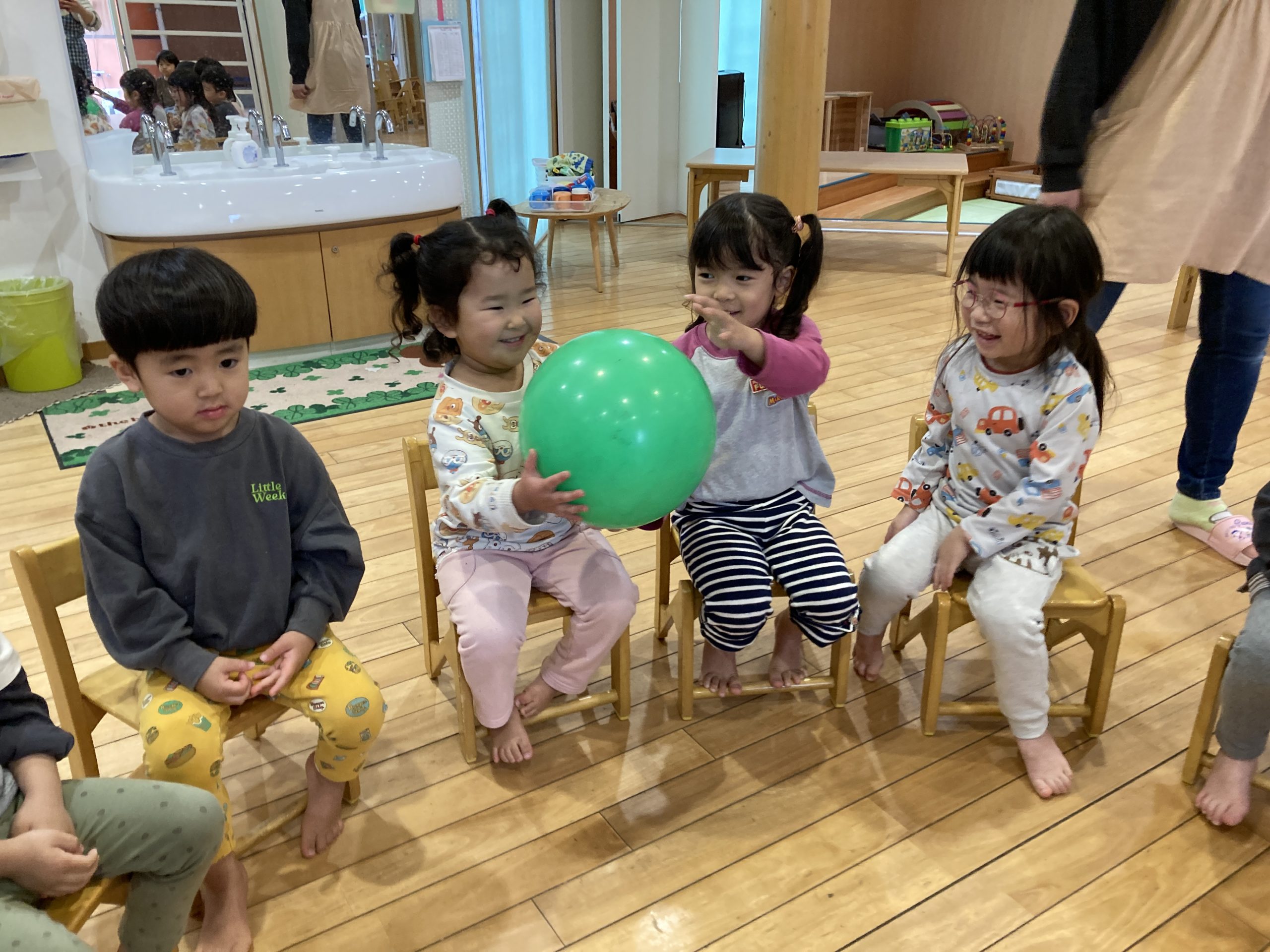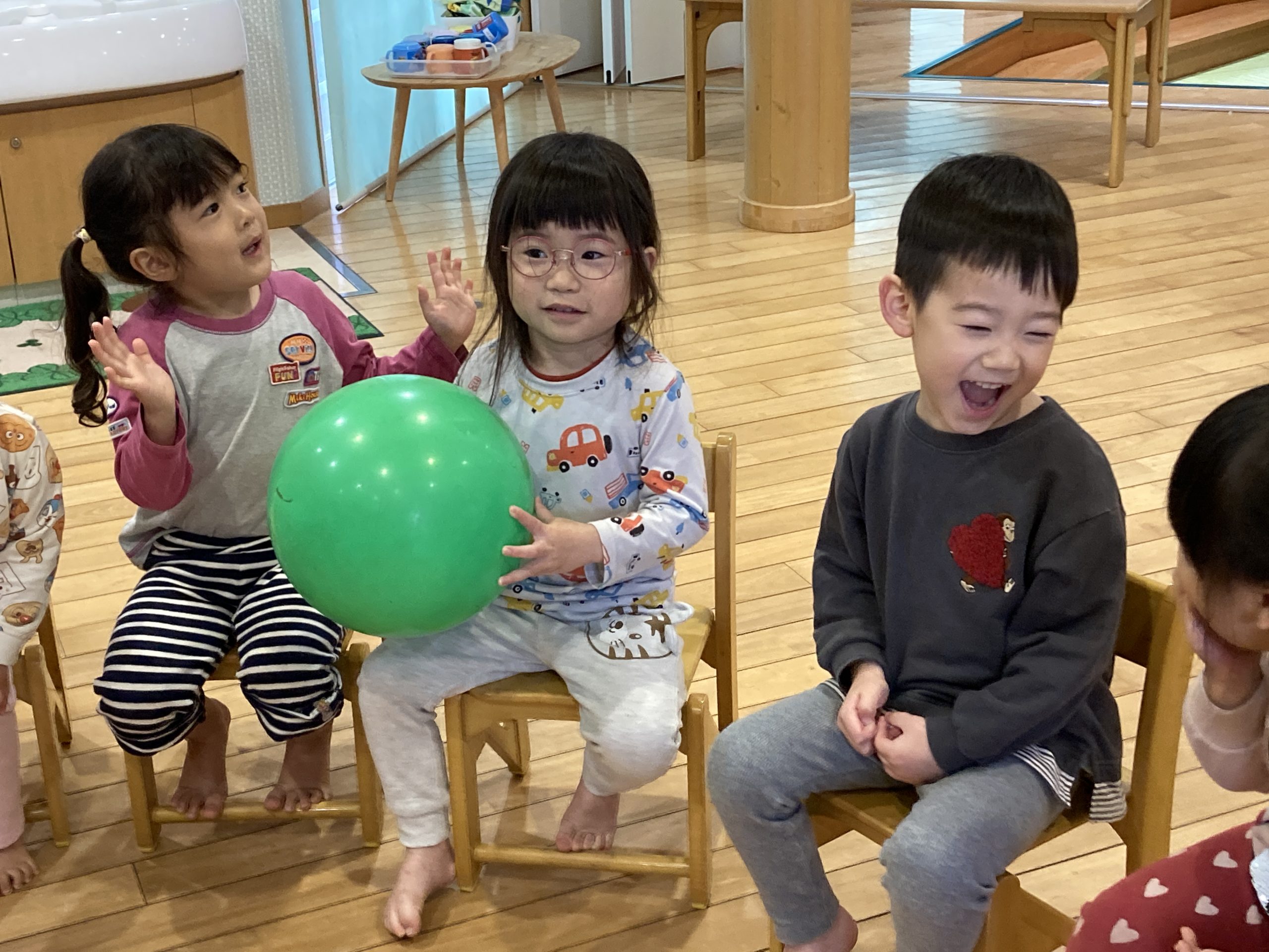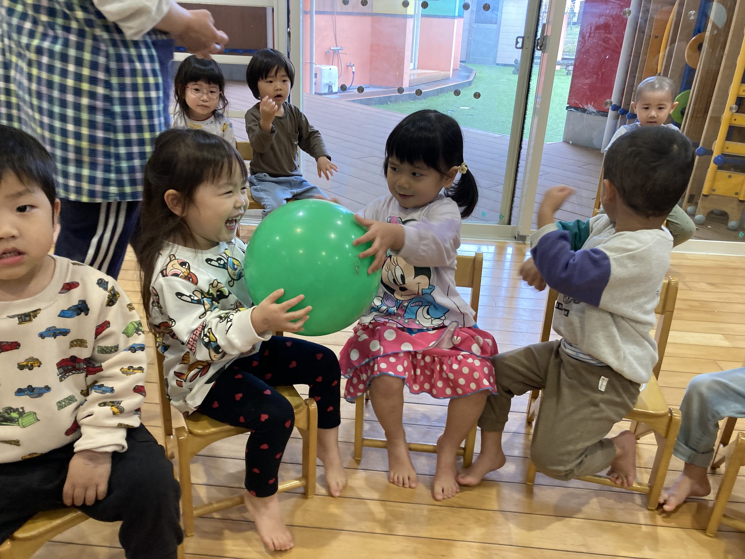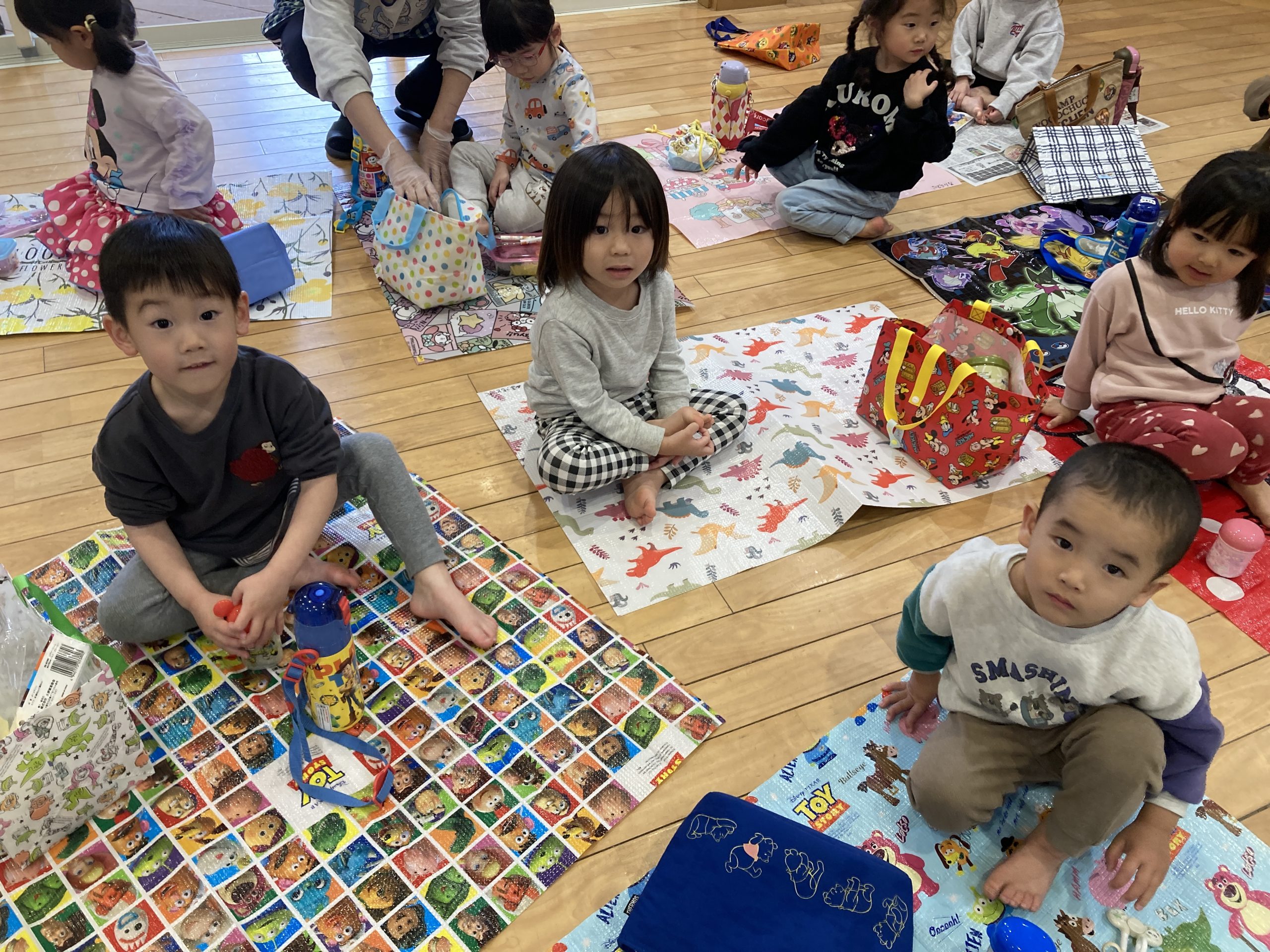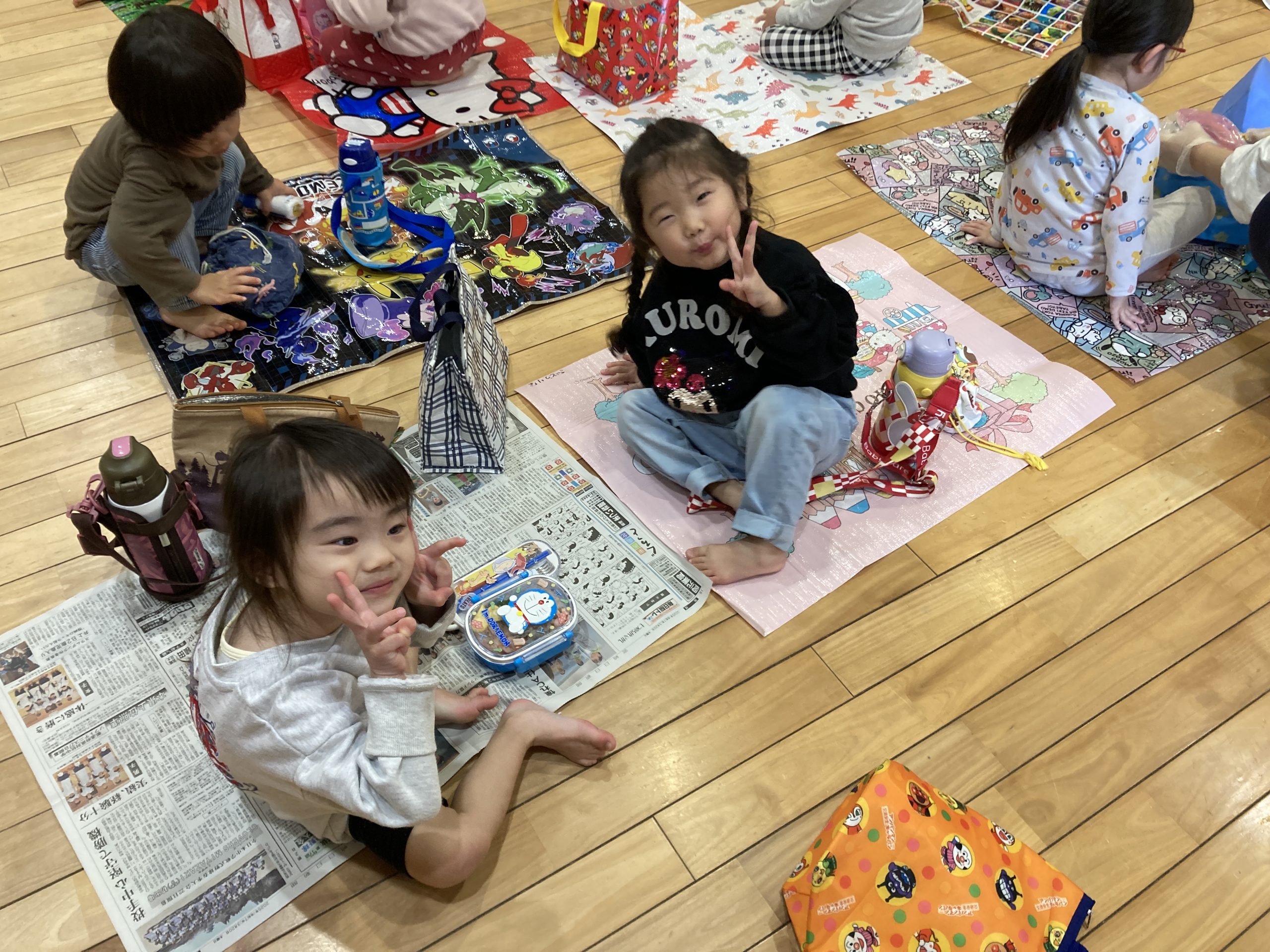 今日は、室内で爆弾ゲームをしました💣音楽が流れている間、隣のお友だちにボールを回しながら、楽しく取り組んでいましたよ✨お昼は、シートを敷いて、お友だちと一緒においしいお弁当を食べていました😊
