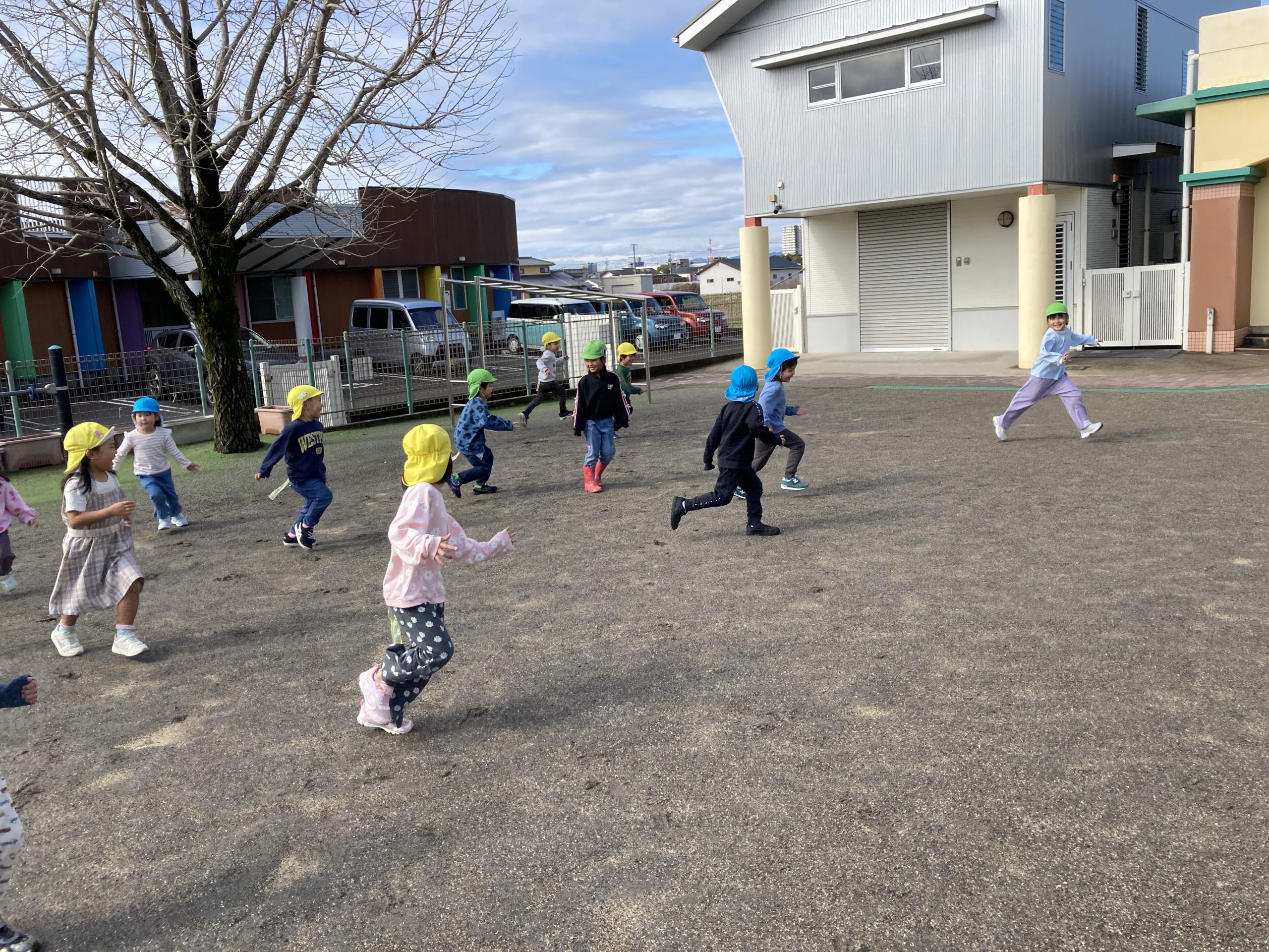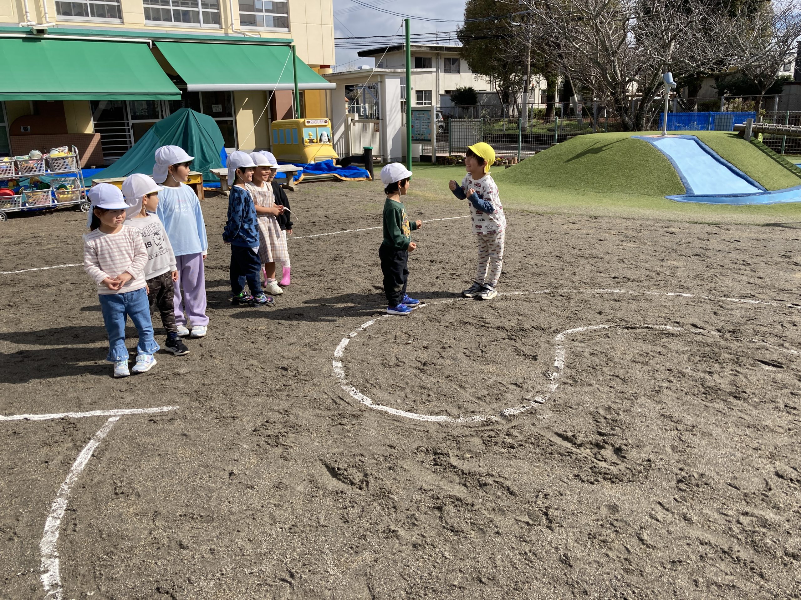 今日は、異年齢グループでゲームあそびをしました。しっぽとり、だるまさんが転んだ、ぐるぐるじゃんけん✌️、中当てをしました‼️最後の異年齢グループでしたが、異年齢で関わりながら楽しんで遊んでいました。
