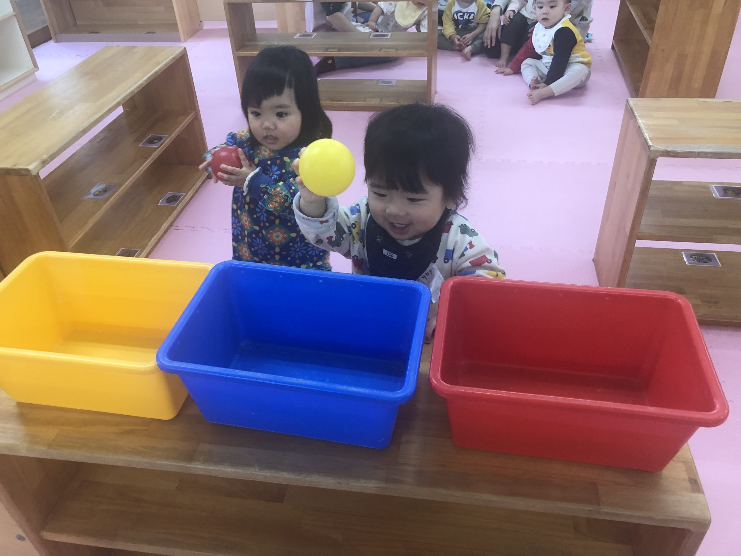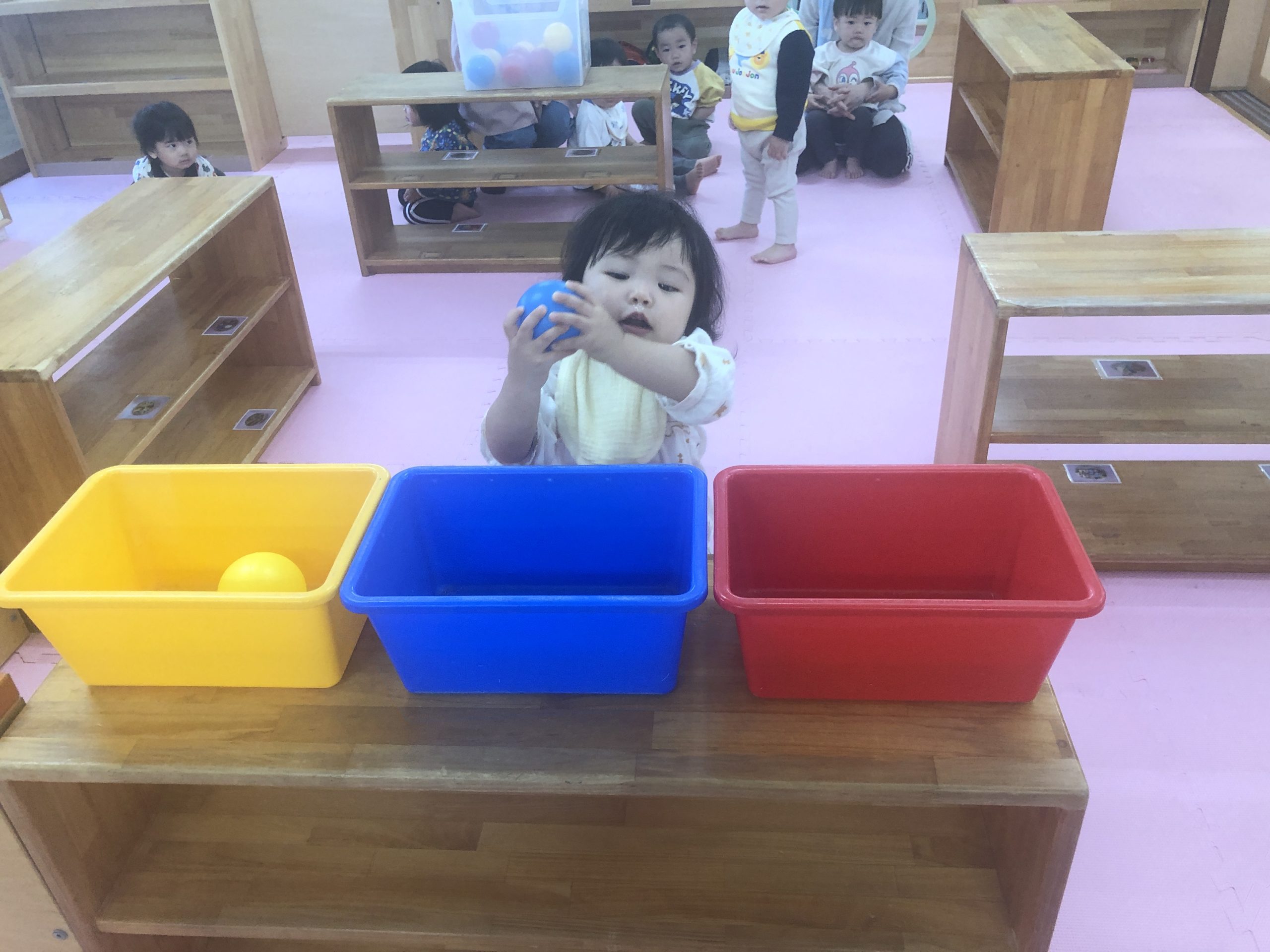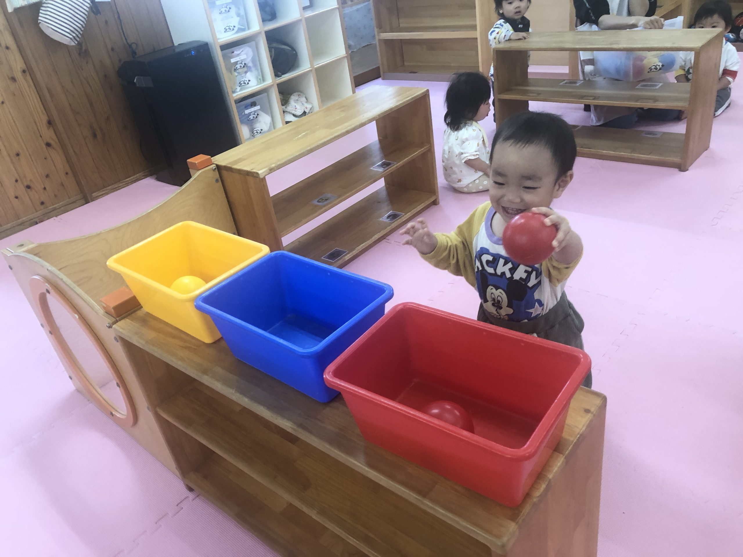 今日は、色の分別分類あそびをしました。カラーボールを手に同じ色のボックスを探して入れていましたよ✨音楽を聞きながらリズムにのって、手持ち太鼓を鳴らして楽しんでいました♫