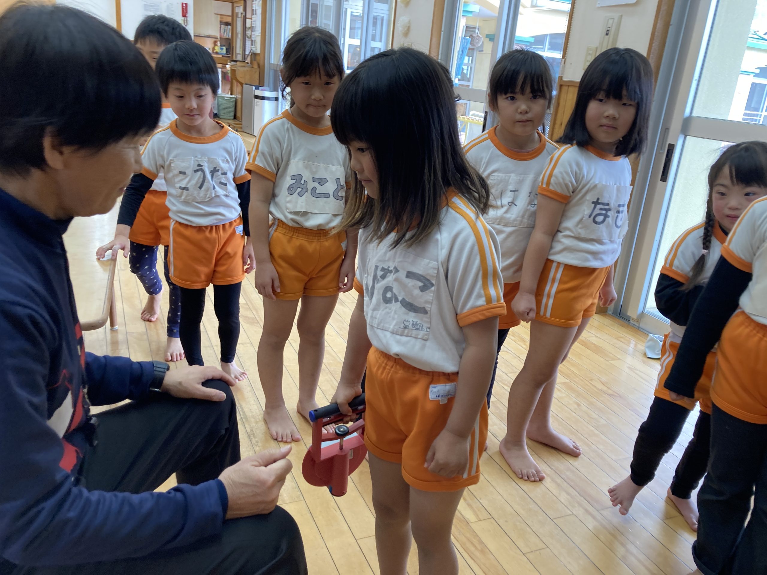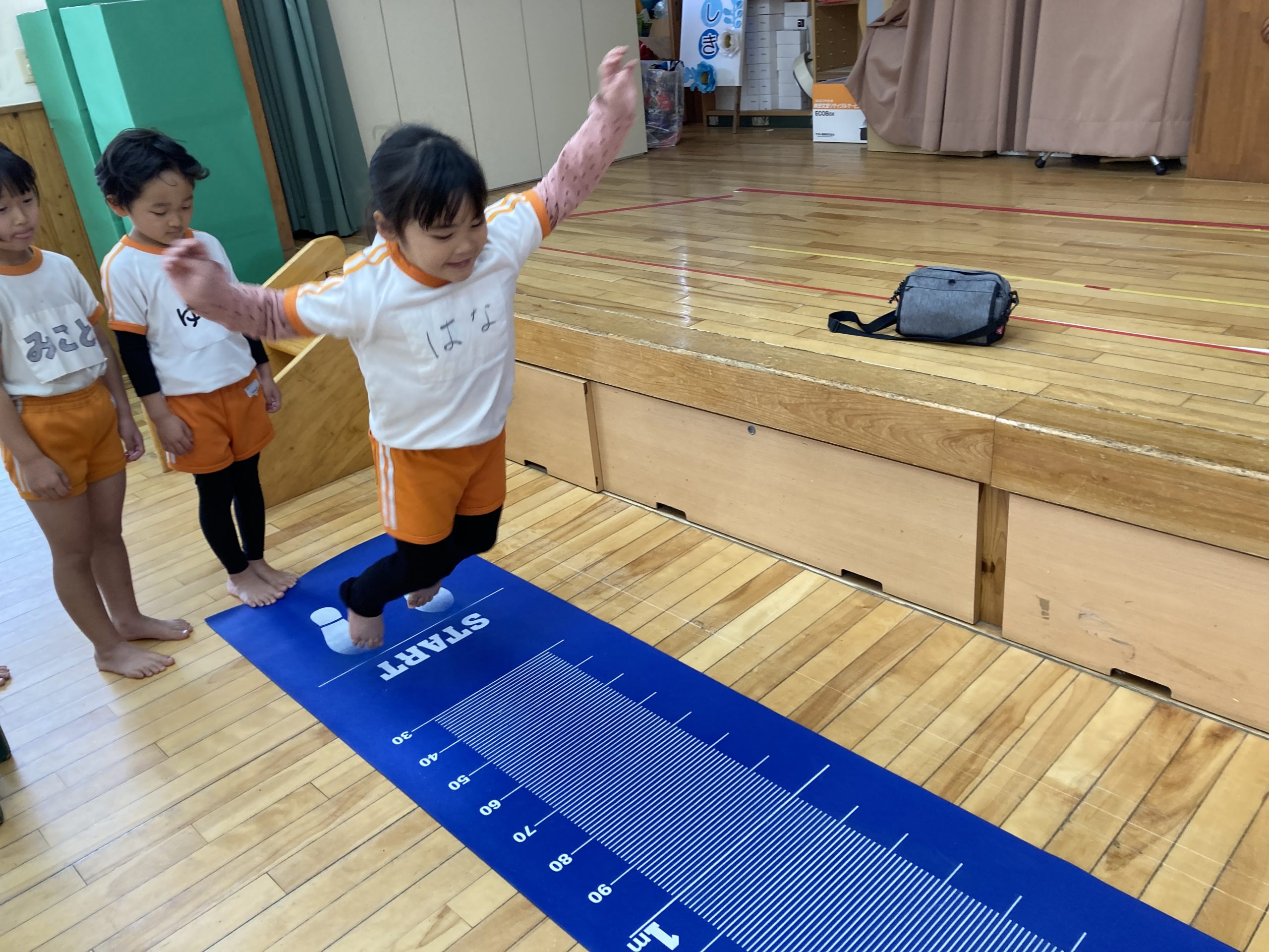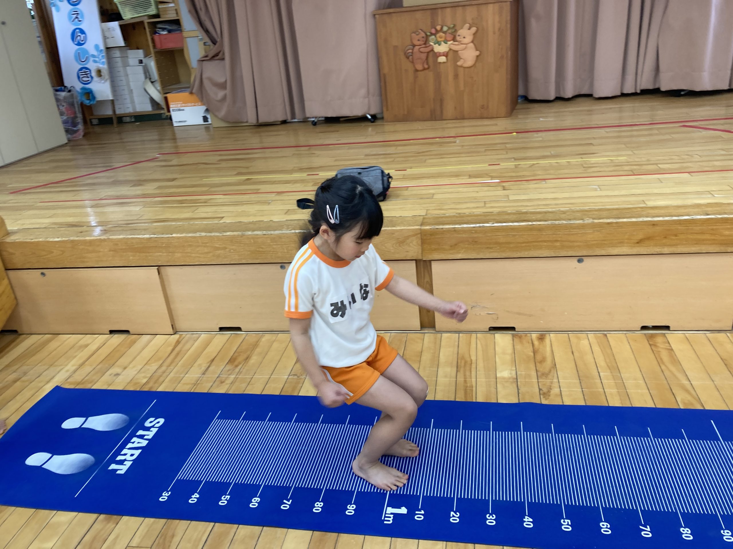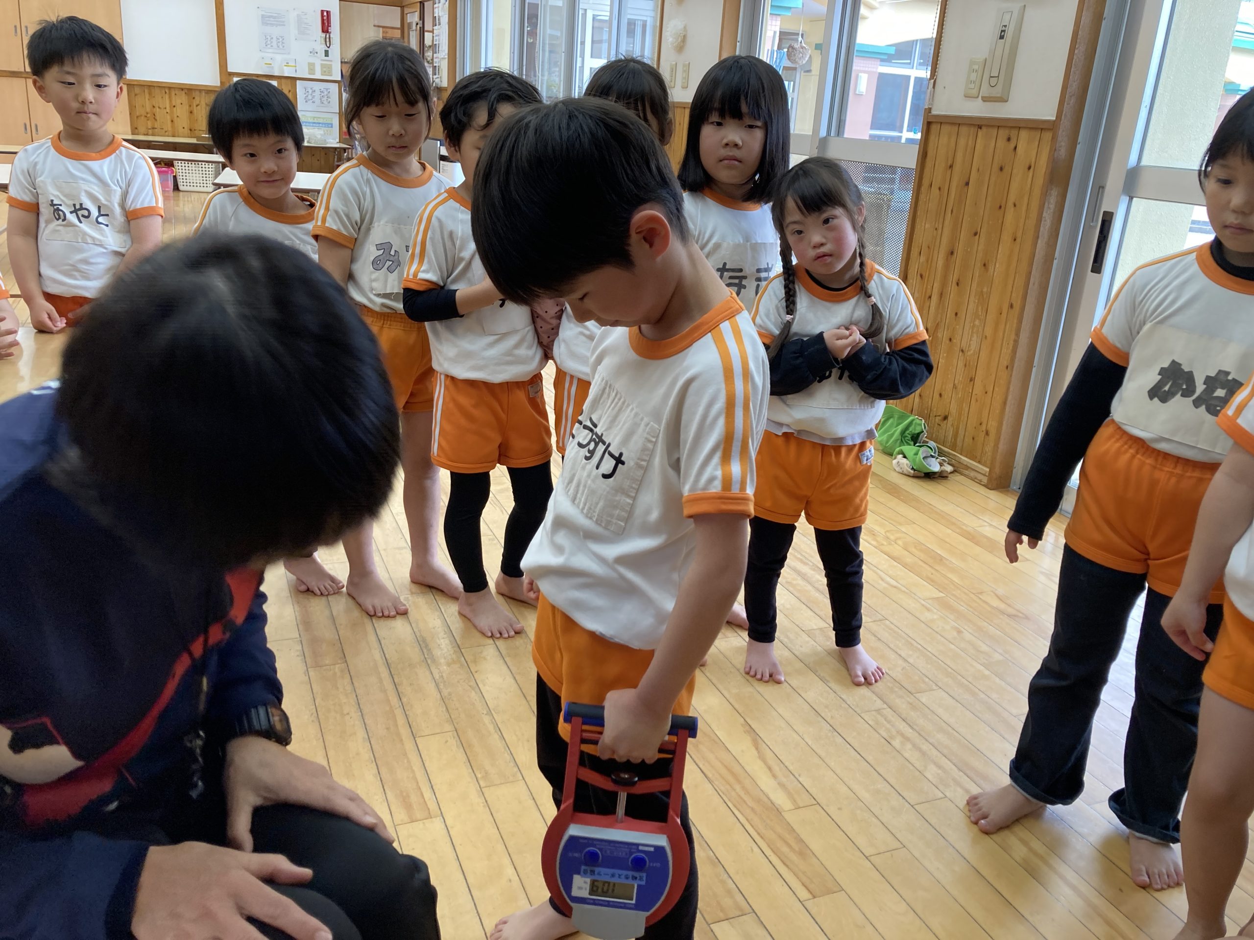 今日の体育あそびは、体力測定をしました。握力、長座前屈、立ち幅跳びをしました。みんな頑張って測定していました。終わった後は、りすぐみさんと一緒にドッチボールの試合をして遊びました。