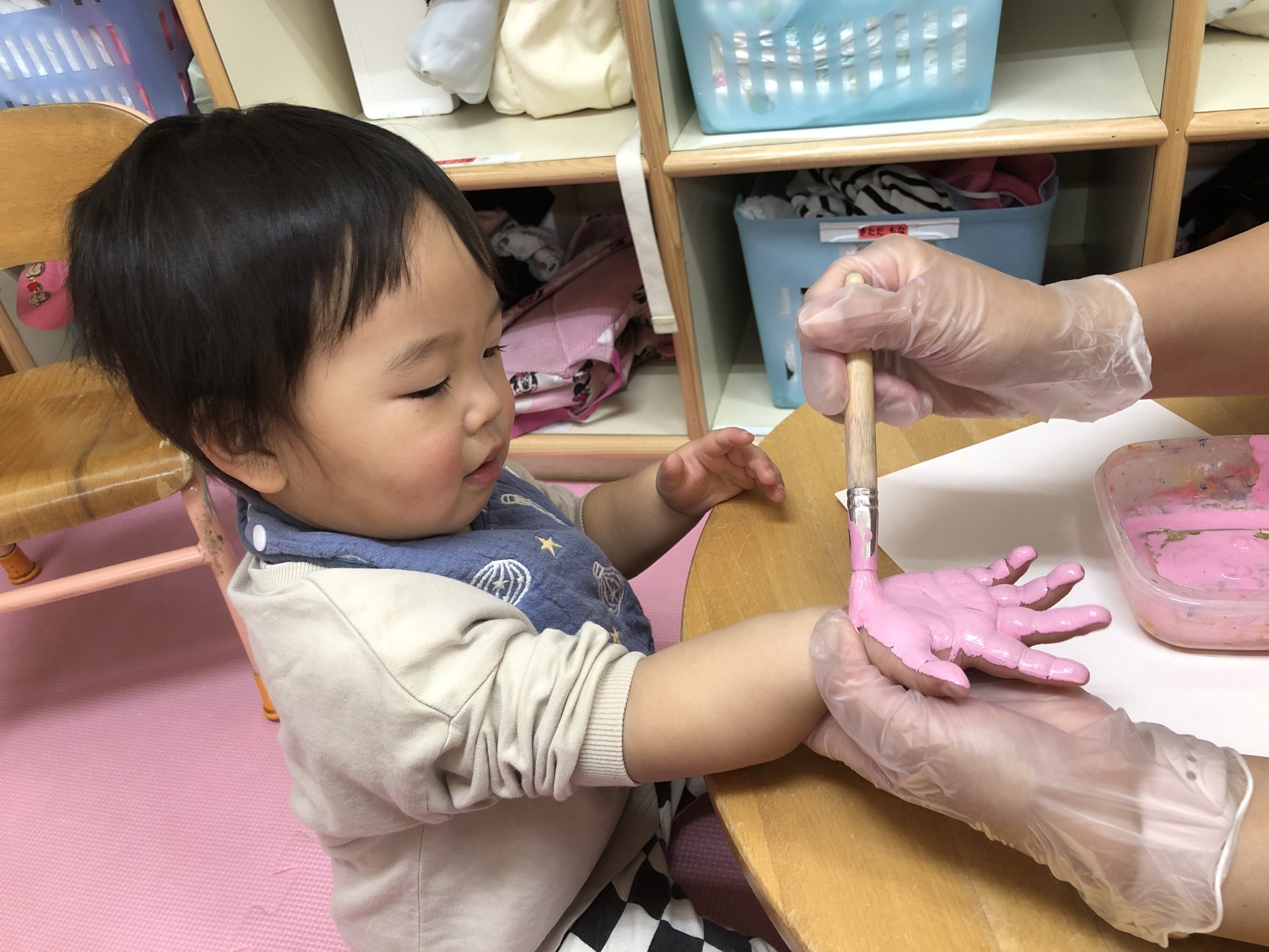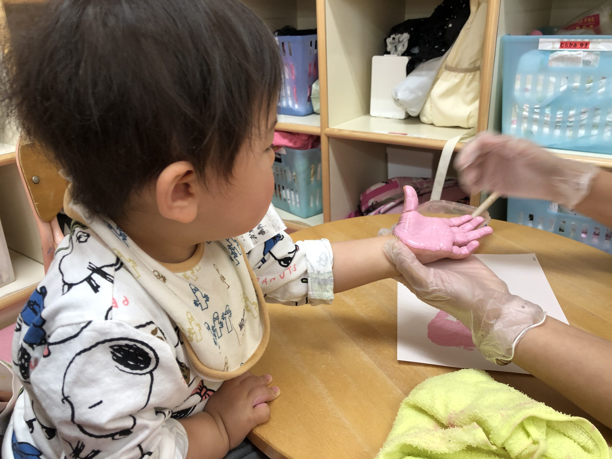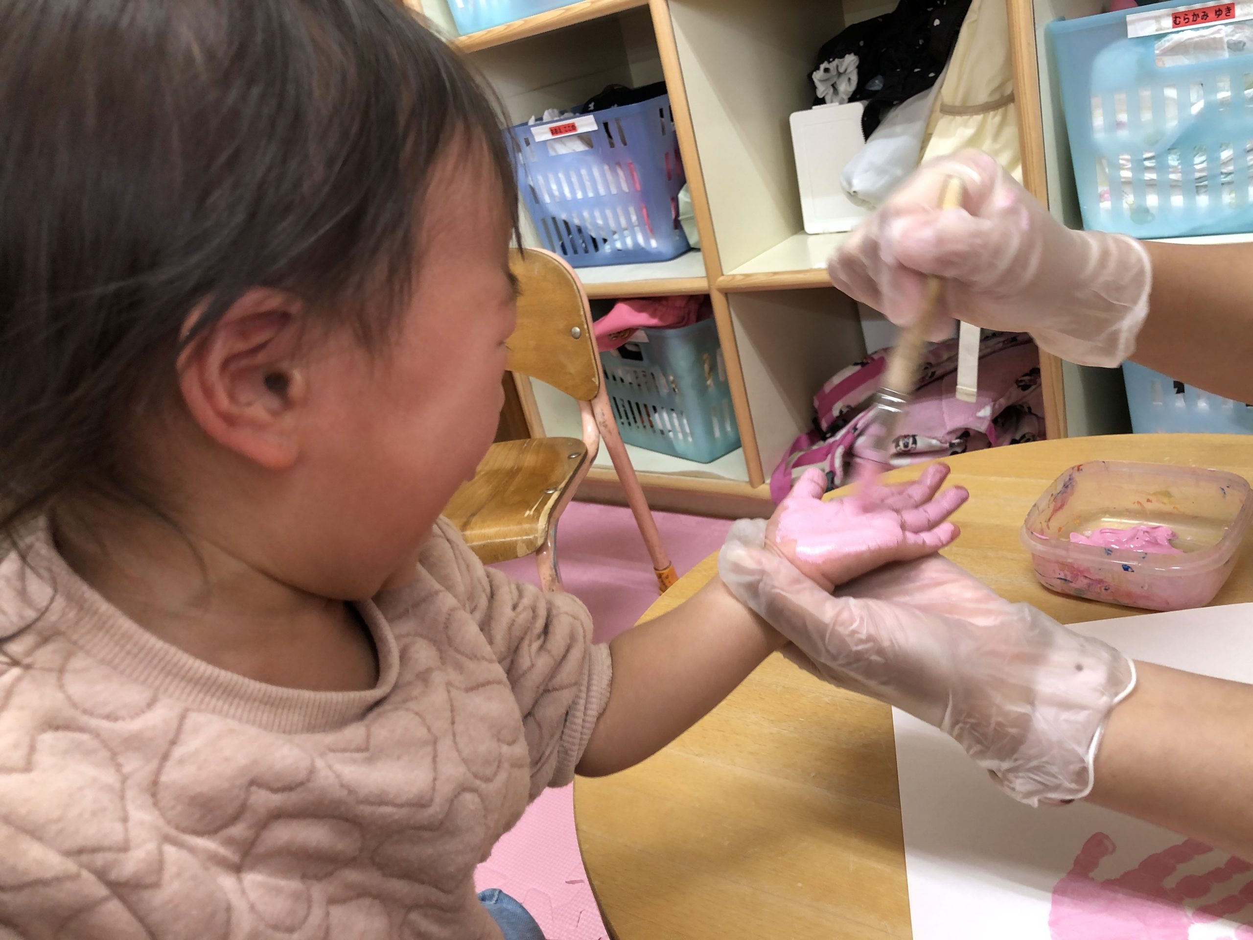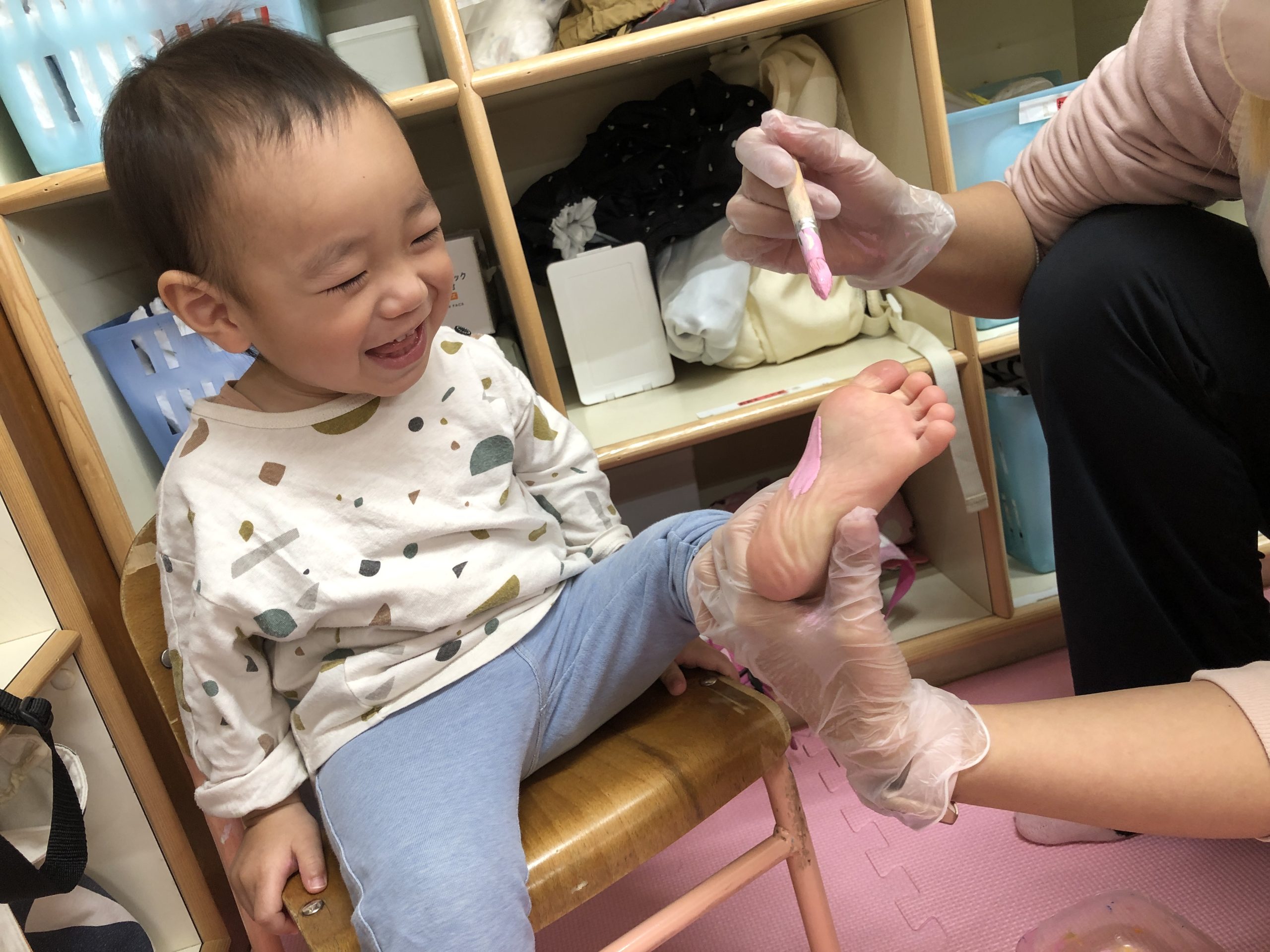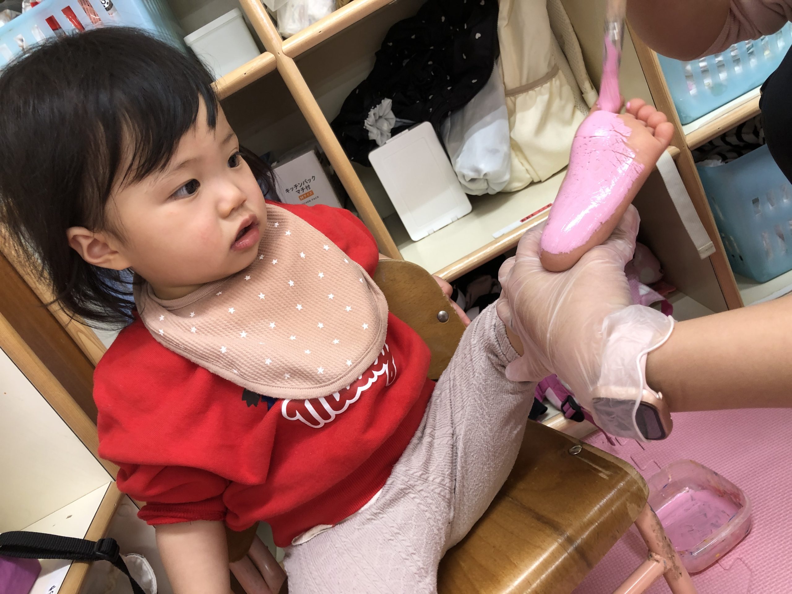 今日は手形、足形とりをしました‼︎絵の具の感触が嫌で泣いてしまう子もいましたが、みんな綺麗にとることができましたよ😍