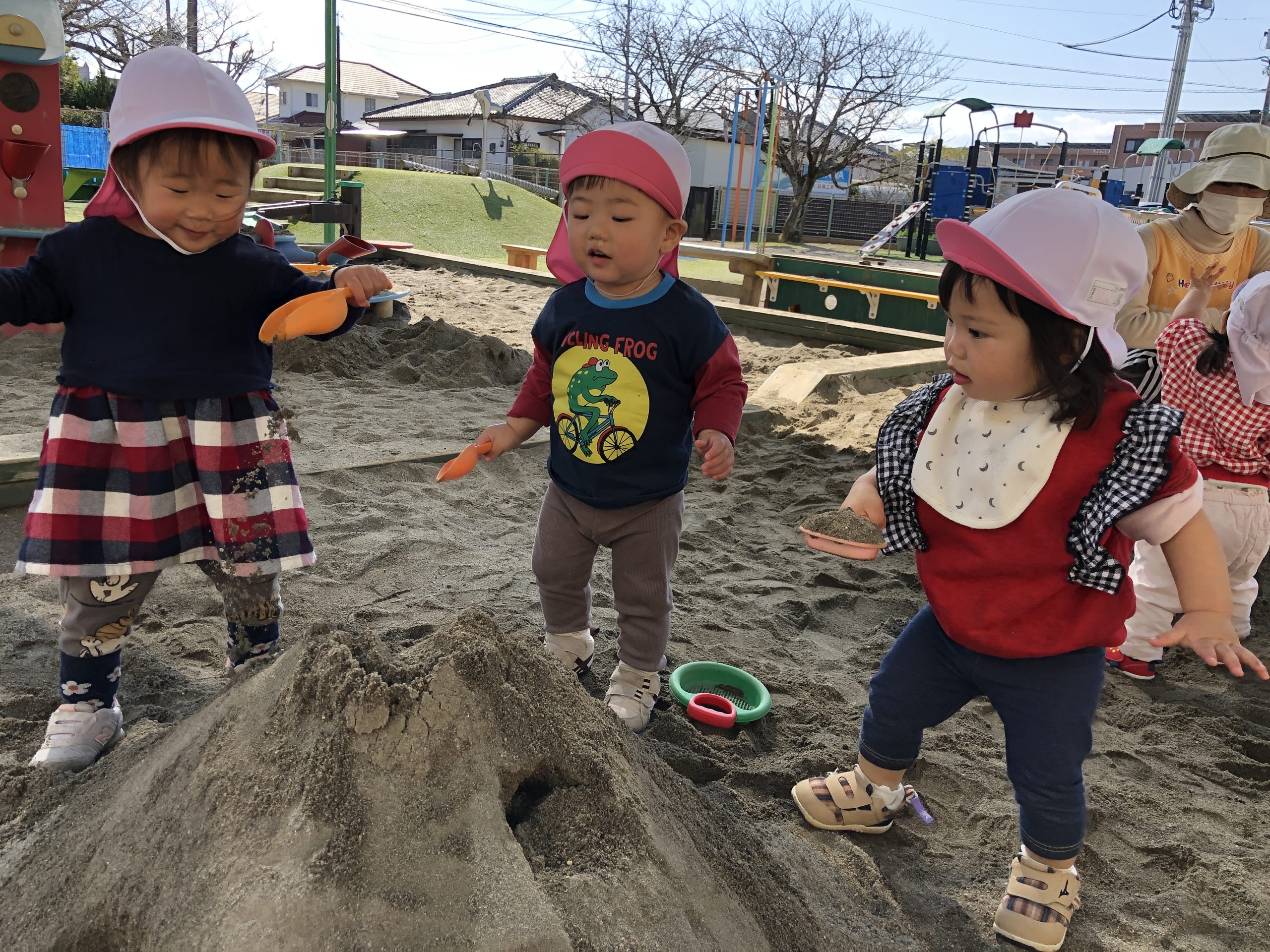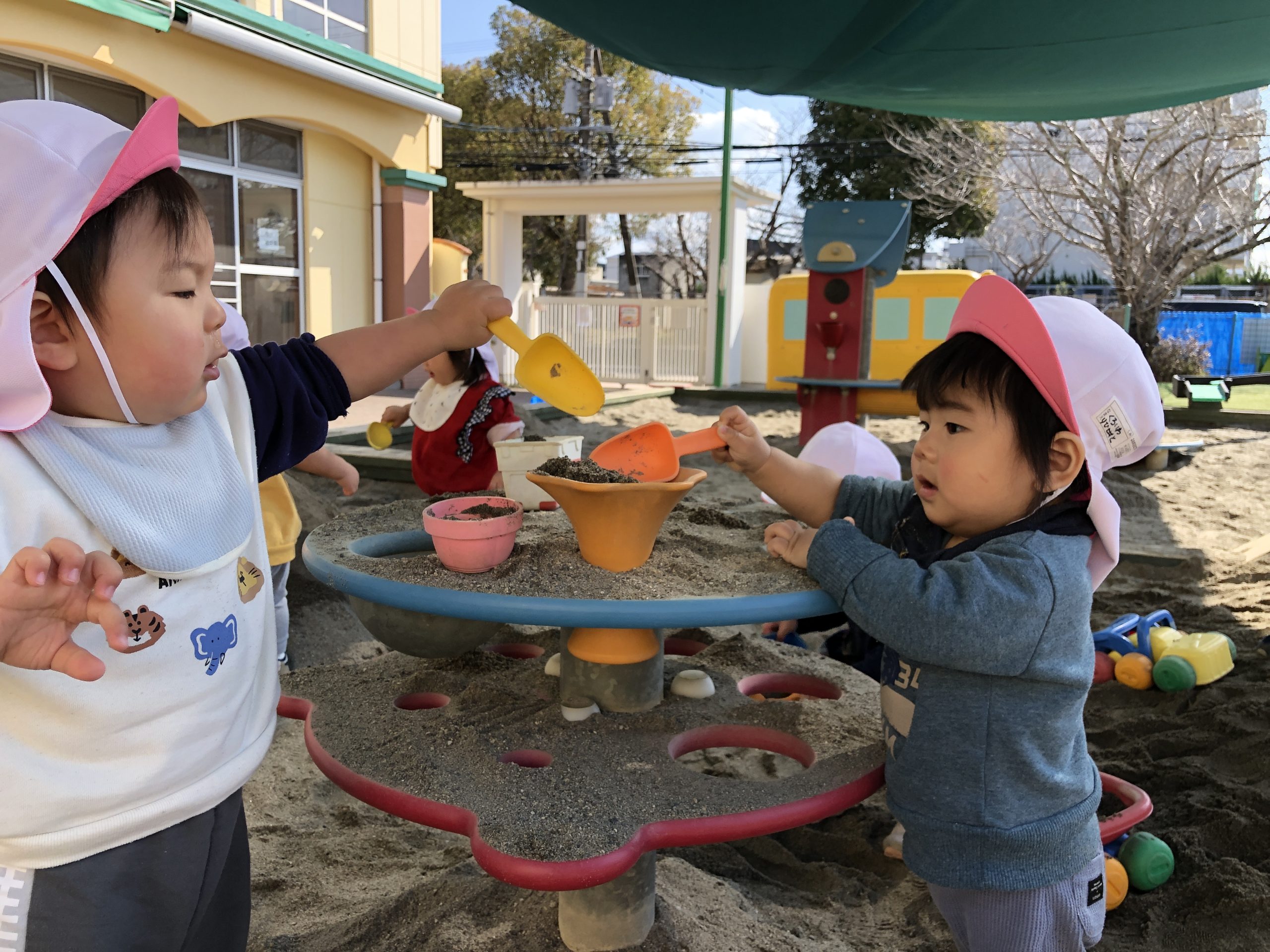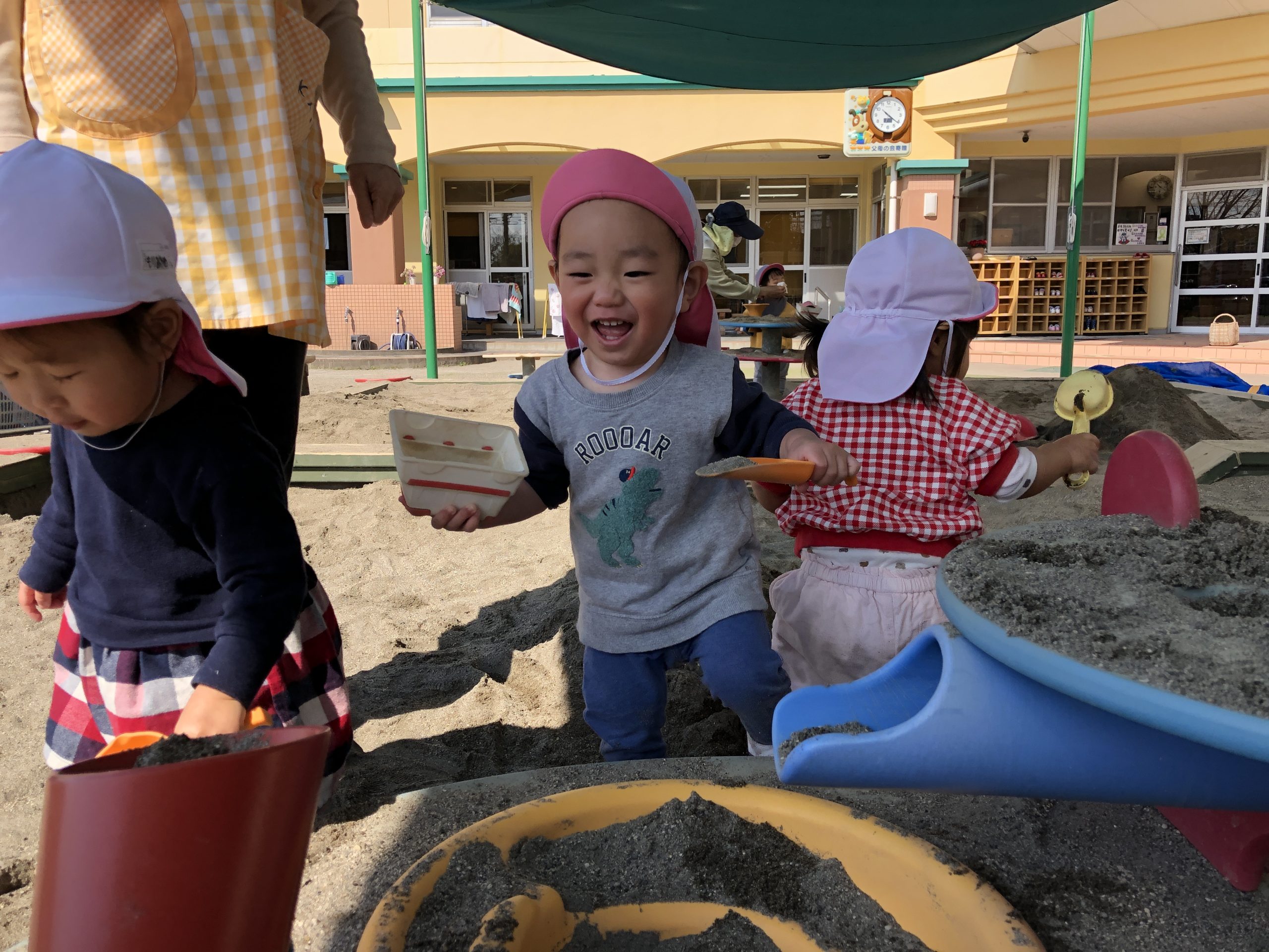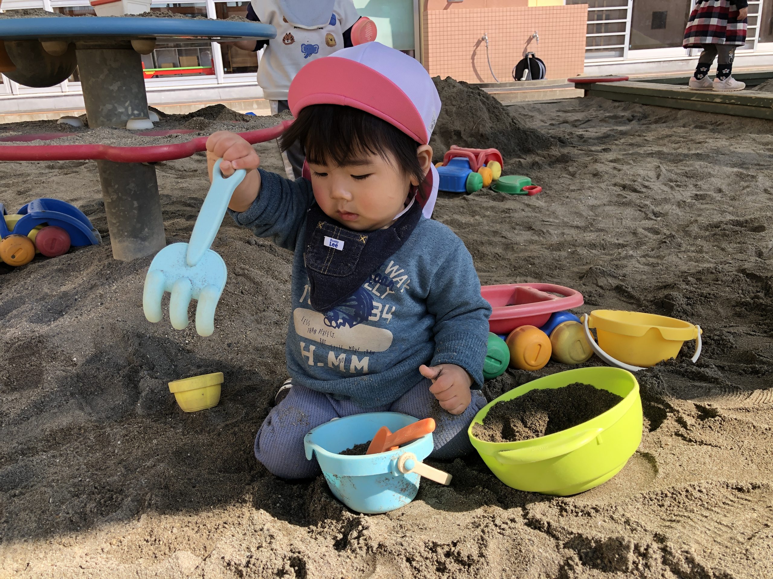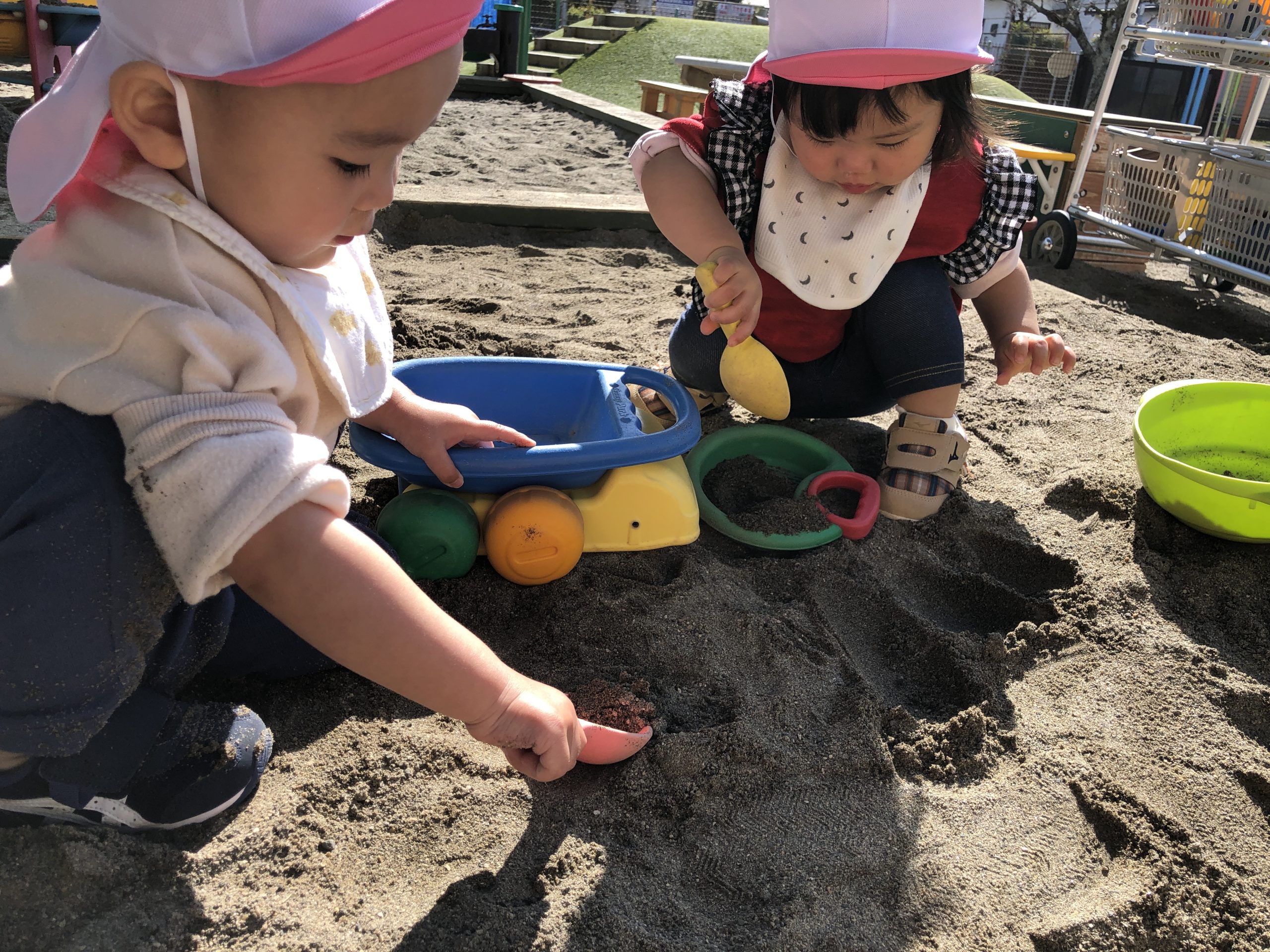 今日は、砂場にいってあそびました。スコップで砂の出し入れしたり、素手で砂を掴んだりして砂の感触を楽しんでいました⭐︎