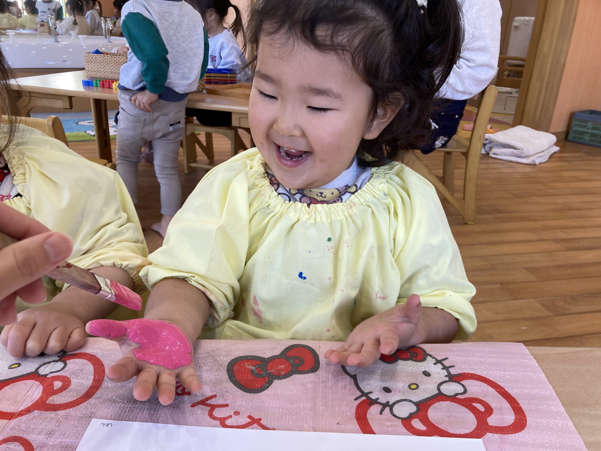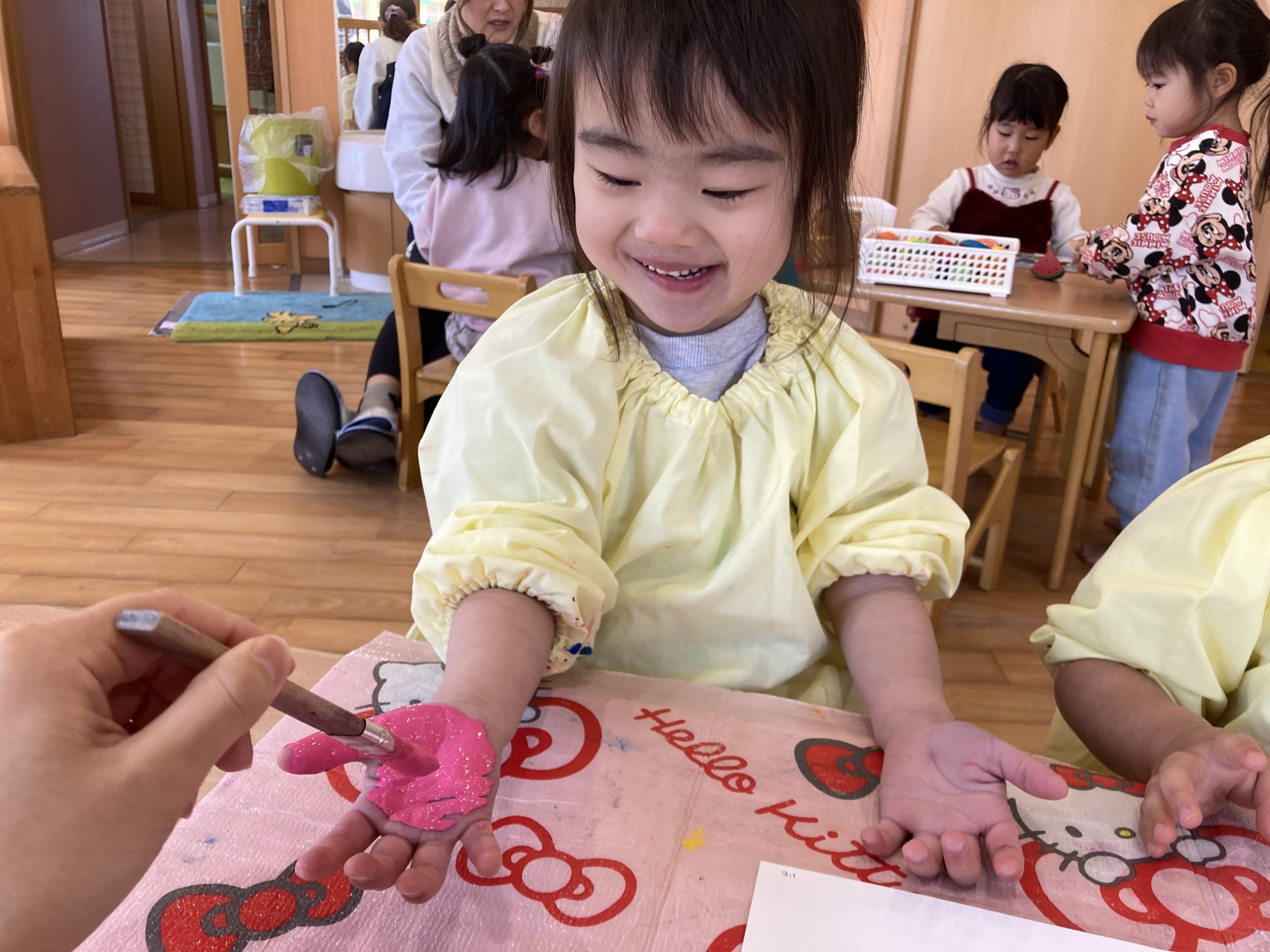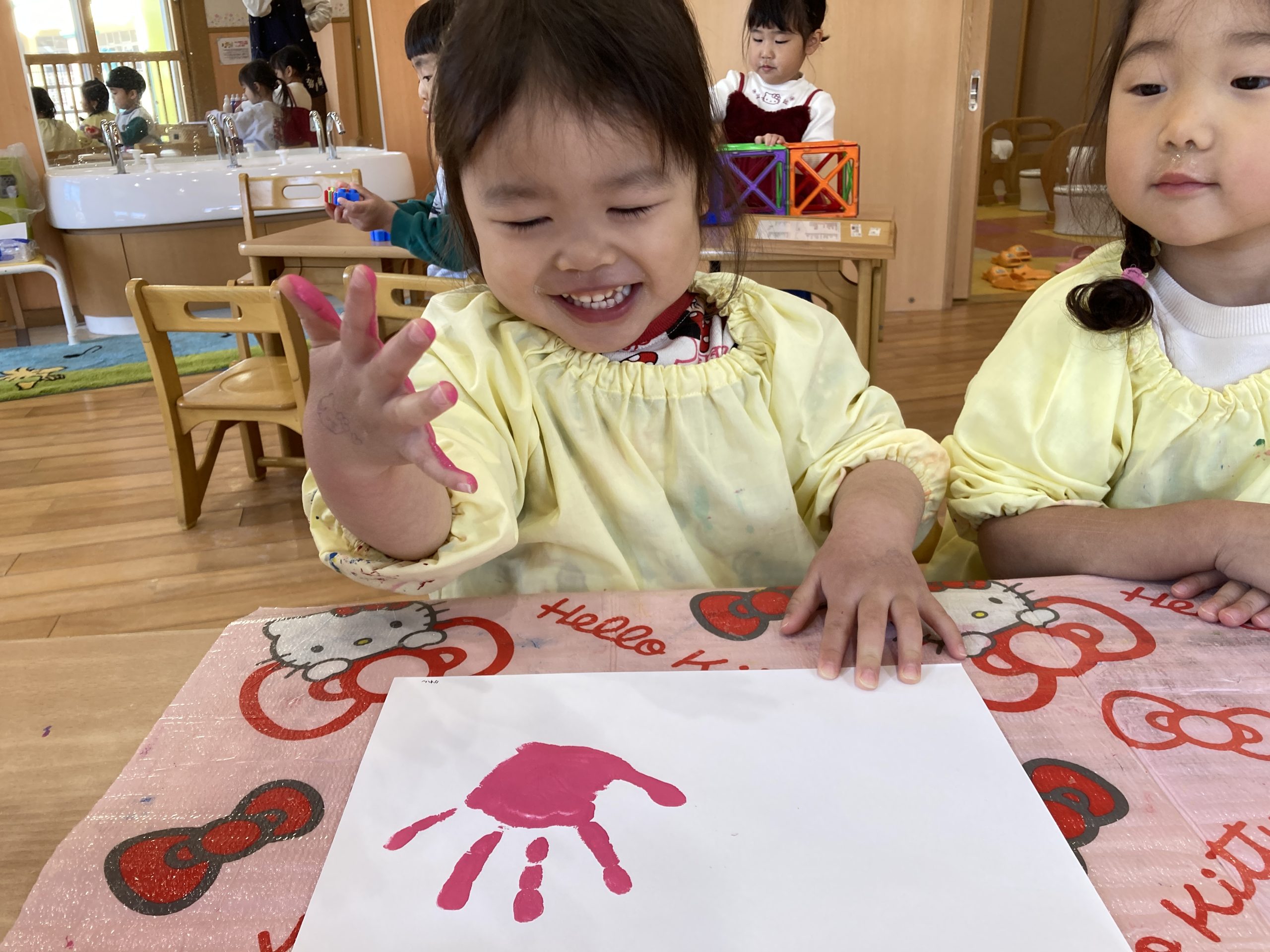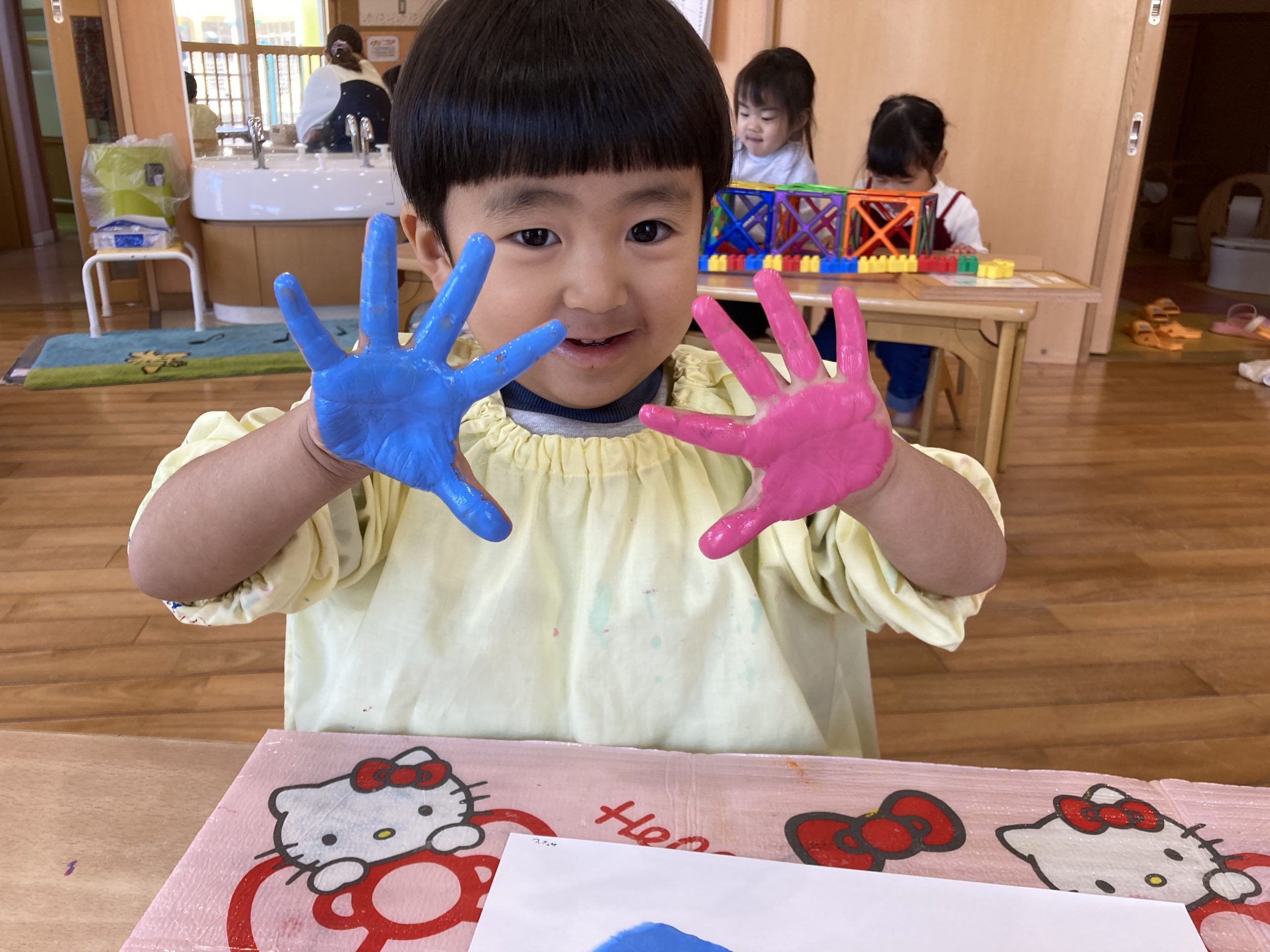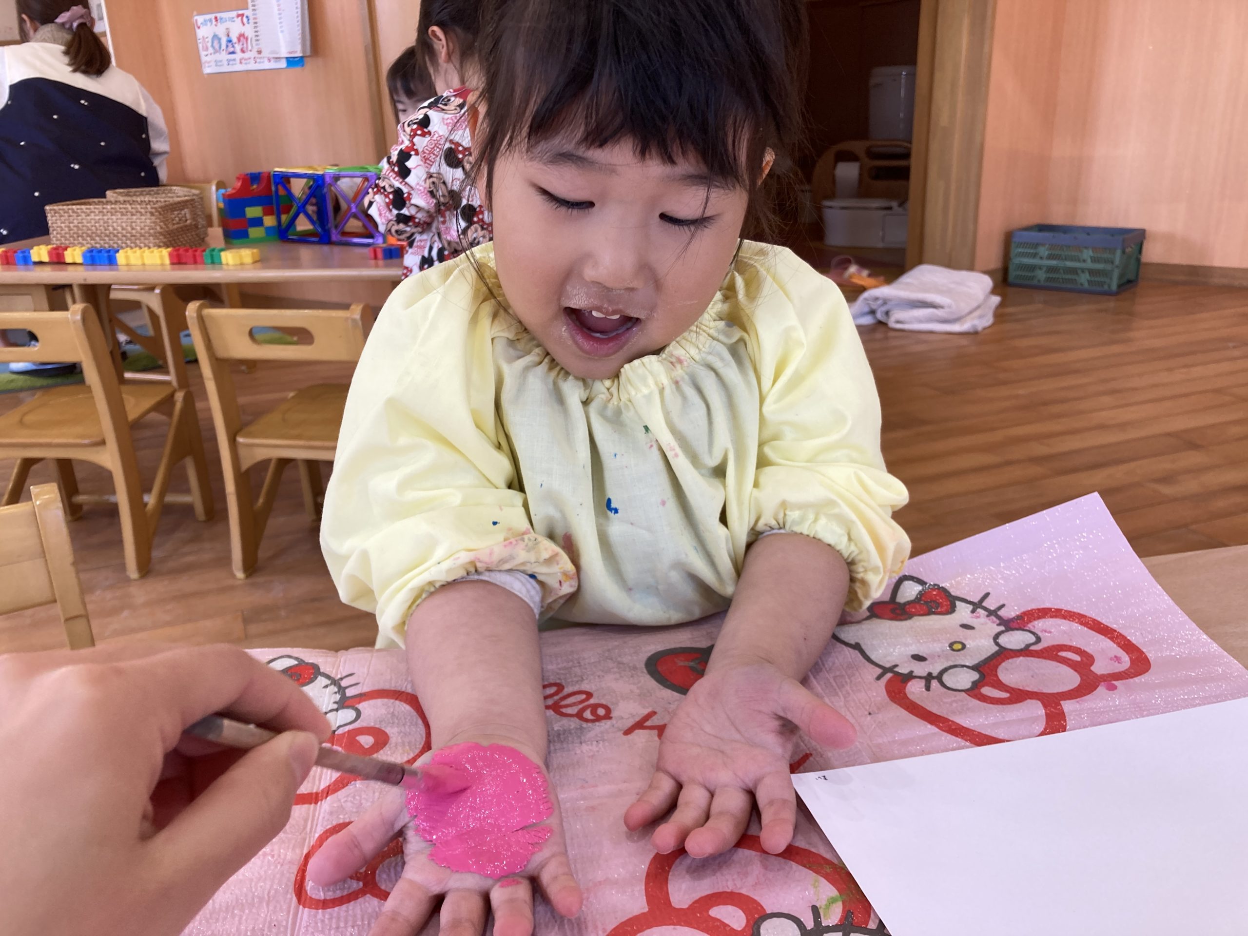 今日は、3月の製作で手形をしました✋手のひらに絵の具を広げると、「あったか~い」と感触を楽しみながら取り組んでいましたよ😊💓