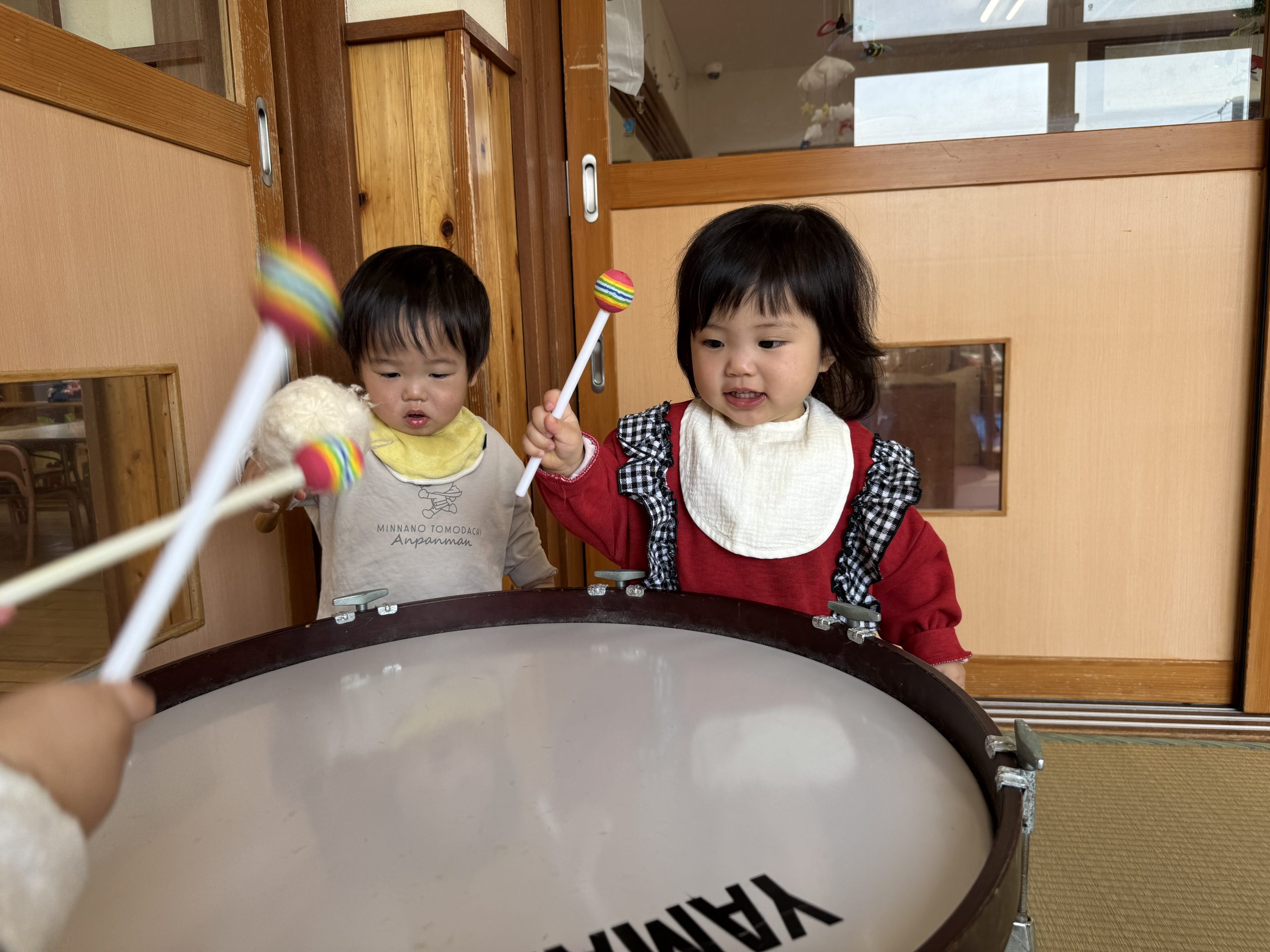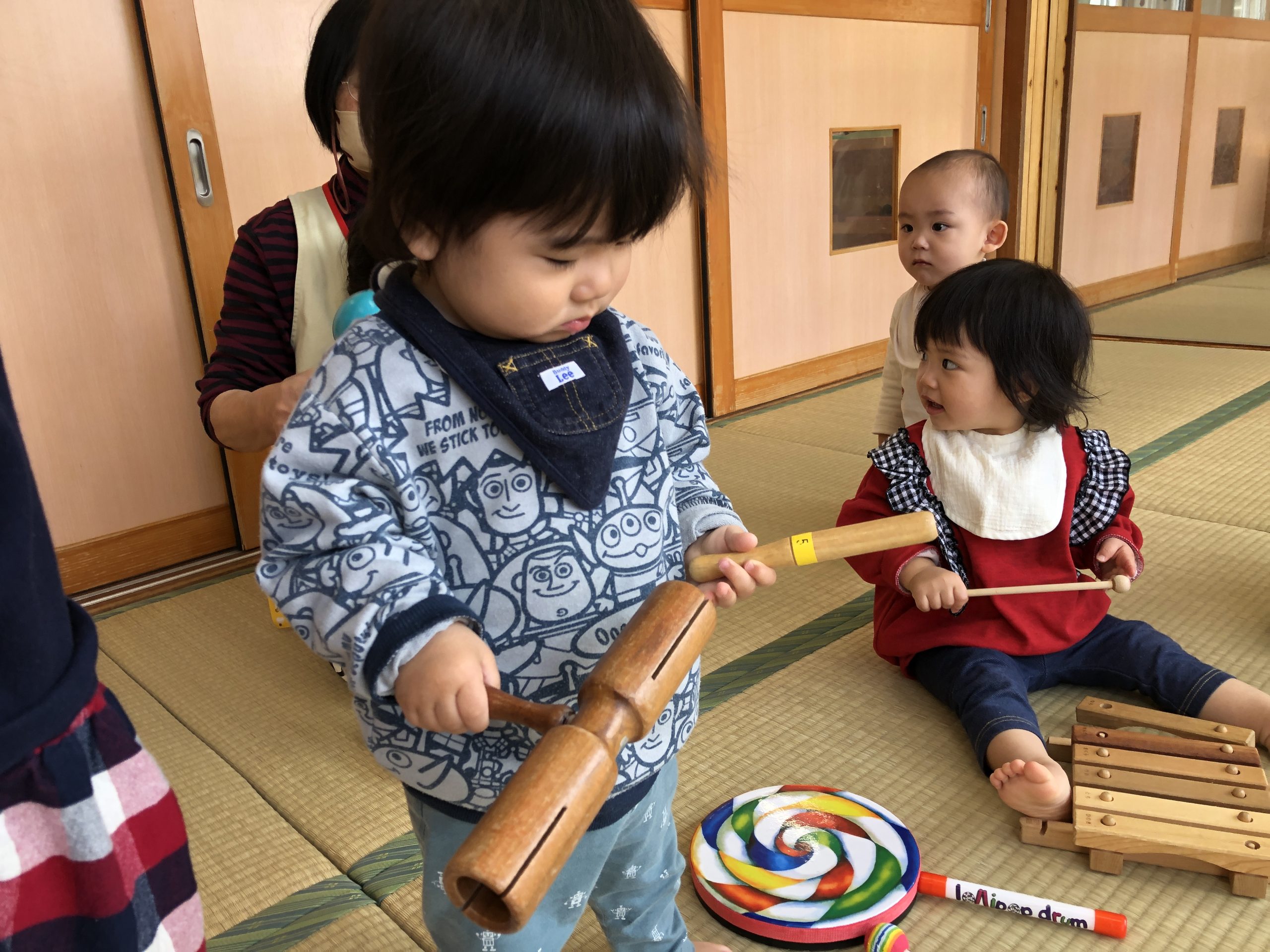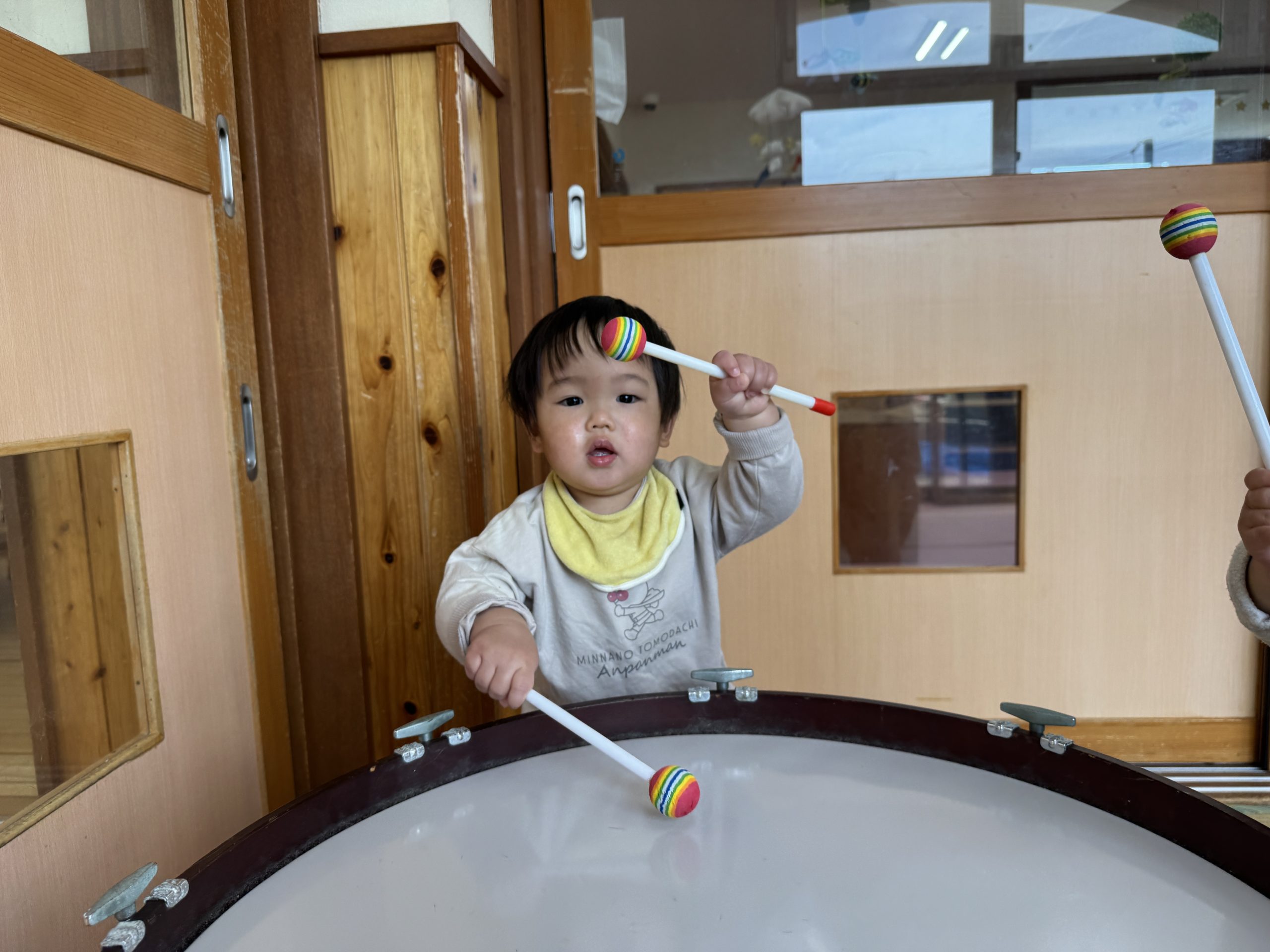 今日は、楽器あそびをしました!大太鼓や手持ち太鼓、ウッドブロック、木琴などいろいろな楽器に触れて音を鳴らして楽しむことができました😆