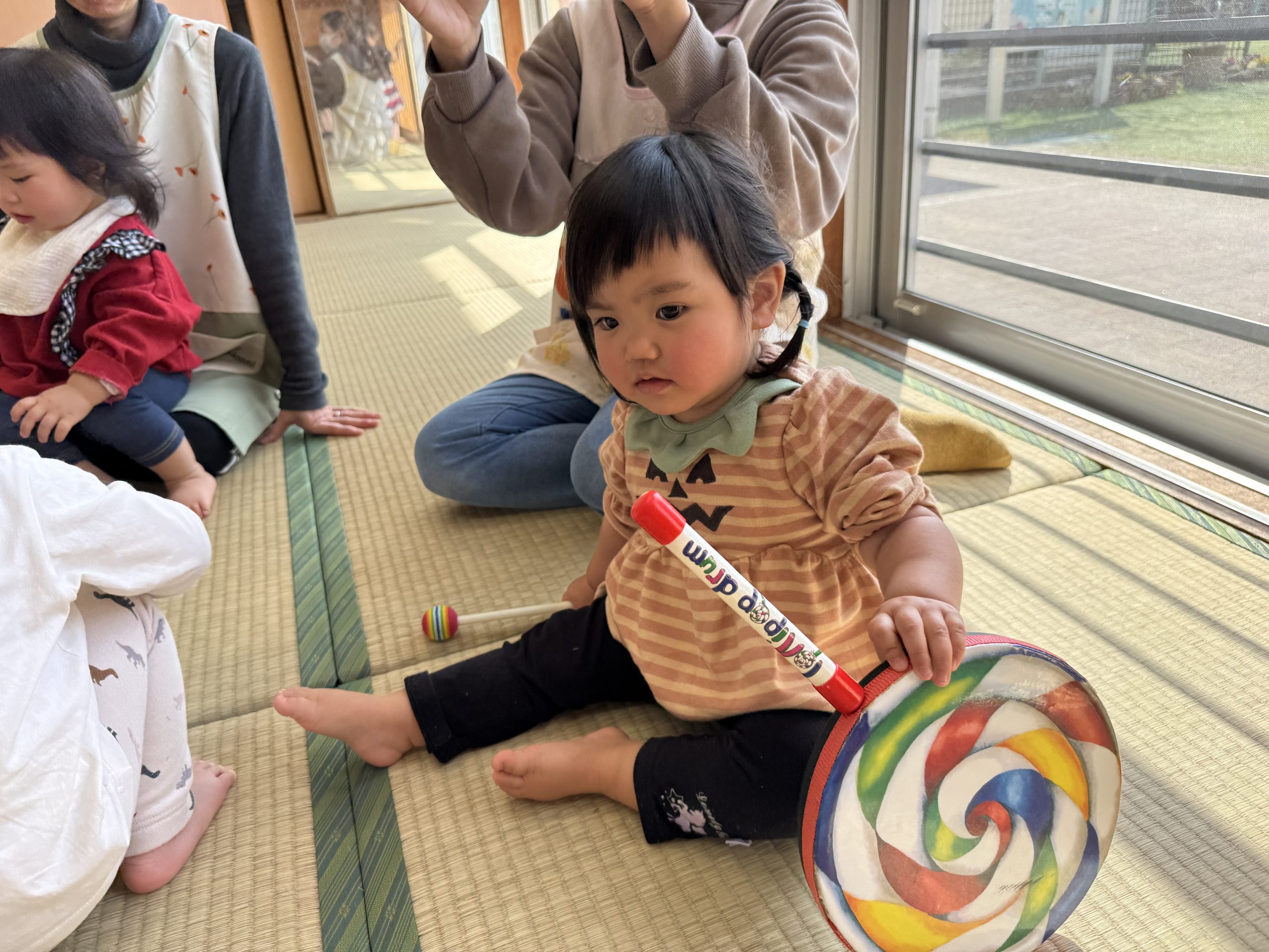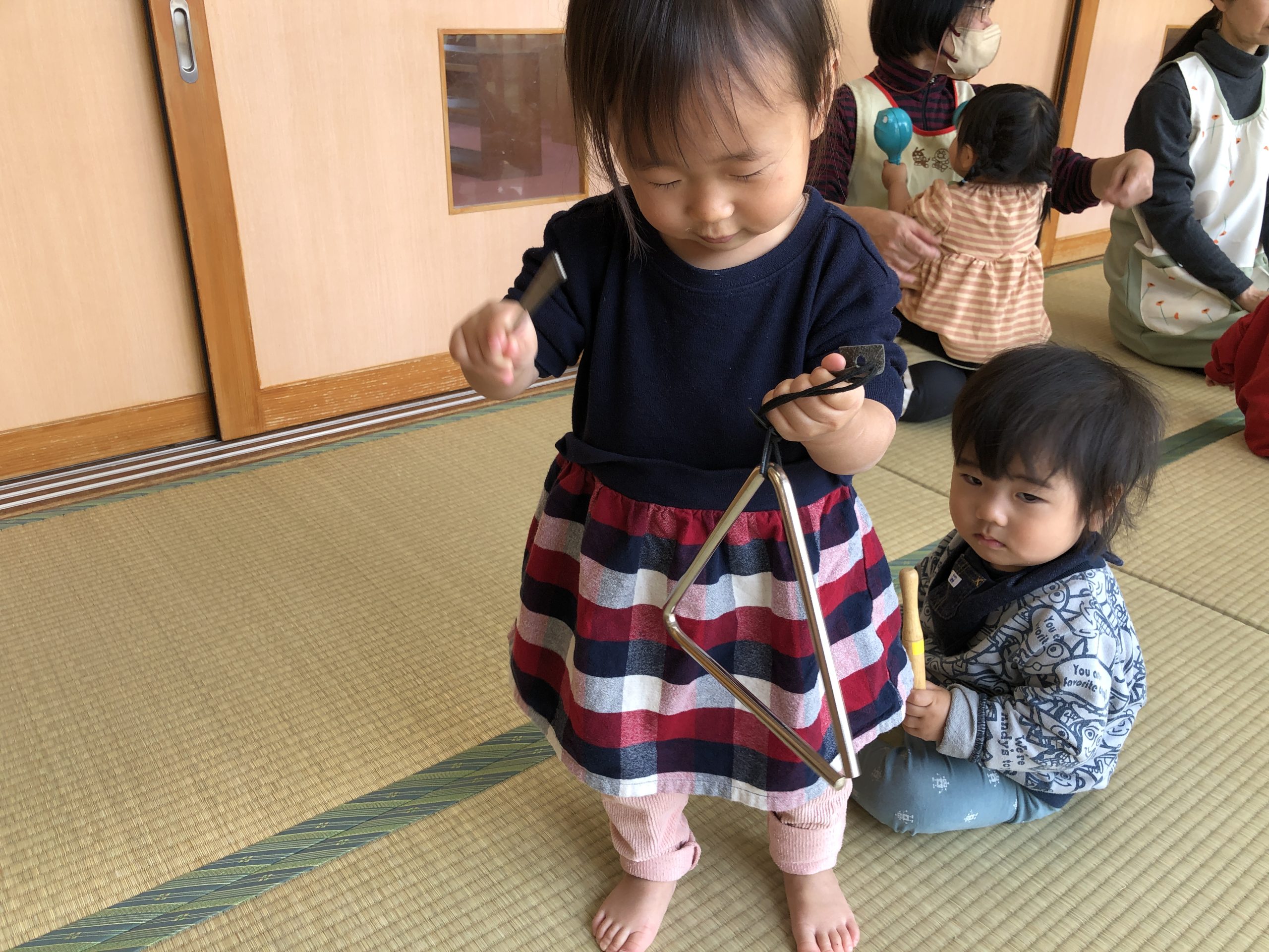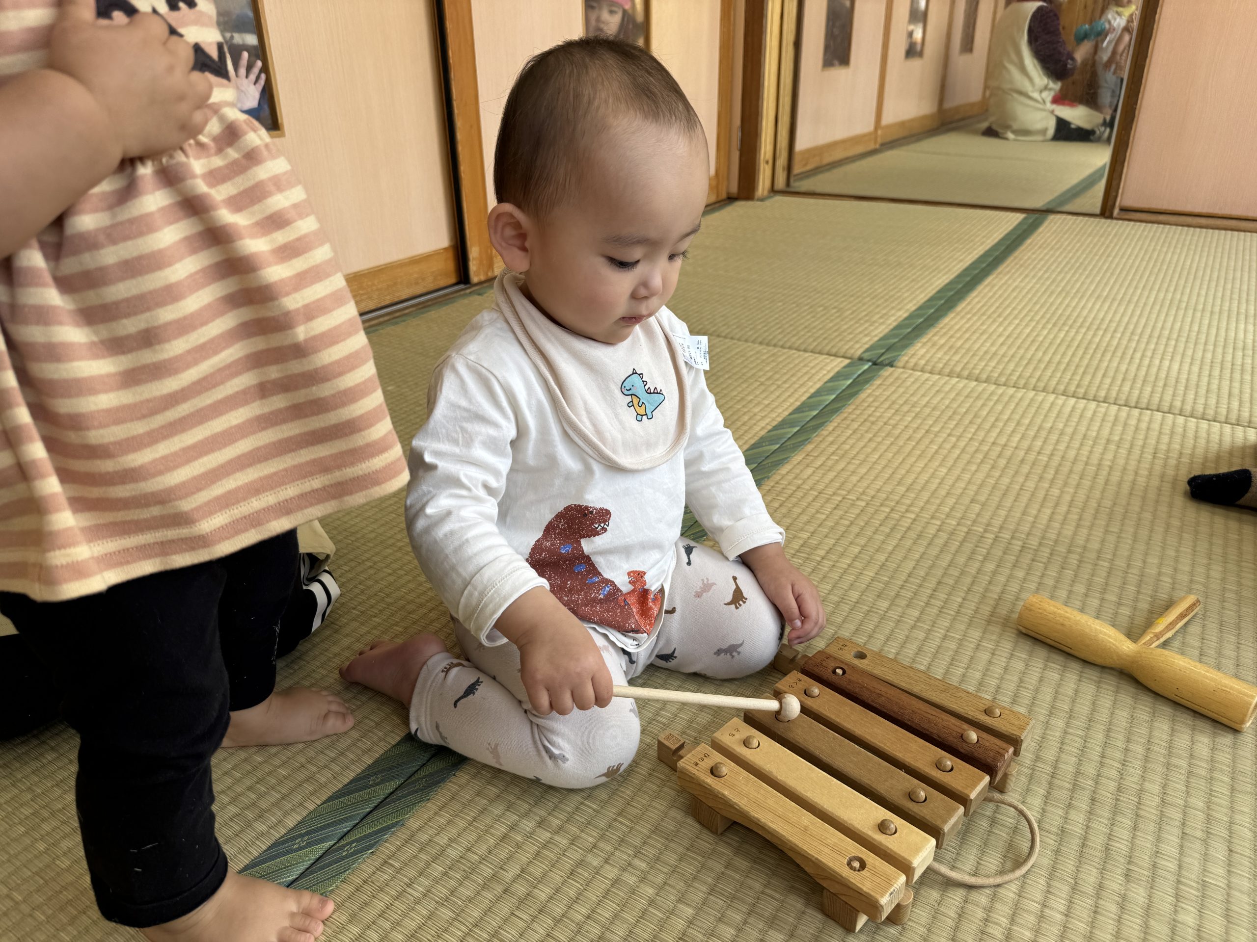 今日は、楽器あそびをしました!大太鼓や手持ち太鼓、ウッドブロック、木琴などいろいろな楽器に触れて音を鳴らして楽しむことができました😆