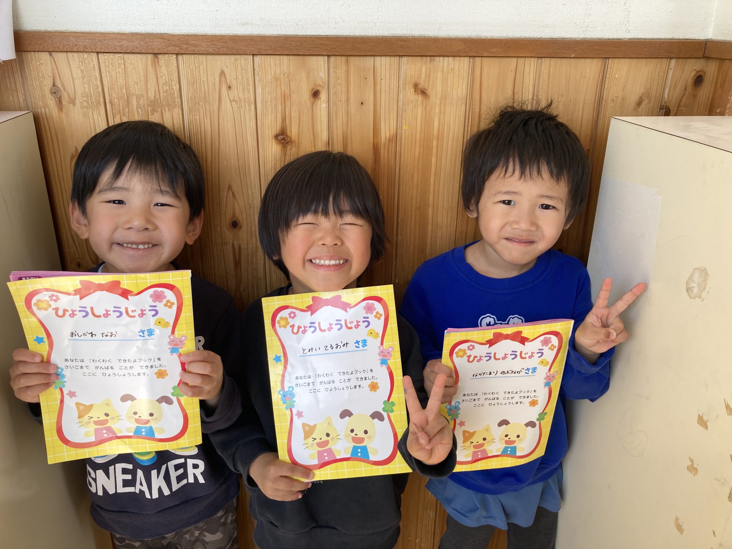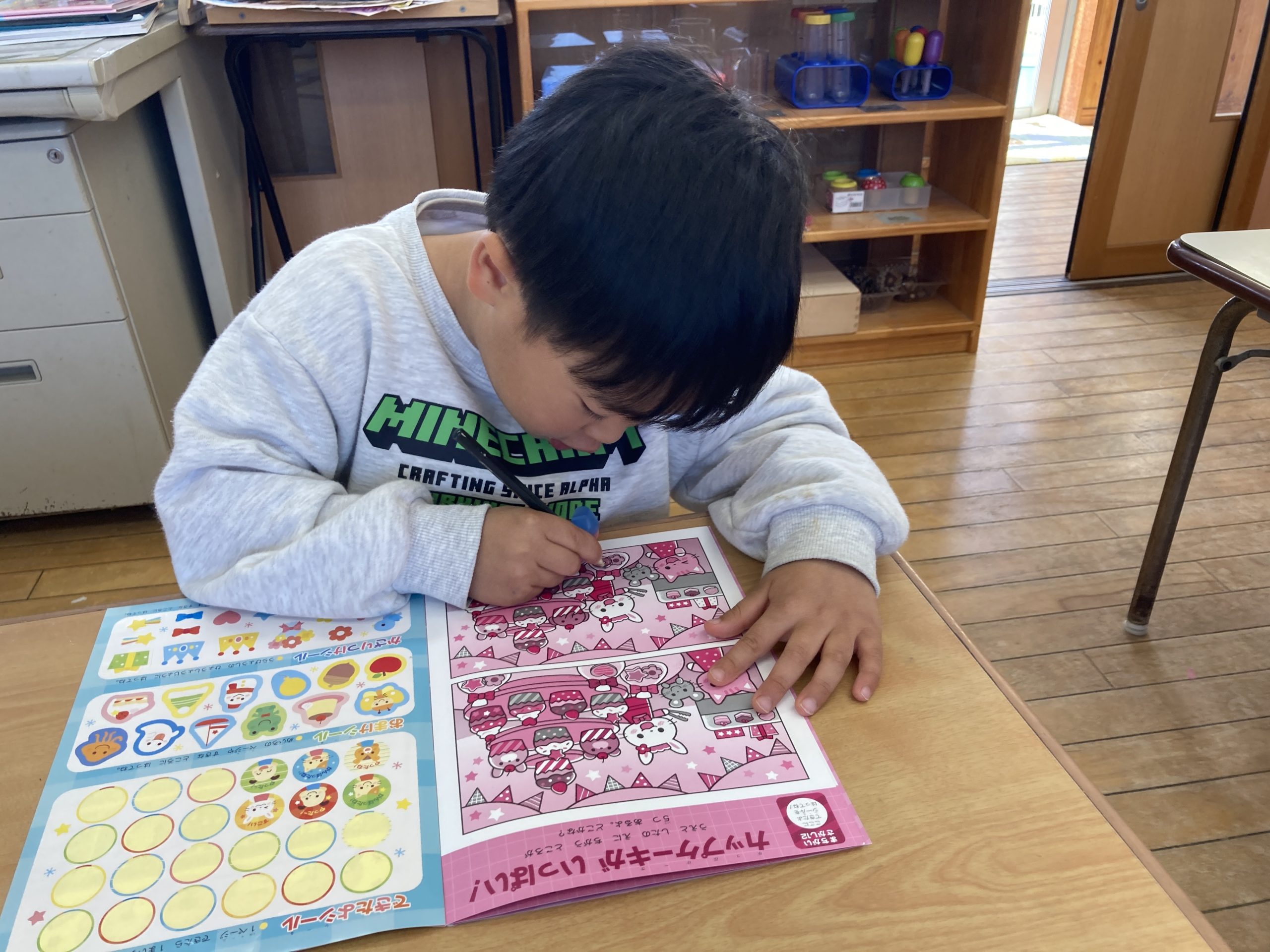 今日は迷路と間違え探しをしました。今日で最後の12枚目が終わり最後に表彰状を渡しました⭐️4月の頃に比べると迷路のスピードがあがったり1人で間違えを探せるようになったりといつも楽しんで取り組んでいました🍀また、3月の月刊絵本についていたメダルもつくりましたよ🏅