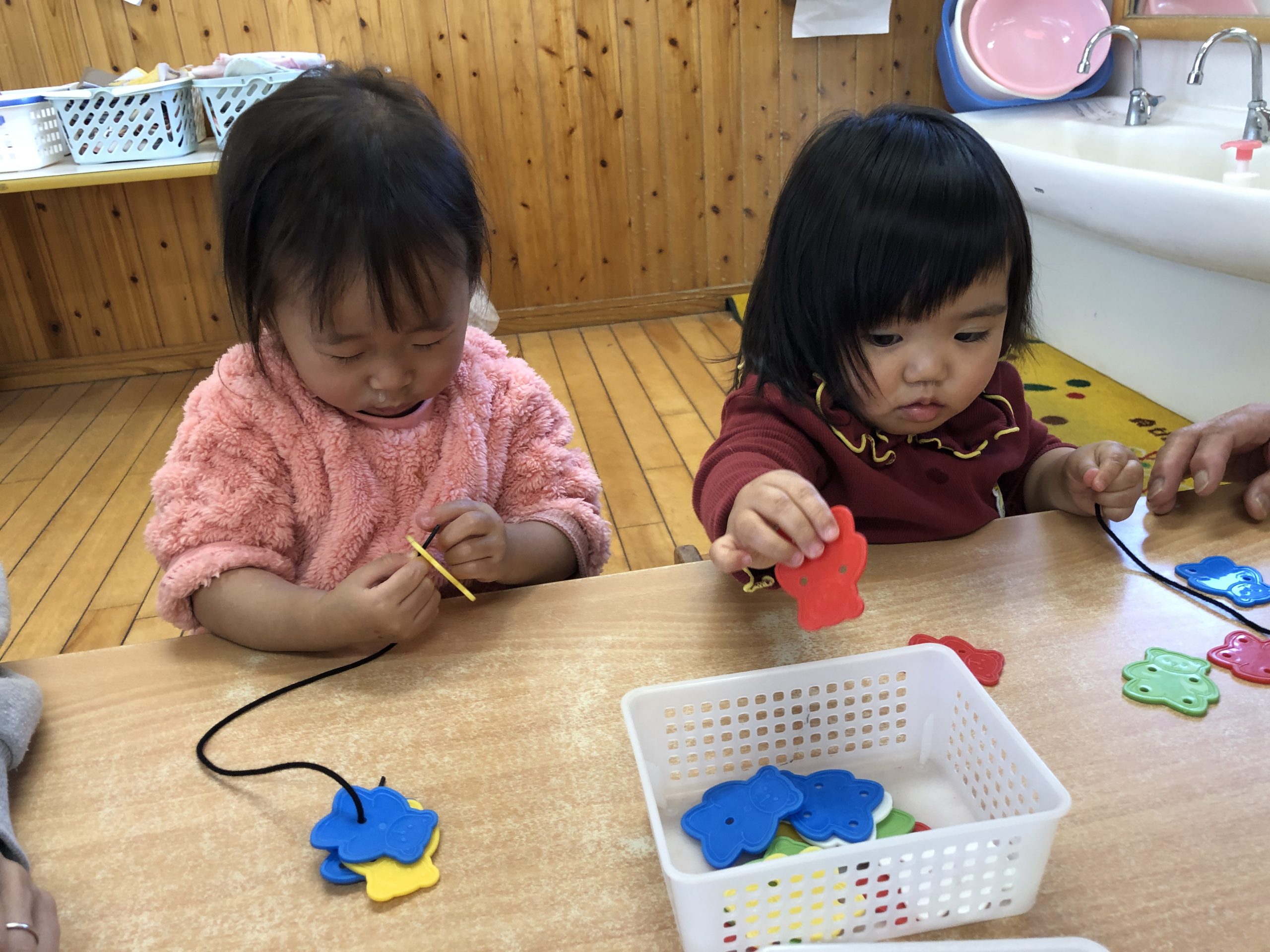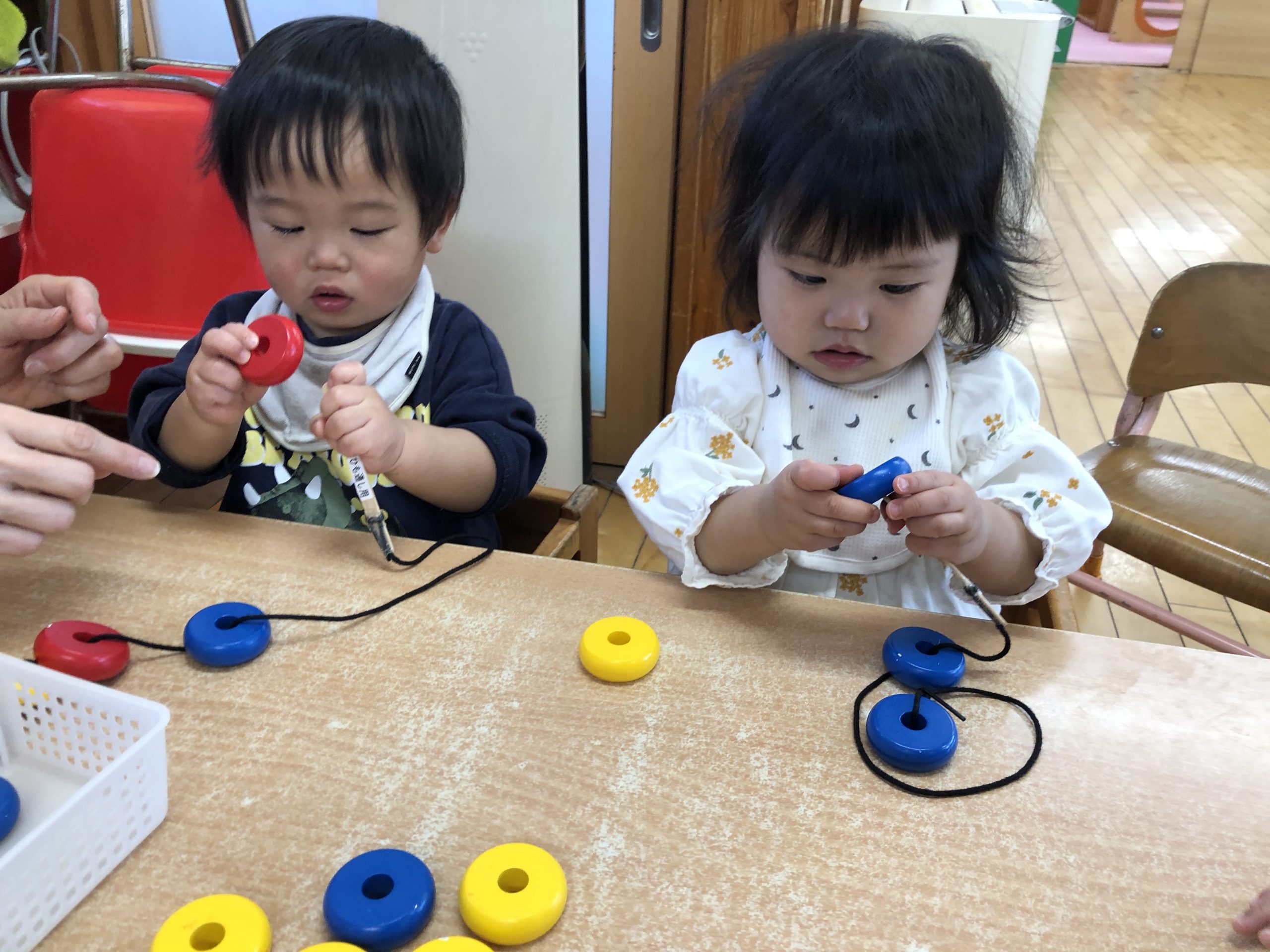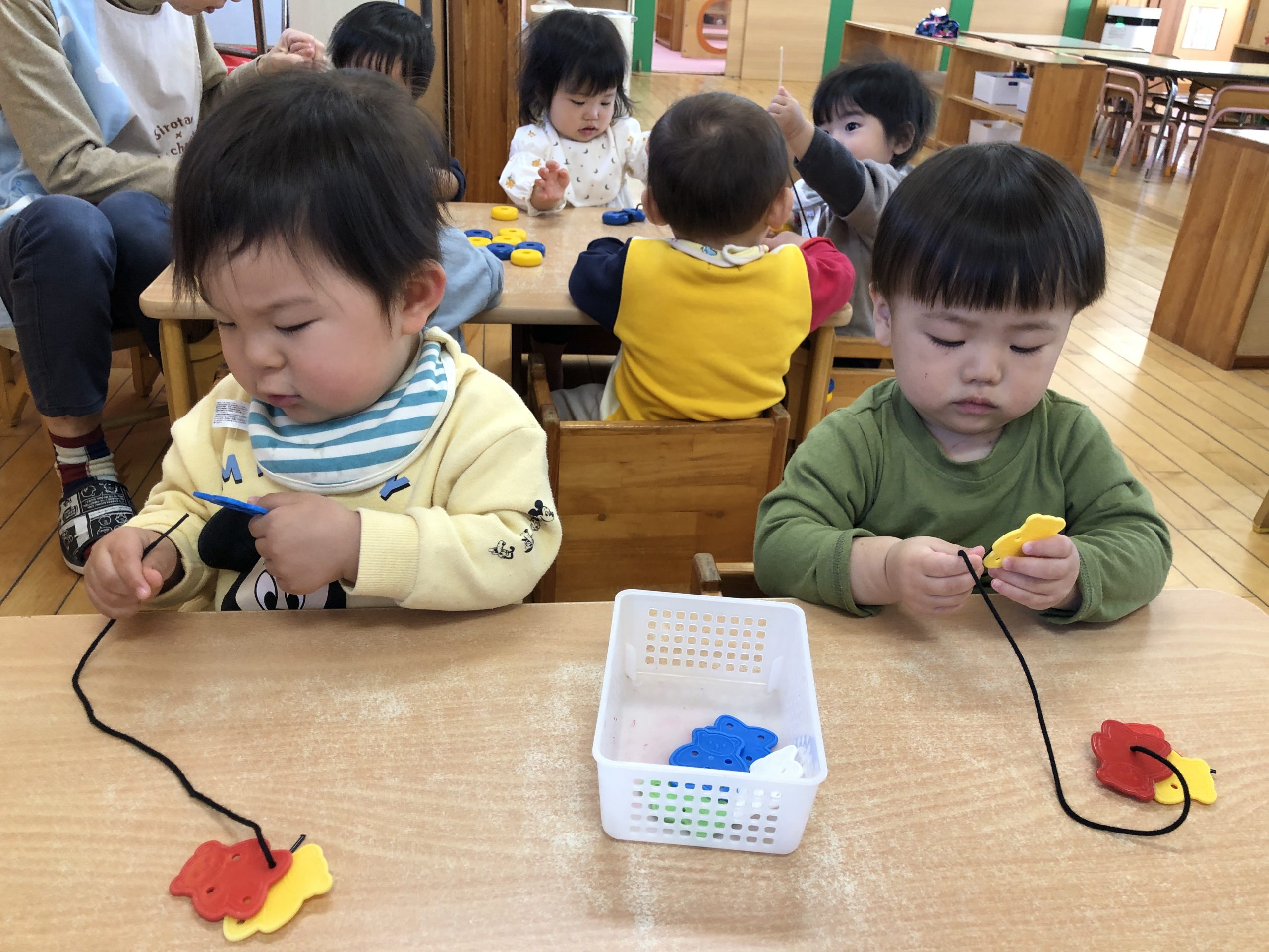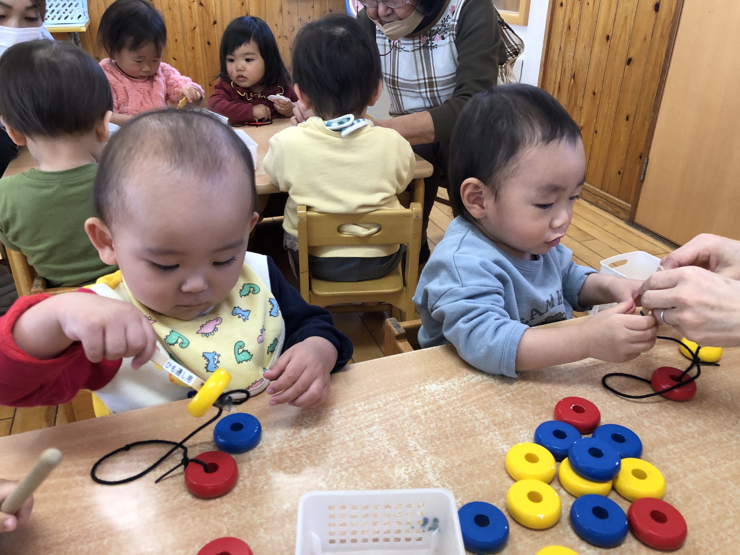 今日は、棒・紐通しあそびをしました。手を添えて棒に通すことを知らせたり、紐まで通すことを知らせていきました⭐︎あそび方が分かってきて上手に通していましたよ♫