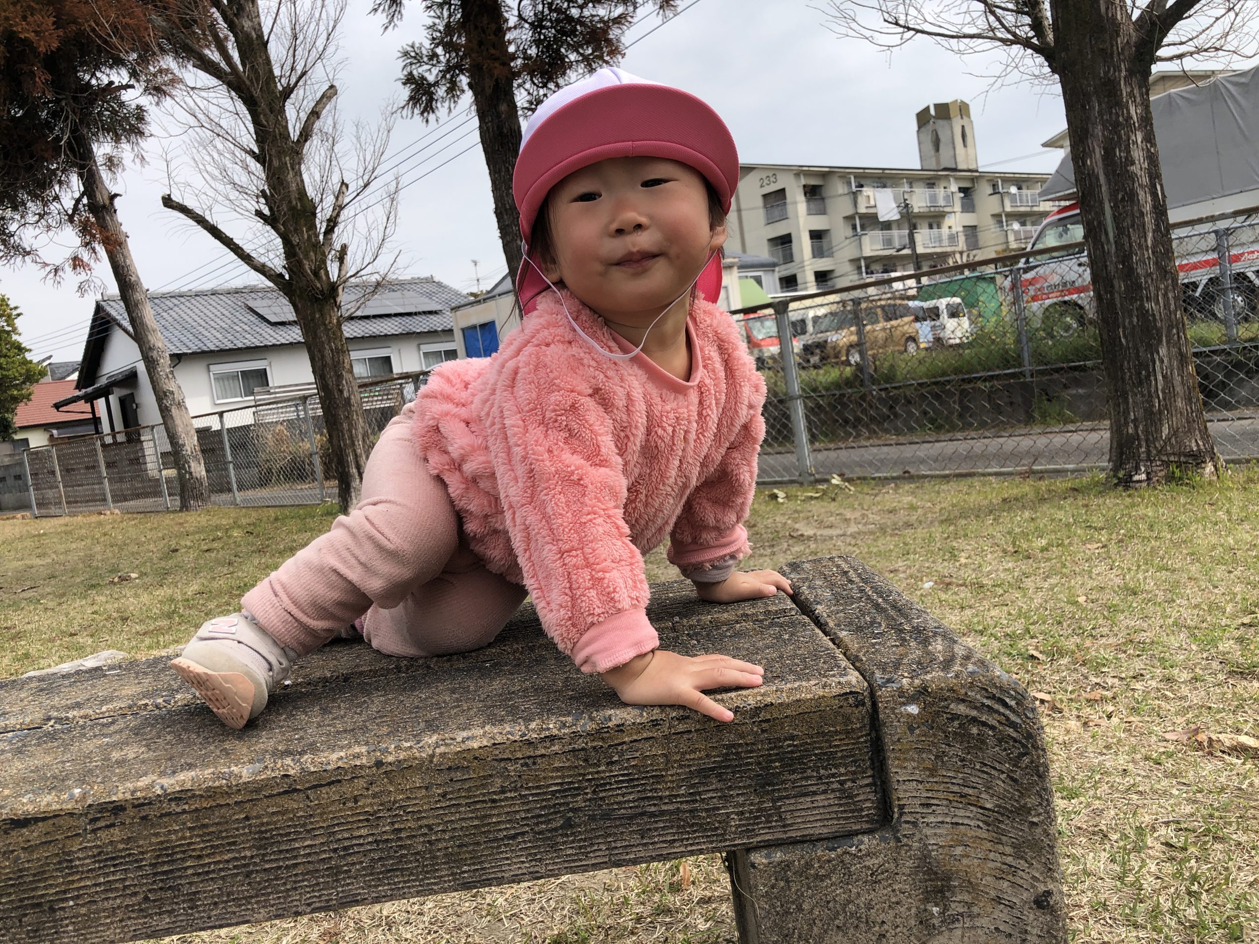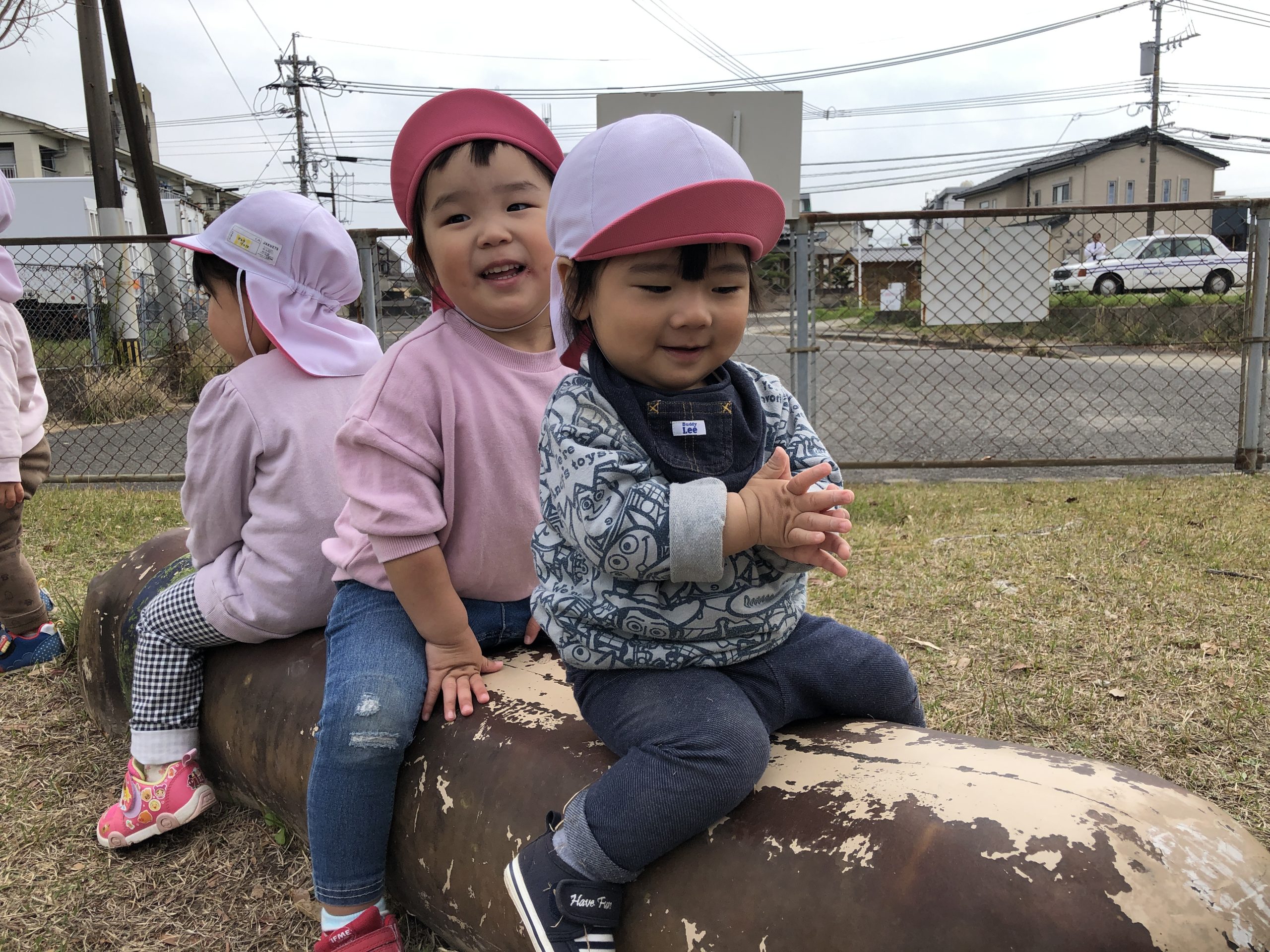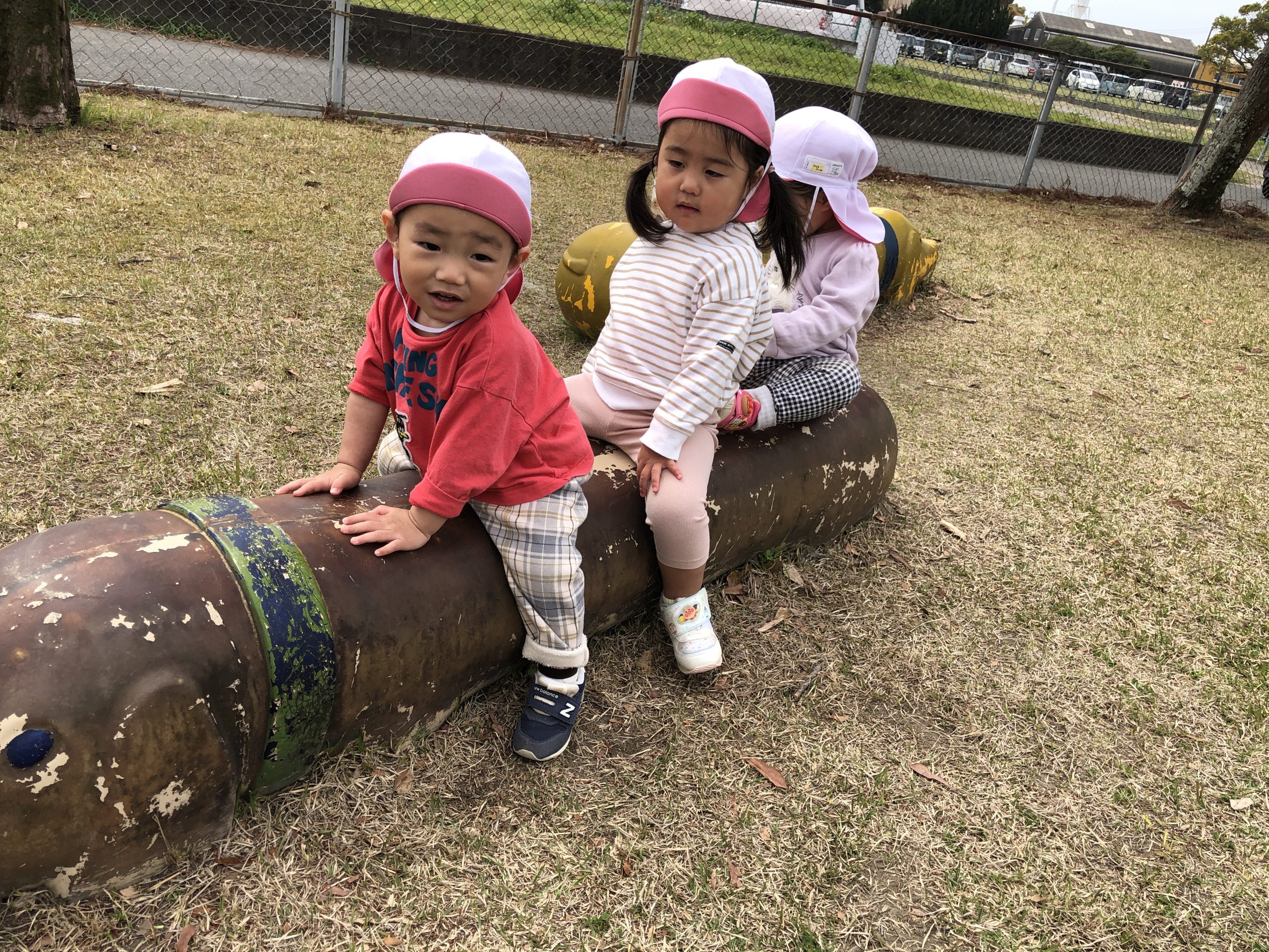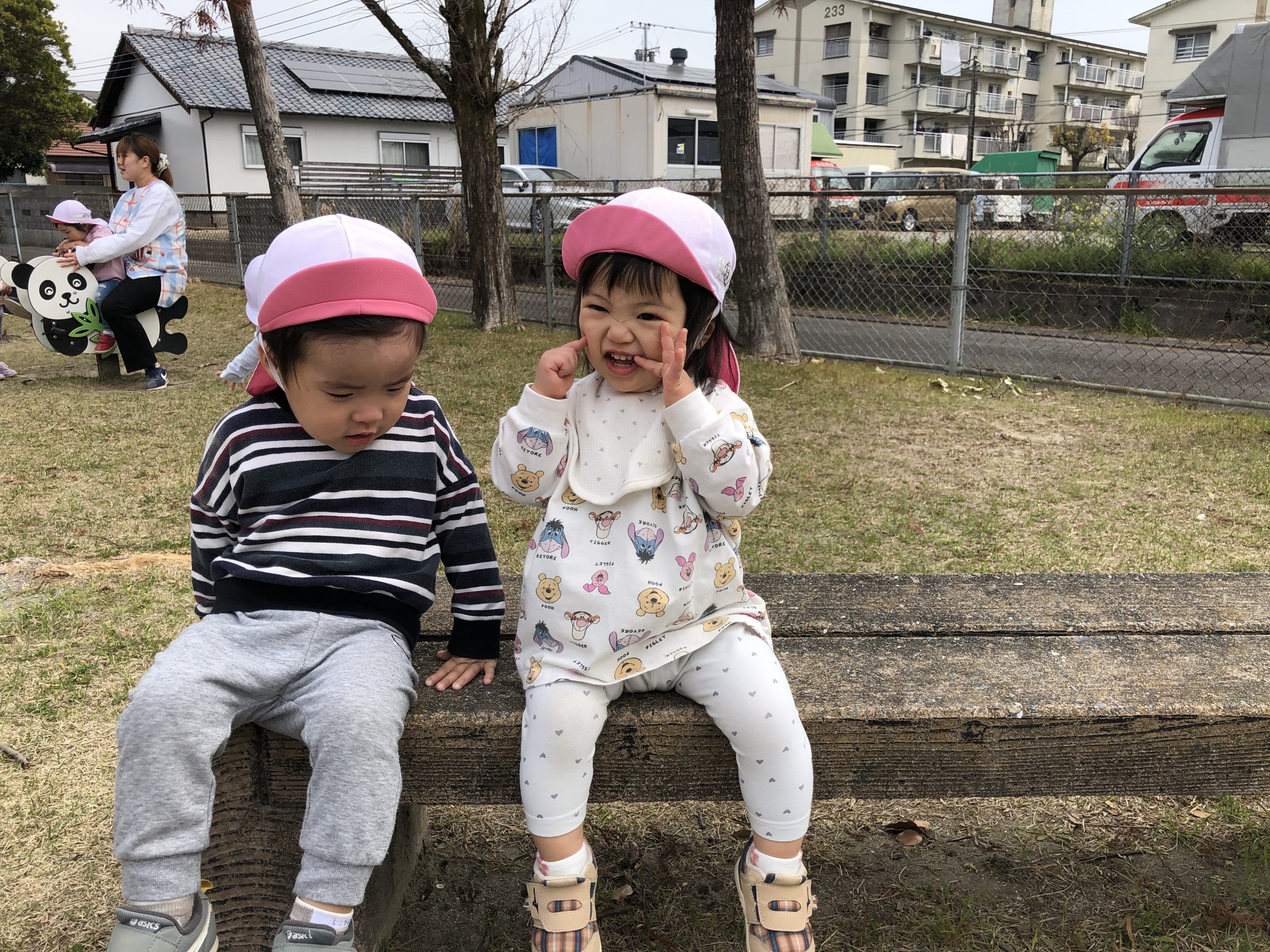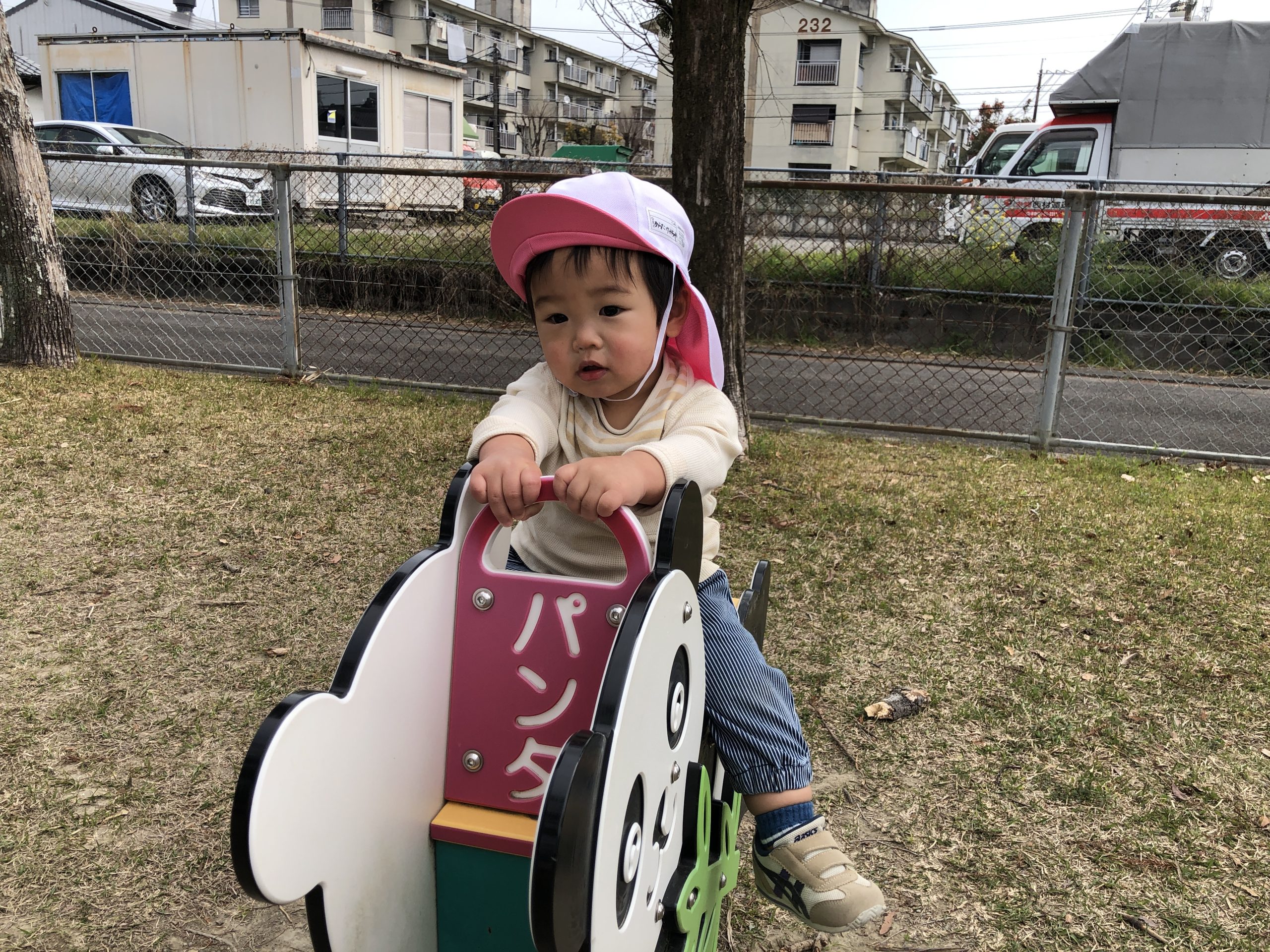 今日は、近隣公園へお散歩にお散歩カーや歩いて行きました♪広場では、たくさん歩いたり、芝生や砂をさわったり、犬のベンチやパンダの遊具に座ったりとたくさん探索して楽しく過ごしていましたよ⭐︎