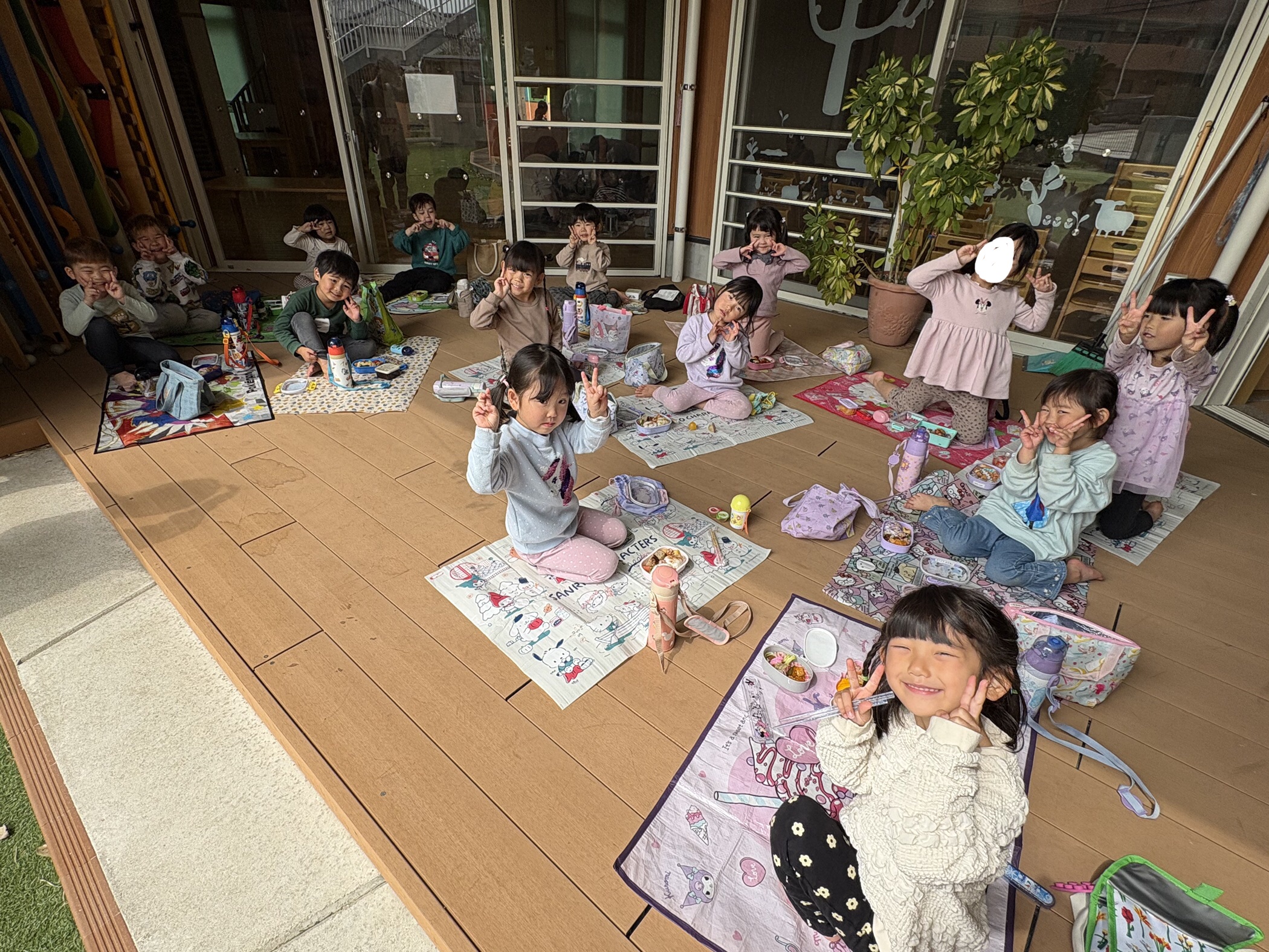 今年度最後のお弁当の日🍱今日は、うさぎ組さんと一緒に手を繋いでお散歩に行きました☀️しっぽ取りゲームやジャングルジムなどで体を動かして遊んだ後は…待ちに待ったお弁当の時間🎶今回は、みんなのリクエストで新園舎のテラスでお弁当を食べました!!いつもと違う場所だったのでより楽しく美味しく食べていましたよ😋✨
