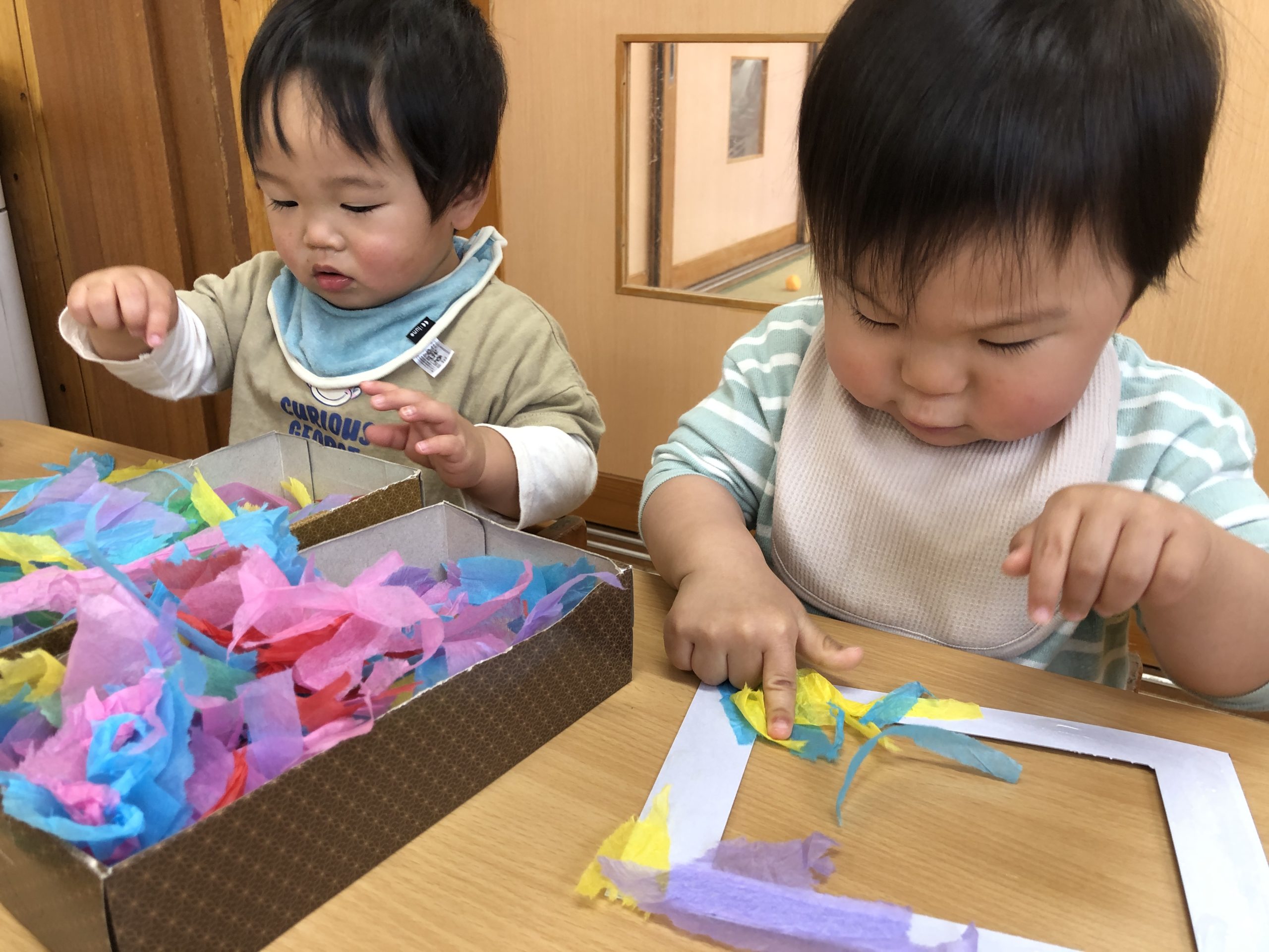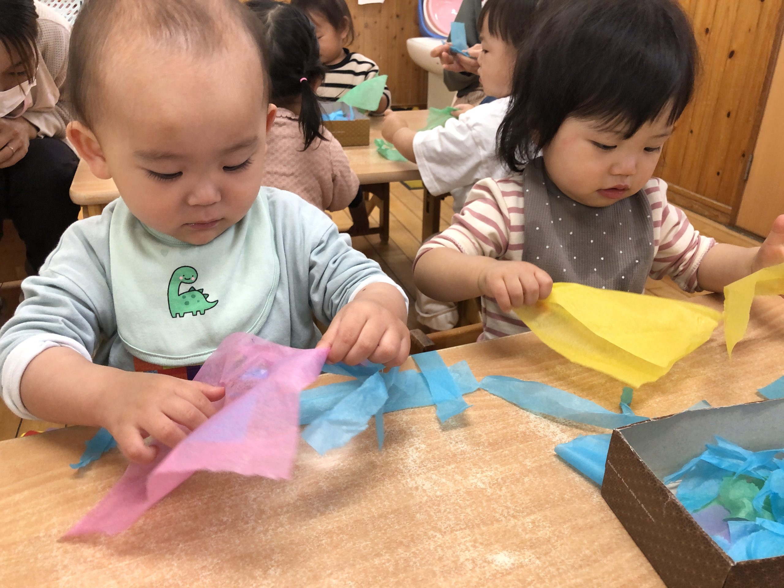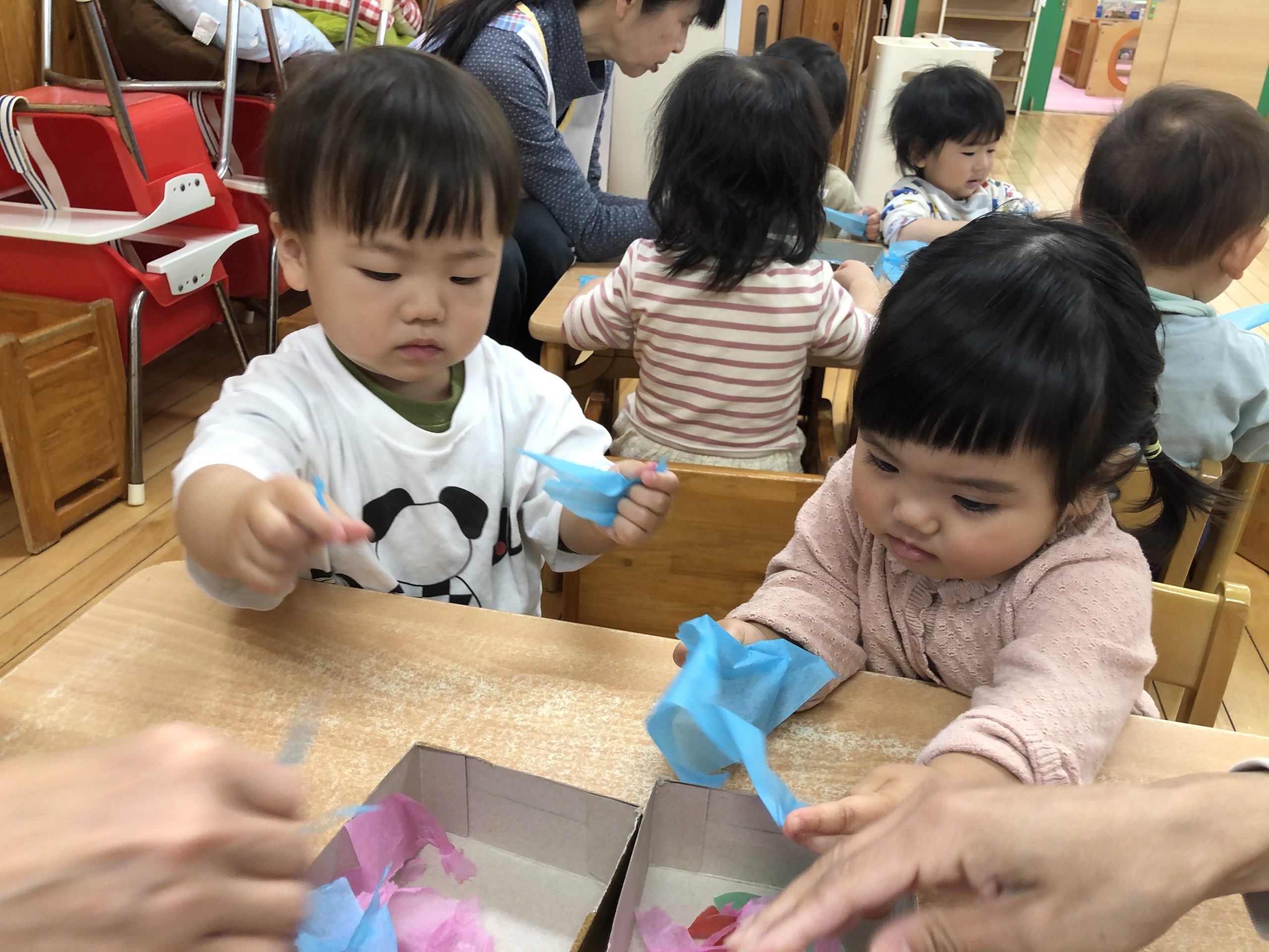 今日は、きりんぐみさんへの卒園プレゼント製作をしました。花紙をたくさん手でちぎったあと、糊を付けた型紙に貼り付けましたよ✨