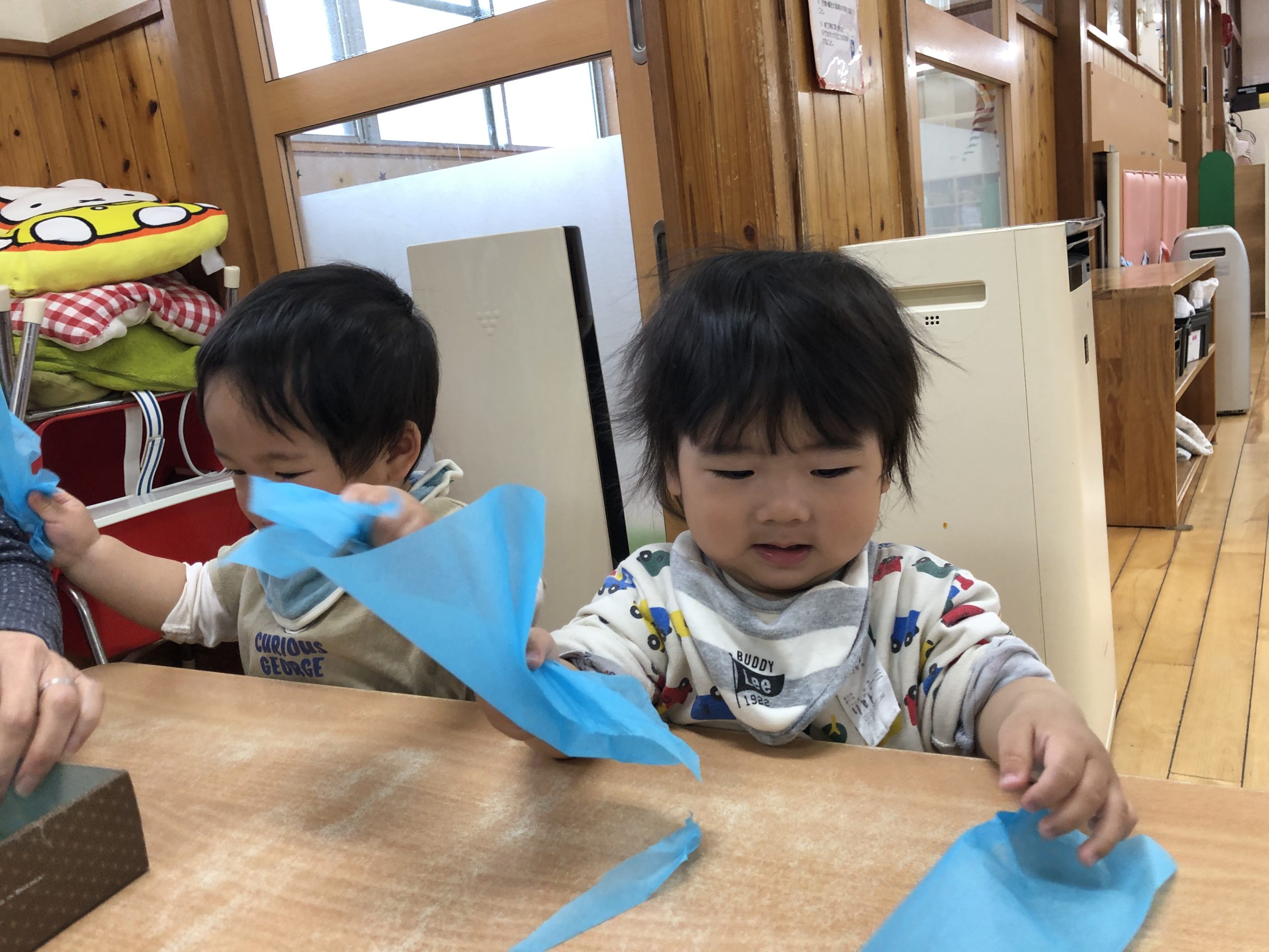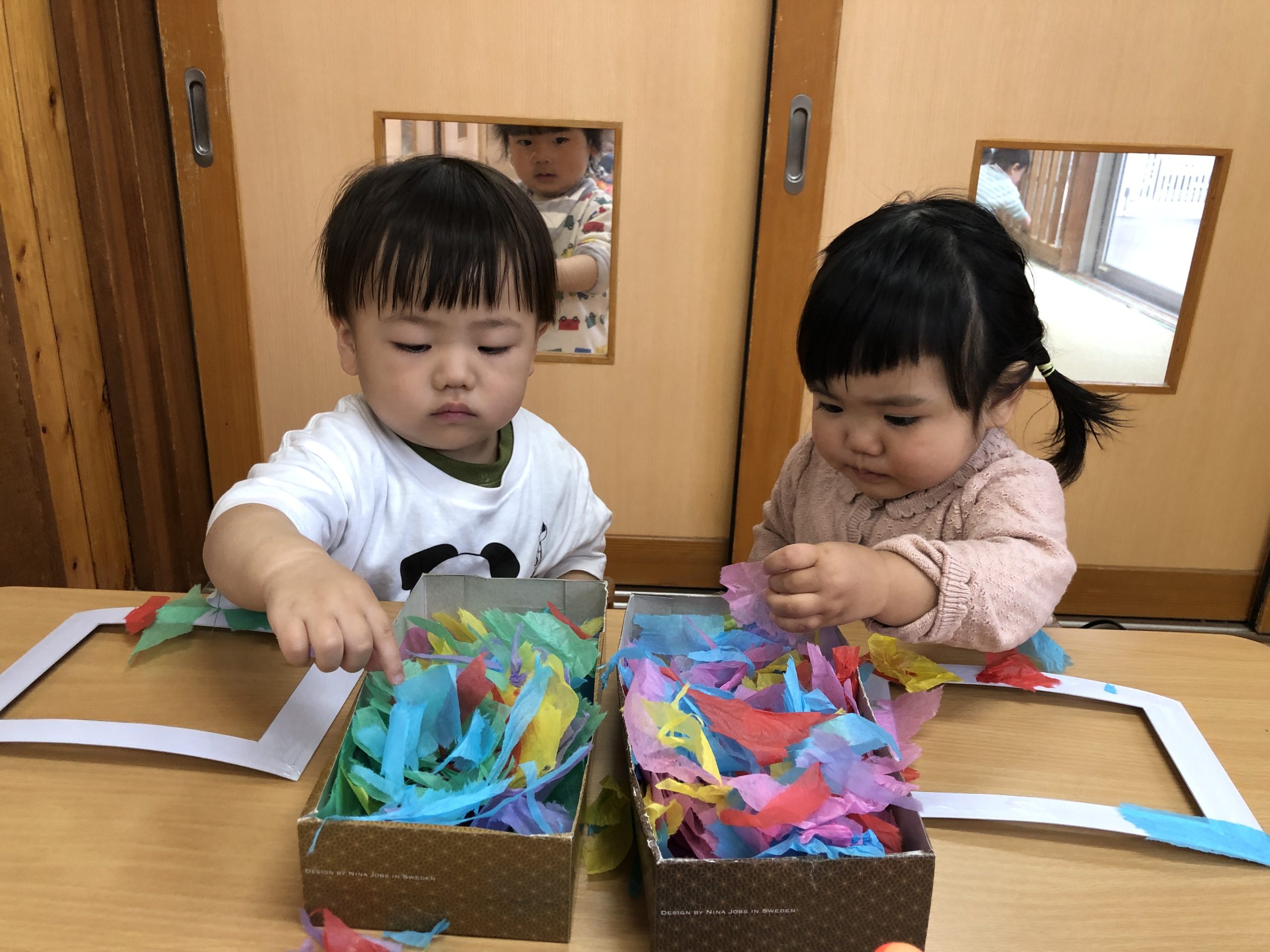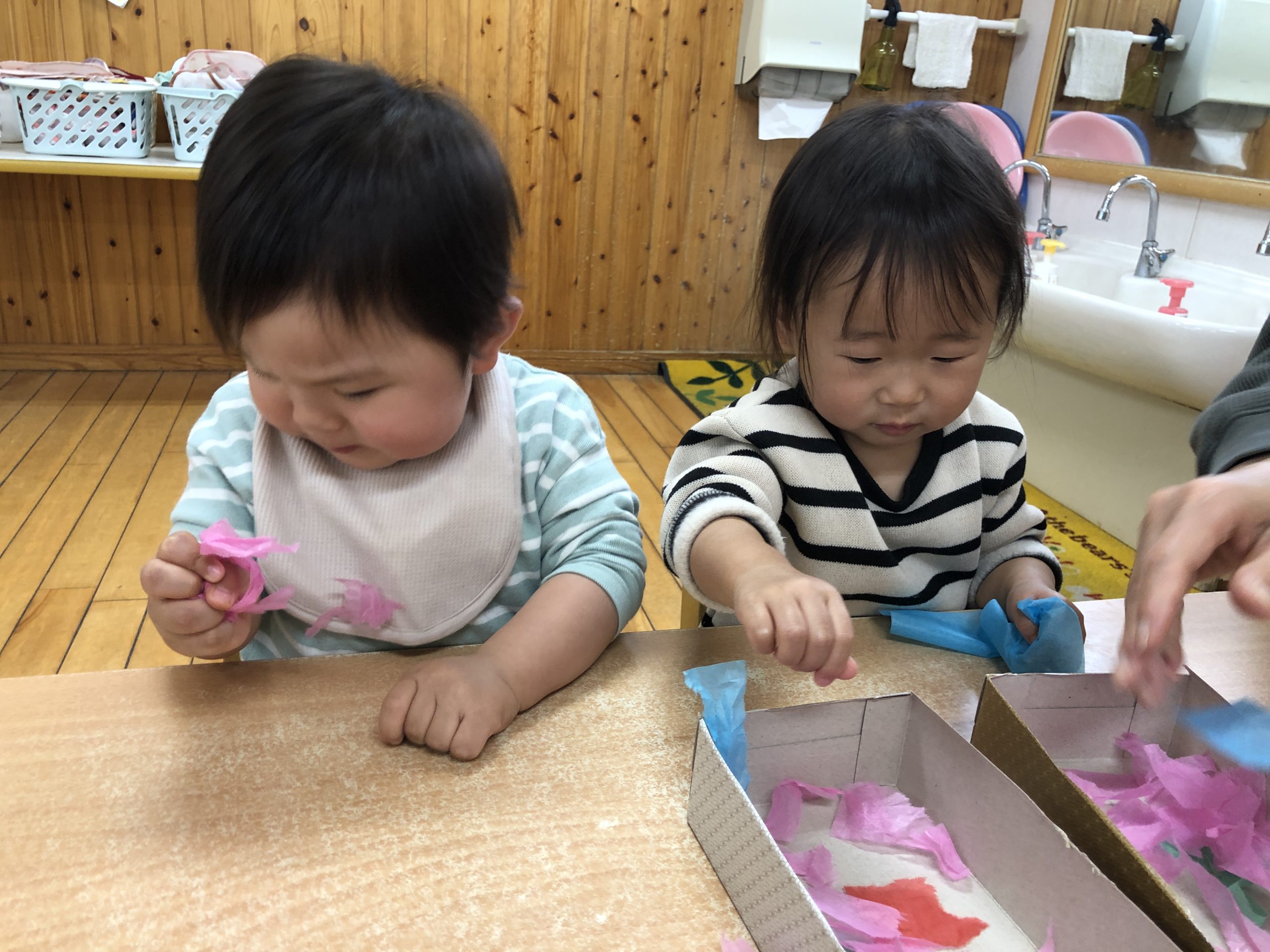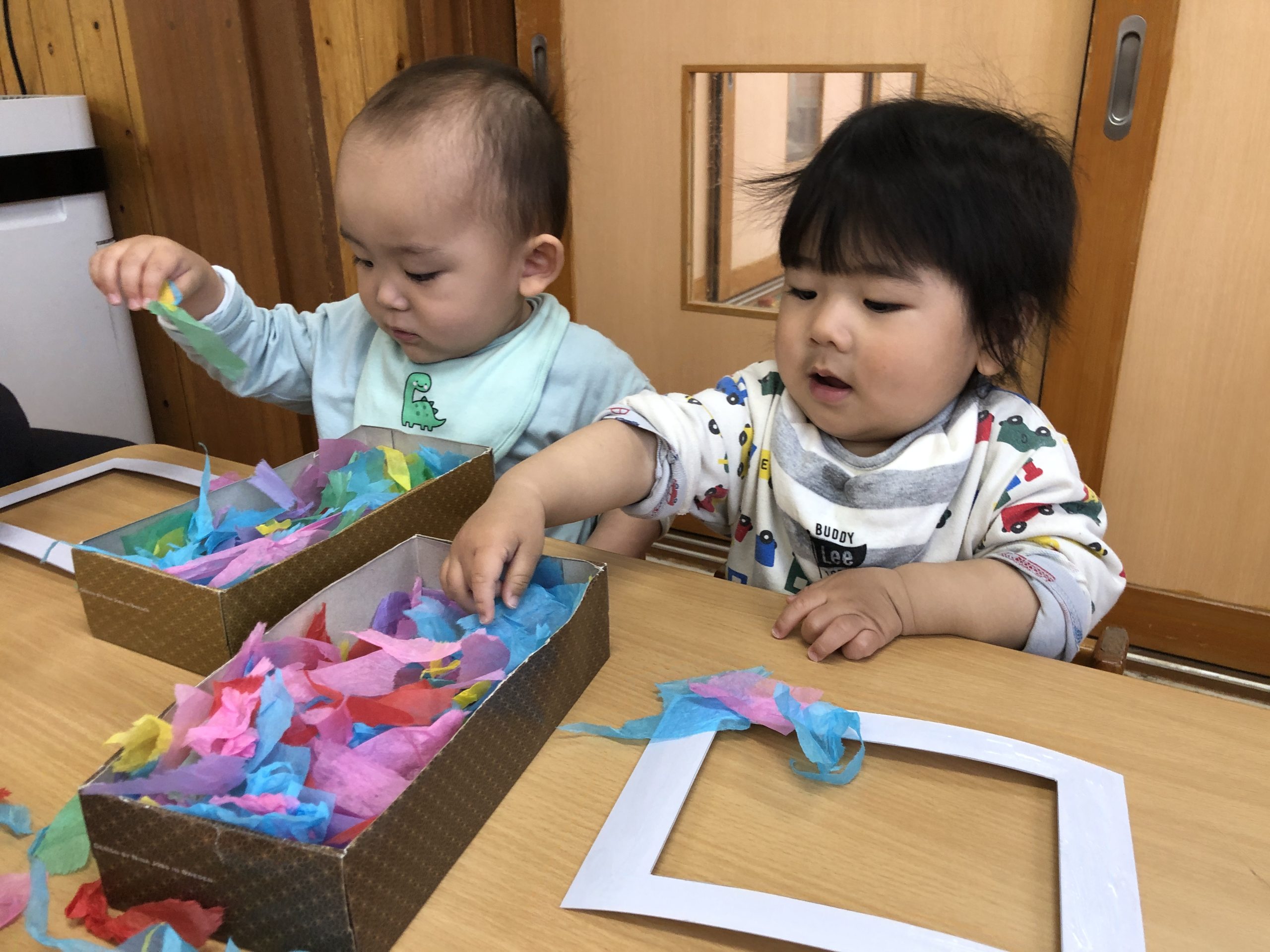 今日は、きりんぐみさんへの卒園プレゼント製作をしました。花紙をたくさん手でちぎったあと、糊を付けた型紙に貼り付けましたよ✨