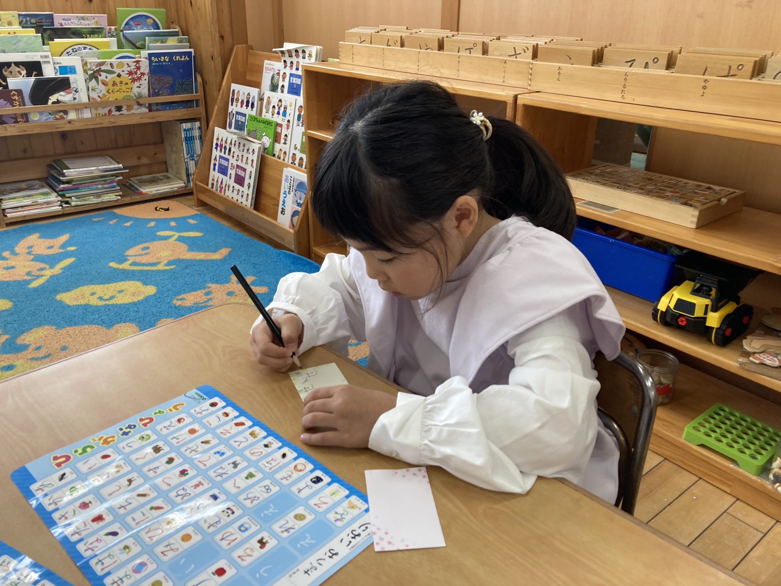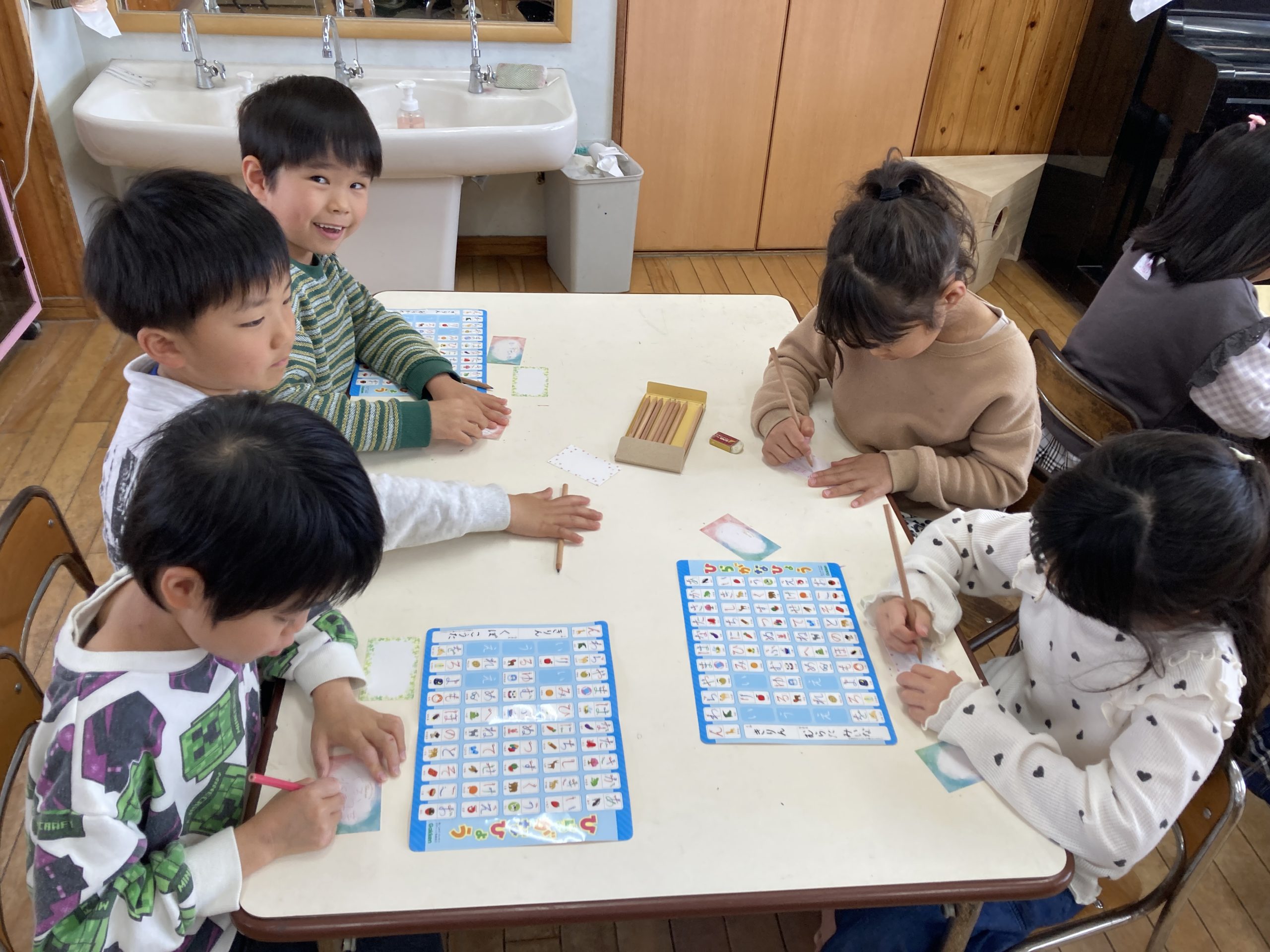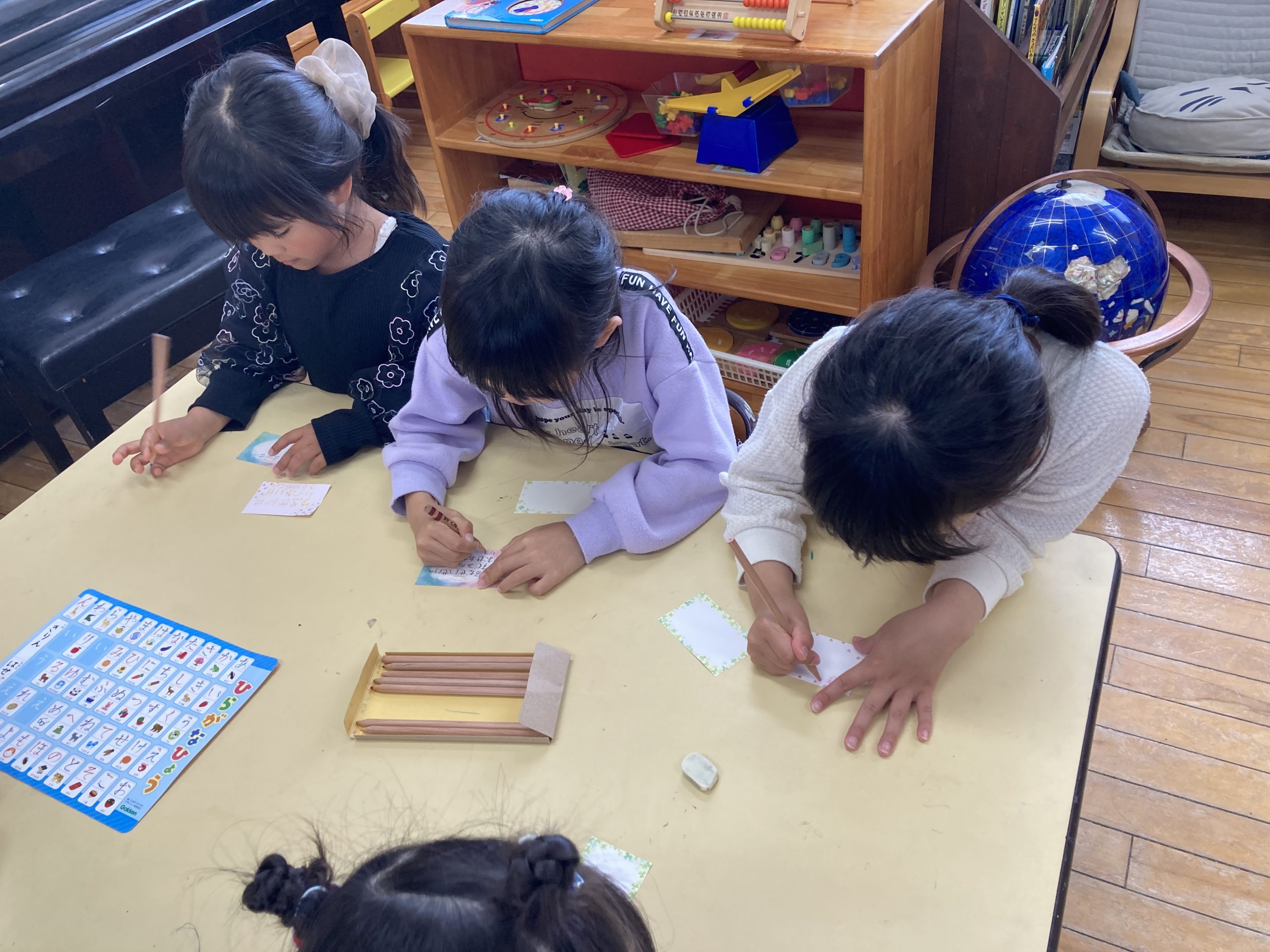 今日は、お別れ会で渡すプレゼントにつける手紙を書きました。感謝の気持ちをひらがな表を見ながら一生懸命書いていました。お別れ会で渡すのが楽しみです😊