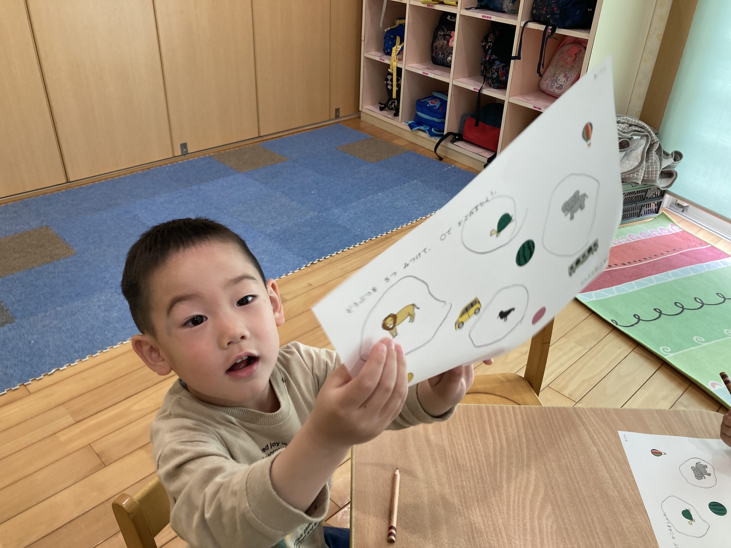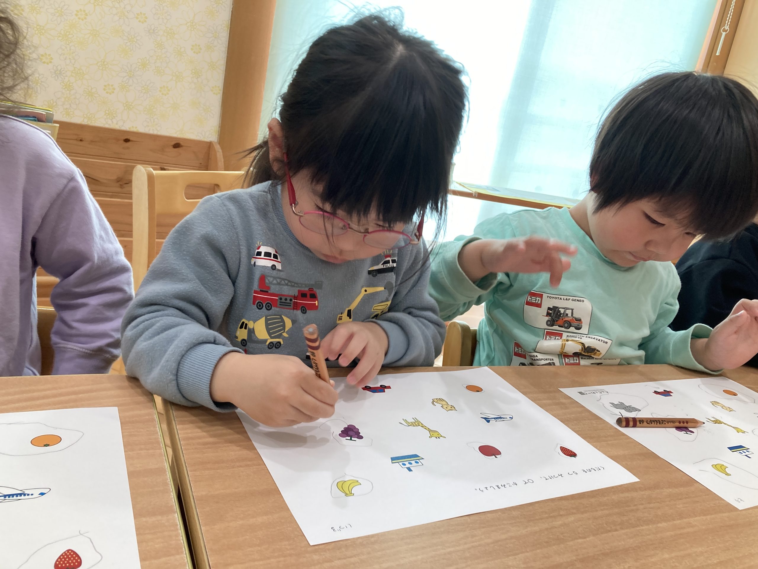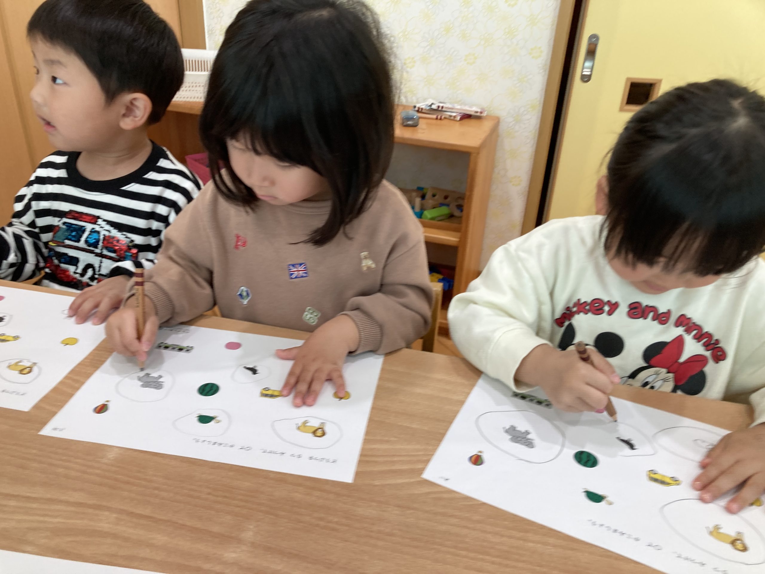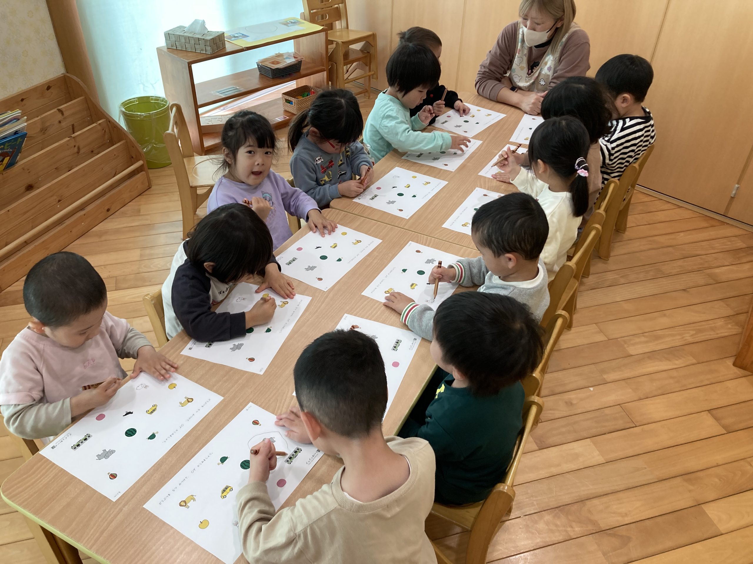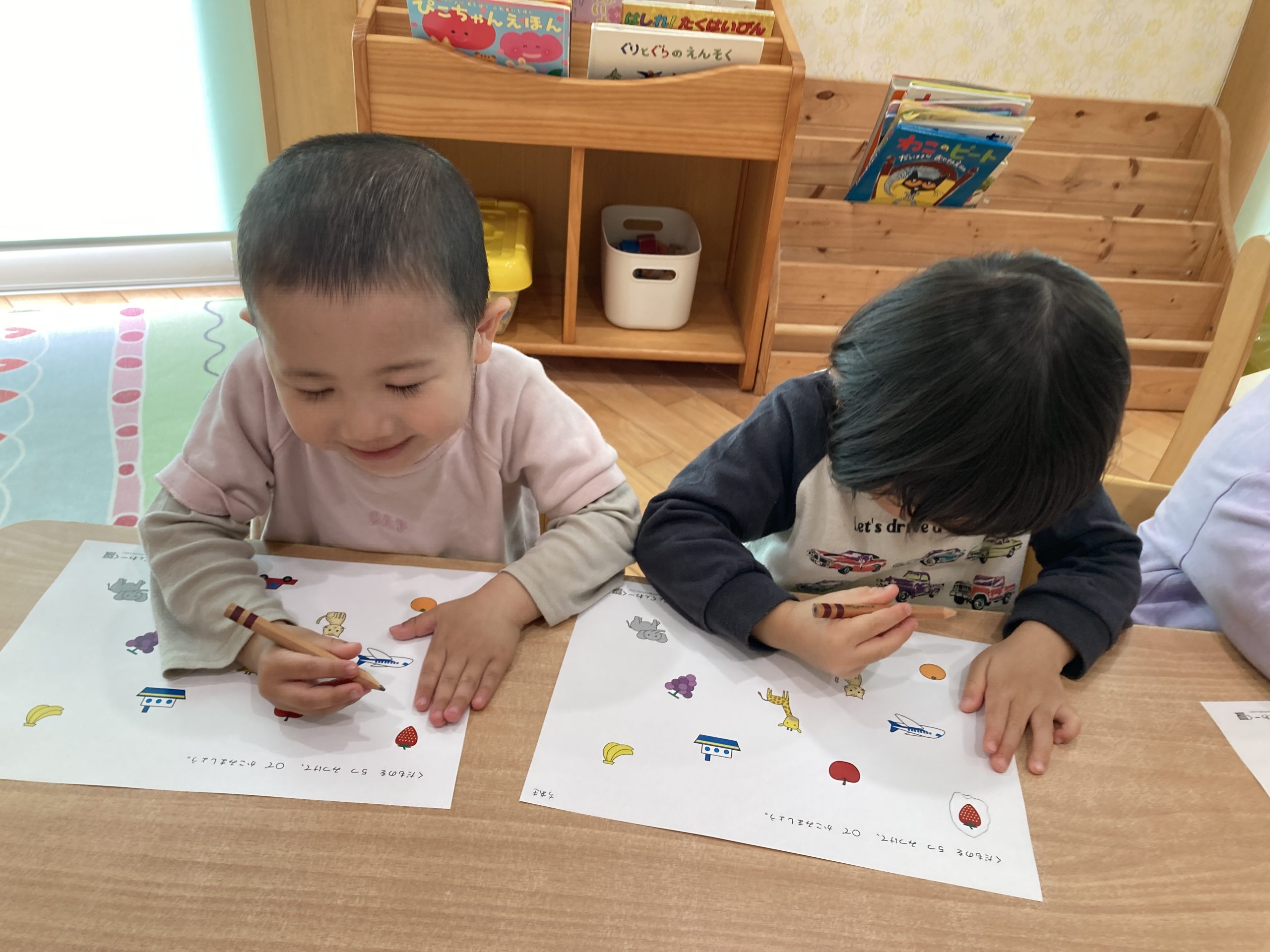 今日は、仲間探しをしました!イラストの中なら果物や動物を探して◯を付ける遊びをしました。みんなきちんと理解できていて、正しく◯を付けることができていましたよ🍎✨
