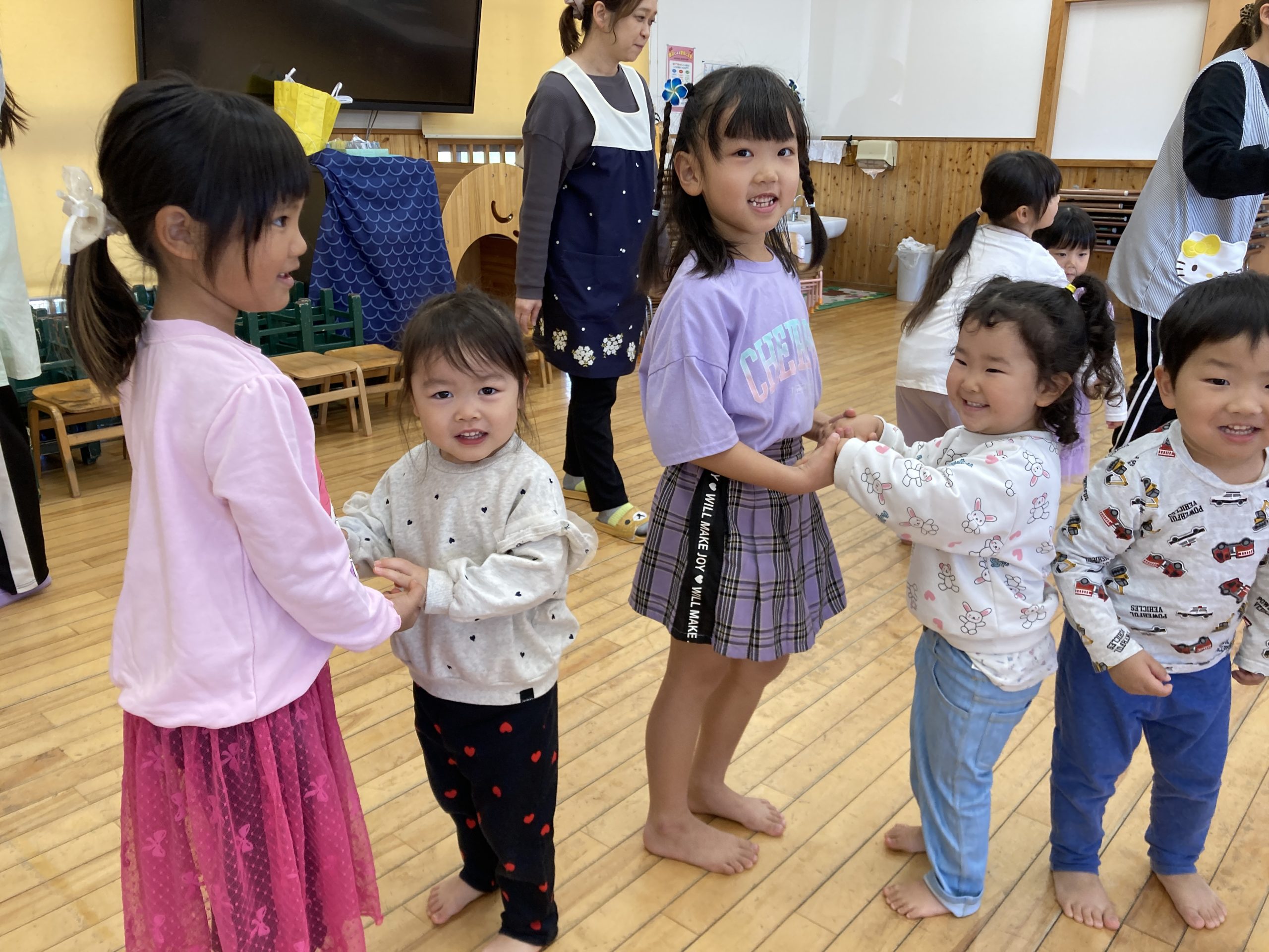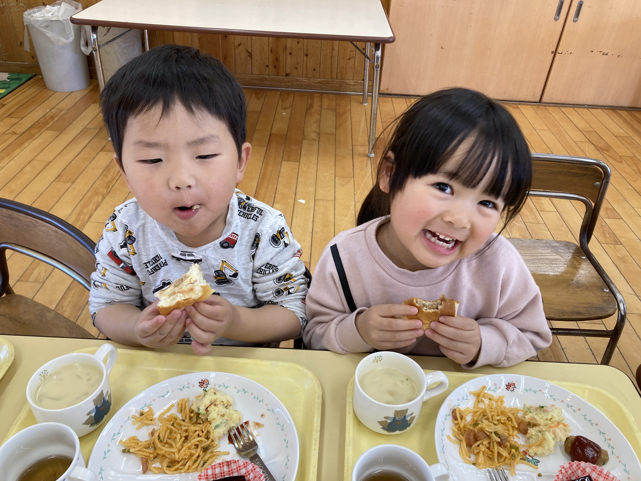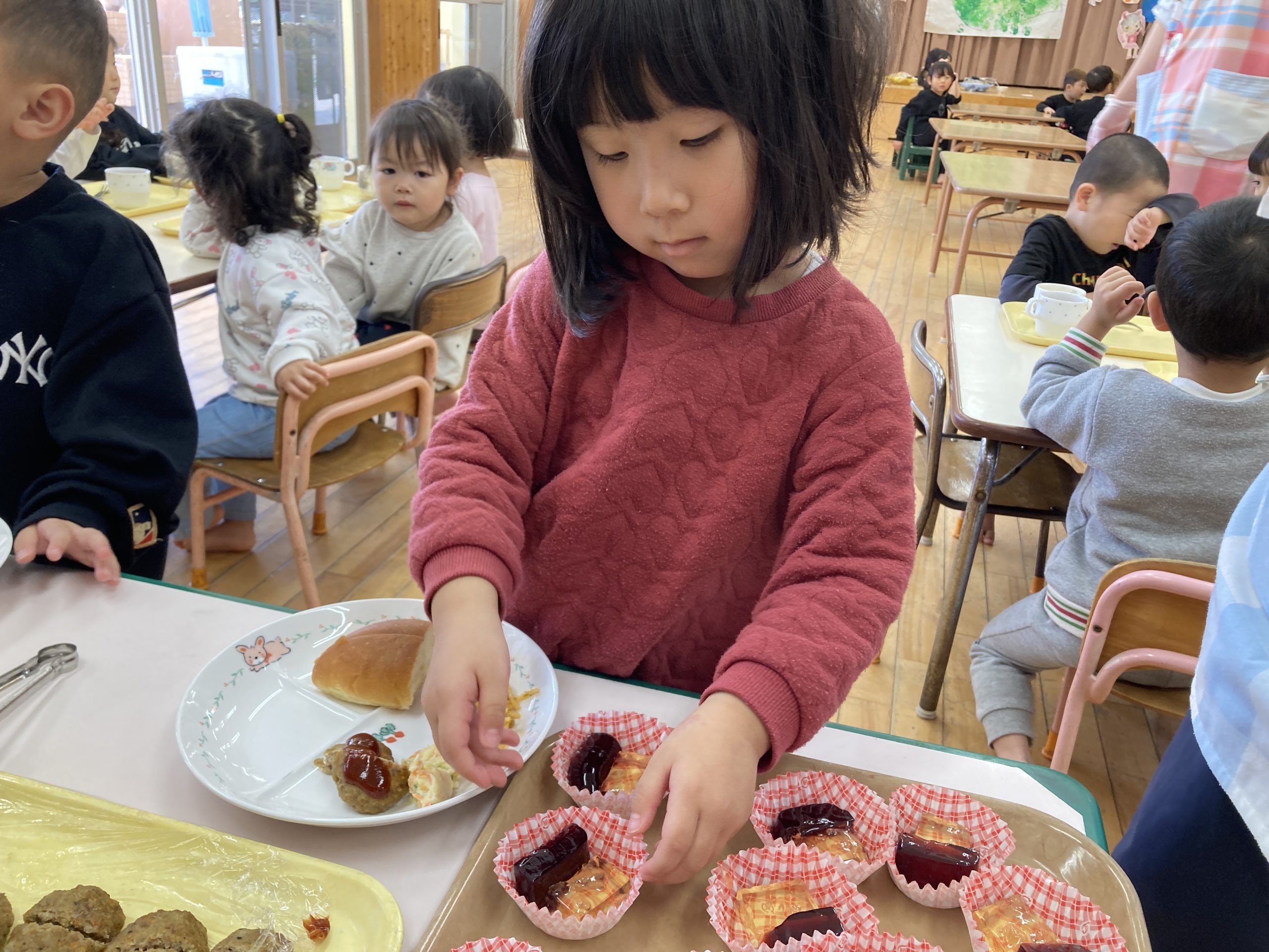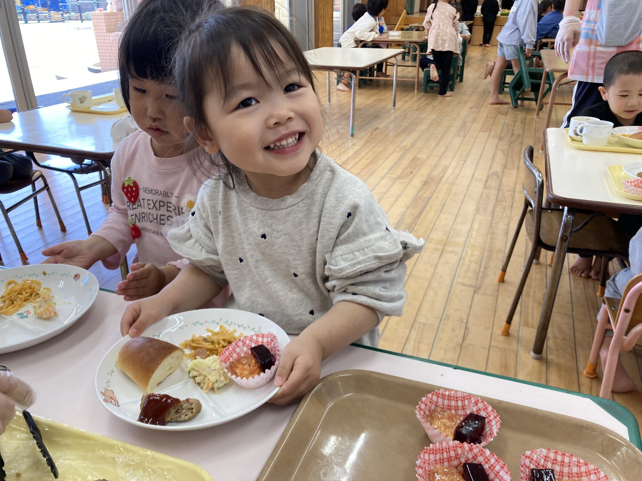 今日は、お別れ会がありました✨うさぎぐみは、きりん組のお姉さんやお兄さんと一緒に「幸せなら手をたたこう」の手遊びをしました😊最後に、花束のプレゼントも渡しましたよ🌸給食では、バイキングに挑戦しました!ハンバーグをトングでつかみ、上手にお皿に移すことが出来ていましたよ🍚