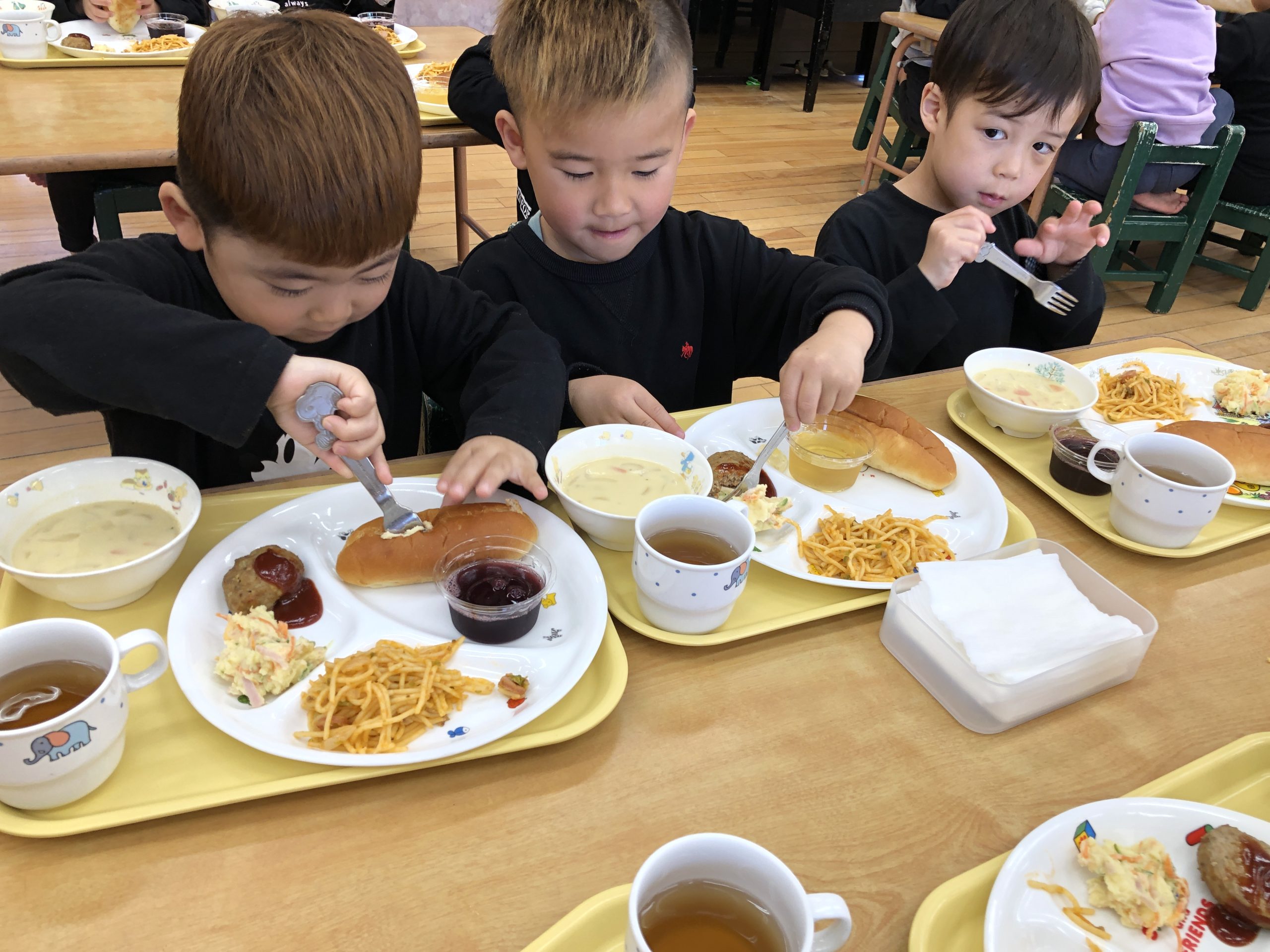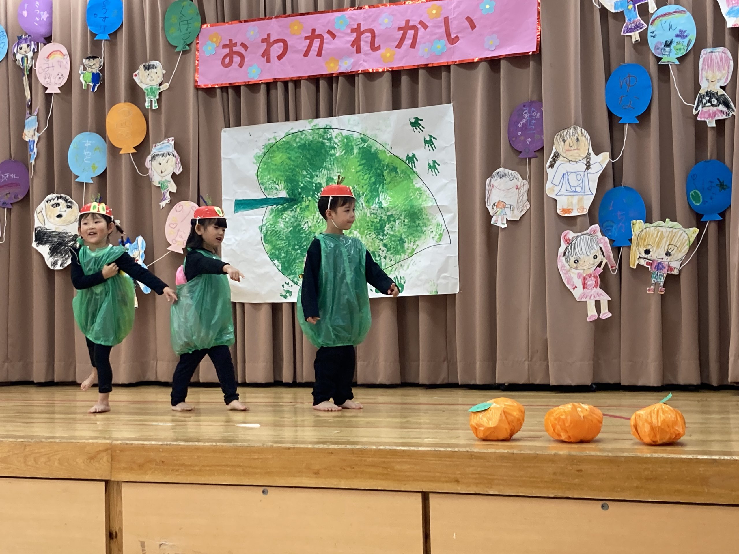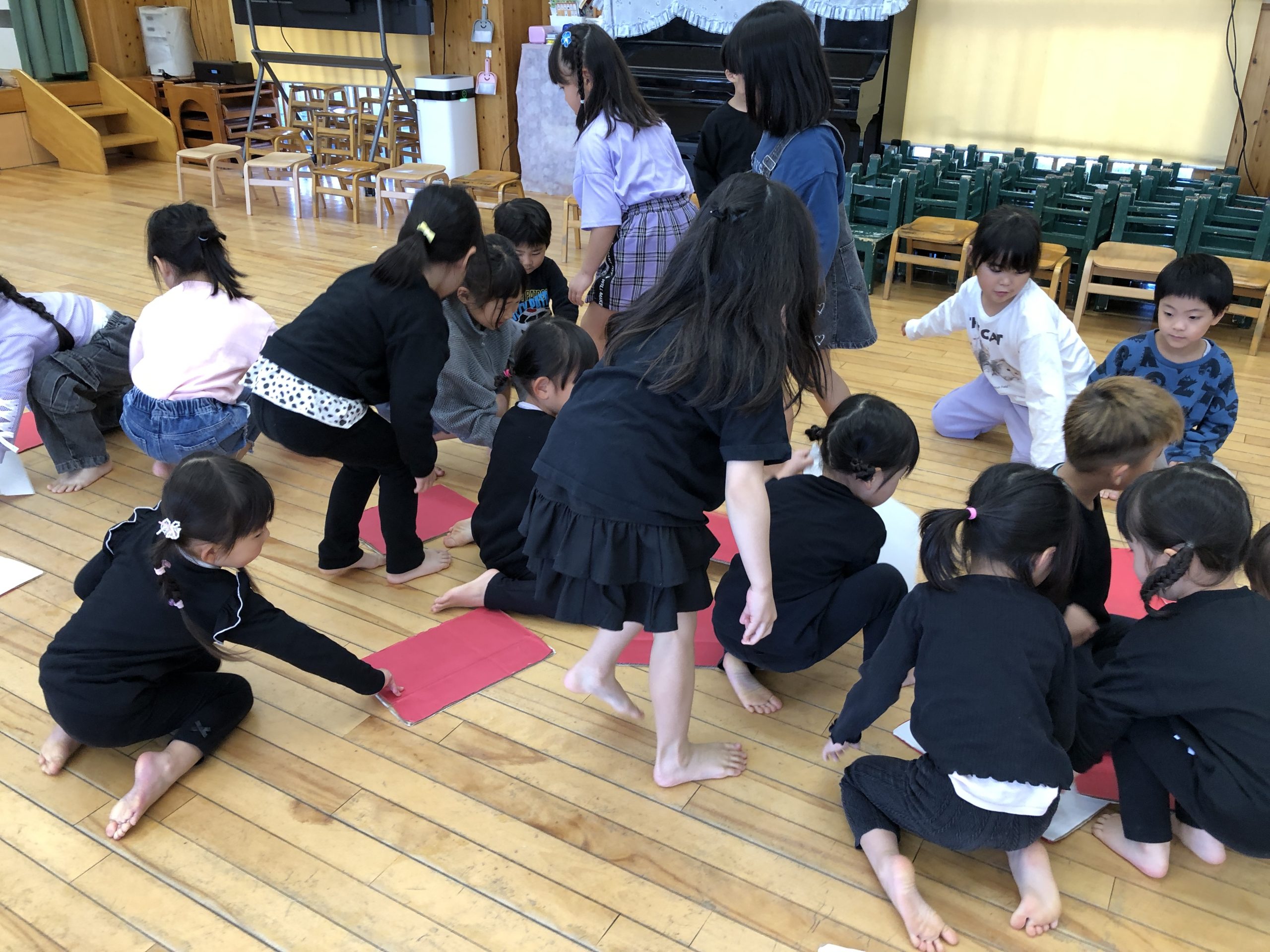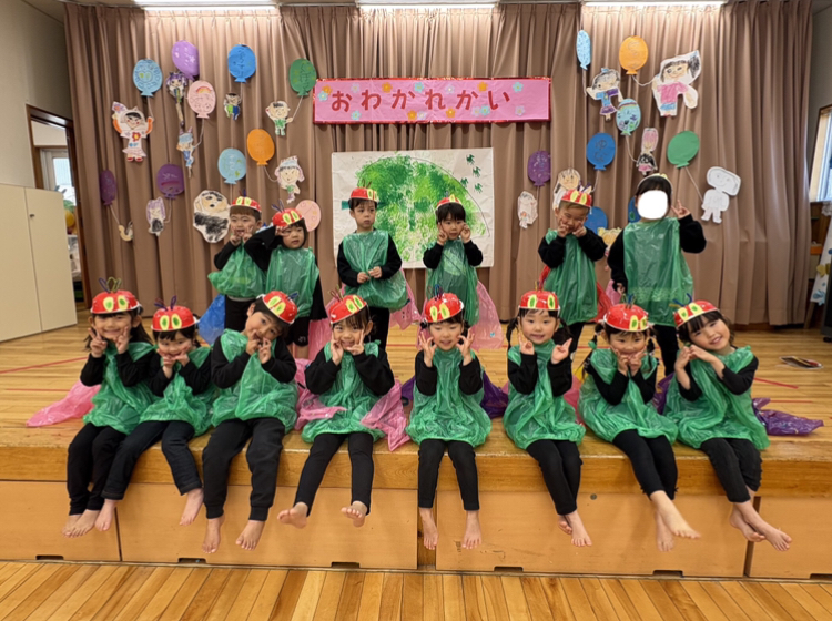 今日は、お別れ会に参加しました🎵きりんぐみさんとのゲームでは、ペアになって楽しく遊んでいましたよ😊はらぺこあおむしの劇の発表では、緊張している様子も見られましたが、歌もダンスもセリフも大きな声・動きで発表することができました✨みんな、楽しく参加することが出来たことを嬉しく思います!!