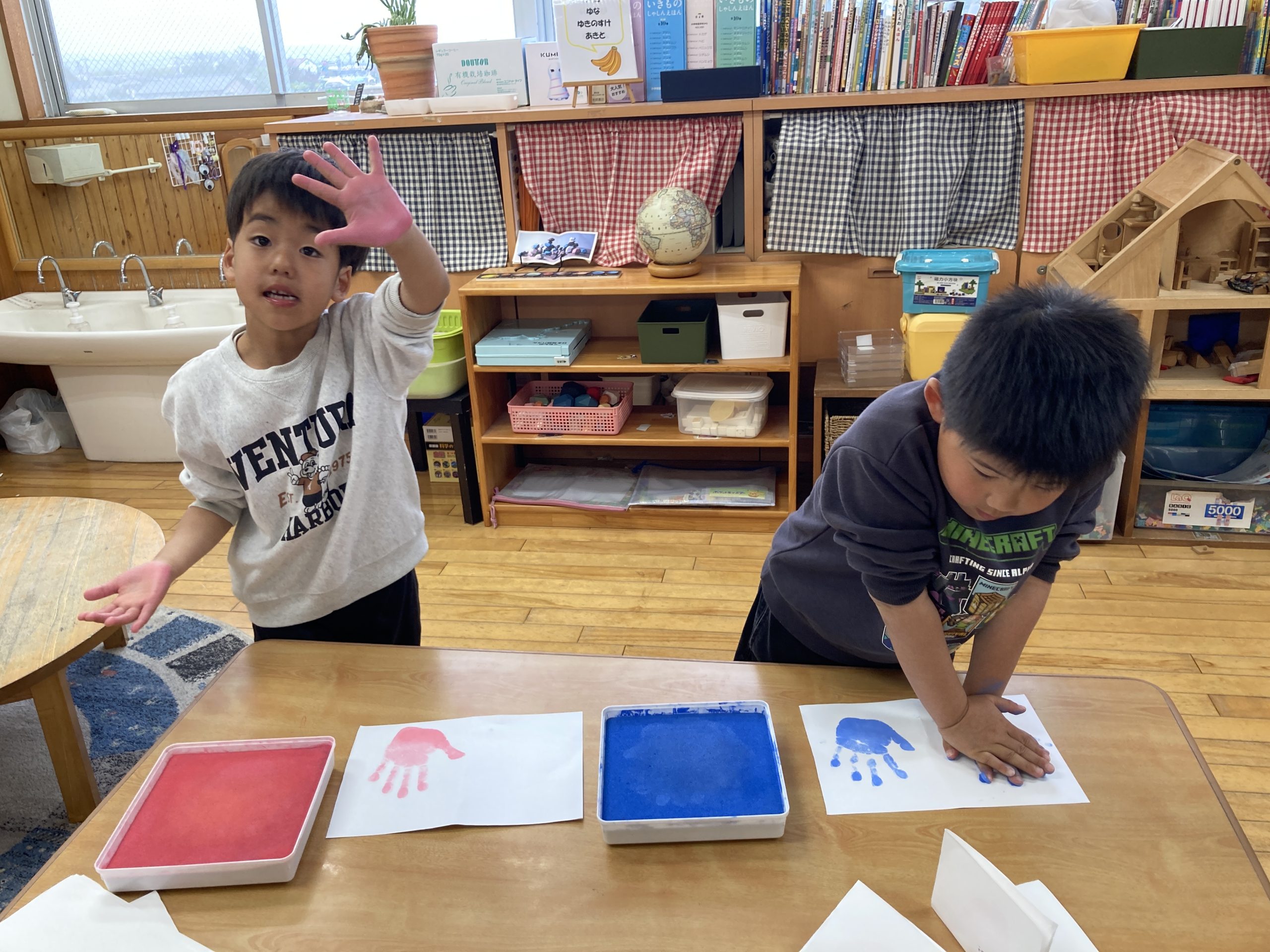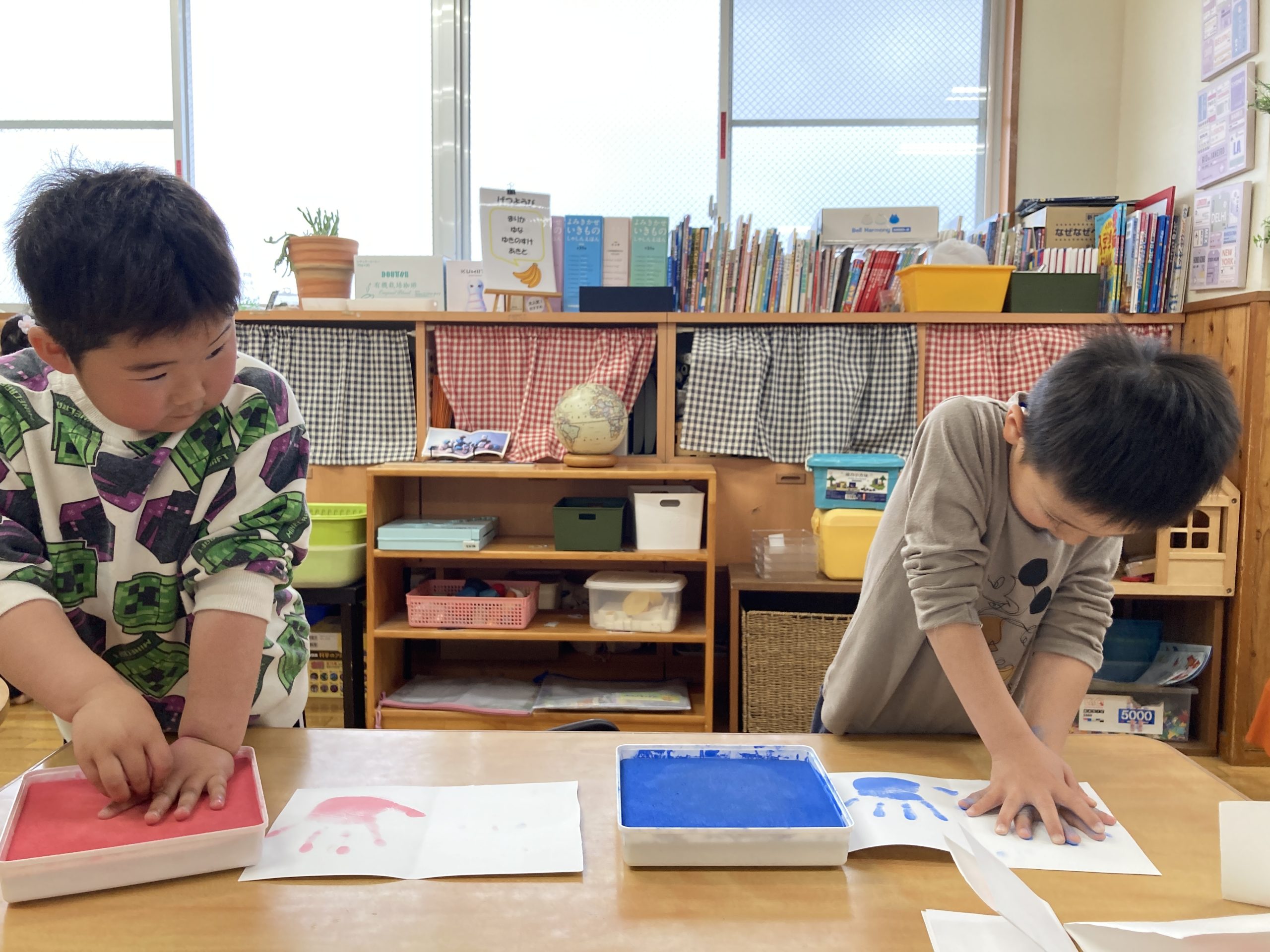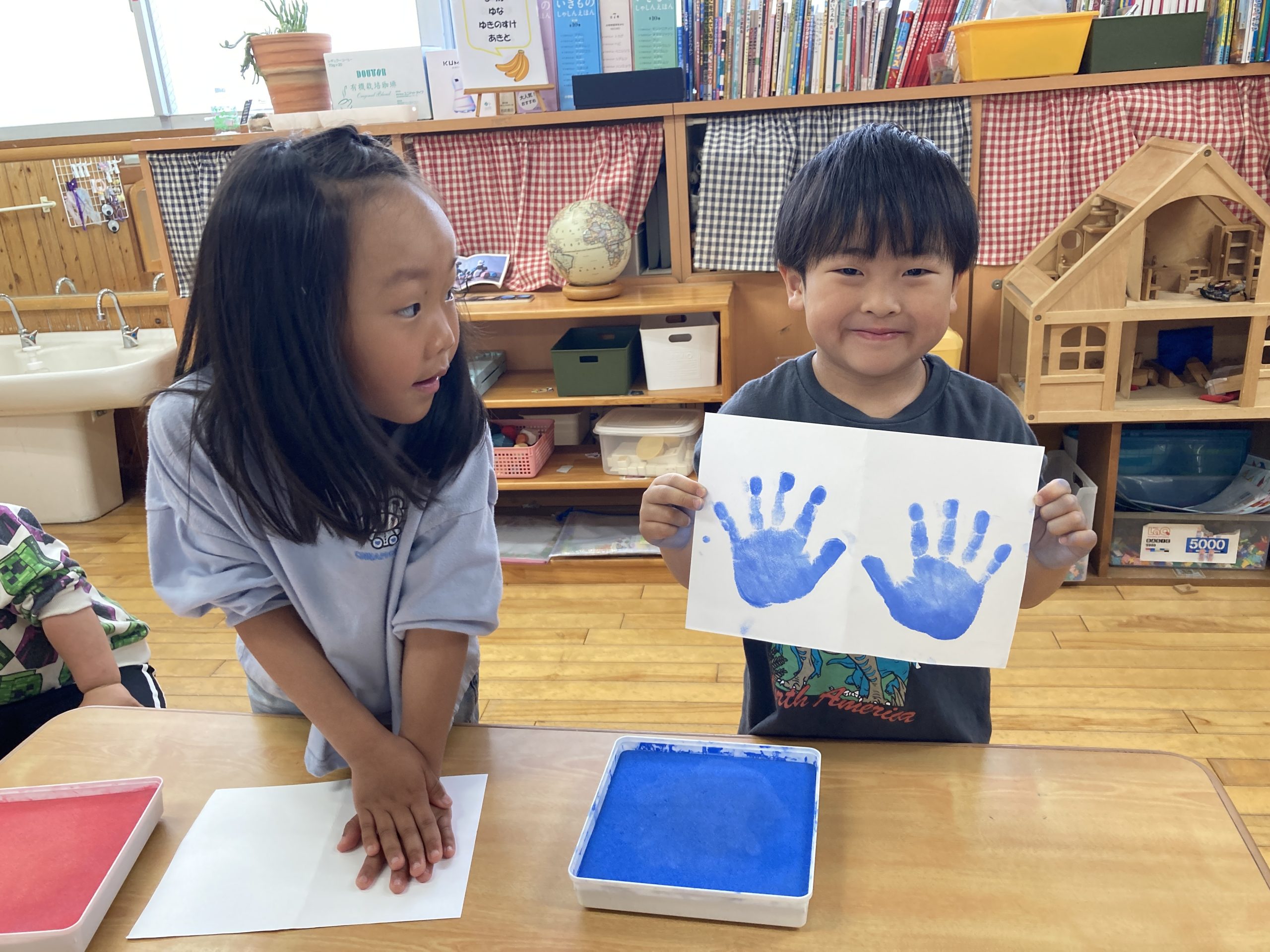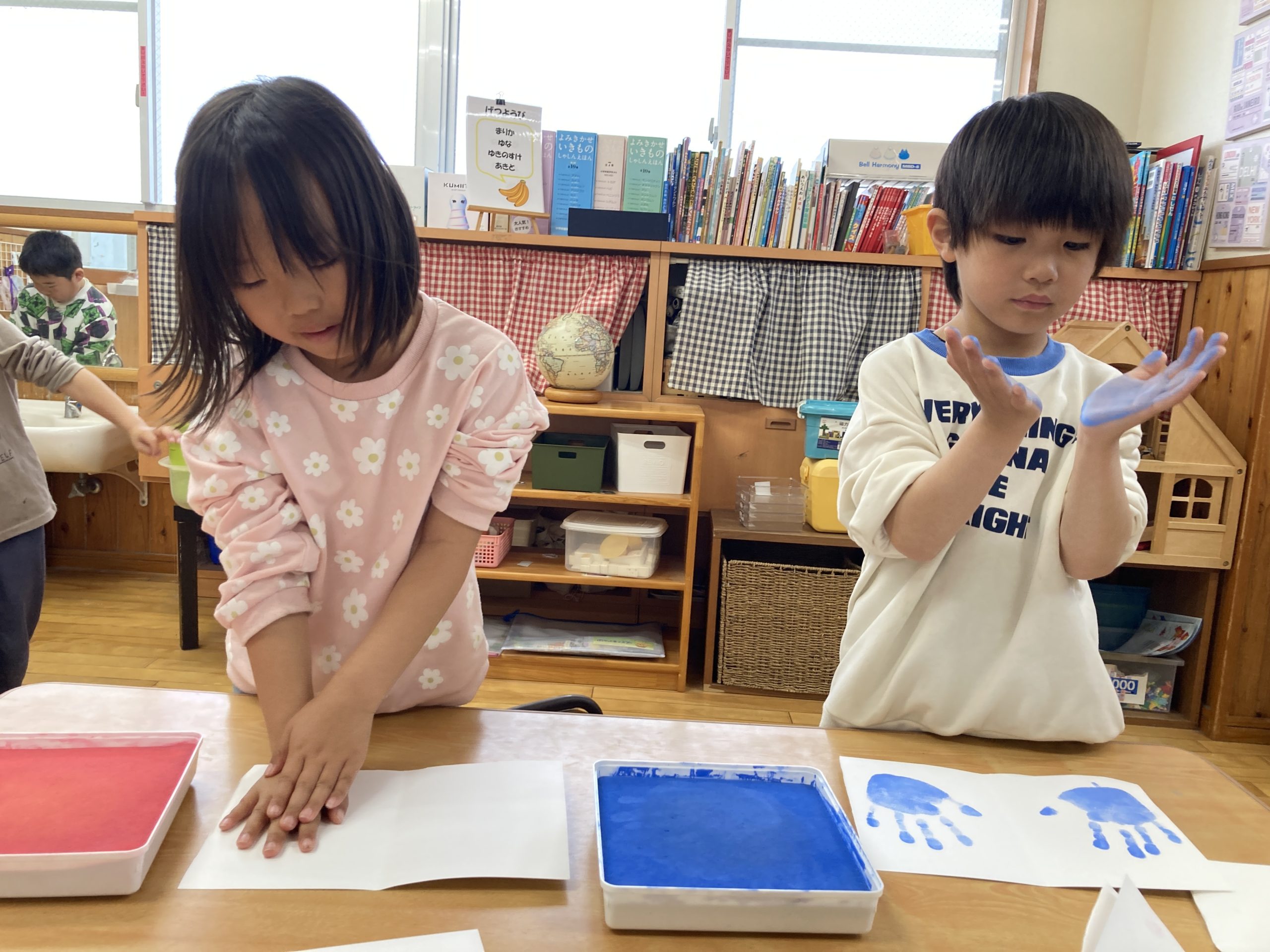 今日は、手形取りをしました!好きな色を選んでスタンプしましたよ。友達と手形の大きさを比べていました🖐️