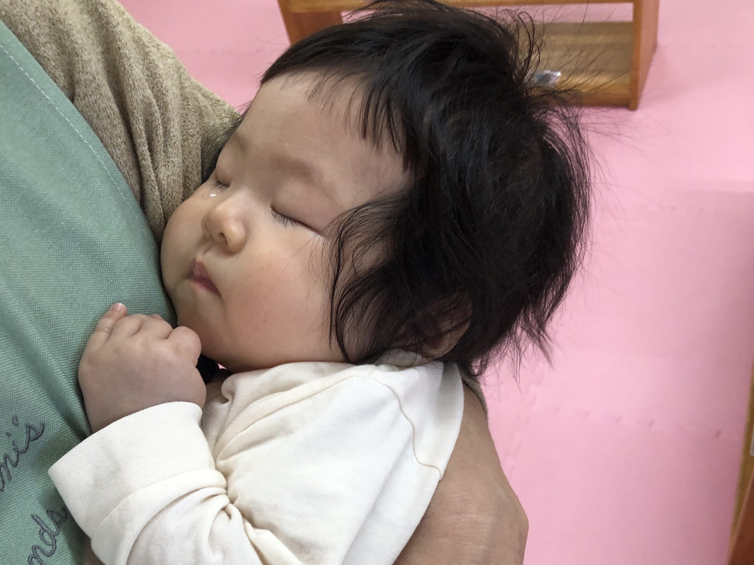 今日から新しいひよこ組がスタートしました🐣初めての登園でしたが保育者の腕の中でぐっすり眠りについていました💤