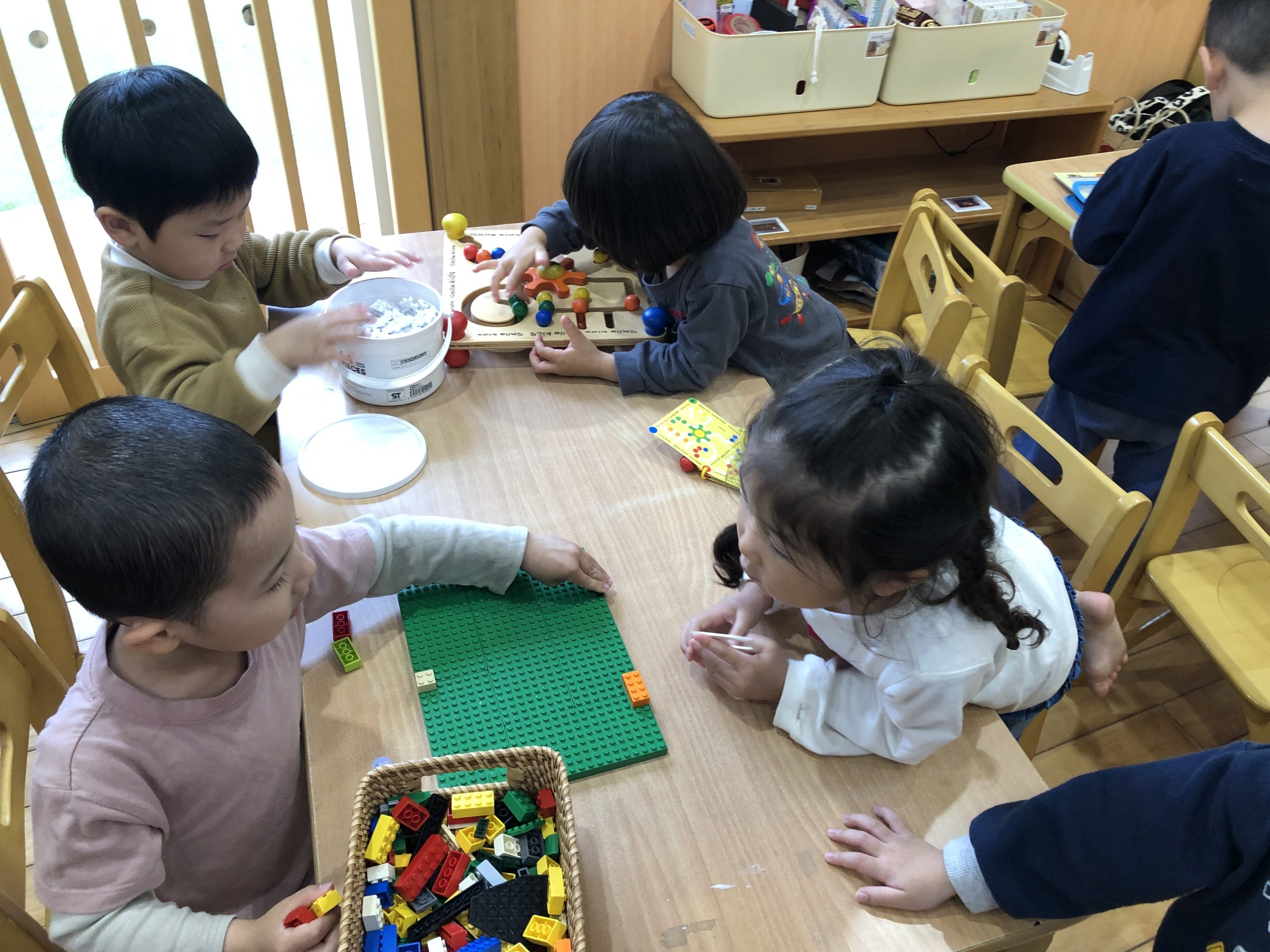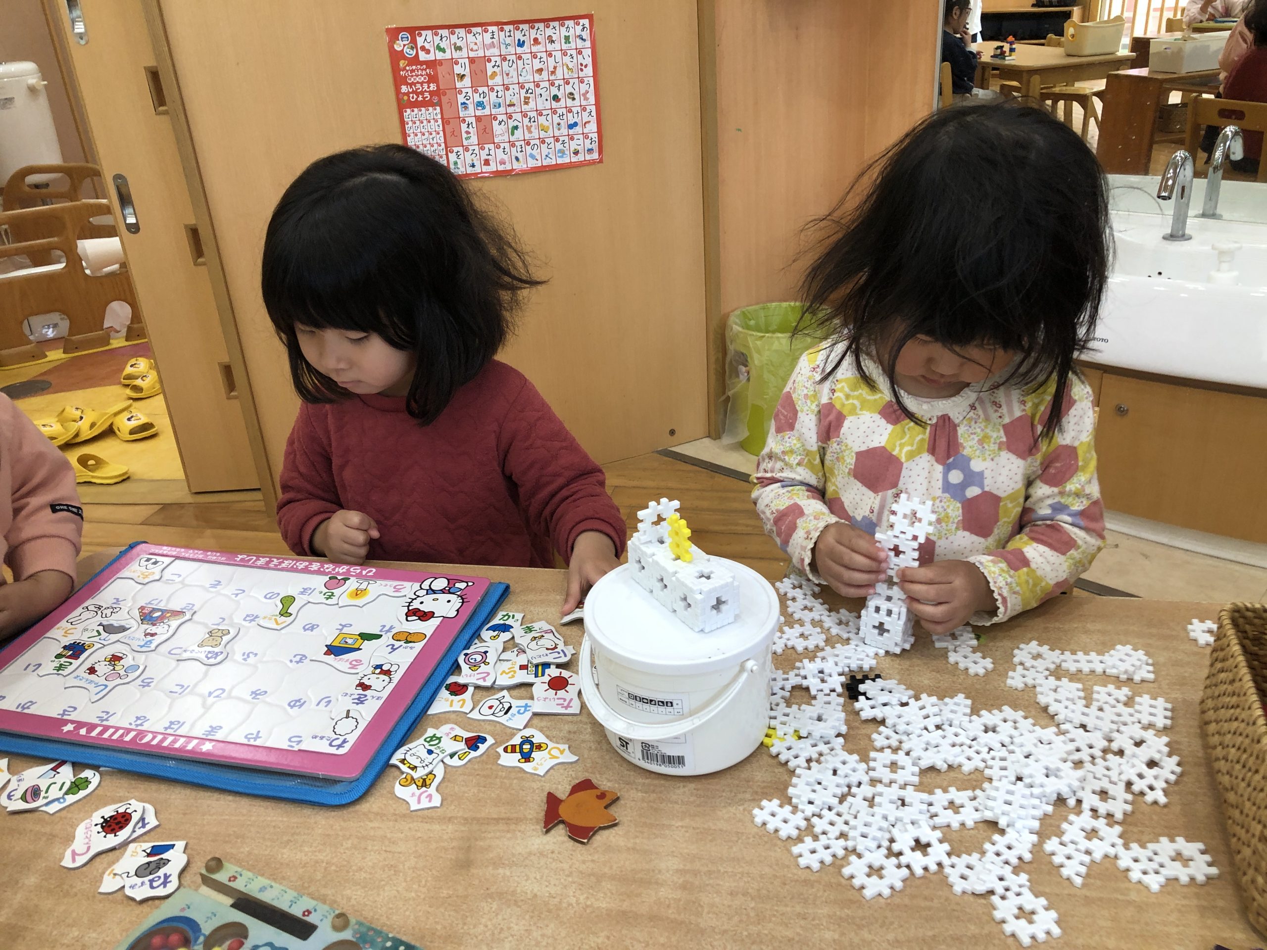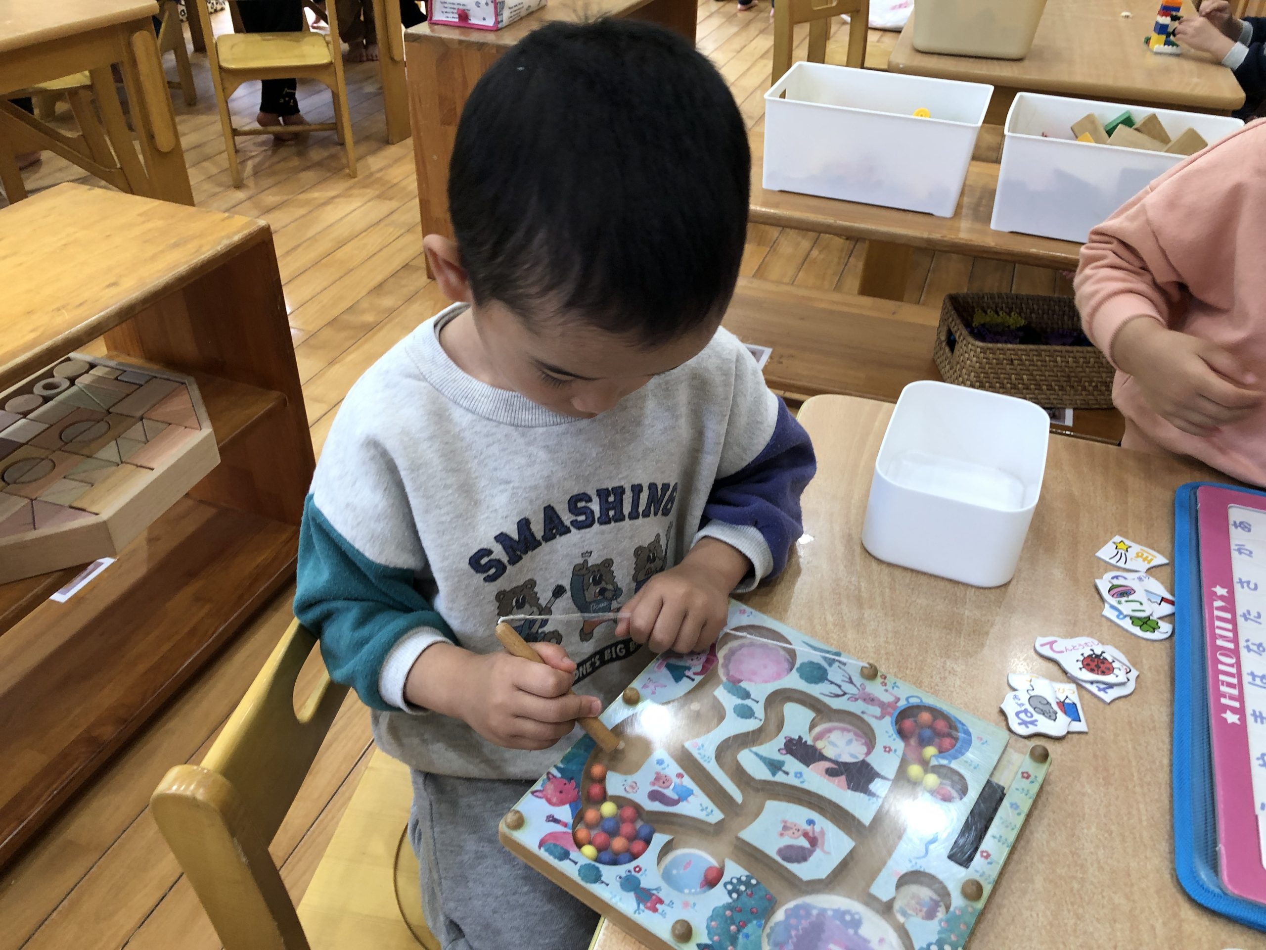 今日は、新しいクラスで自己紹介をしたあとに、部屋にあるおもちゃでコーナーあそびをしました。新しいおもちゃに喜びながら遊んでいました。