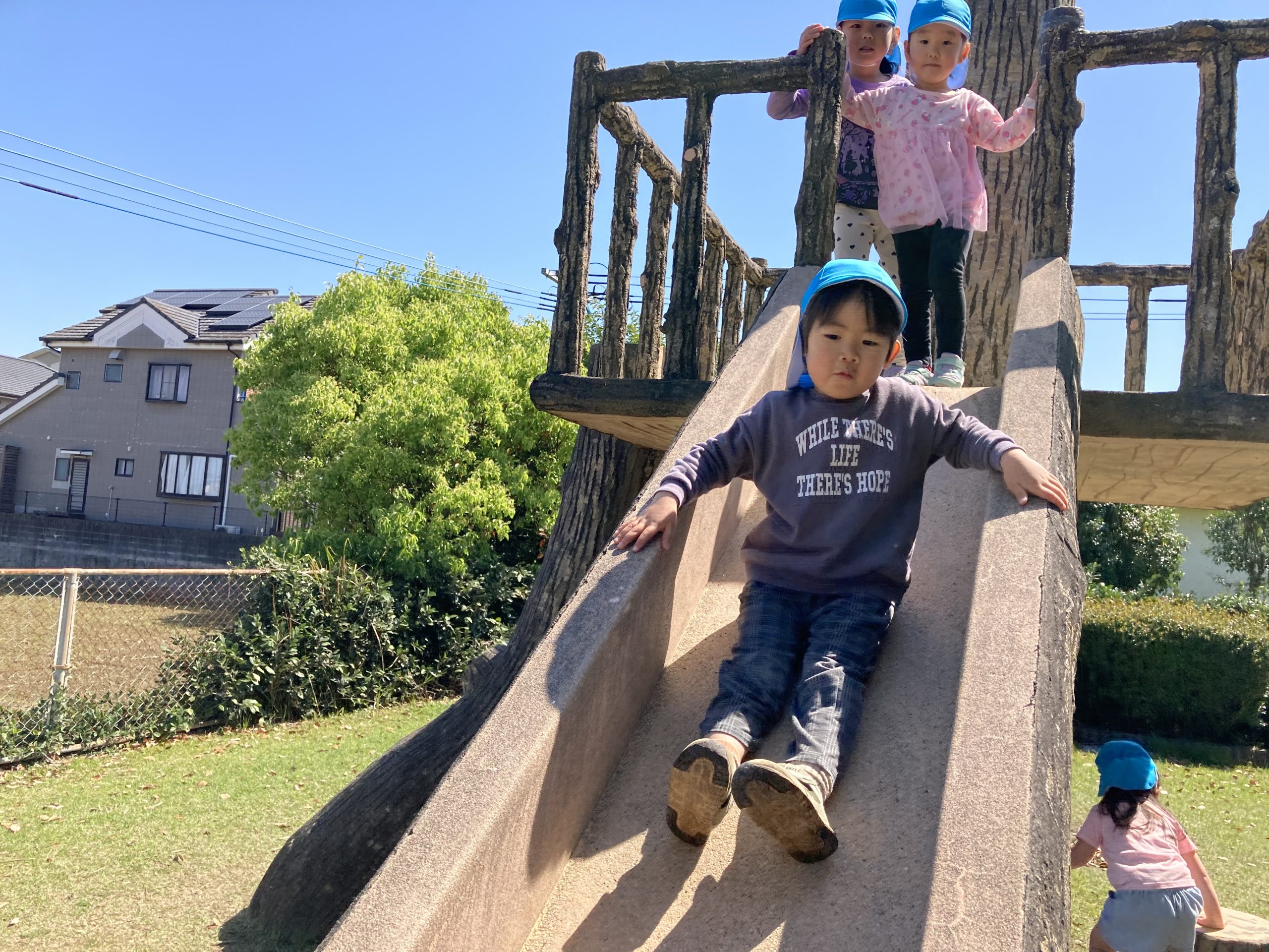 つきぐみさんと手をつないで、行き帰り歩きました。公園では大きなすべり台のある広場でたくさん遊びました🛝