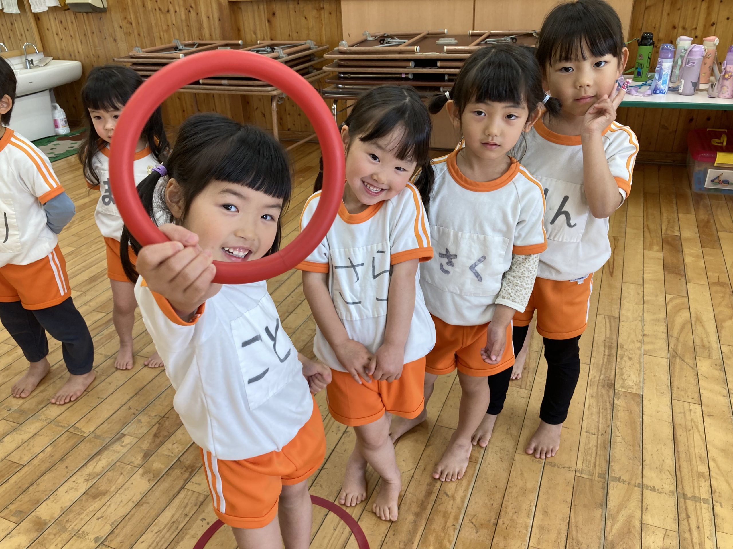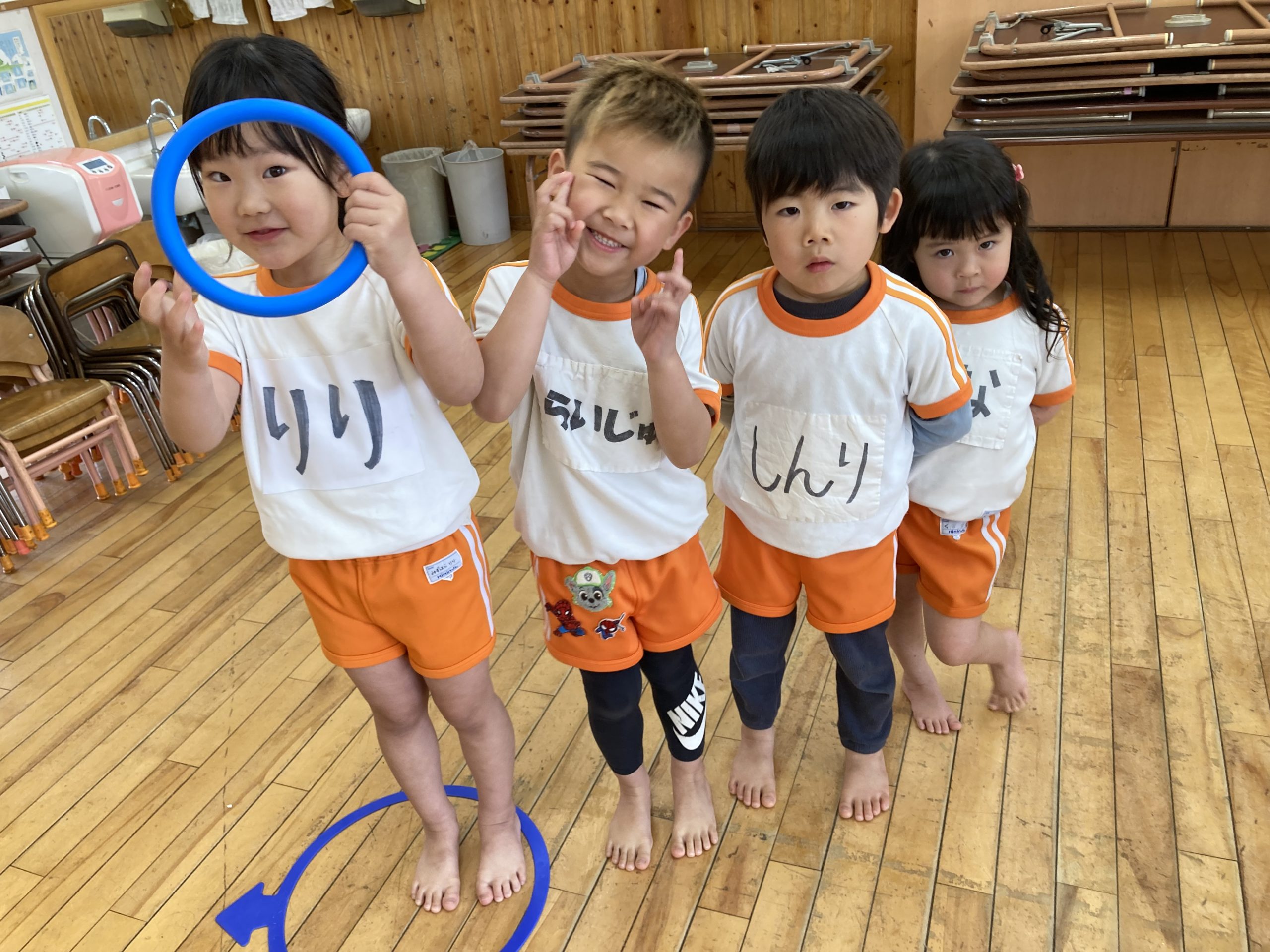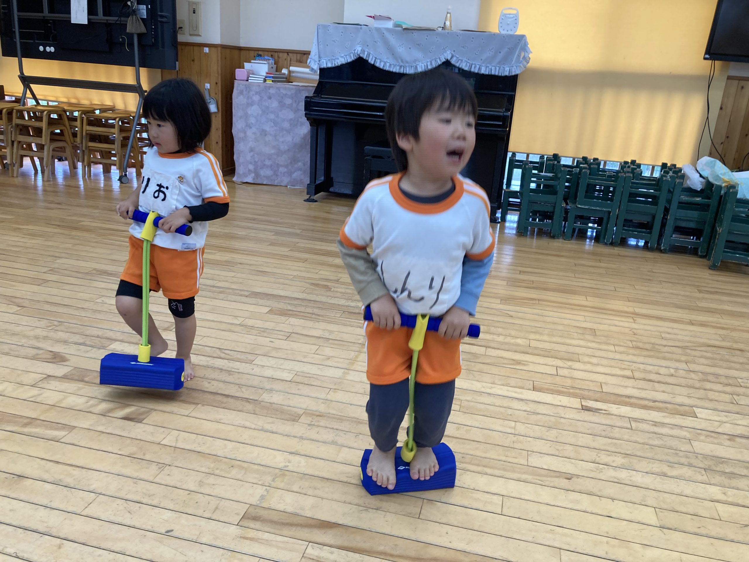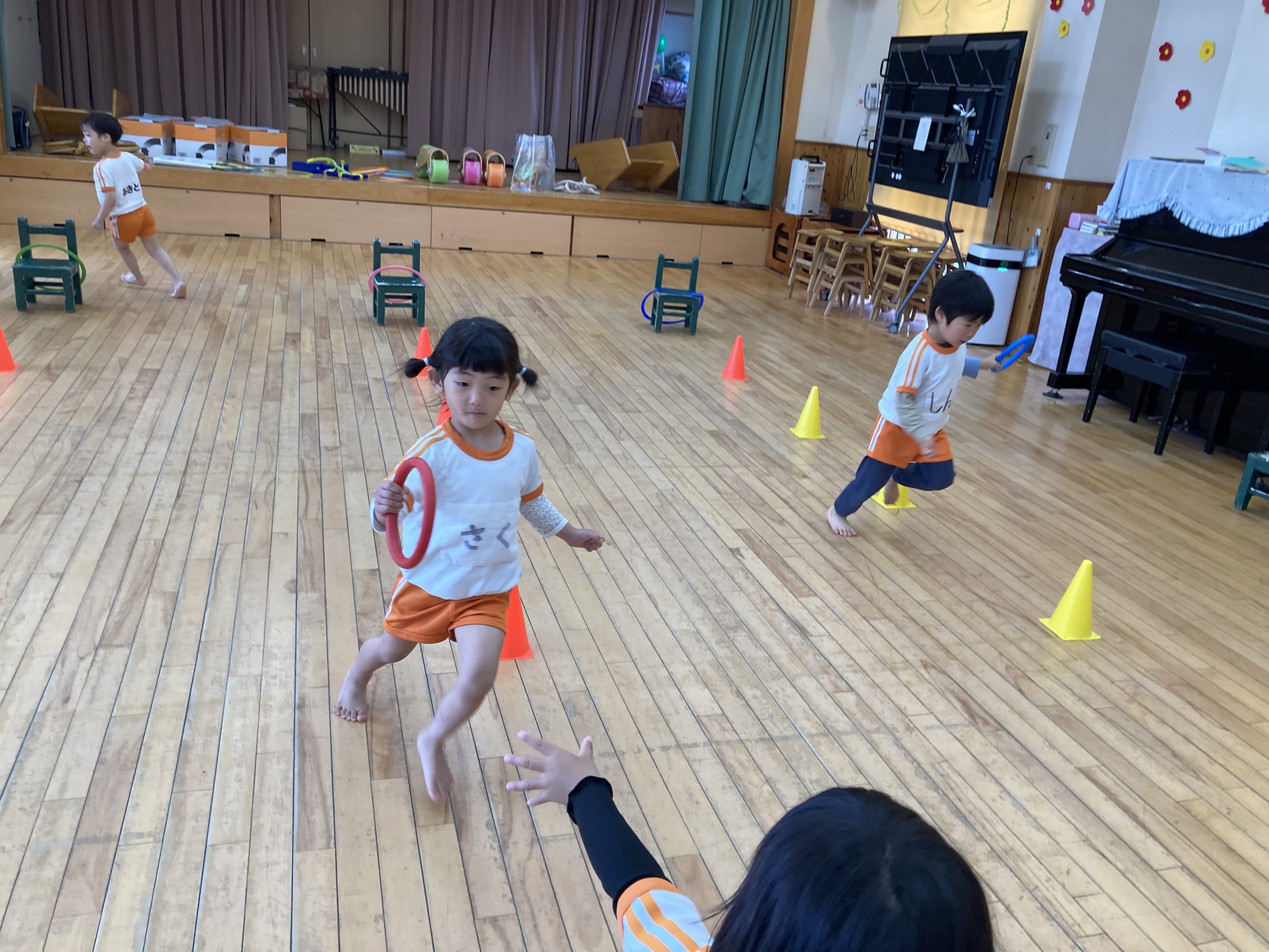 3チームに分かれて、リングバトンを持って、ジグザグリレーをしました。お部屋用のホッピングでジャンプ運動をしたりもしました。