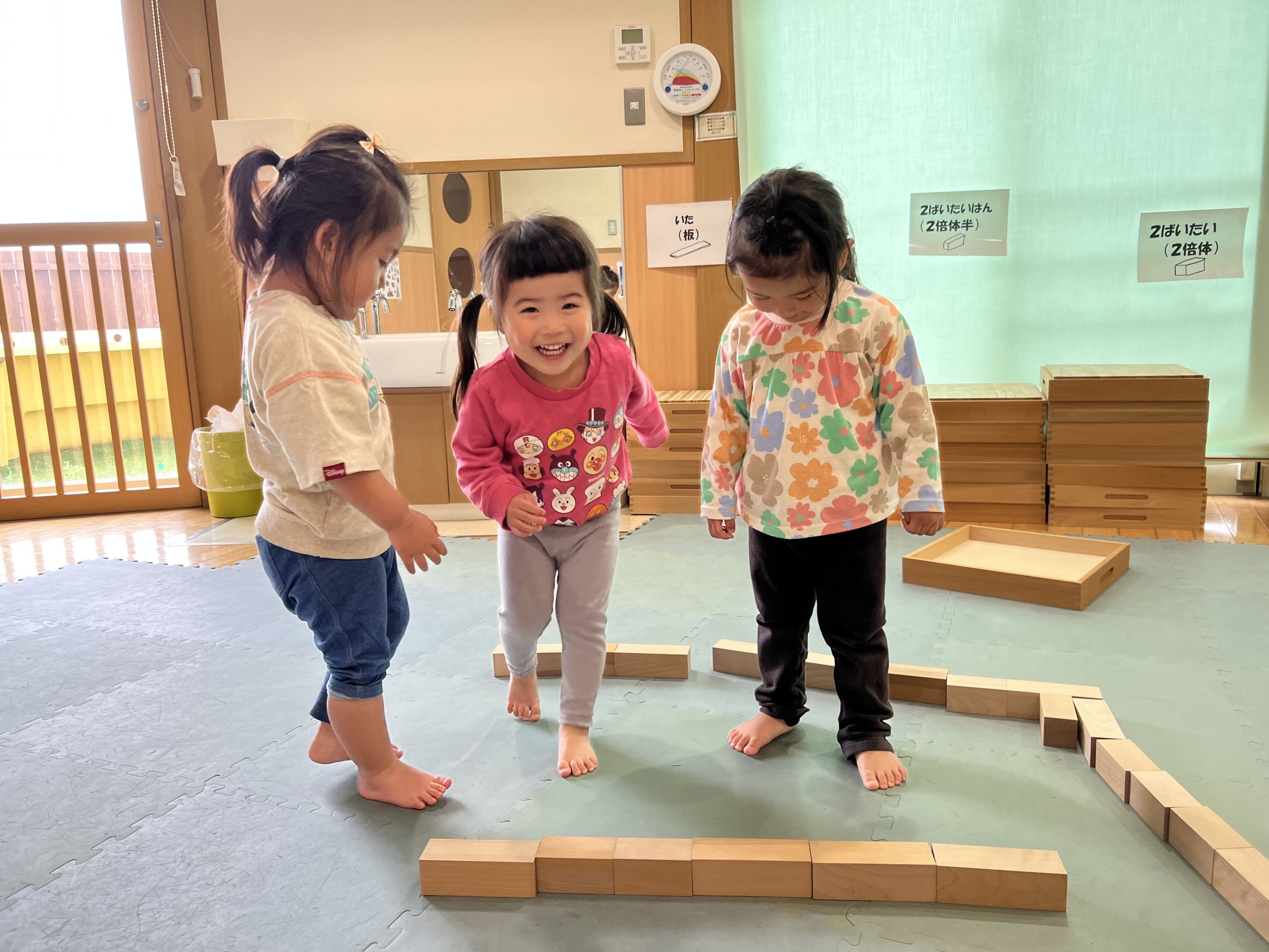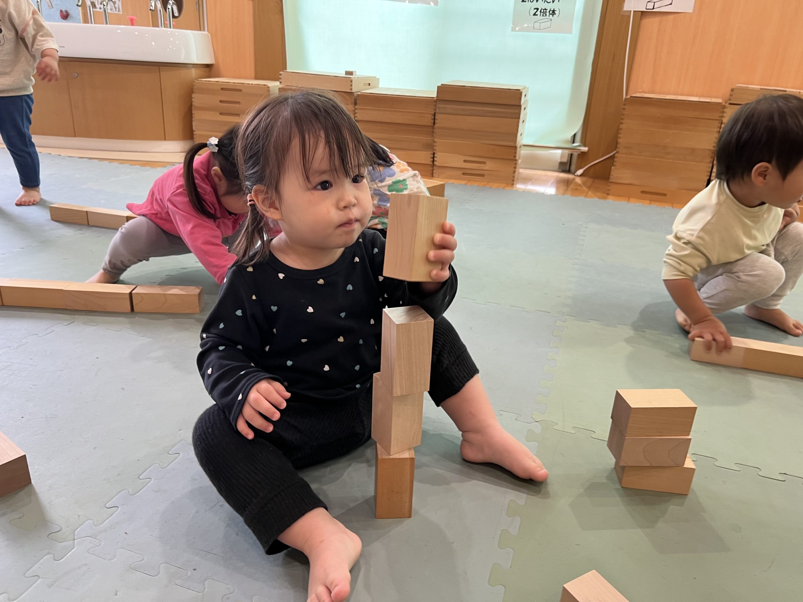 今日は、積み木あそびをしました!積み木を並べてお風呂を作ったり、積み木を繋げて電車を作ったりと、自由に想像しながら、いろいろなものを作って楽しんでいました😊