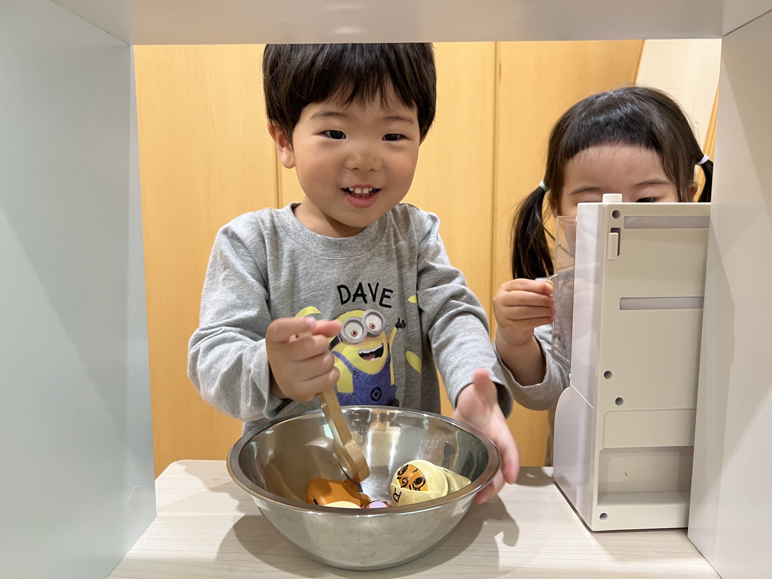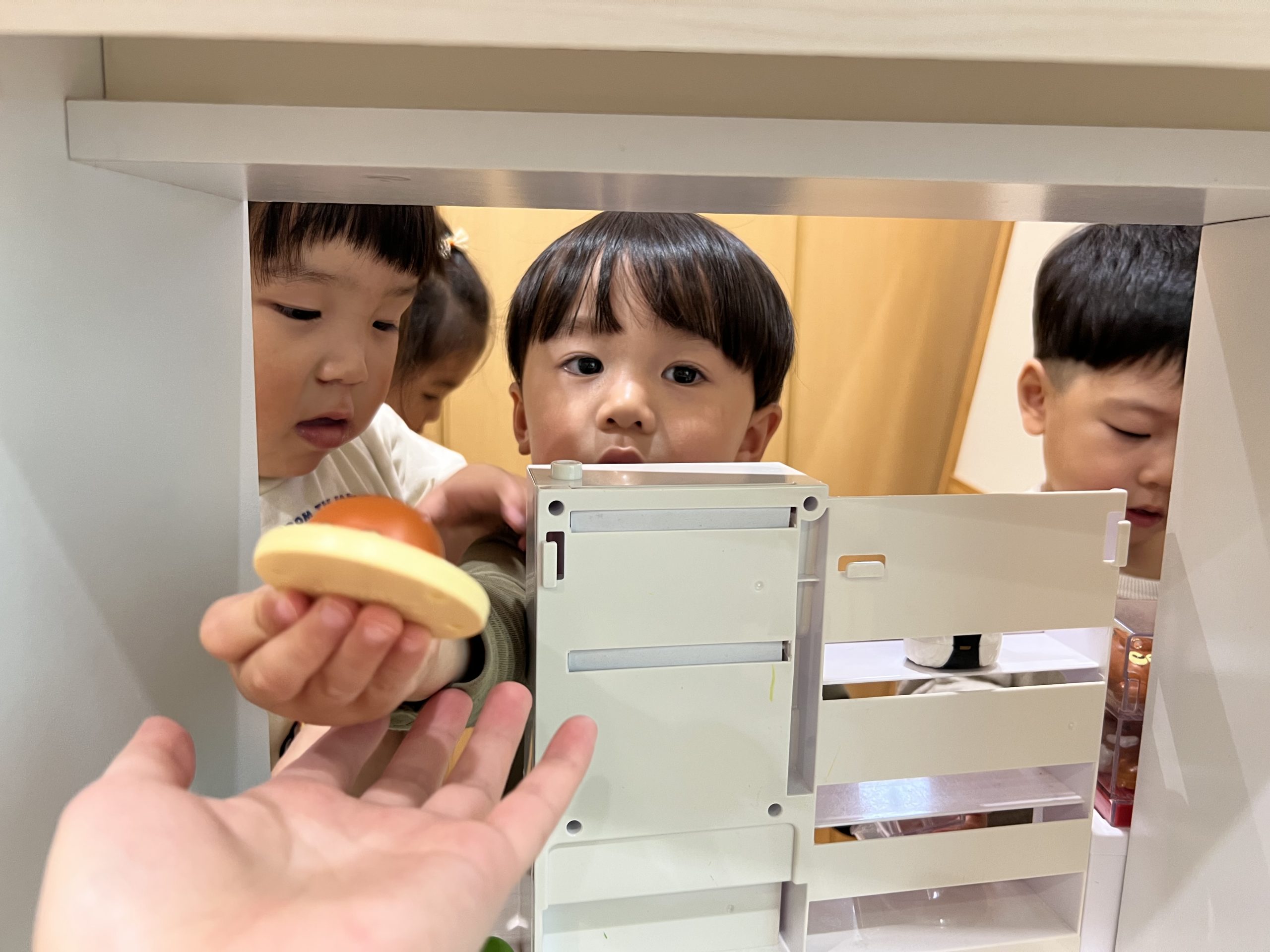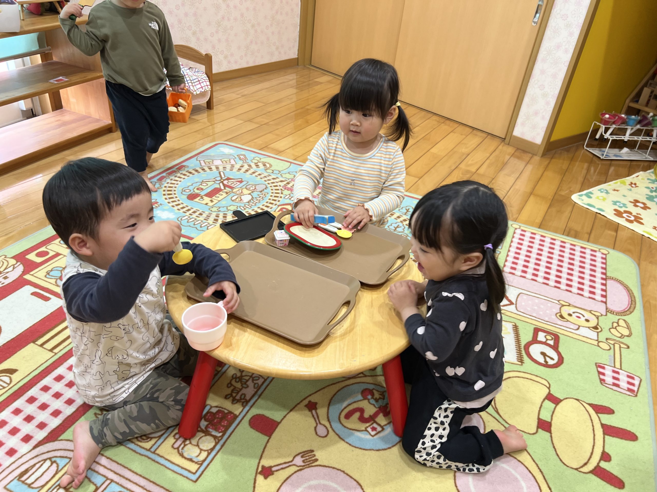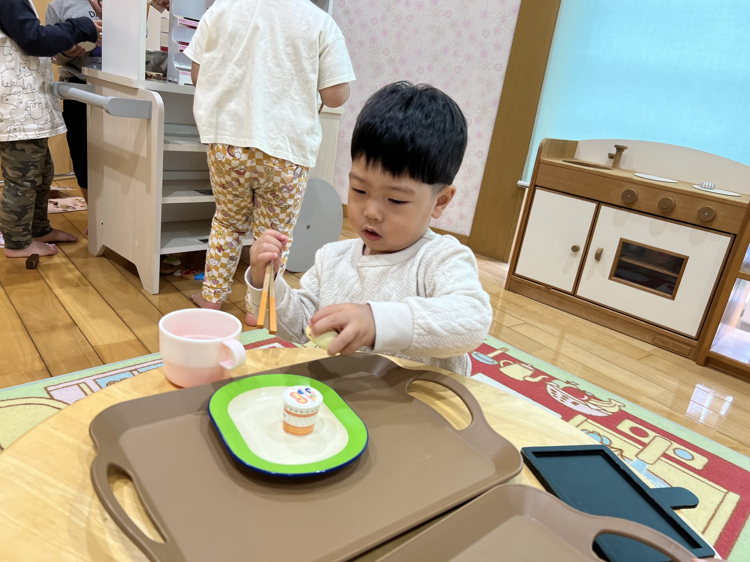 今日は、ままごとあそびをしました!鍋や包丁を使ってお料理したり、お箸でご飯を食べる真似をしたりと楽しんでいましたよ😊玩具の取り合いもありましたが、「かして」と言葉で伝える姿も見られました♪